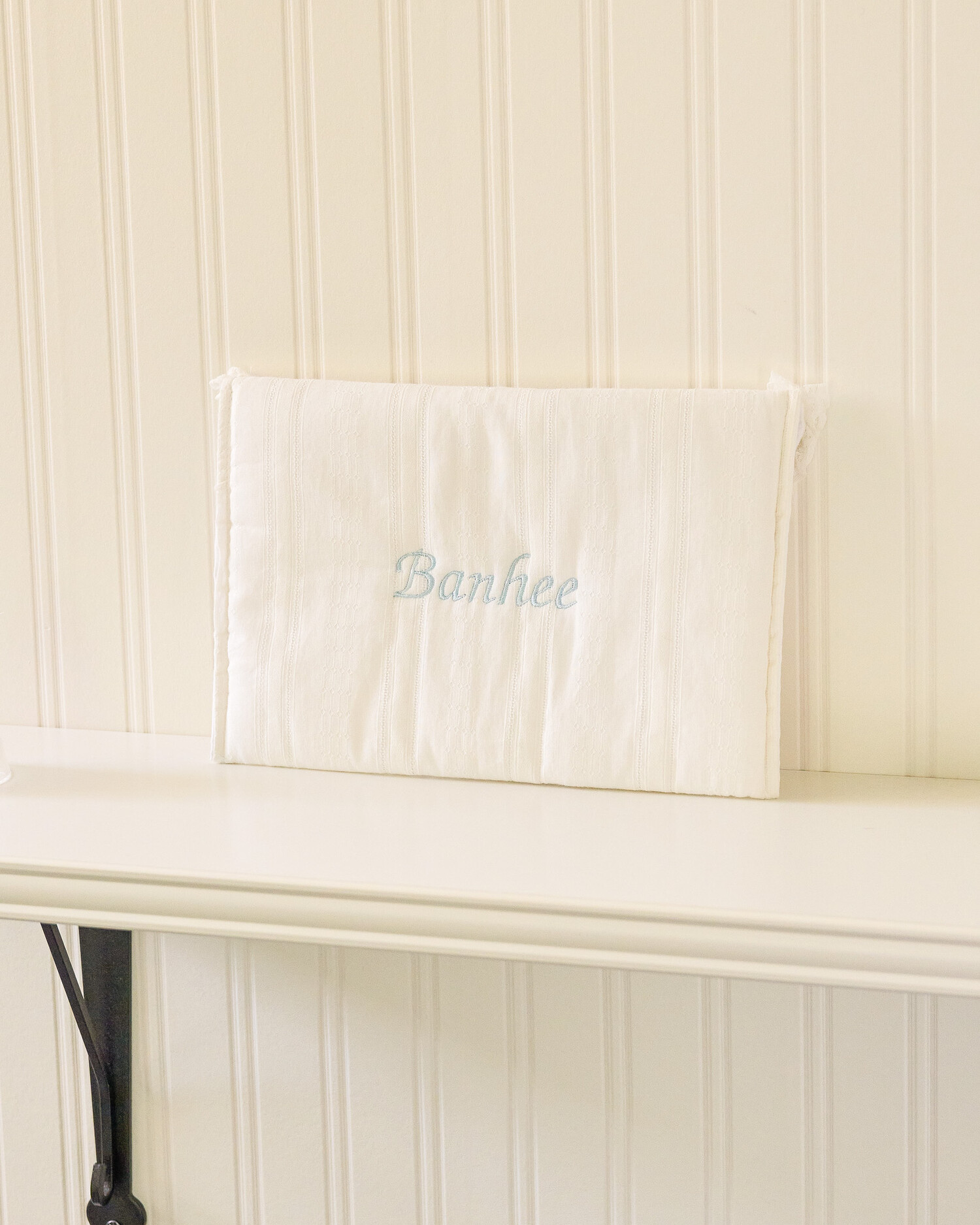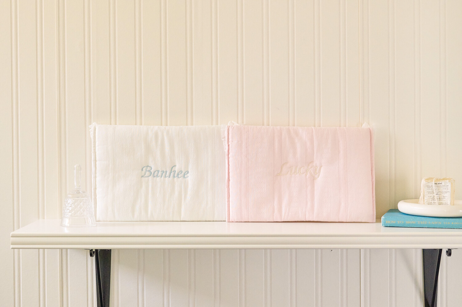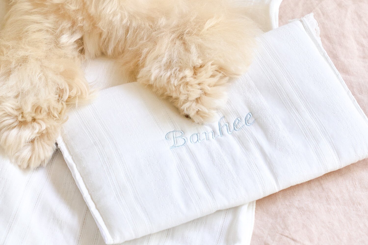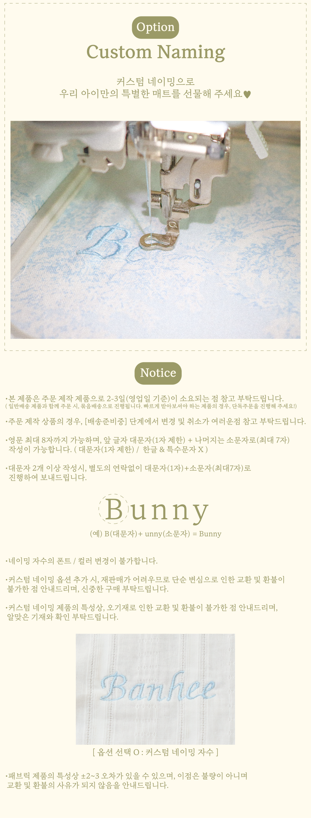 [Notice] •본 제품은 주문 제작 제품으로 2-3일(영업일 기준)이 소요되는 점 참고 부탁드립니다. (일반배송 제품과 함께 주문 시 묶음배송으로 진행되며, 빠르게 받아보셔야 하는 제품의 경우, 단독주문을 진행해주세요!) •주문 제작 상품의 경우, [배송준비중] 단계에서의 취소가 어려우신 점 참고 부탁드립니다. •영문 최대 8자 가능하며, [앞 글자] 대문자 1자(글씨크기로 인해 1자 제한)+ [나머지] 소문자(최대 7자) 작성이 가능합니다. ( 대문자(1자 제한) / 한글&특수문자 X ) •네이밍 자수의 폰트 / 컬러 변경이 불가능 합니다. •커스텀 네이밍 옵션 추가 시, 재판매가 어려우므로 단순 변심으로 인한 교환 및 환불이 불가한 점 안내드리며, 신중한 구매 부탁드립니다. •커스텀 네이밍 제품의 특성상, 오기재로 인한 교환 및 환불이 불가한 점 안내드리며, 알맞은 기재와 확인 부탁드립니다. •패브릭 제품의 특성상 ±1~2cm 오차가 있을 수 있으며, 이점은 불량이 아니며 교환 및 환불의 사유가 되지 않음을 안내드립니다.
