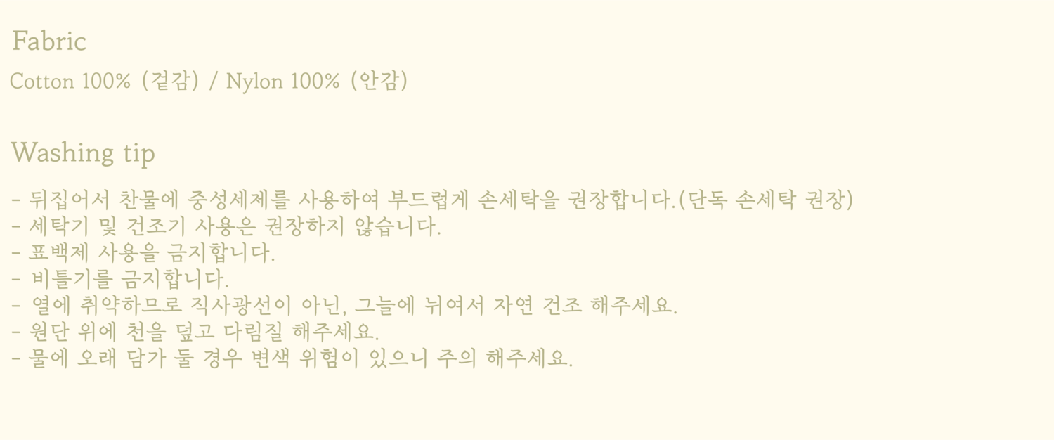 [Washing tip] 찬물에 중성세제를 사용하여 부드럽게 조물조물 손세탁을 권장하며, 세탁기&건조기 사용은 권장하지 않습니다.