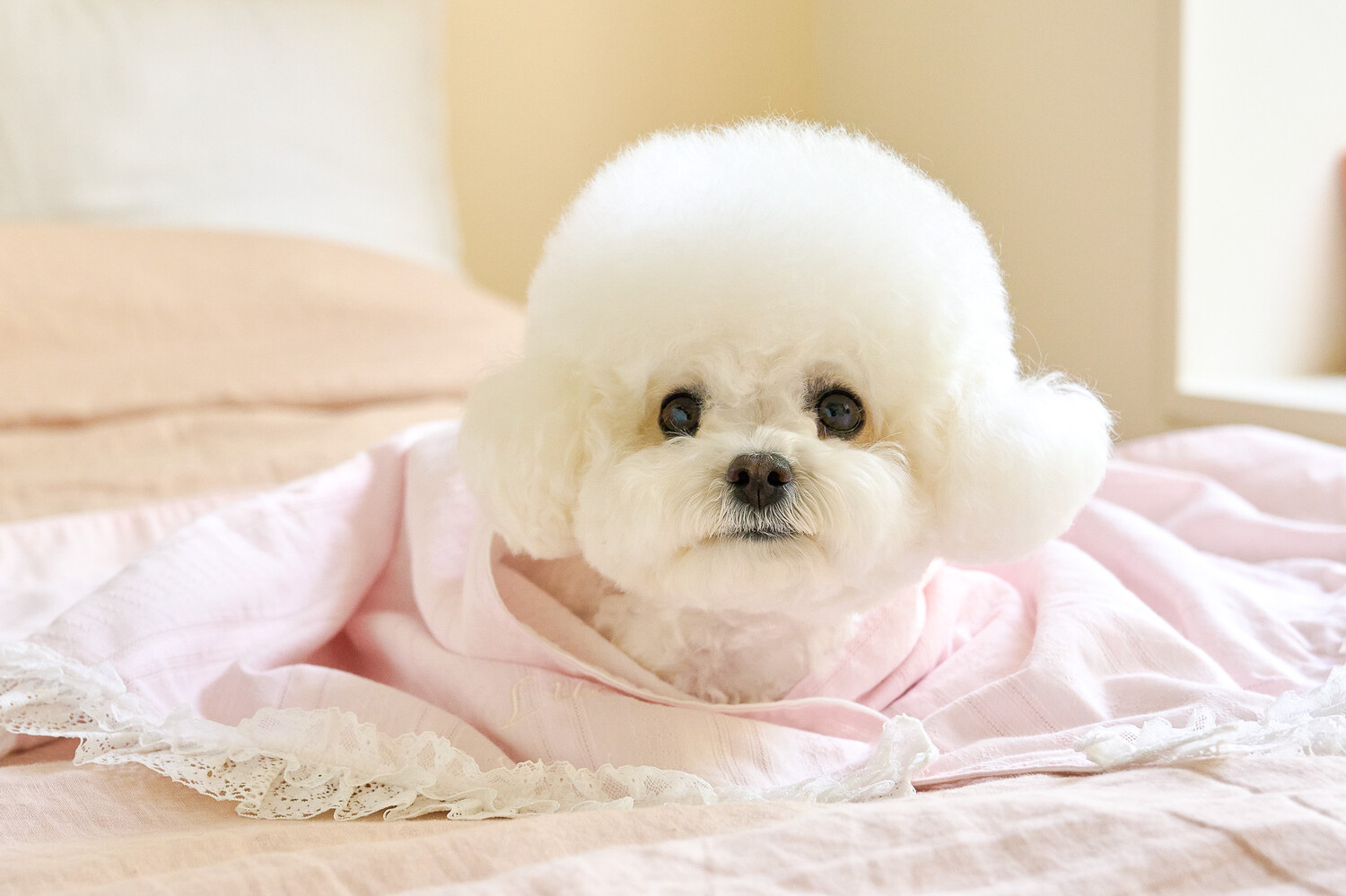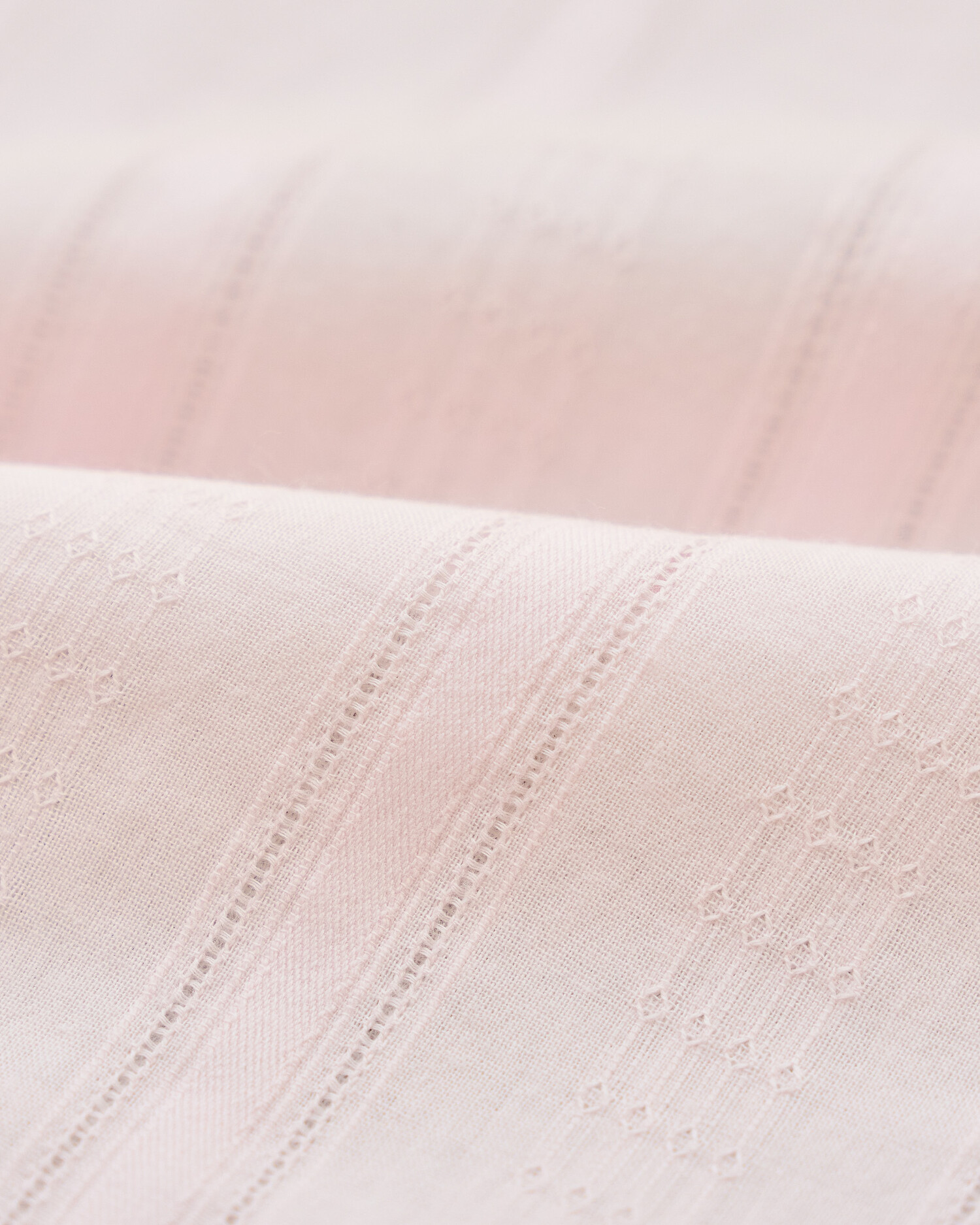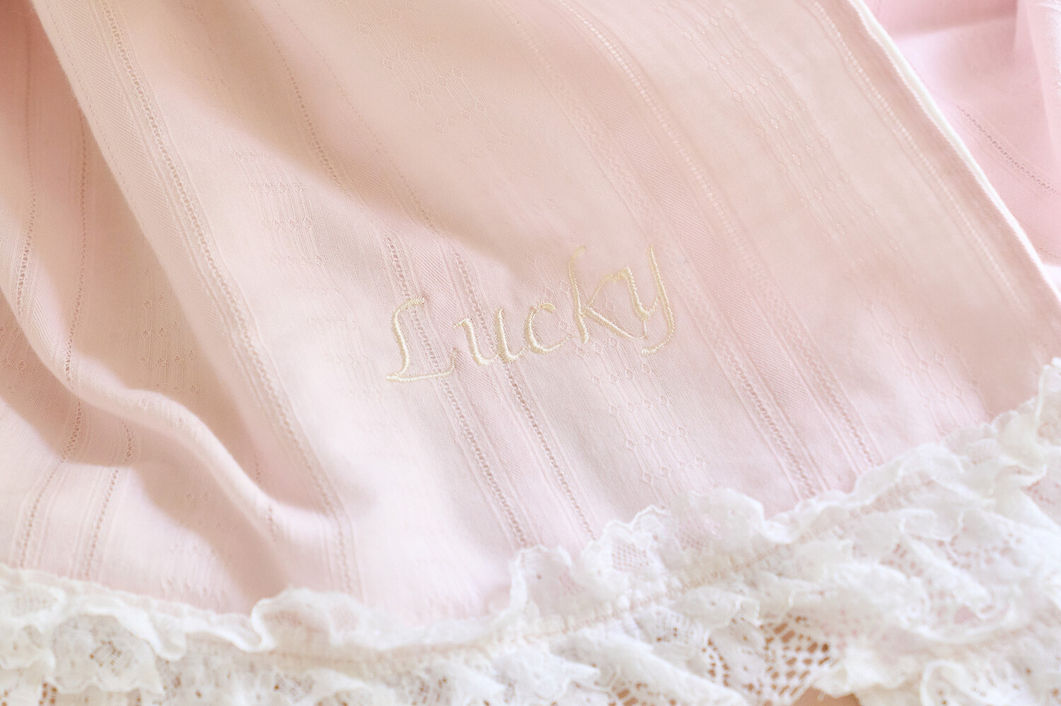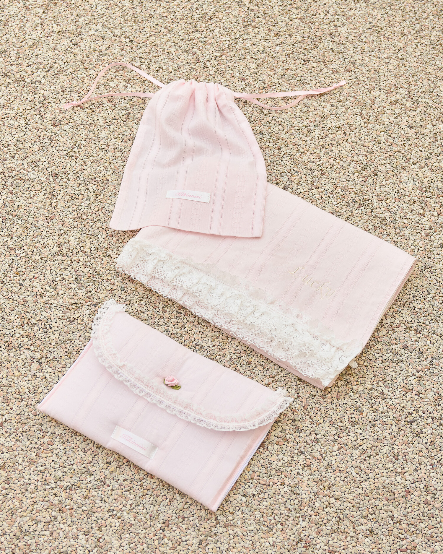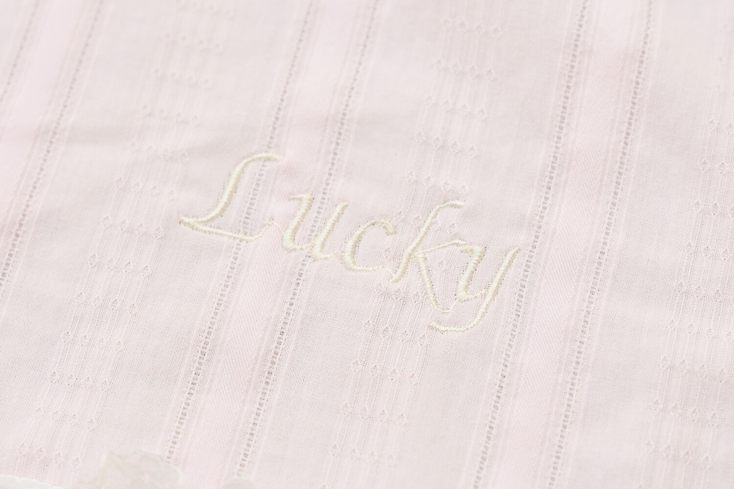 겉감은 은은한 파스텔톤 바탕에 프릴 레이스로 사랑스러운 포인트를 주었으며,