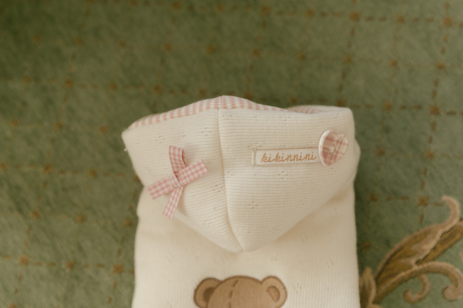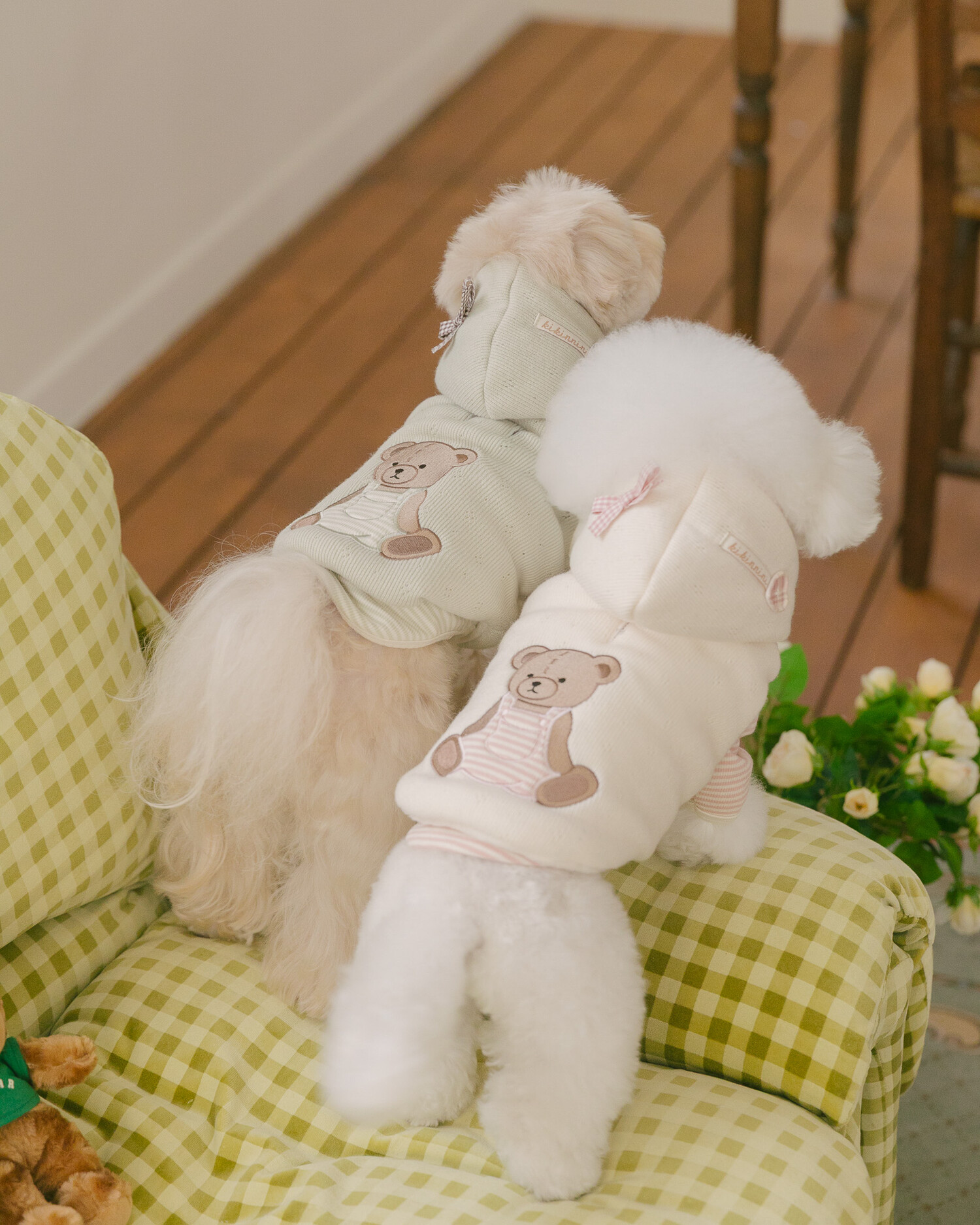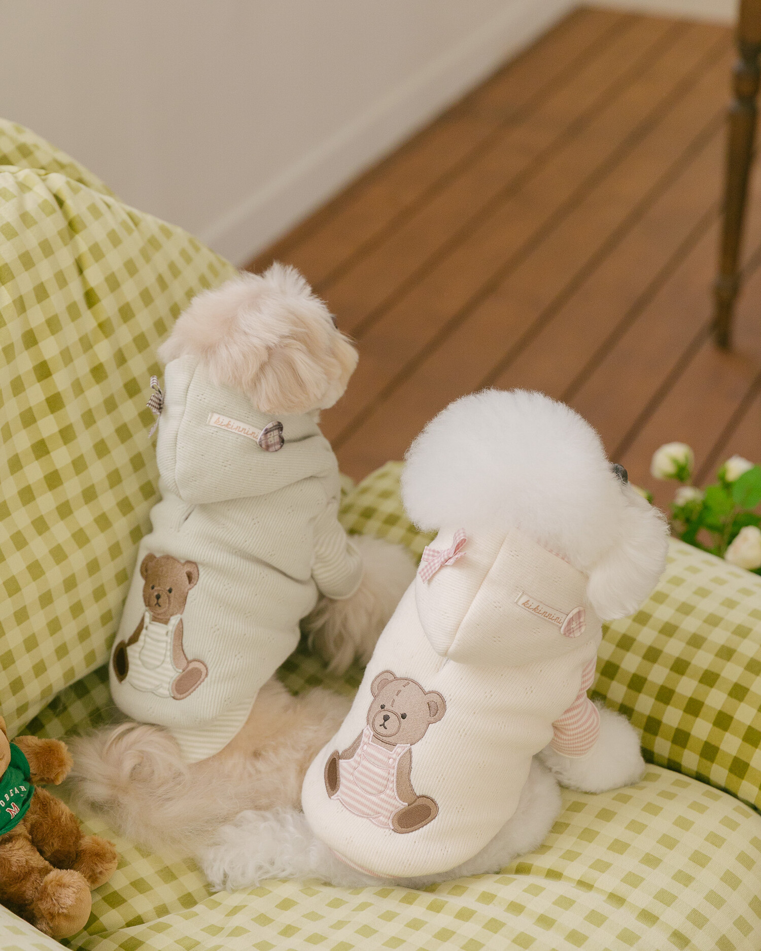 후드에는 깅엄체크 리본과 하트 단추를 더해 사랑스러운 포인트를 완성했습니다🎀