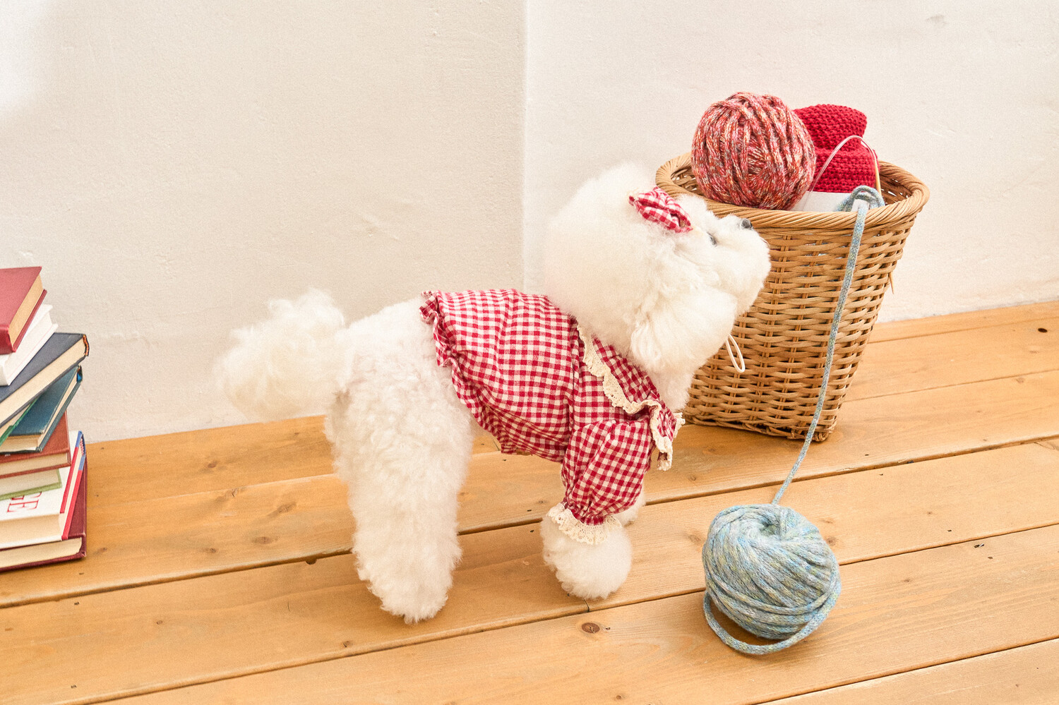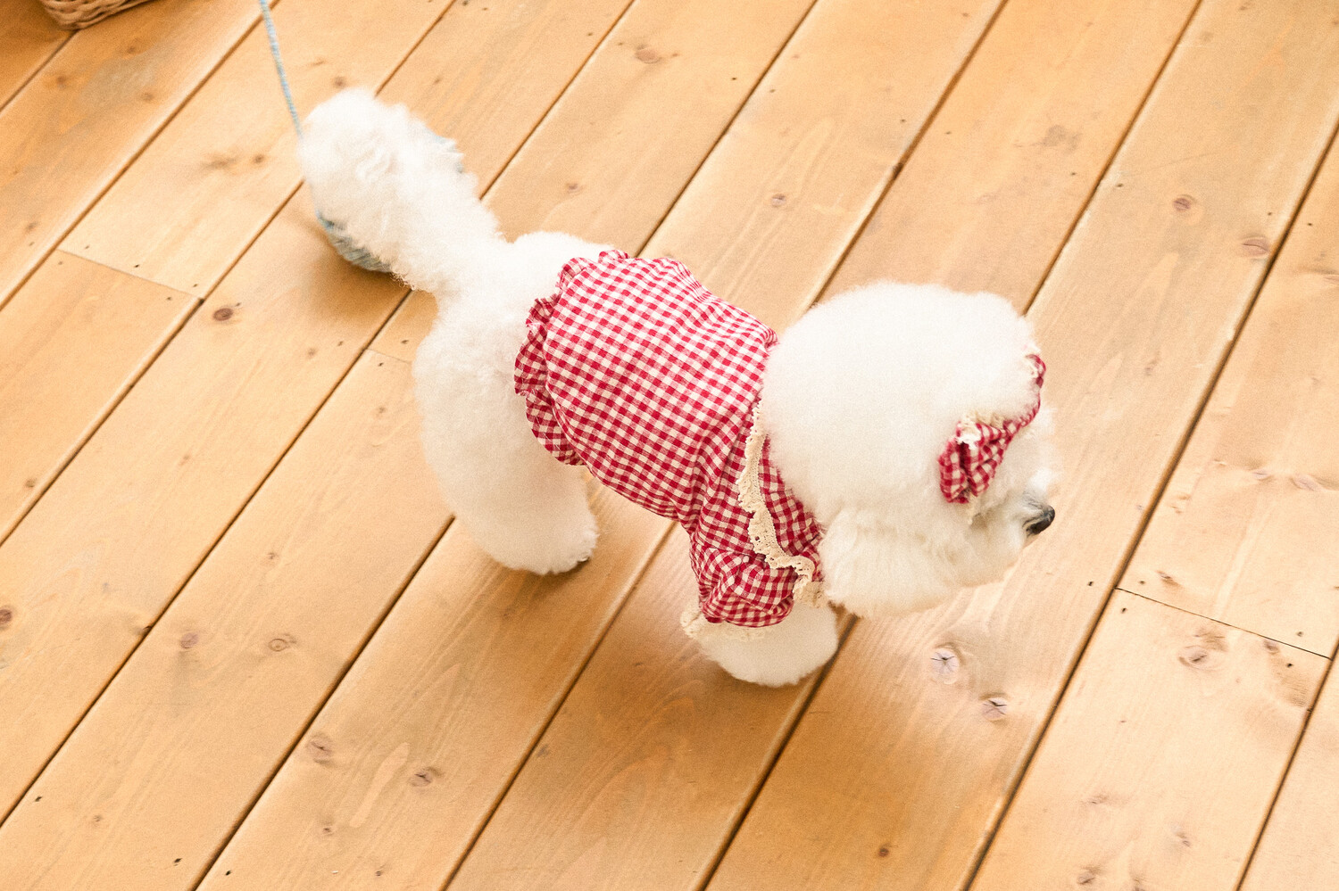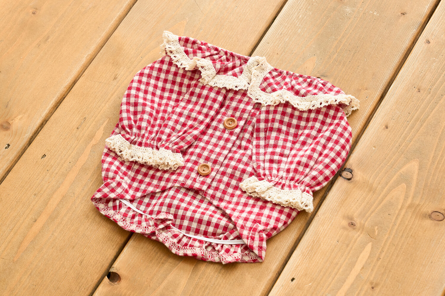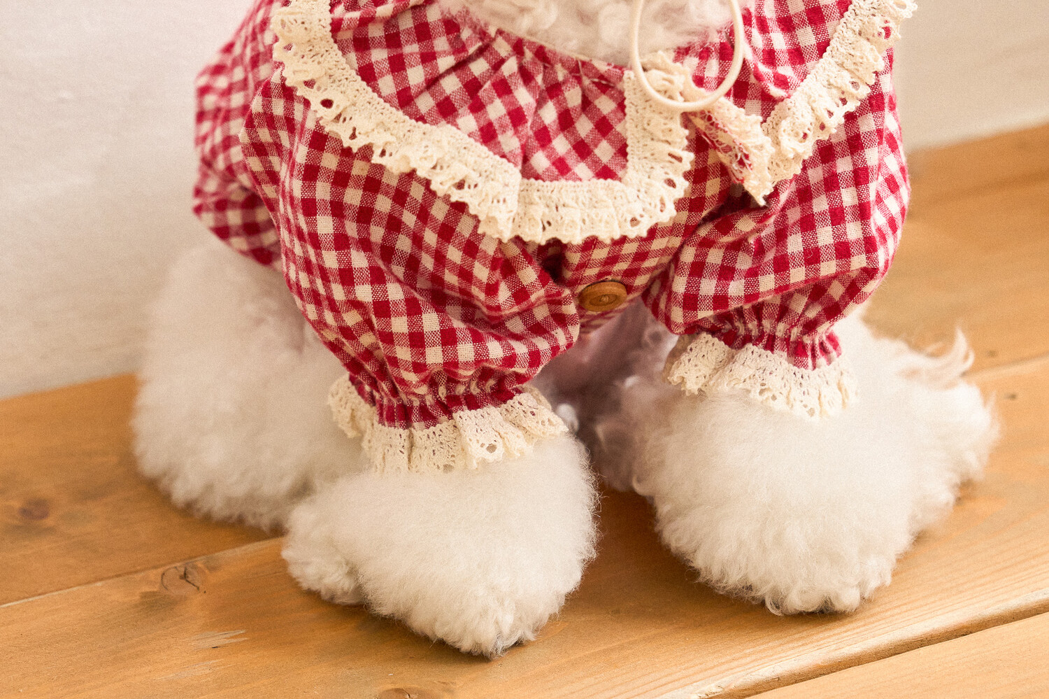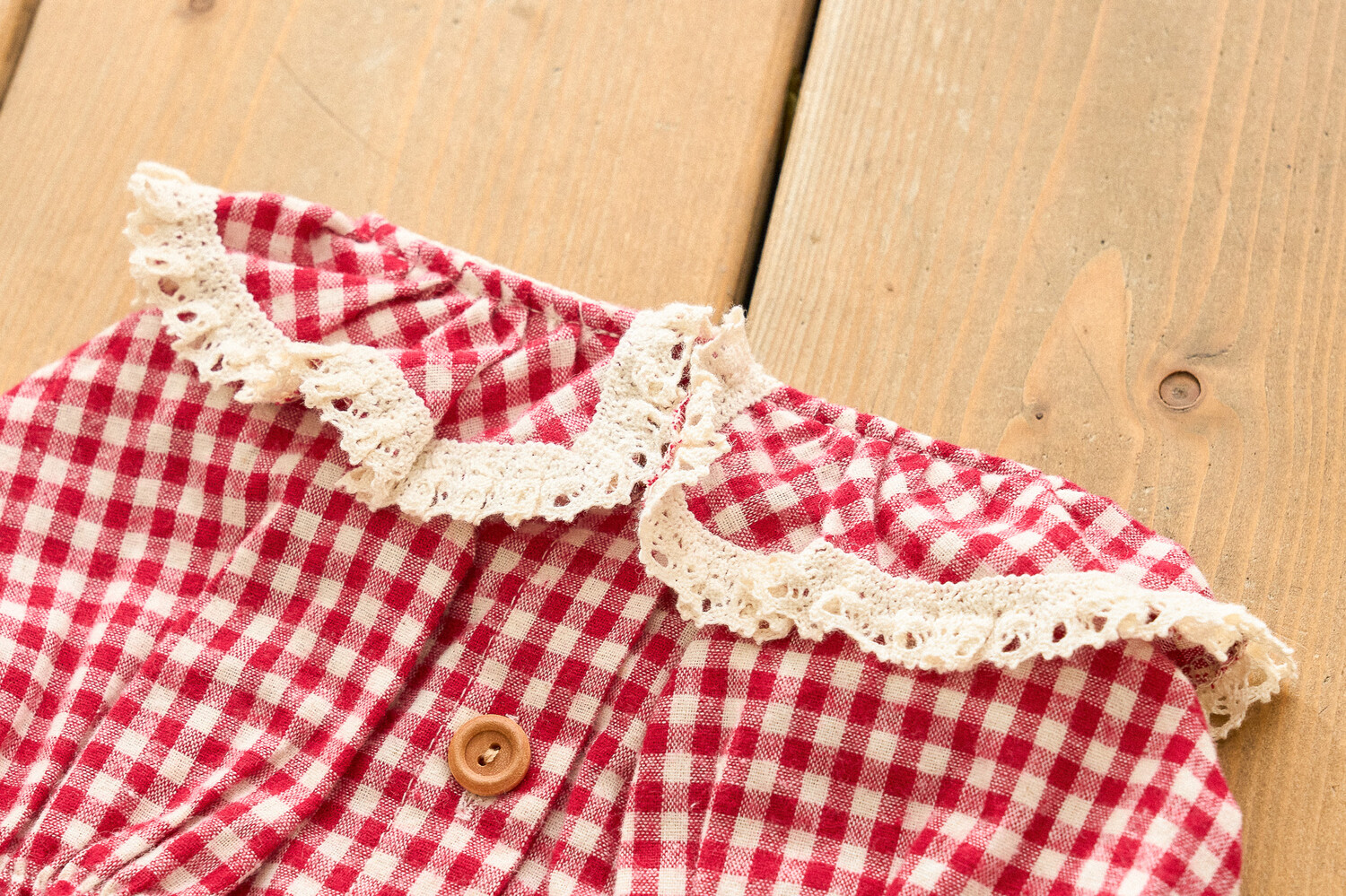 기모가 함유된 체크 원단에 빈티지한 토숀레이스로 넥 프릴과 소매 부분에 사랑스러운 포인트를 주었습니다.