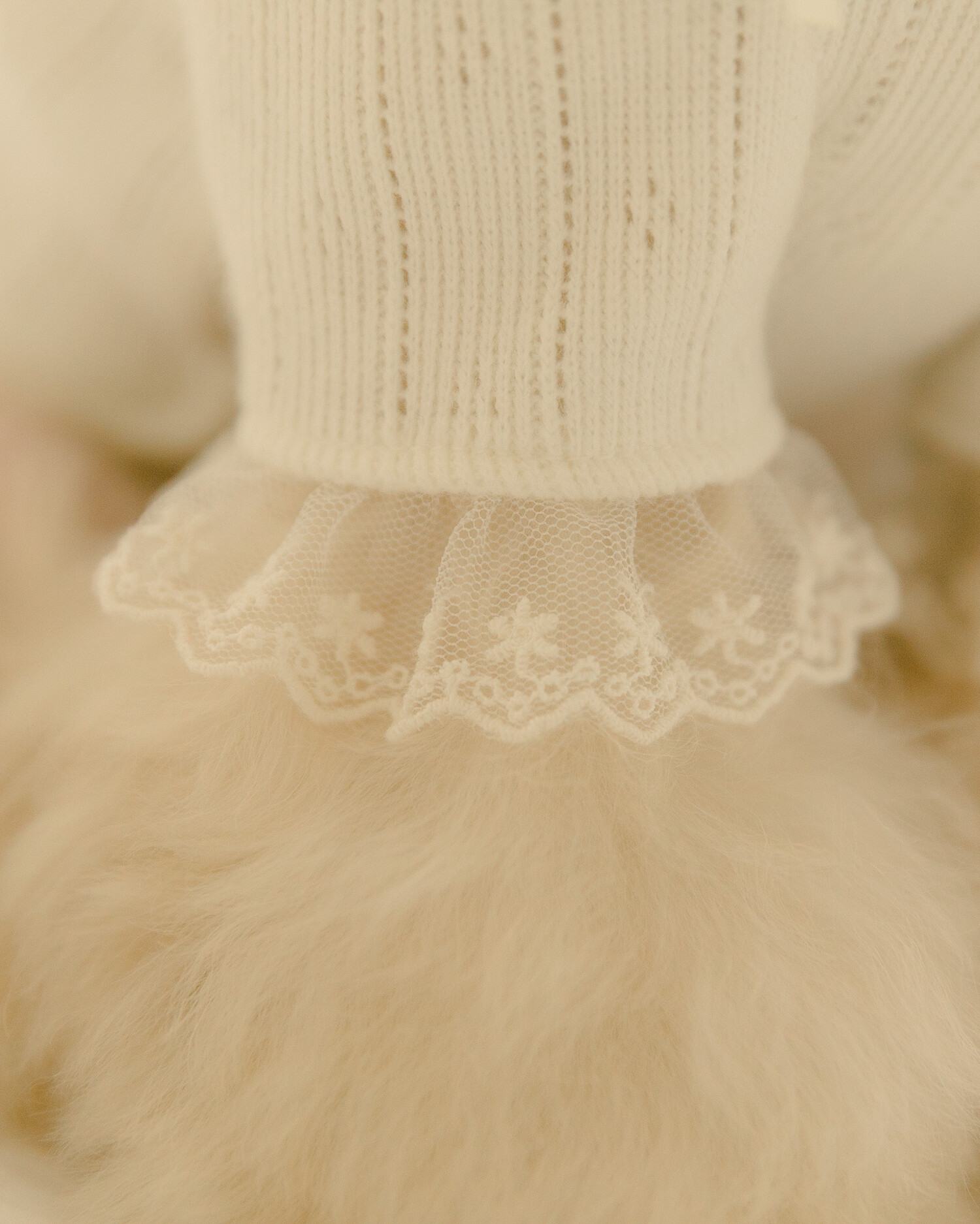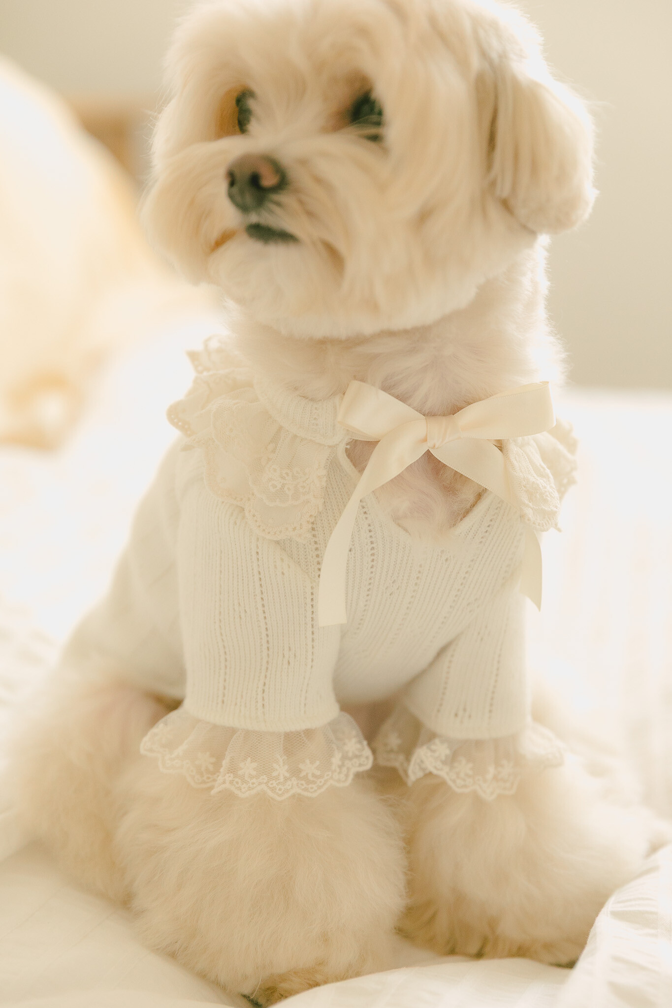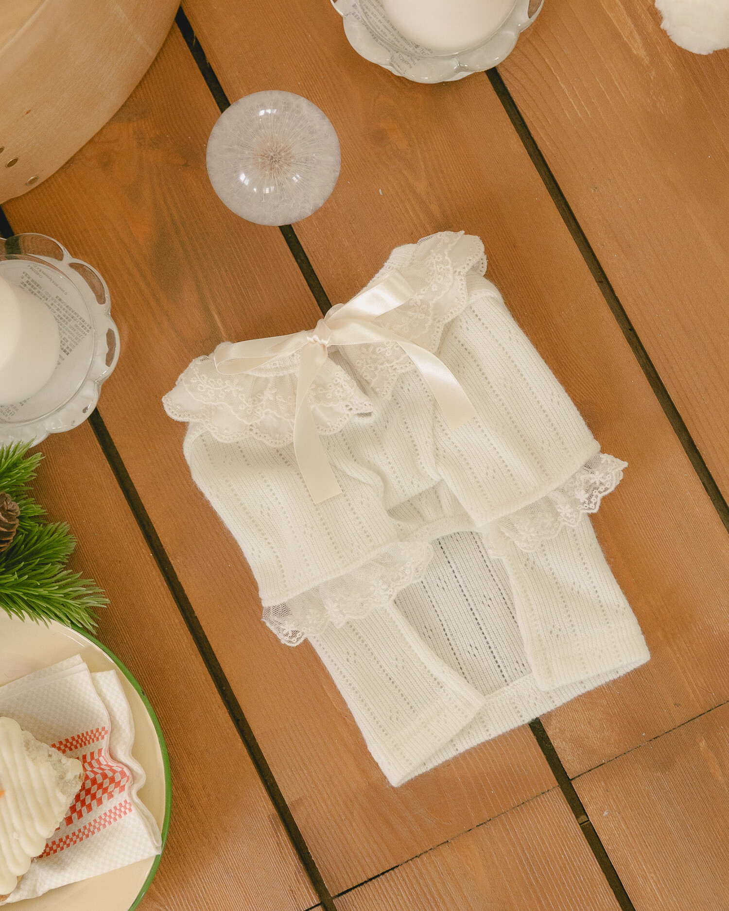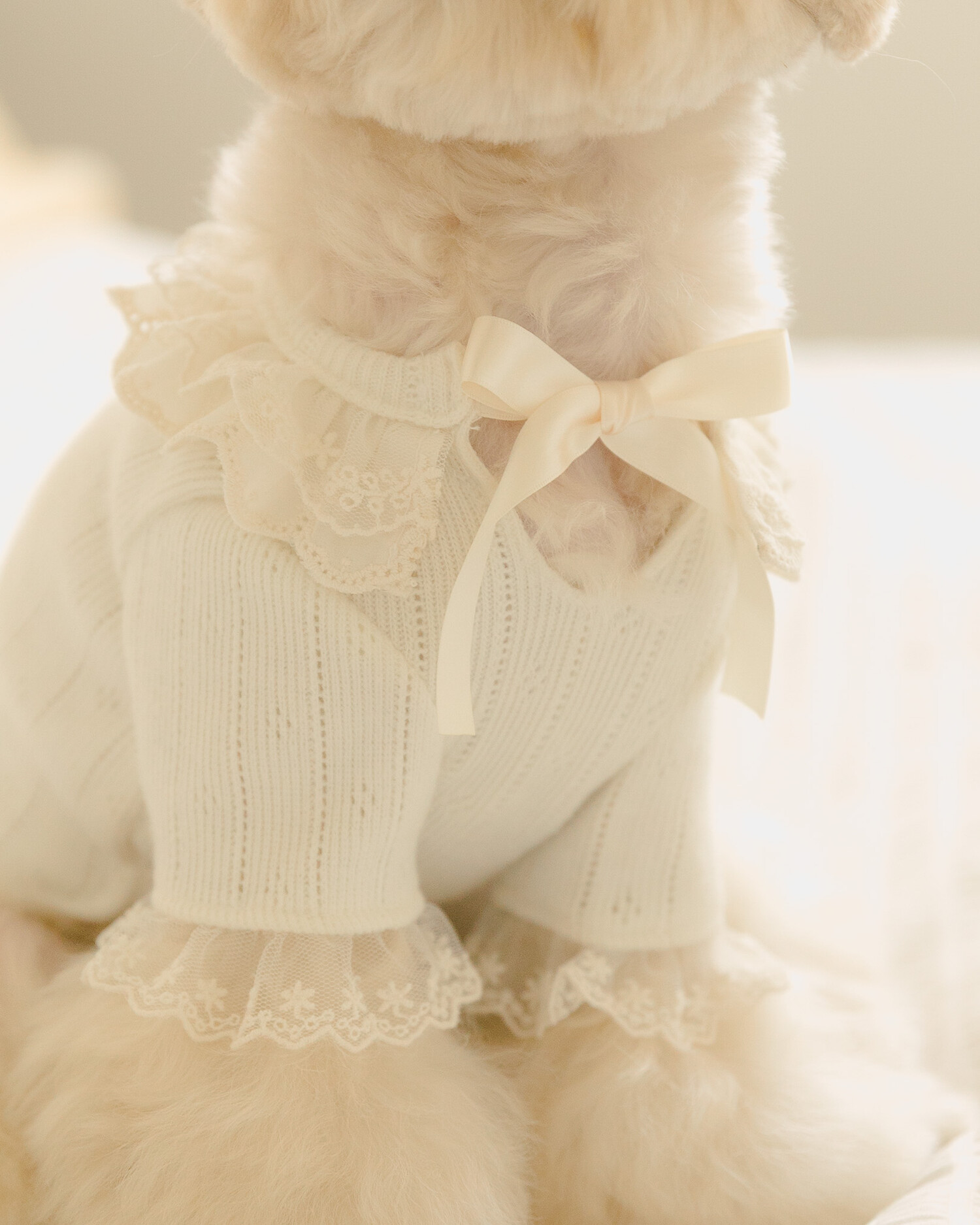 잔잔한 아일렛 니트에 레이스 프릴과 리본 디테일을 더해 완성한