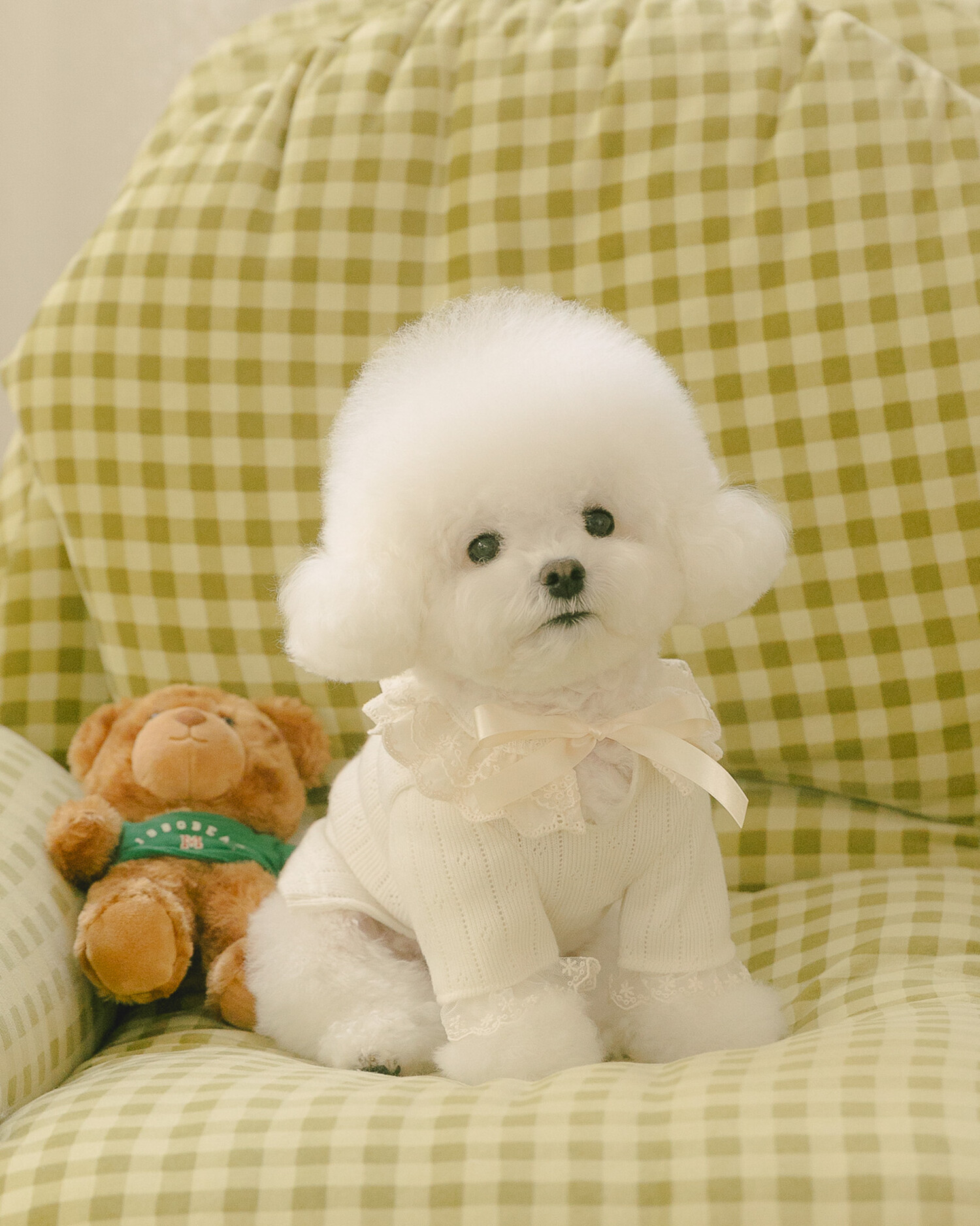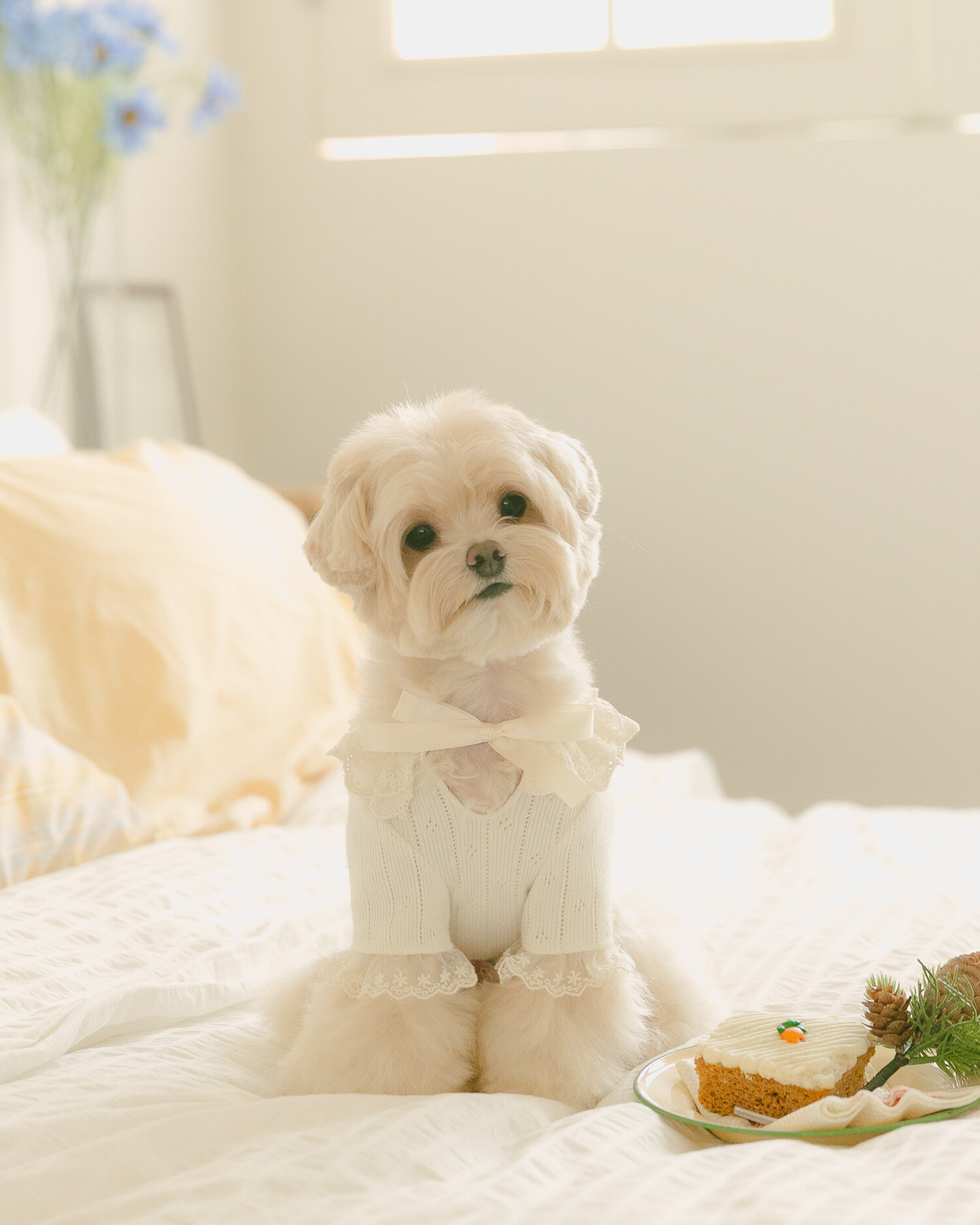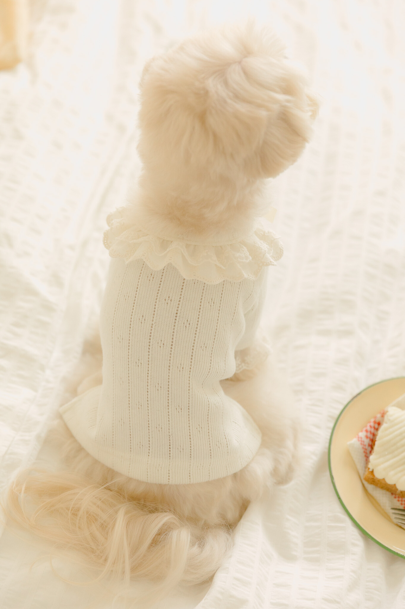 잔잔한 아일렛 니트에 레이스 프릴과 리본 디테일을 더해 완성한