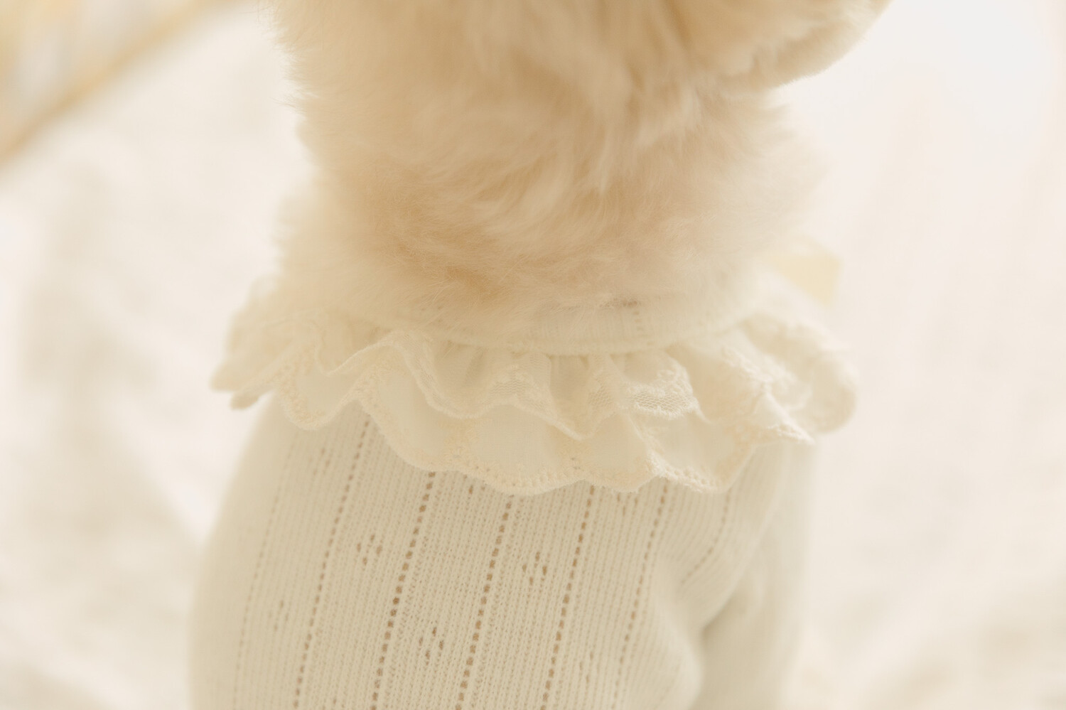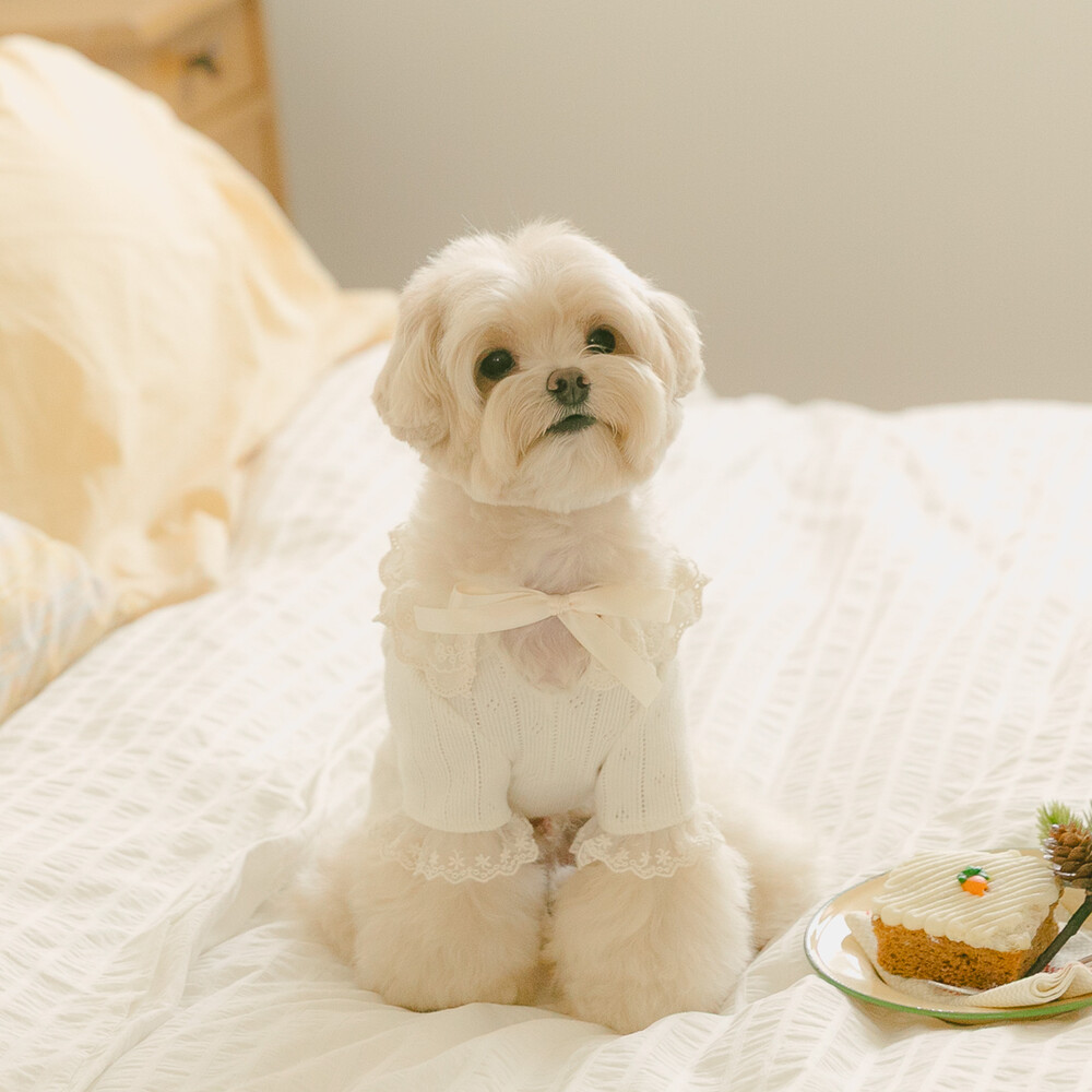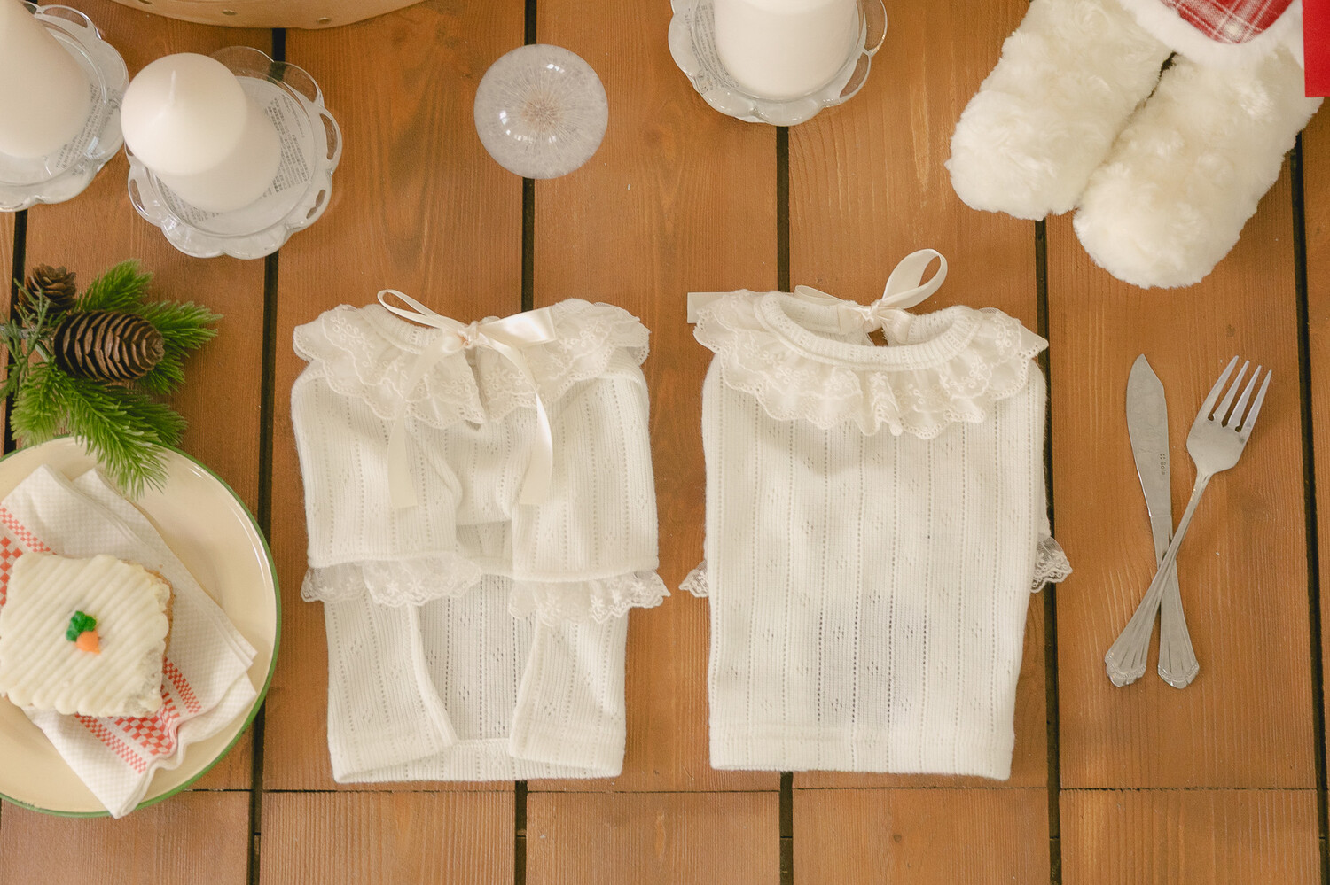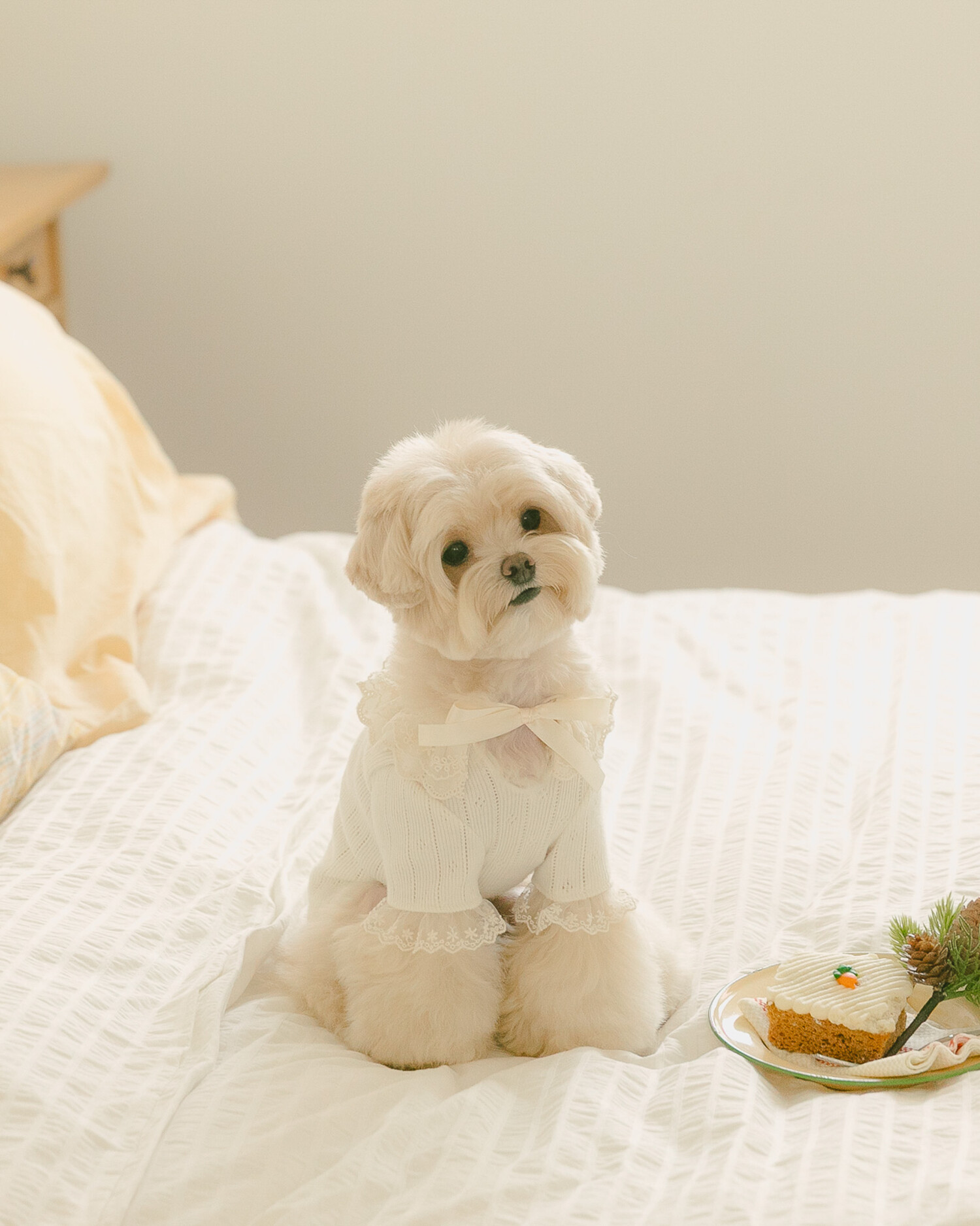 잔잔한 아일렛 니트에 레이스 프릴과 리본 디테일을 더해 완성한