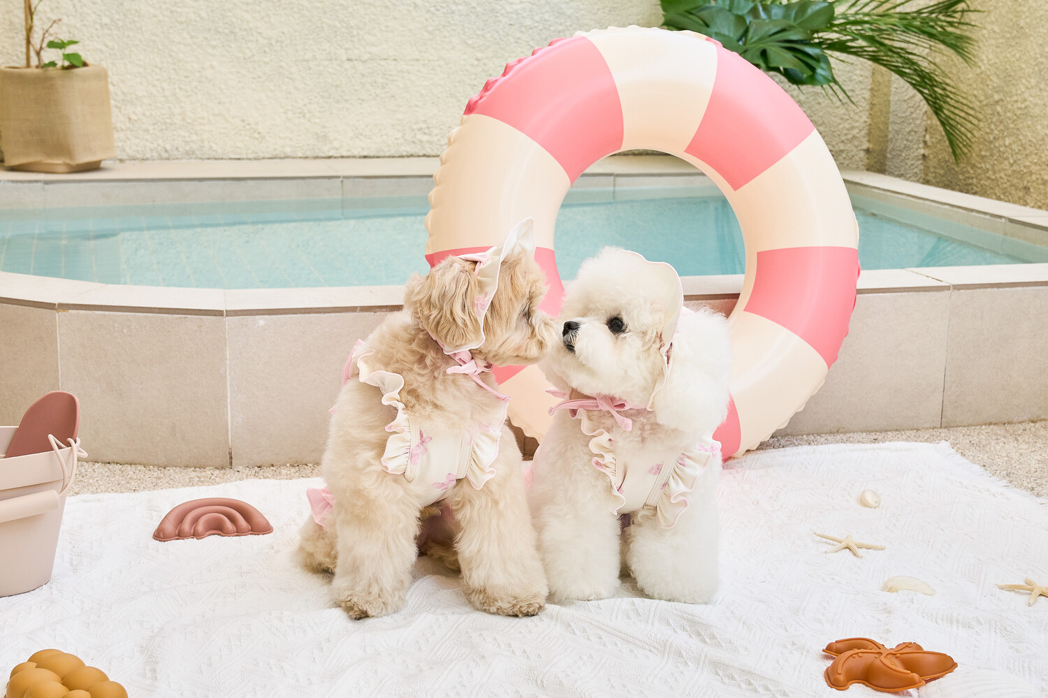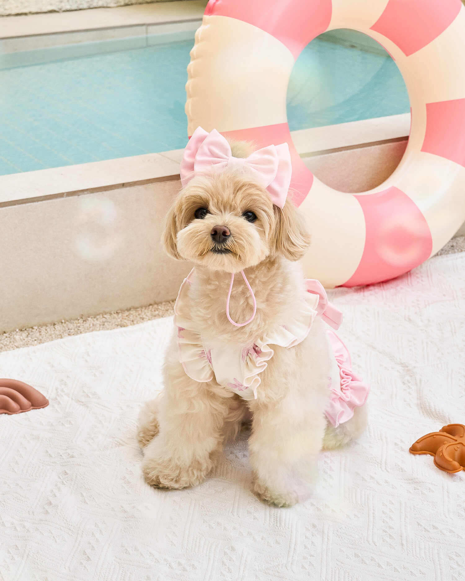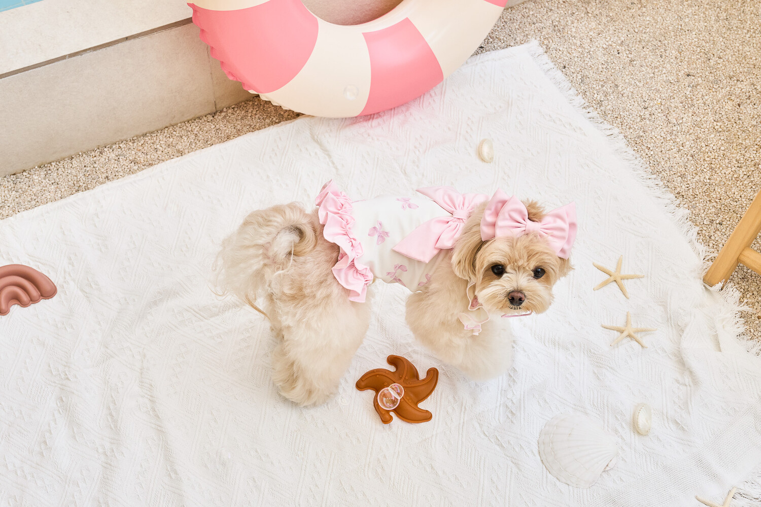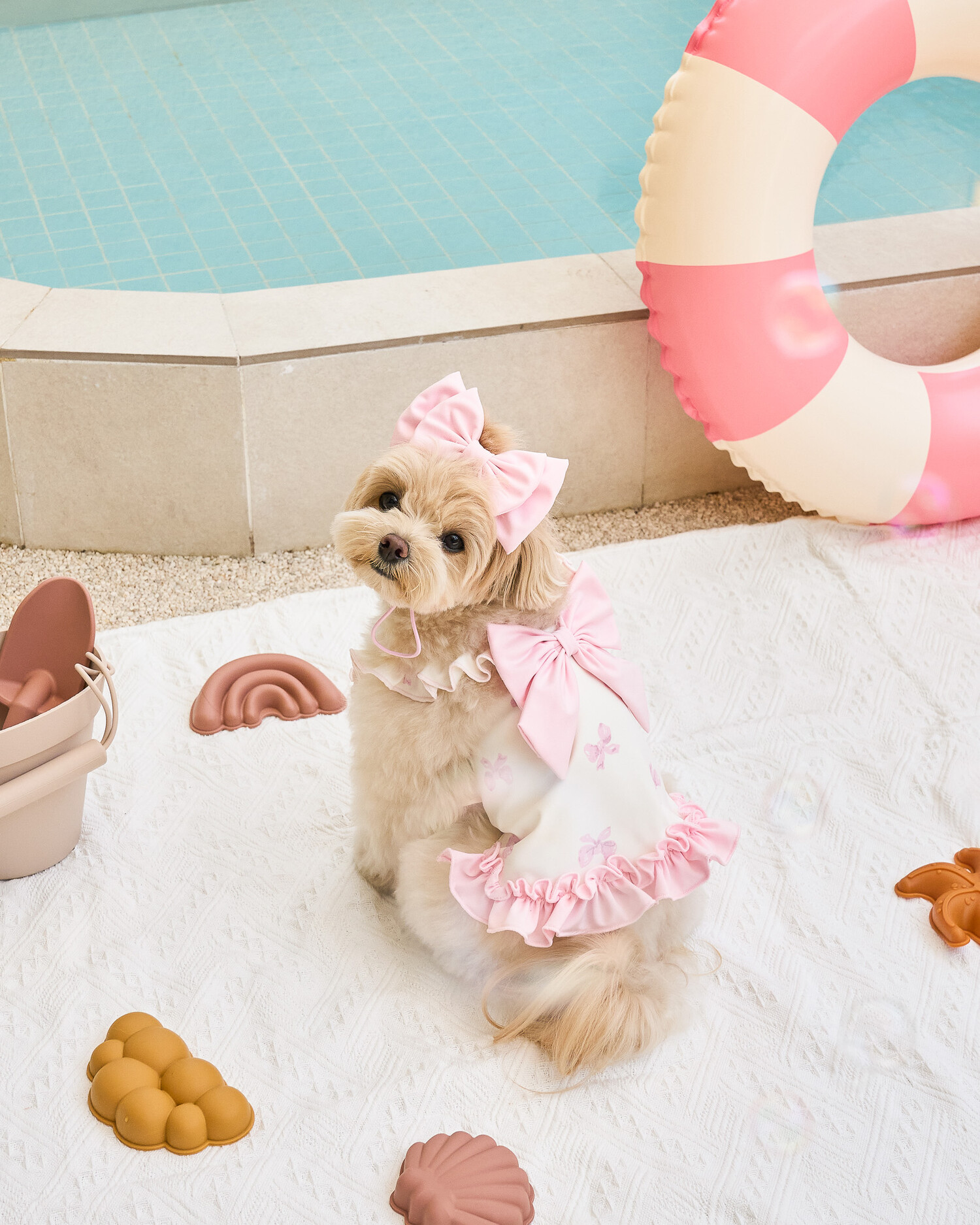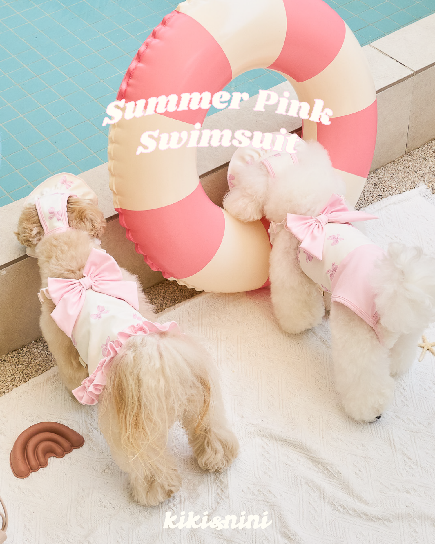 발랄하지만 현란하지 않은, 러블리한 무드의 수영복을 찾으셨다면 키키앤니니에서 첫 선보이는 ‘썸머 핑크 스윔수트’는 어떠신가요♥ 은은하면서 사랑스러운 리본 프린트와 빅 리본 디테일, 어깨&밑단에 사랑스럽게 잡힌 프릴 등 러블리한 무드를 더해주는 디테일과 핑크 컬러의 조합이 포인트인 제품입니다. 청순하고 러블리한 분위기를 자아내는 ‘화이트 핑크’ 세련되면서 힙한 분위기를 자아내는 ‘블랙 핑크’ 두 컬러로 만나보실 수 있으며, 같은 핑크지만 너무 다른 느낌이라 취향에 맞게, 아이들 모색에 맞게 입혀주시면 좋으실 것 같아요! 강아지 수영복에 다소 색다르게 느껴지실 수 있는 ‘블랙’ 컬러와 자칫 호불호가 갈릴 수 있는 ‘핑크’컬러를 전체 포인트 컬러로 사용하는 등 과감한 색감 사용 면에서 키앤니만의 특별함을 느끼실 거에요. 원피스&모노키니 2타입으로 제작되어, 남매룩 또는 친구들과 개플룩으로 맞춰 입히시기 좋으며, 보다 심플하고 군더더기 없는 디테일을 원하신다면 ‘모노키니’ 타입을 추천드립니다. 함께 코디할 수 있는 리본 헤어밴드&스윔 햇도 준비했습니다. 다양한 아이템과 함께 한다면 러블리함이 극대화되겠죠?
