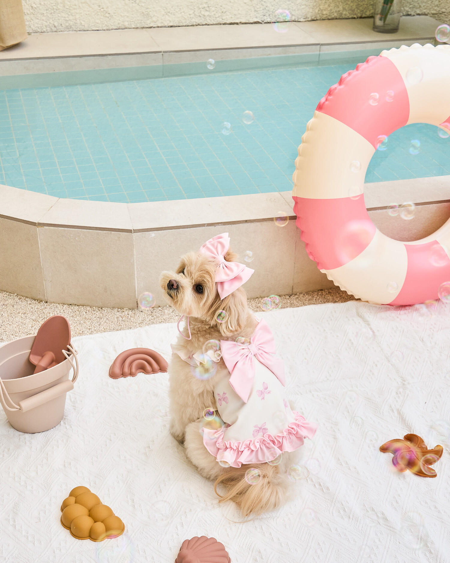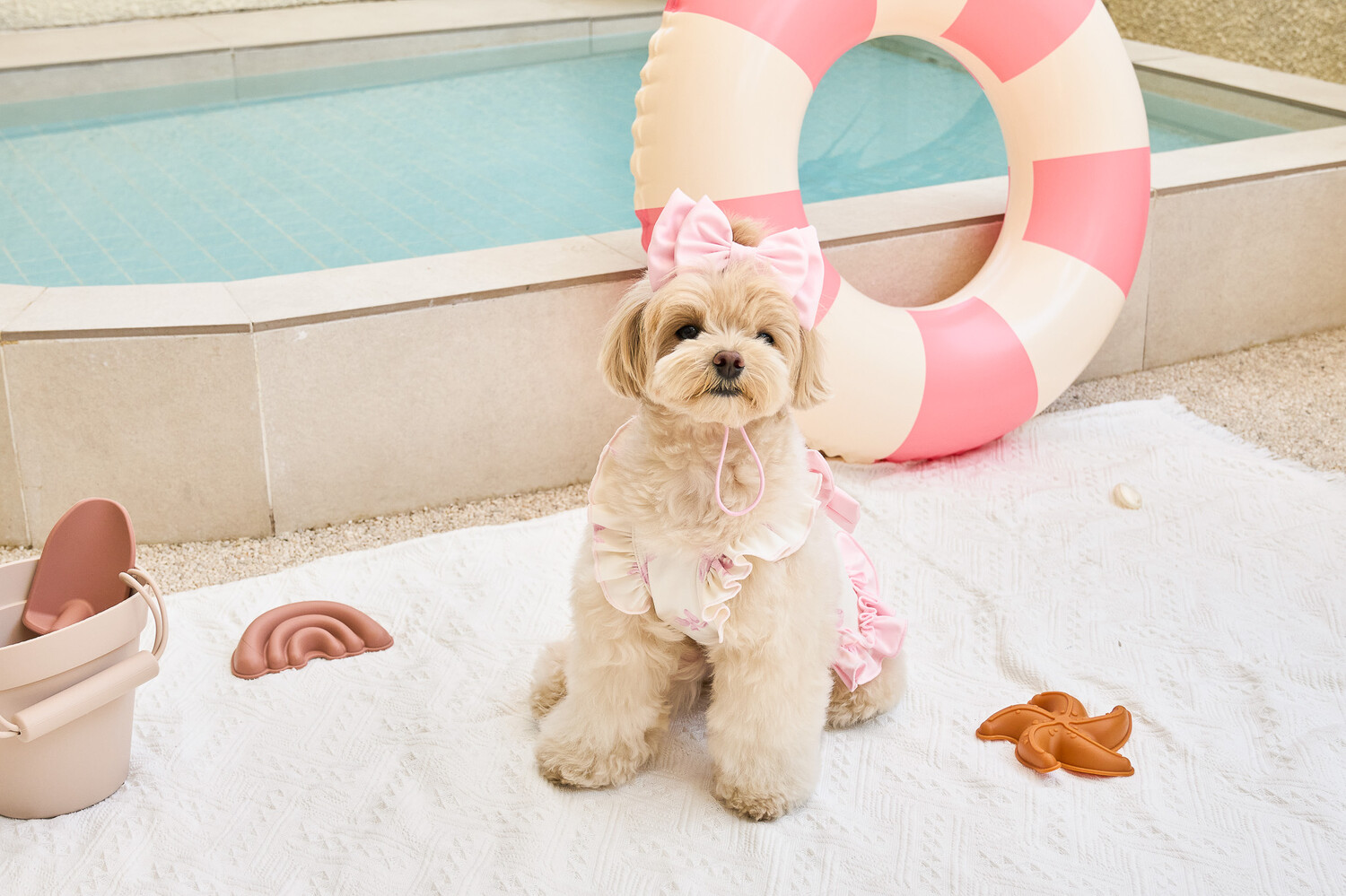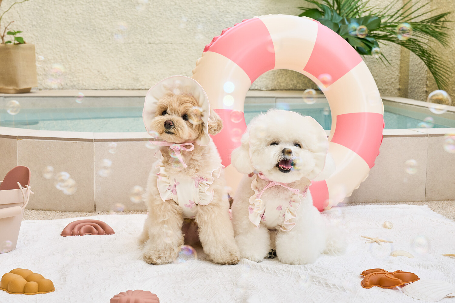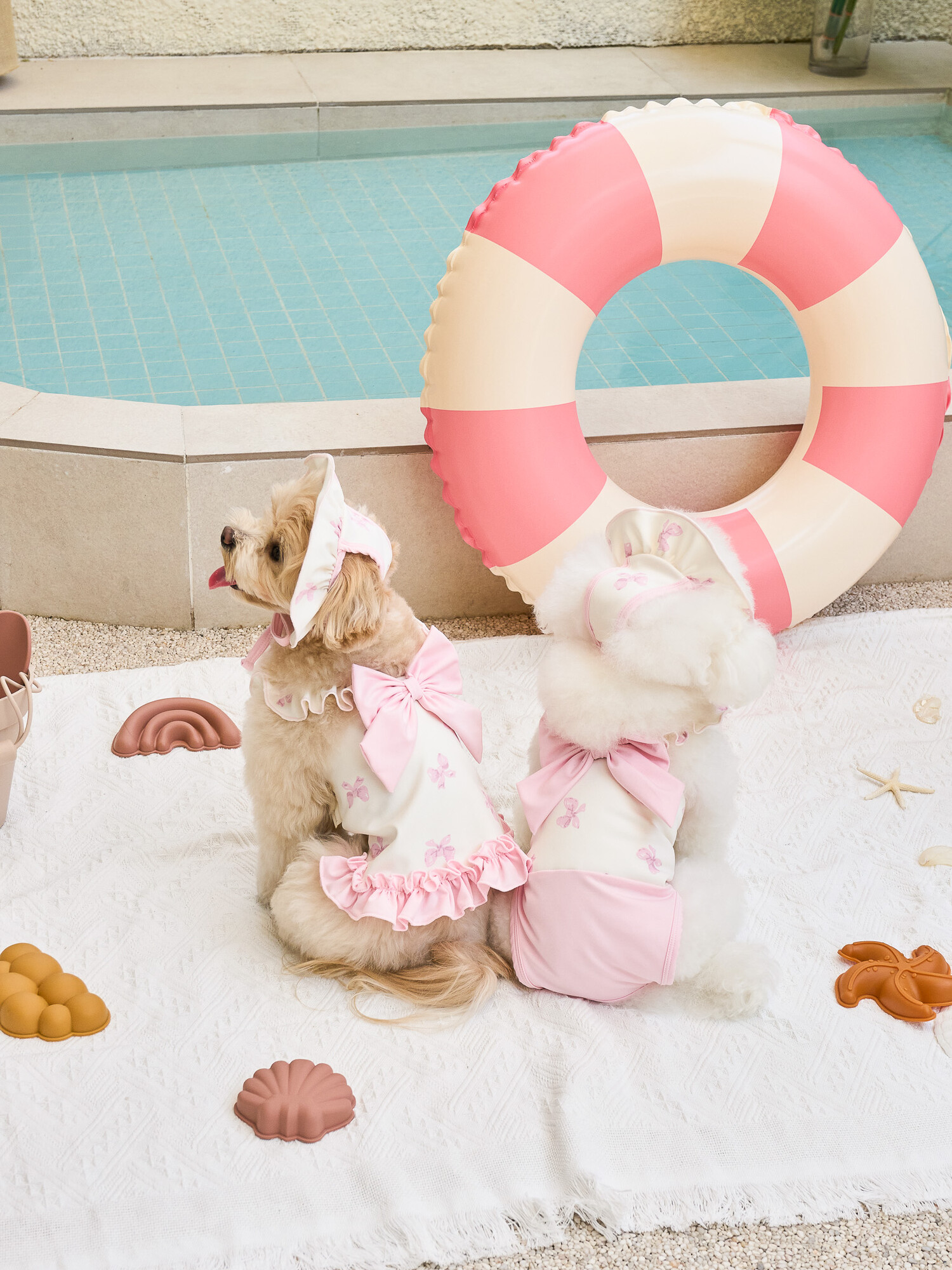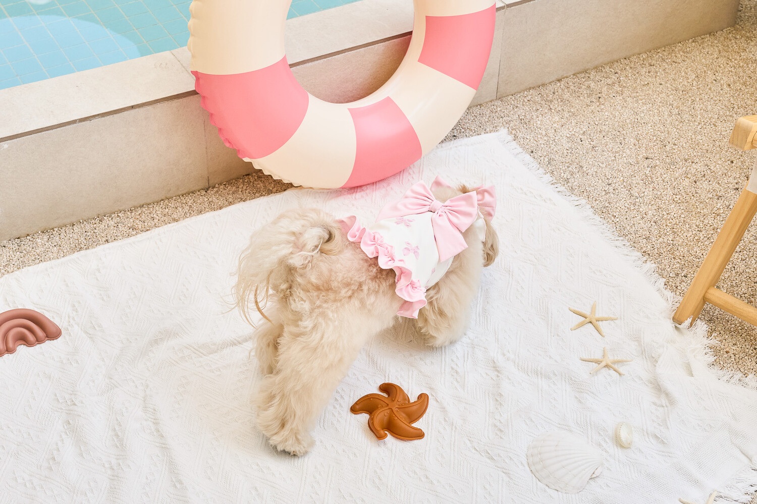 발랄하지만 현란하지 않은, 러블리한 무드의 수영복을 찾으셨다면 키키앤니니에서 첫 선보이는 ‘썸머 핑크 스윔수트’는 어떠신가요♥ 은은하면서 사랑스러운 리본 프린트와 빅 리본 디테일, 어깨&밑단에 사랑스럽게 잡힌 프릴 등 러블리한 무드를 더해주는 디테일과 핑크 컬러의 조합이 포인트인 제품입니다. 청순하고 러블리한 분위기를 자아내는 ‘화이트 핑크’ 세련되면서 힙한 분위기를 자아내는 ‘블랙 핑크’ 두 컬러로 만나보실 수 있으며, 같은 핑크지만 너무 다른 느낌이라 취향에 맞게, 아이들 모색에 맞게 입혀주시면 좋으실 것 같아요! 강아지 수영복에 다소 색다르게 느껴지실 수 있는 ‘블랙’ 컬러와 자칫 호불호가 갈릴 수 있는 ‘핑크’컬러를 전체 포인트 컬러로 사용하는 등 과감한 색감 사용 면에서 키앤니만의 특별함을 느끼실 거에요. 원피스&모노키니 2타입으로 제작되어, 남매룩 또는 친구들과 개플룩으로 맞춰 입히시기 좋으며, 보다 심플하고 군더더기 없는 디테일을 원하신다면 ‘모노키니’ 타입을 추천드립니다. 함께 코디할 수 있는 리본 헤어밴드&스윔 햇도 준비했습니다. 다양한 아이템과 함께 한다면 러블리함이 극대화되겠죠?