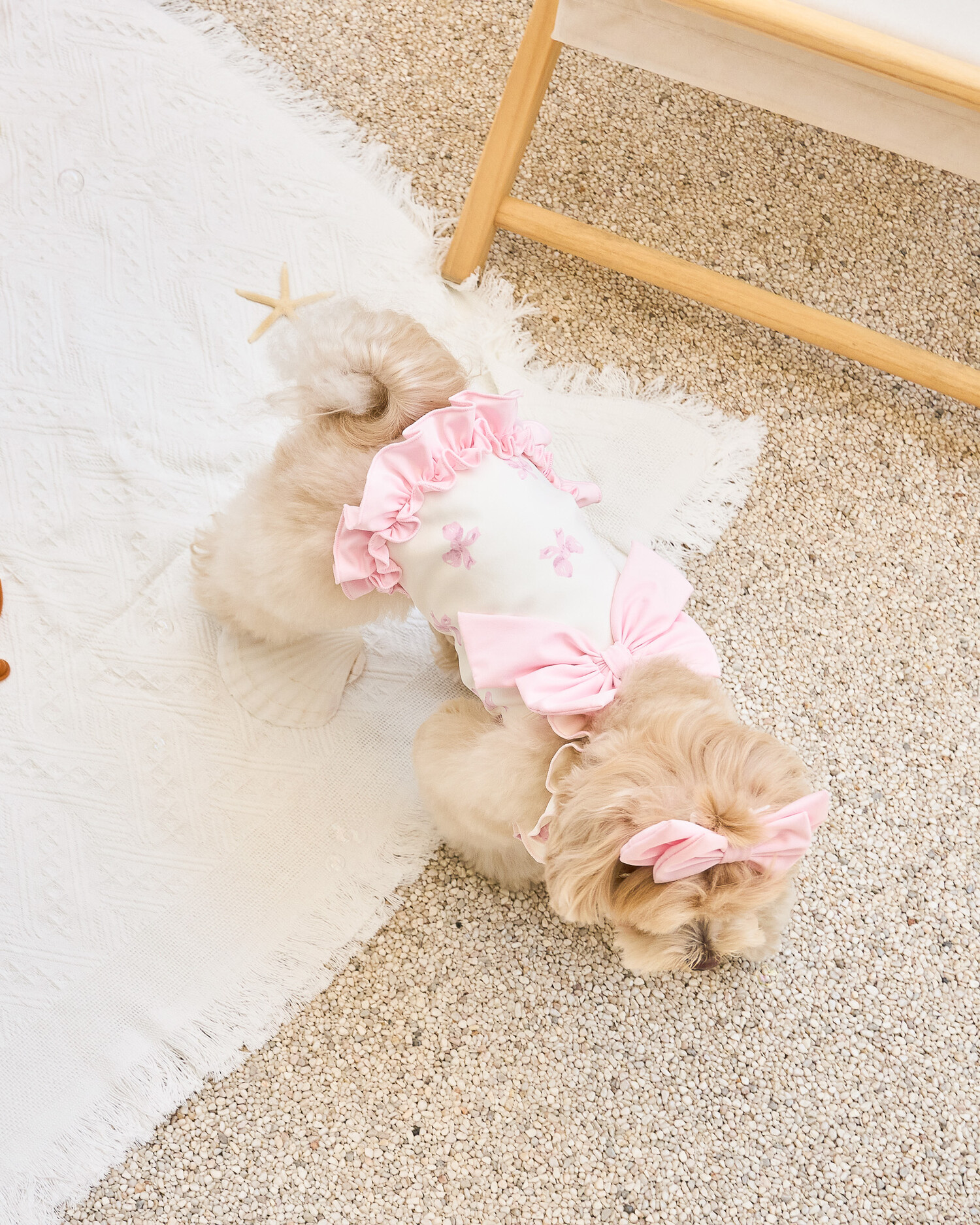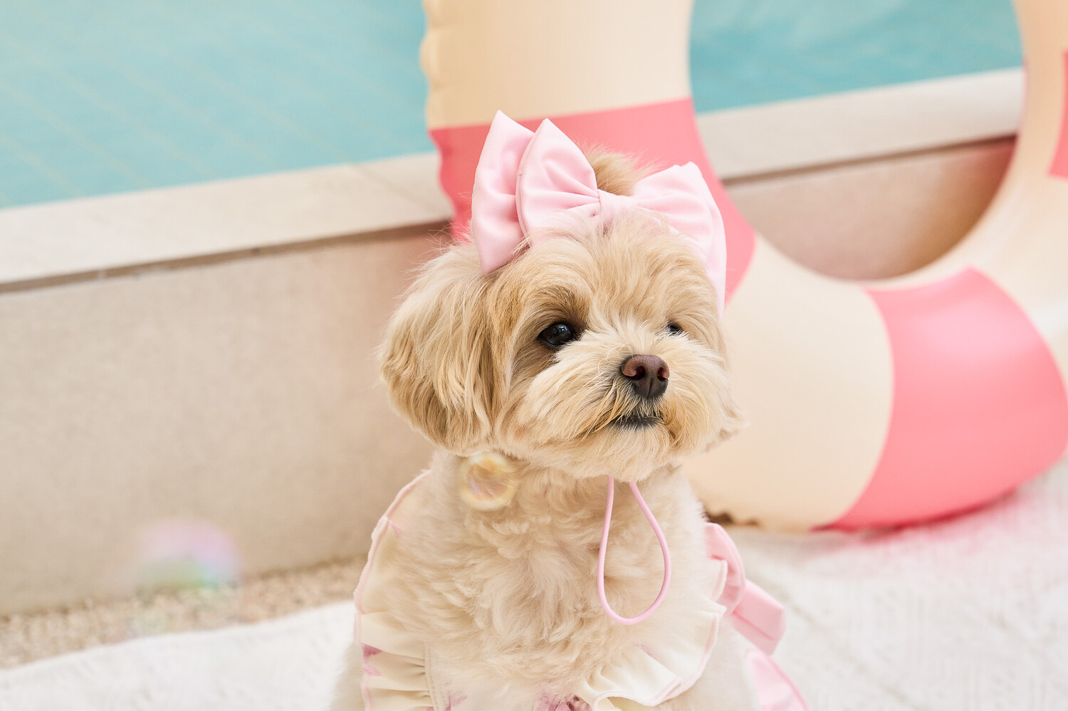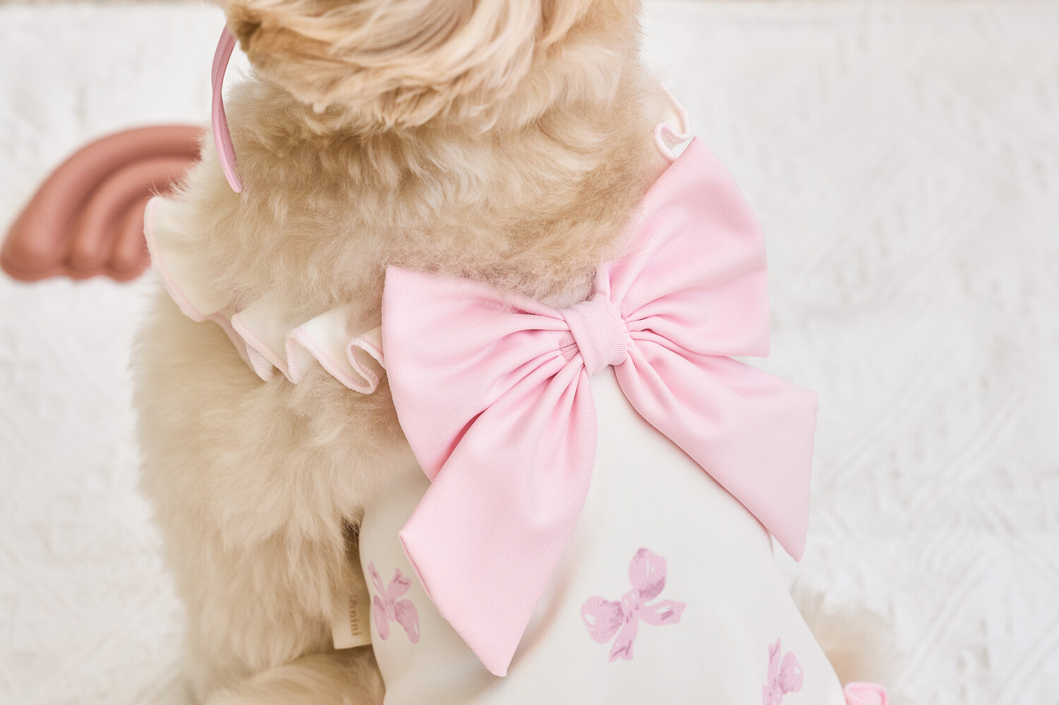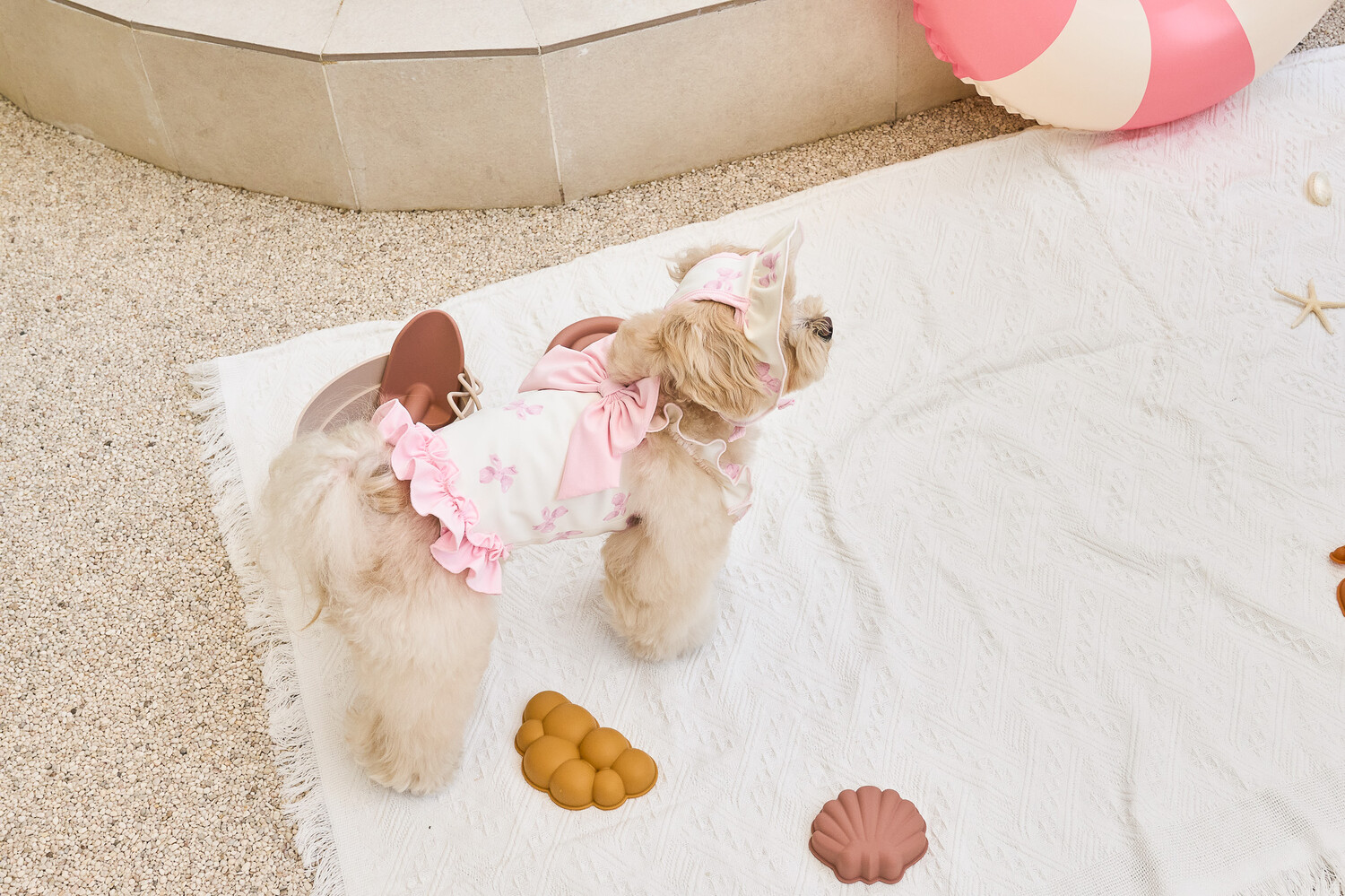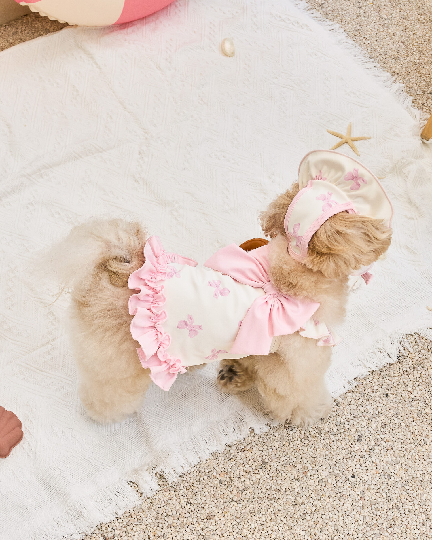발랄하지만 현란하지 않은, 러블리한 무드의 수영복을 찾으셨다면 키키앤니니에서 첫 선보이는 ‘썸머 핑크 스윔수트’는 어떠신가요♥ 은은하면서 사랑스러운 리본 프린트와 빅 리본 디테일, 어깨&밑단에 사랑스럽게 잡힌 프릴 등 러블리한 무드를 더해주는 디테일과 핑크 컬러의 조합이 포인트인 제품입니다. 청순하고 러블리한 분위기를 자아내는 ‘화이트 핑크’ 세련되면서 힙한 분위기를 자아내는 ‘블랙 핑크’ 두 컬러로 만나보실 수 있으며, 같은 핑크지만 너무 다른 느낌이라 취향에 맞게, 아이들 모색에 맞게 입혀주시면 좋으실 것 같아요! 강아지 수영복에 다소 색다르게 느껴지실 수 있는 ‘블랙’ 컬러와 자칫 호불호가 갈릴 수 있는 ‘핑크’컬러를 전체 포인트 컬러로 사용하는 등 과감한 색감 사용 면에서 키앤니만의 특별함을 느끼실 거에요. 원피스&모노키니 2타입으로 제작되어, 남매룩 또는 친구들과 개플룩으로 맞춰 입히시기 좋으며, 보다 심플하고 군더더기 없는 디테일을 원하신다면 ‘모노키니’ 타입을 추천드립니다. 함께 코디할 수 있는 리본 헤어밴드&스윔 햇도 준비했습니다. 다양한 아이템과 함께 한다면 러블리함이 극대화되겠죠?