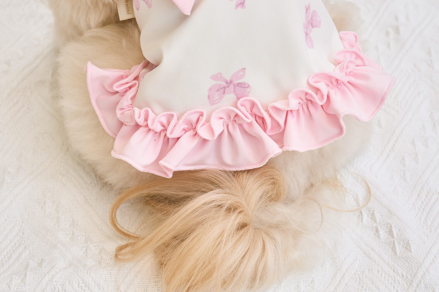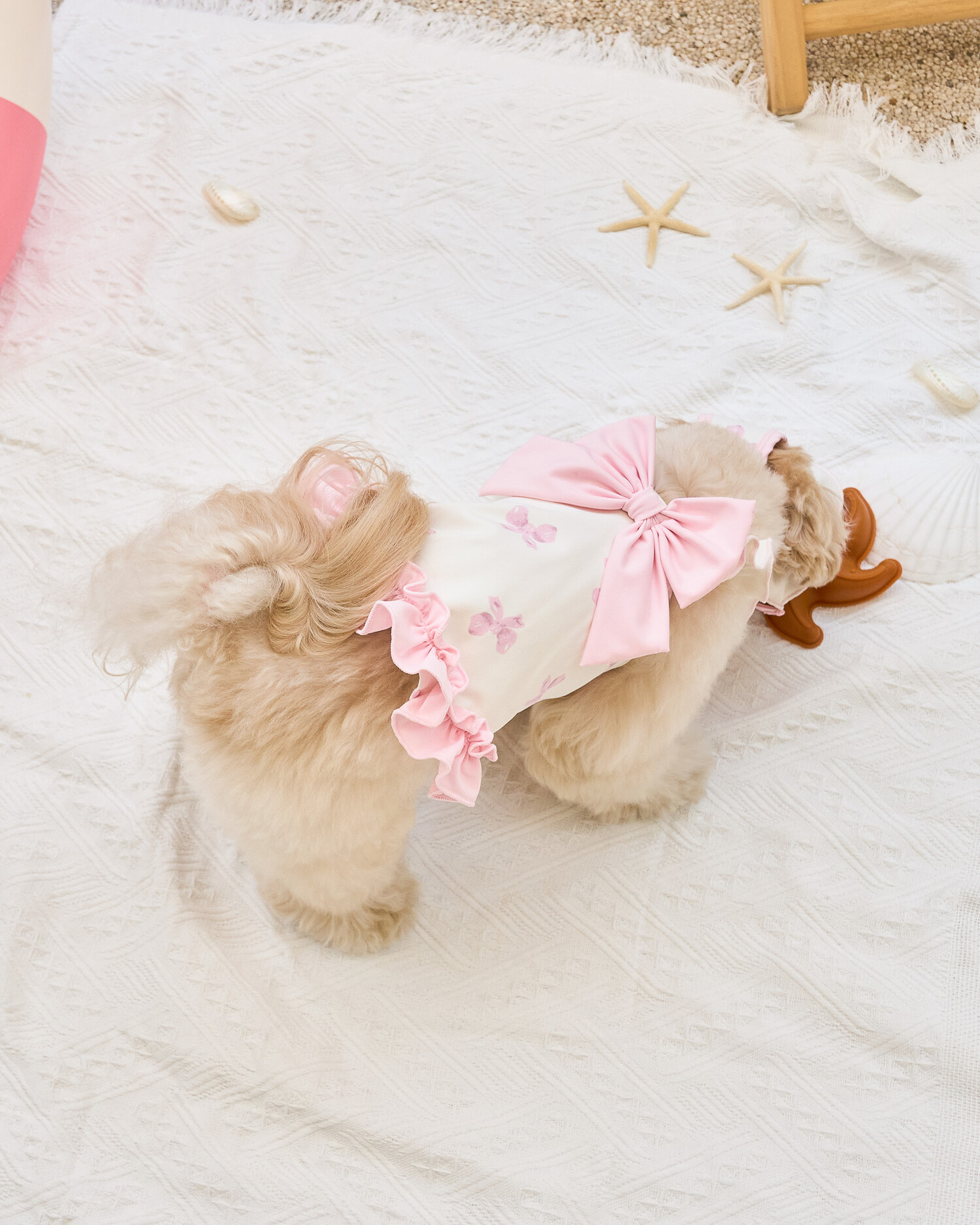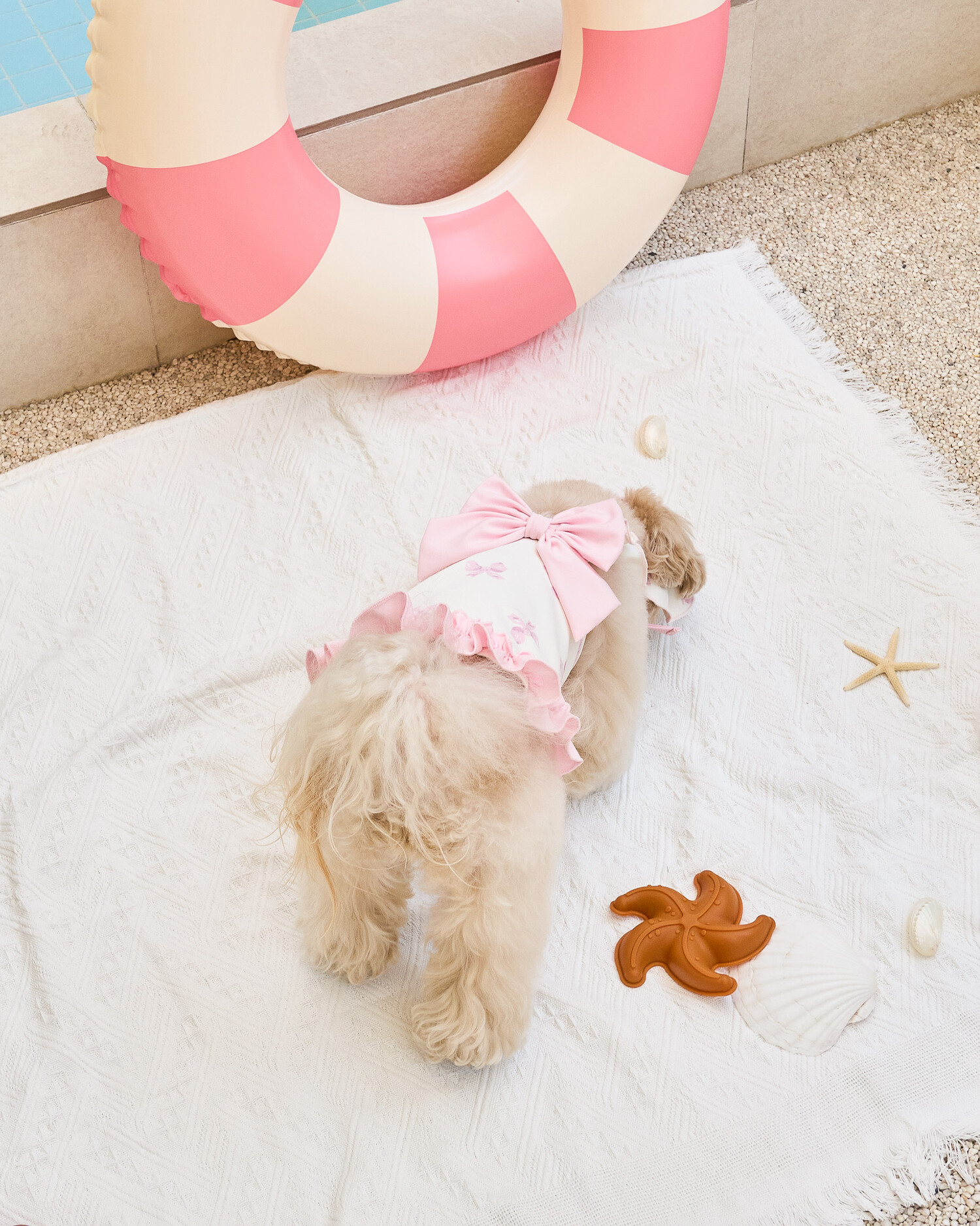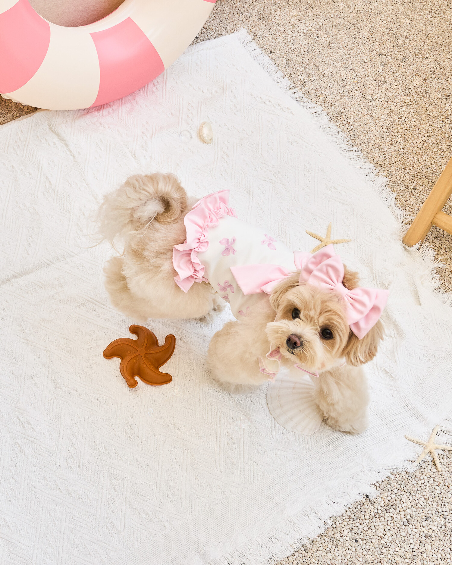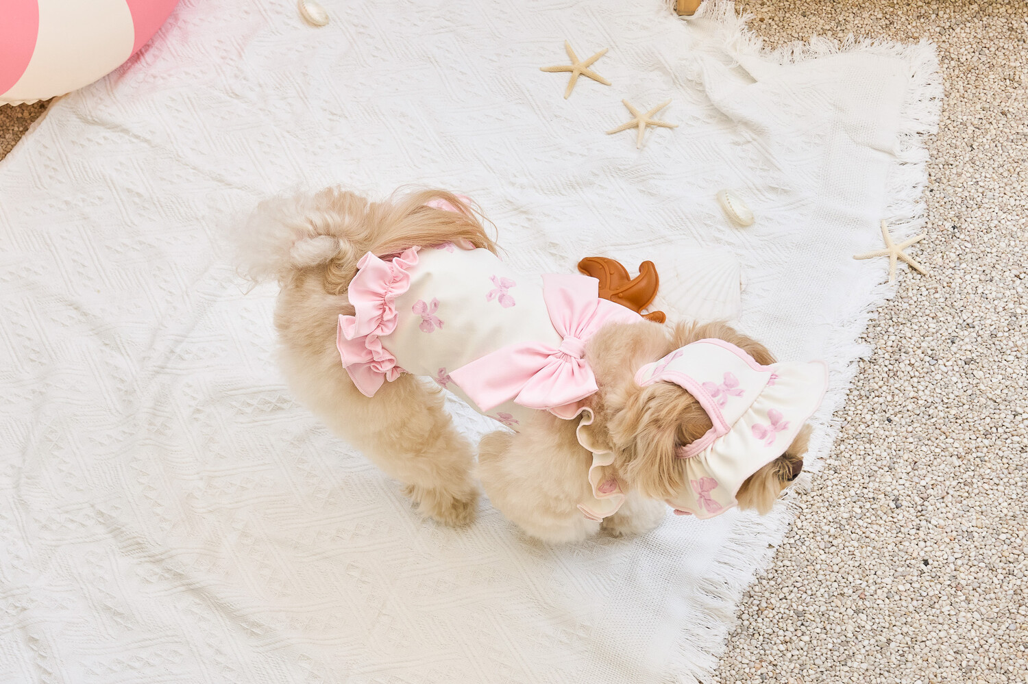 발랄하지만 현란하지 않은, 러블리한 무드의 수영복을 찾으셨다면 키키앤니니에서 첫 선보이는 ‘썸머 핑크 스윔수트’는 어떠신가요♥ 은은하면서 사랑스러운 리본 프린트와 빅 리본 디테일, 어깨&밑단에 사랑스럽게 잡힌 프릴 등 러블리한 무드를 더해주는 디테일과 핑크 컬러의 조합이 포인트인 제품입니다. 청순하고 러블리한 분위기를 자아내는 ‘화이트 핑크’ 세련되면서 힙한 분위기를 자아내는 ‘블랙 핑크’ 두 컬러로 만나보실 수 있으며, 같은 핑크지만 너무 다른 느낌이라 취향에 맞게, 아이들 모색에 맞게 입혀주시면 좋으실 것 같아요! 강아지 수영복에 다소 색다르게 느껴지실 수 있는 ‘블랙’ 컬러와 자칫 호불호가 갈릴 수 있는 ‘핑크’컬러를 전체 포인트 컬러로 사용하는 등 과감한 색감 사용 면에서 키앤니만의 특별함을 느끼실 거에요. 원피스&모노키니 2타입으로 제작되어, 남매룩 또는 친구들과 개플룩으로 맞춰 입히시기 좋으며, 보다 심플하고 군더더기 없는 디테일을 원하신다면 ‘모노키니’ 타입을 추천드립니다. 함께 코디할 수 있는 리본 헤어밴드&스윔 햇도 준비했습니다. 다양한 아이템과 함께 한다면 러블리함이 극대화되겠죠?
