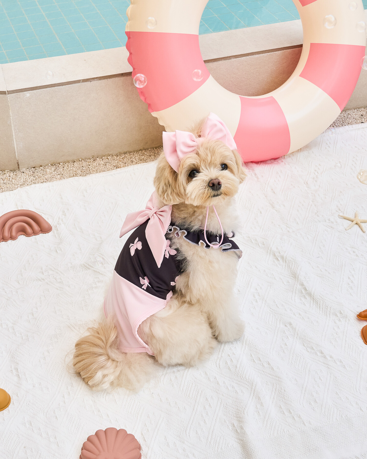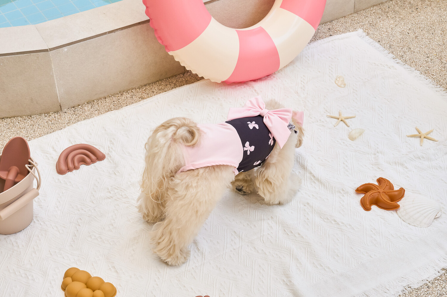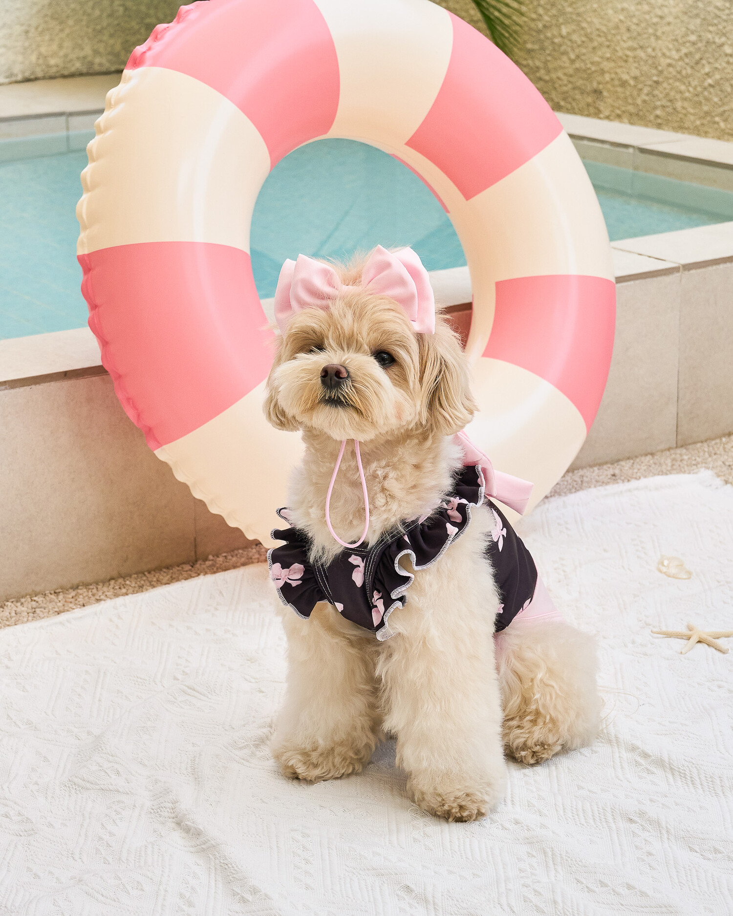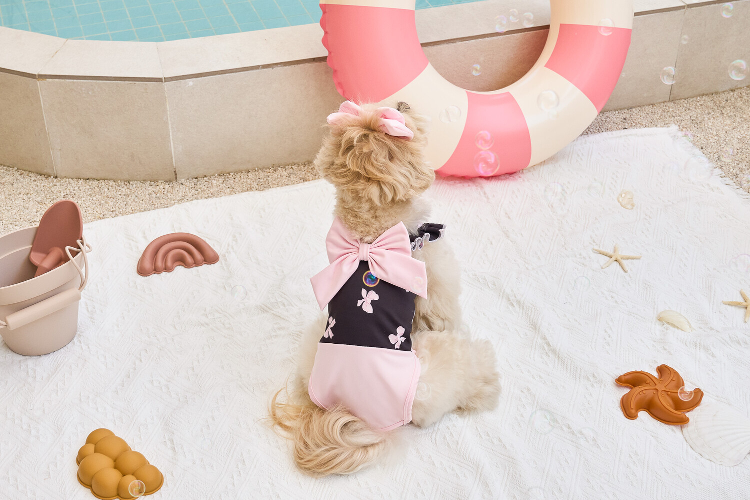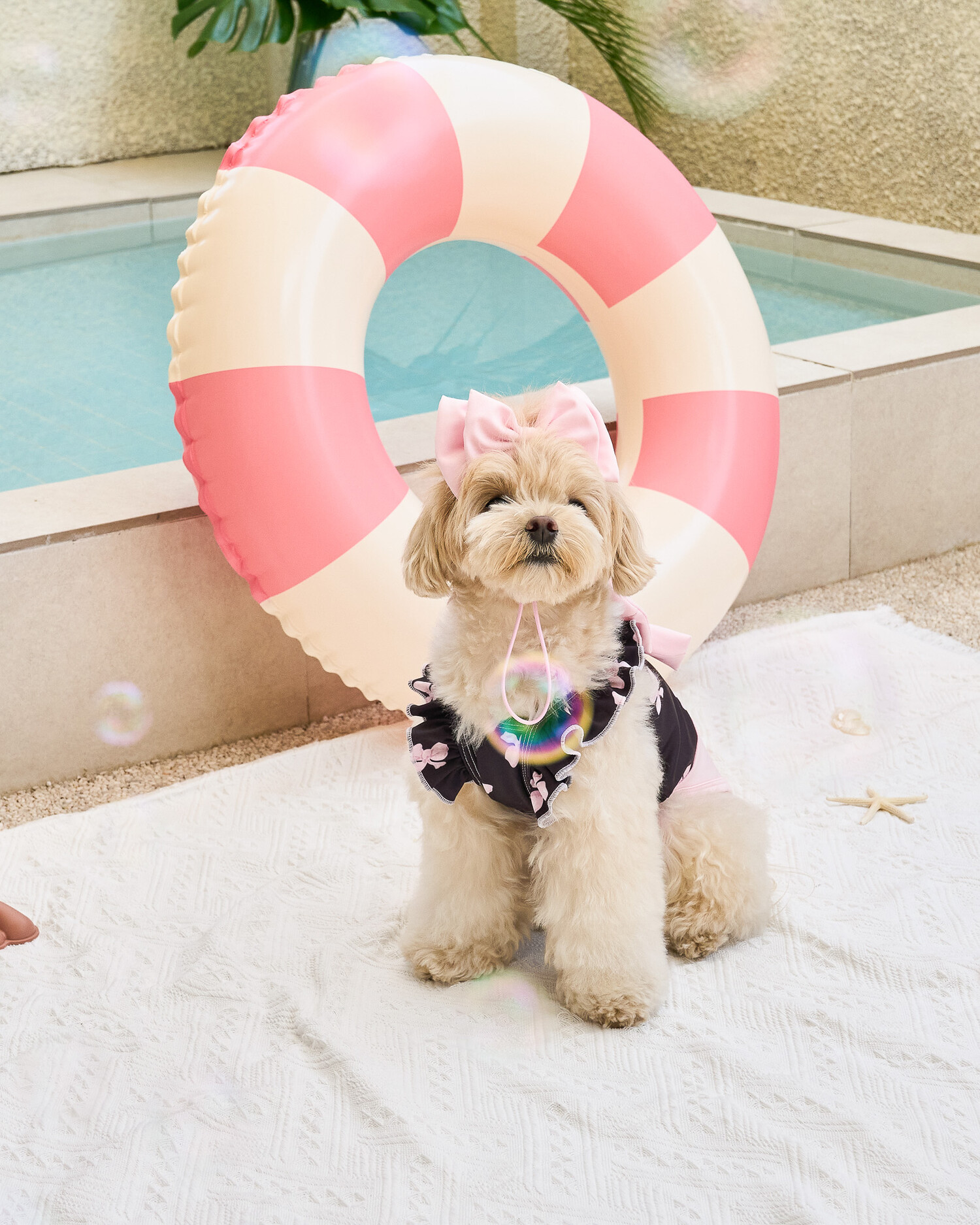 발랄하지만 현란하지 않은, 러블리한 무드의 수영복을 찾으셨다면 키키앤니니에서 첫 선보이는 ‘썸머 핑크 스윔수트’는 어떠신가요♥ 은은하면서 사랑스러운 리본 프린트와 빅 리본 디테일, 어깨&밑단에 사랑스럽게 잡힌 프릴 등 러블리한 무드를 더해주는 디테일과 핑크 컬러의 조합이 포인트인 제품입니다. 청순하고 러블리한 분위기를 자아내는 ‘화이트 핑크’ 세련되면서 힙한 분위기를 자아내는 ‘블랙 핑크’ 두 컬러로 만나보실 수 있으며, 같은 핑크지만 너무 다른 느낌이라 취향에 맞게, 아이들 모색에 맞게 입혀주시면 좋으실 것 같아요! 강아지 수영복에 다소 색다르게 느껴지실 수 있는 ‘블랙’ 컬러와 자칫 호불호가 갈릴 수 있는 ‘핑크’컬러를 전체 포인트 컬러로 사용하는 등 과감한 색감 사용 면에서 키앤니만의 특별함을 느끼실 거에요. 원피스&모노키니 2타입으로 제작되어, 남매룩 또는 친구들과 개플룩으로 맞춰 입히시기 좋으며, 보다 심플하고 군더더기 없는 디테일을 원하신다면 ‘모노키니’ 타입을 추천드립니다. 함께 코디할 수 있는 리본 헤어밴드&스윔 햇도 준비했습니다. 다양한 아이템과 함께 한다면 러블리함이 극대화되겠죠?