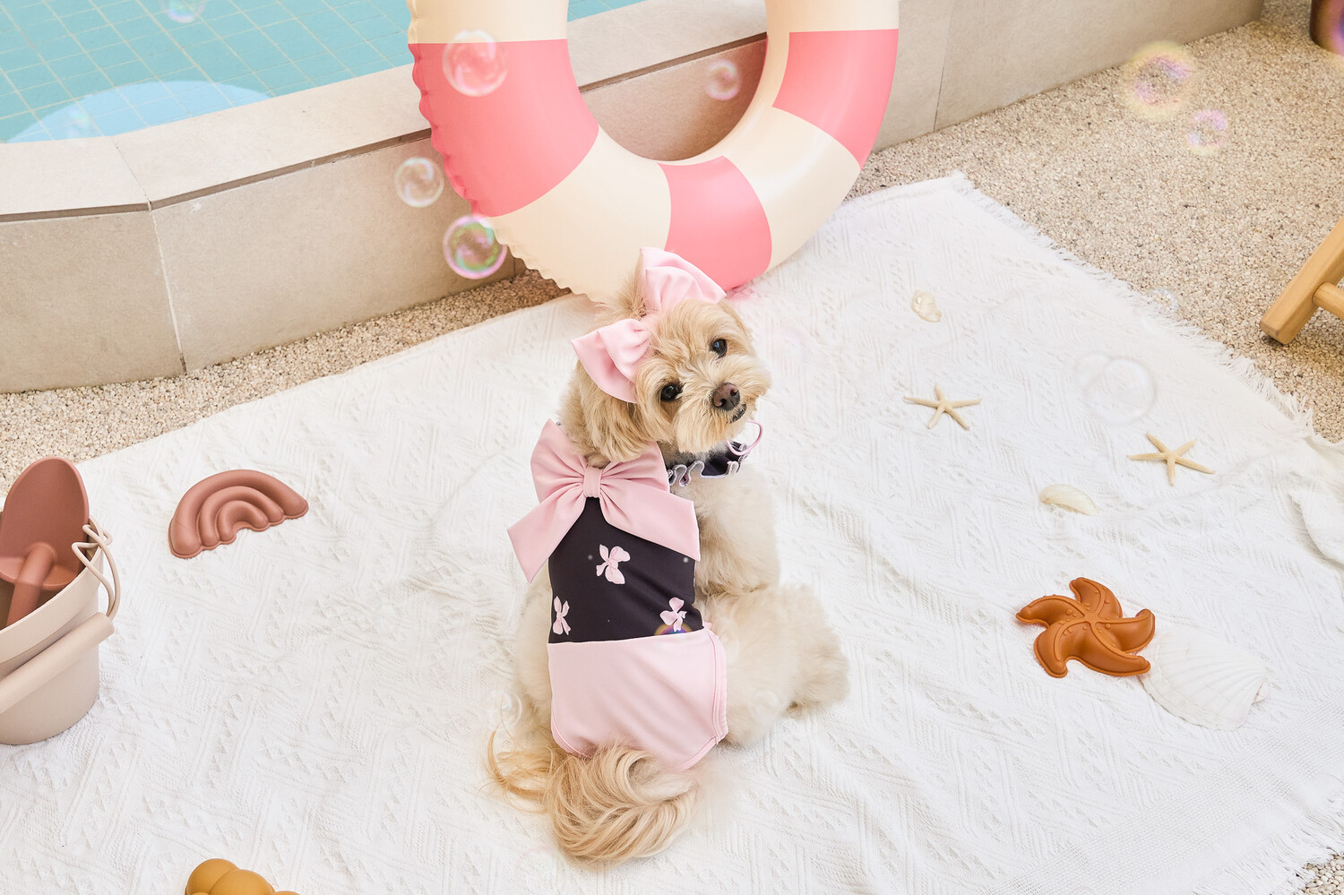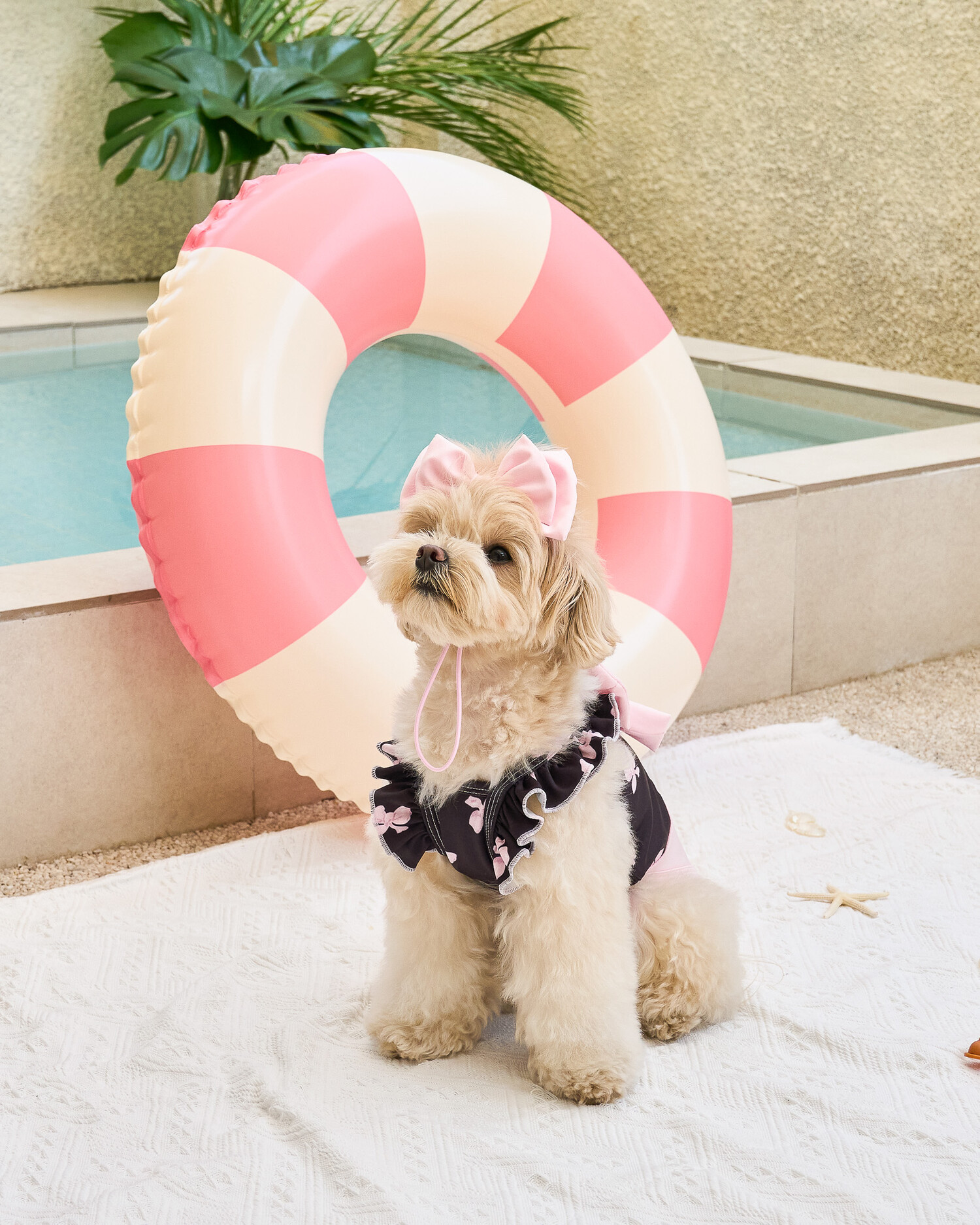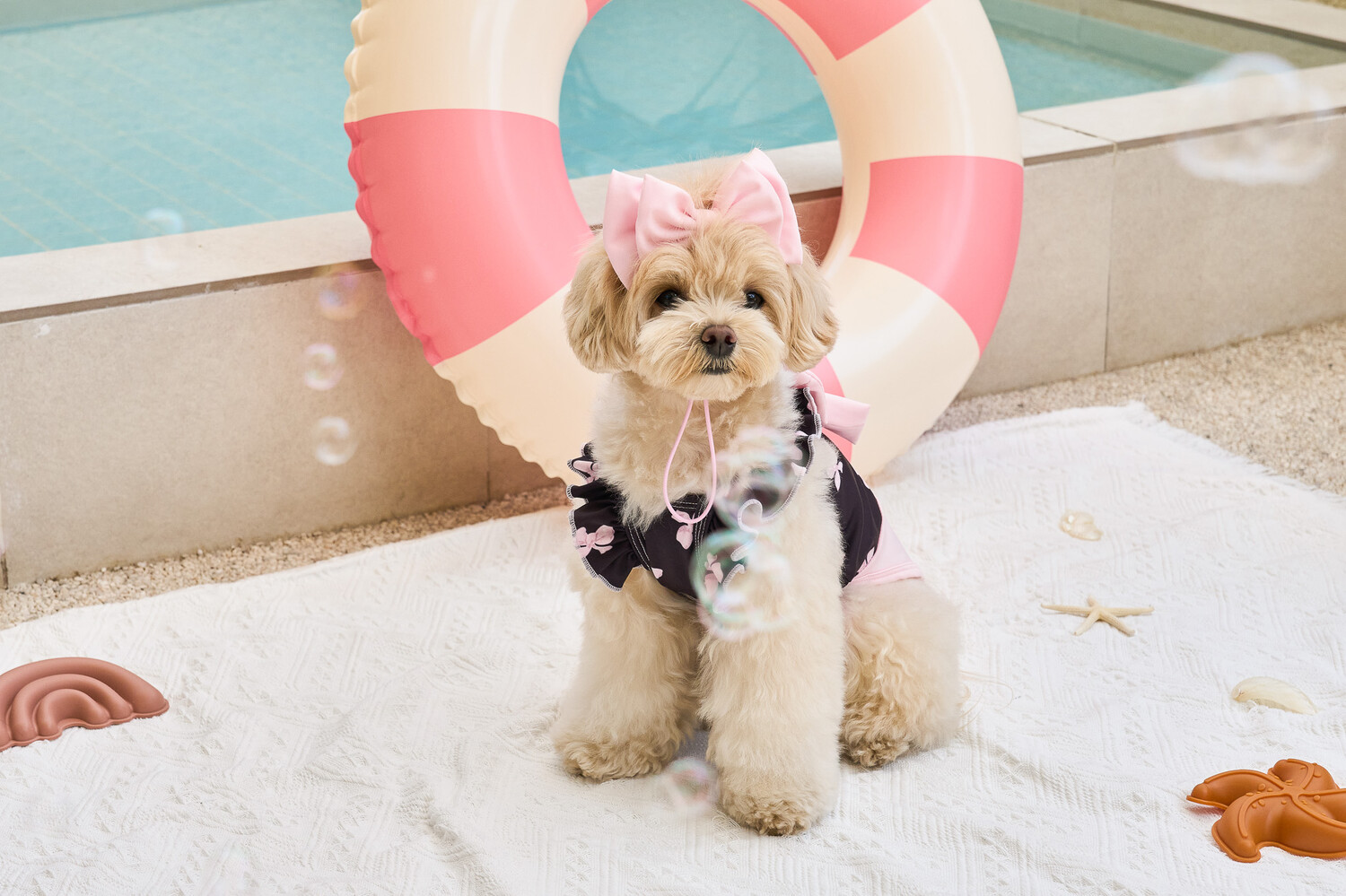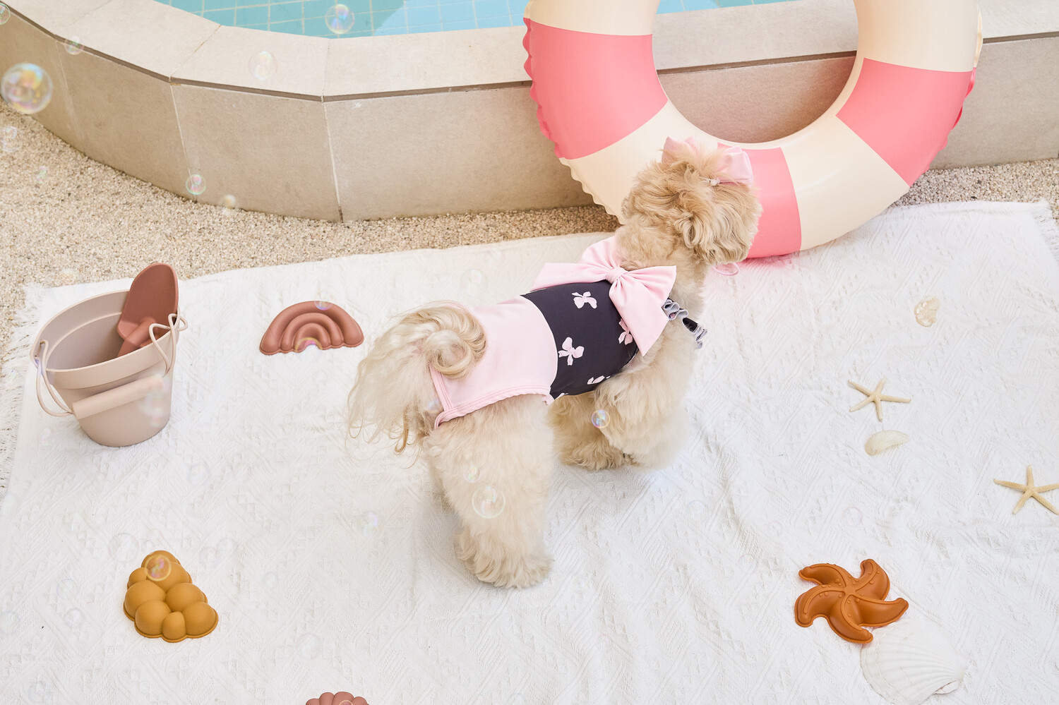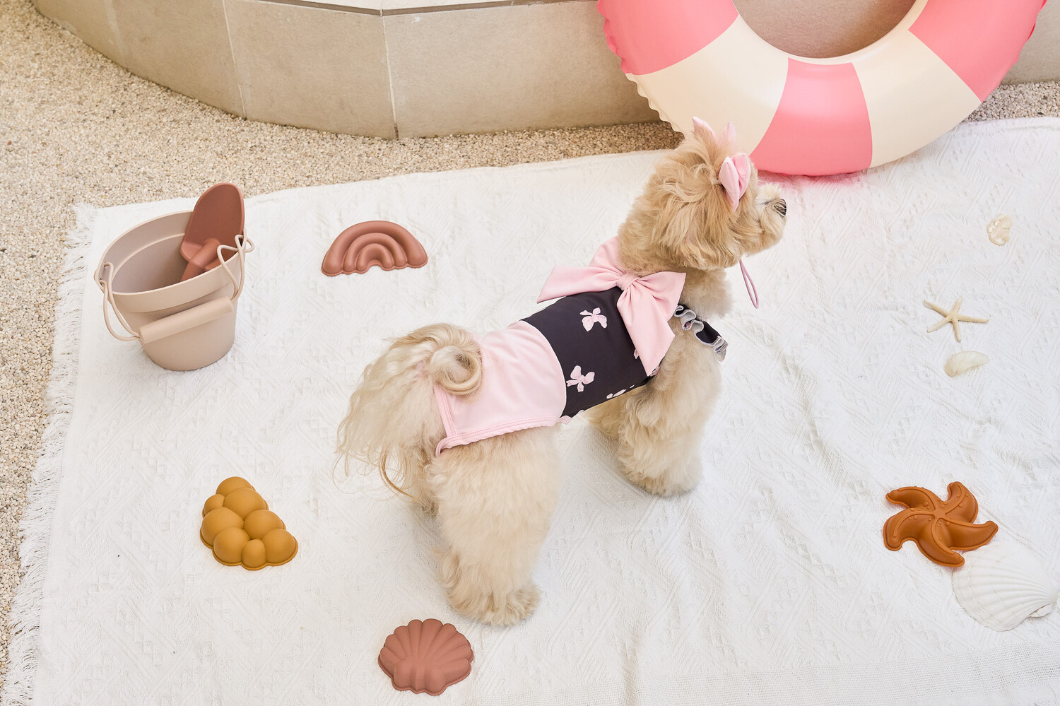 발랄하지만 현란하지 않은, 러블리한 무드의 수영복을 찾으셨다면 키키앤니니에서 첫 선보이는 ‘썸머 핑크 스윔수트’는 어떠신가요♥ 은은하면서 사랑스러운 리본 프린트와 빅 리본 디테일, 어깨&밑단에 사랑스럽게 잡힌 프릴 등 러블리한 무드를 더해주는 디테일과 핑크 컬러의 조합이 포인트인 제품입니다. 청순하고 러블리한 분위기를 자아내는 ‘화이트 핑크’ 세련되면서 힙한 분위기를 자아내는 ‘블랙 핑크’ 두 컬러로 만나보실 수 있으며, 같은 핑크지만 너무 다른 느낌이라 취향에 맞게, 아이들 모색에 맞게 입혀주시면 좋으실 것 같아요! 강아지 수영복에 다소 색다르게 느껴지실 수 있는 ‘블랙’ 컬러와 자칫 호불호가 갈릴 수 있는 ‘핑크’컬러를 전체 포인트 컬러로 사용하는 등 과감한 색감 사용 면에서 키앤니만의 특별함을 느끼실 거에요. 원피스&모노키니 2타입으로 제작되어, 남매룩 또는 친구들과 개플룩으로 맞춰 입히시기 좋으며, 보다 심플하고 군더더기 없는 디테일을 원하신다면 ‘모노키니’ 타입을 추천드립니다. 함께 코디할 수 있는 리본 헤어밴드&스윔 햇도 준비했습니다. 다양한 아이템과 함께 한다면 러블리함이 극대화되겠죠?