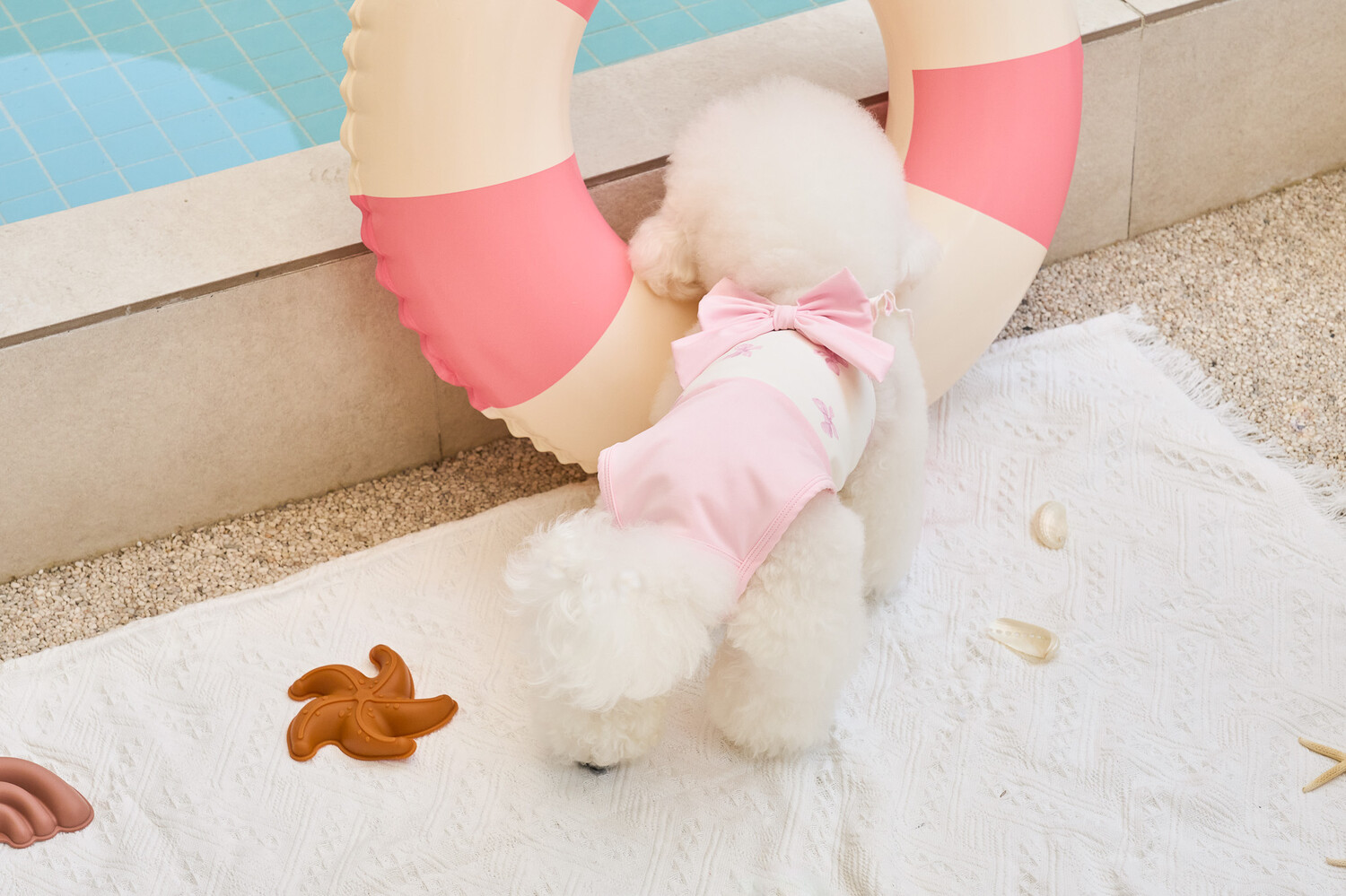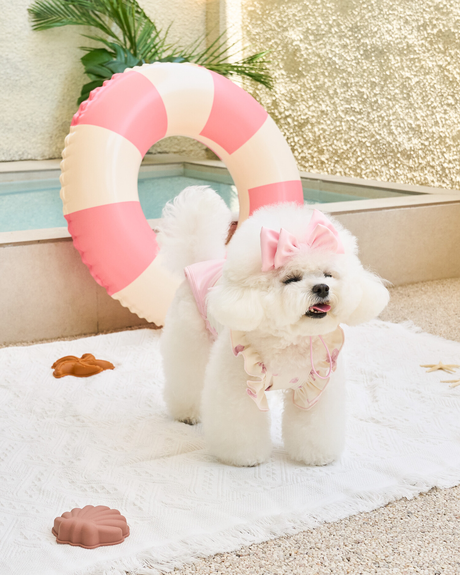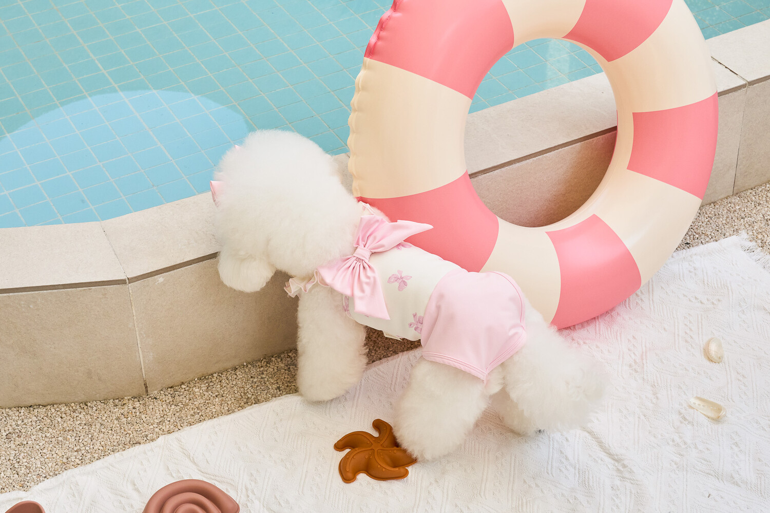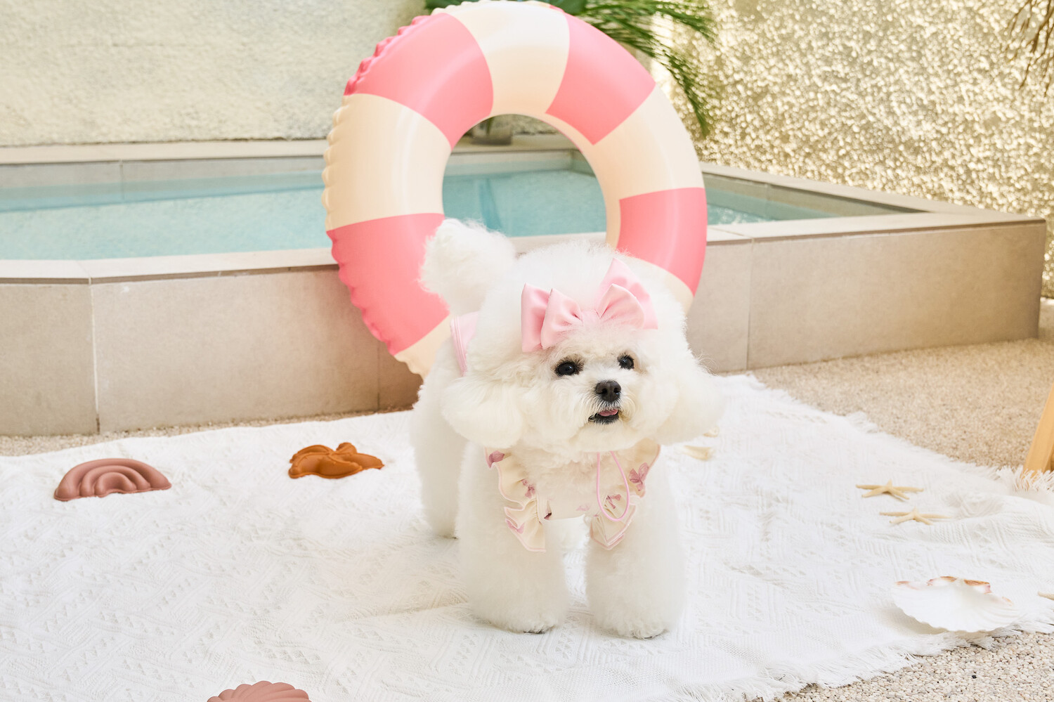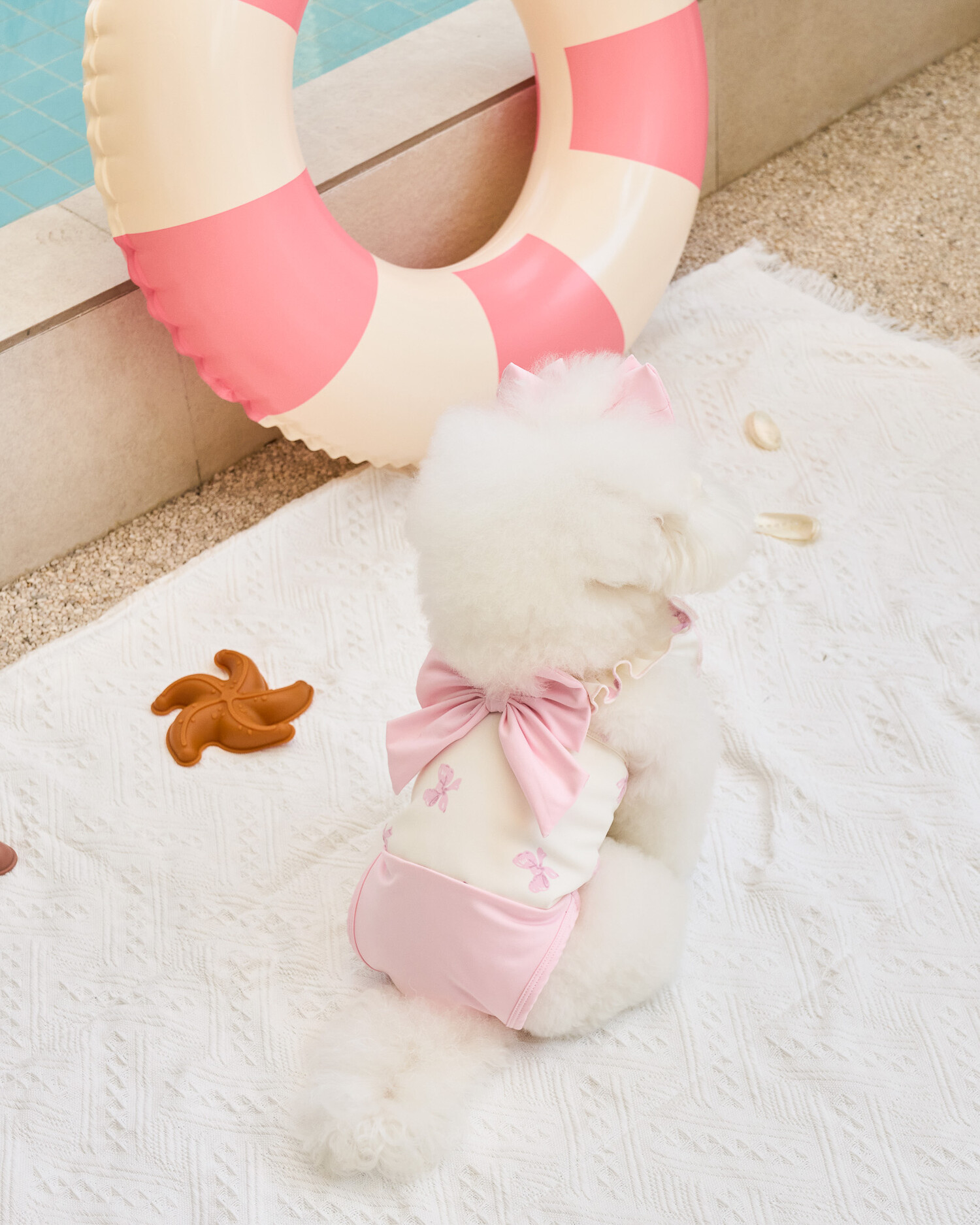 발랄하지만 현란하지 않은, 러블리한 무드의 수영복을 찾으셨다면 키키앤니니에서 첫 선보이는 ‘썸머 핑크 스윔수트’는 어떠신가요♥ 은은하면서 사랑스러운 리본 프린트와 빅 리본 디테일, 어깨&밑단에 사랑스럽게 잡힌 프릴 등 러블리한 무드를 더해주는 디테일과 핑크 컬러의 조합이 포인트인 제품입니다. 청순하고 러블리한 분위기를 자아내는 ‘화이트 핑크’ 세련되면서 힙한 분위기를 자아내는 ‘블랙 핑크’ 두 컬러로 만나보실 수 있으며, 같은 핑크지만 너무 다른 느낌이라 취향에 맞게, 아이들 모색에 맞게 입혀주시면 좋으실 것 같아요! 강아지 수영복에 다소 색다르게 느껴지실 수 있는 ‘블랙’ 컬러와 자칫 호불호가 갈릴 수 있는 ‘핑크’컬러를 전체 포인트 컬러로 사용하는 등 과감한 색감 사용 면에서 키앤니만의 특별함을 느끼실 거에요. 원피스&모노키니 2타입으로 제작되어, 남매룩 또는 친구들과 개플룩으로 맞춰 입히시기 좋으며, 보다 심플하고 군더더기 없는 디테일을 원하신다면 ‘모노키니’ 타입을 추천드립니다. 함께 코디할 수 있는 리본 헤어밴드&스윔 햇도 준비했습니다. 다양한 아이템과 함께 한다면 러블리함이 극대화되겠죠?