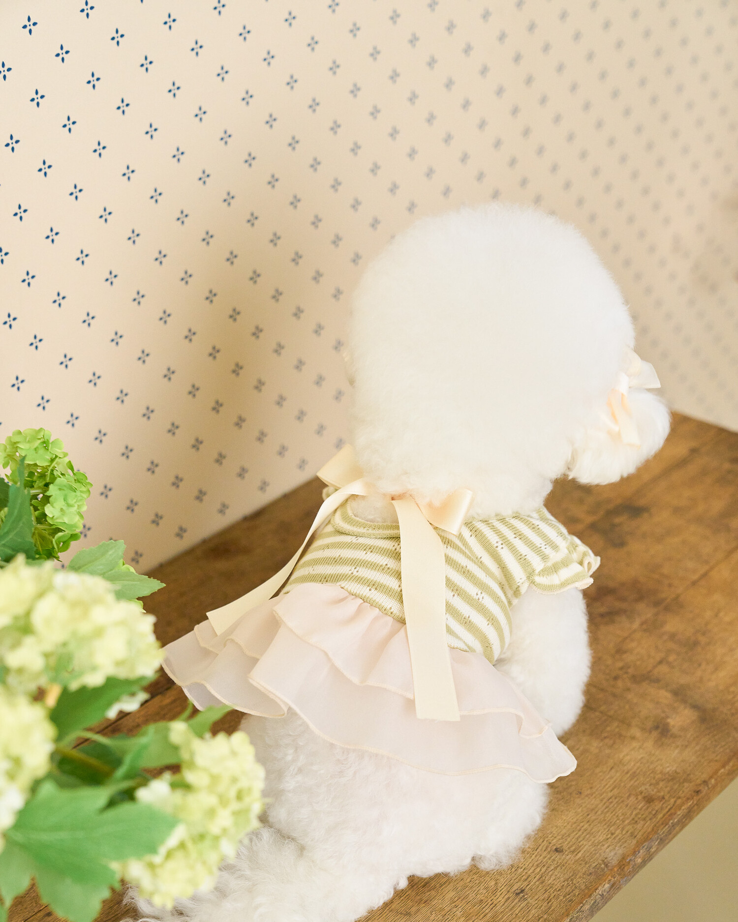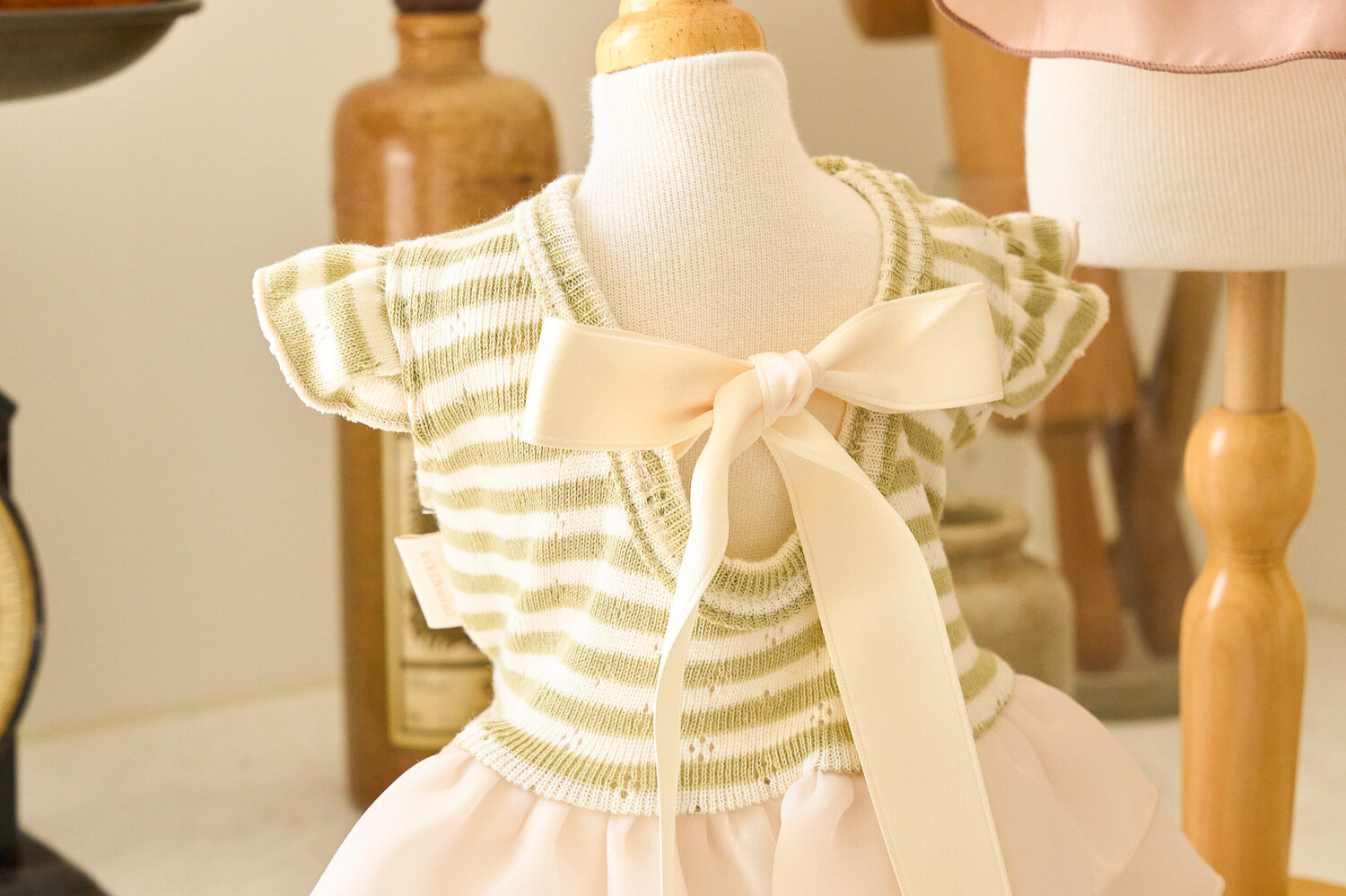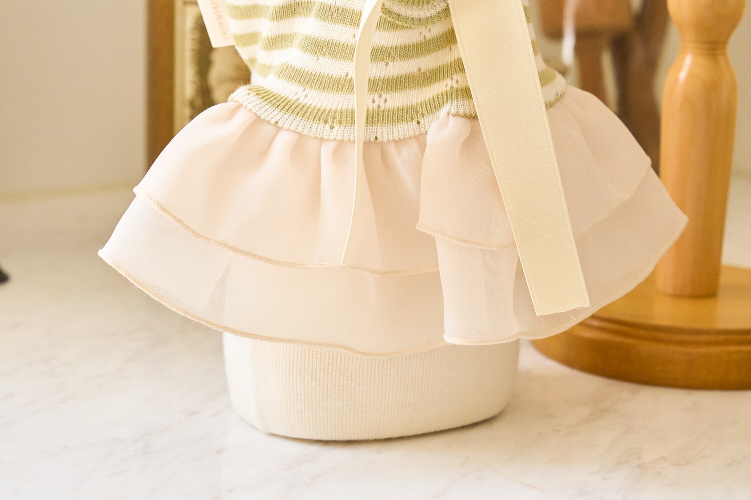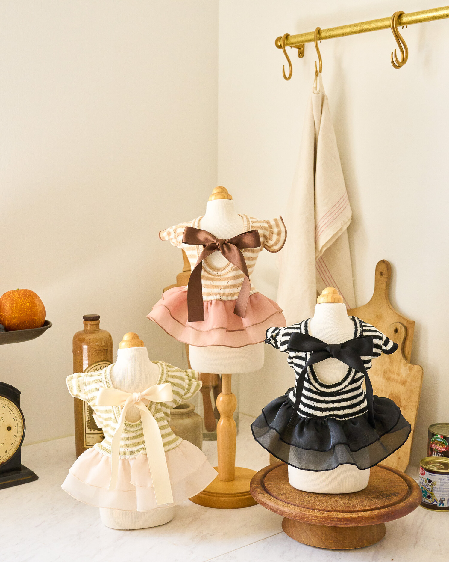 아일렛 원단의 빈티지하고 여리여리한 무드와, 오간자 튜튜 스커트,리본 포인트로 사랑스러운 무드를 가득 담았습니다.