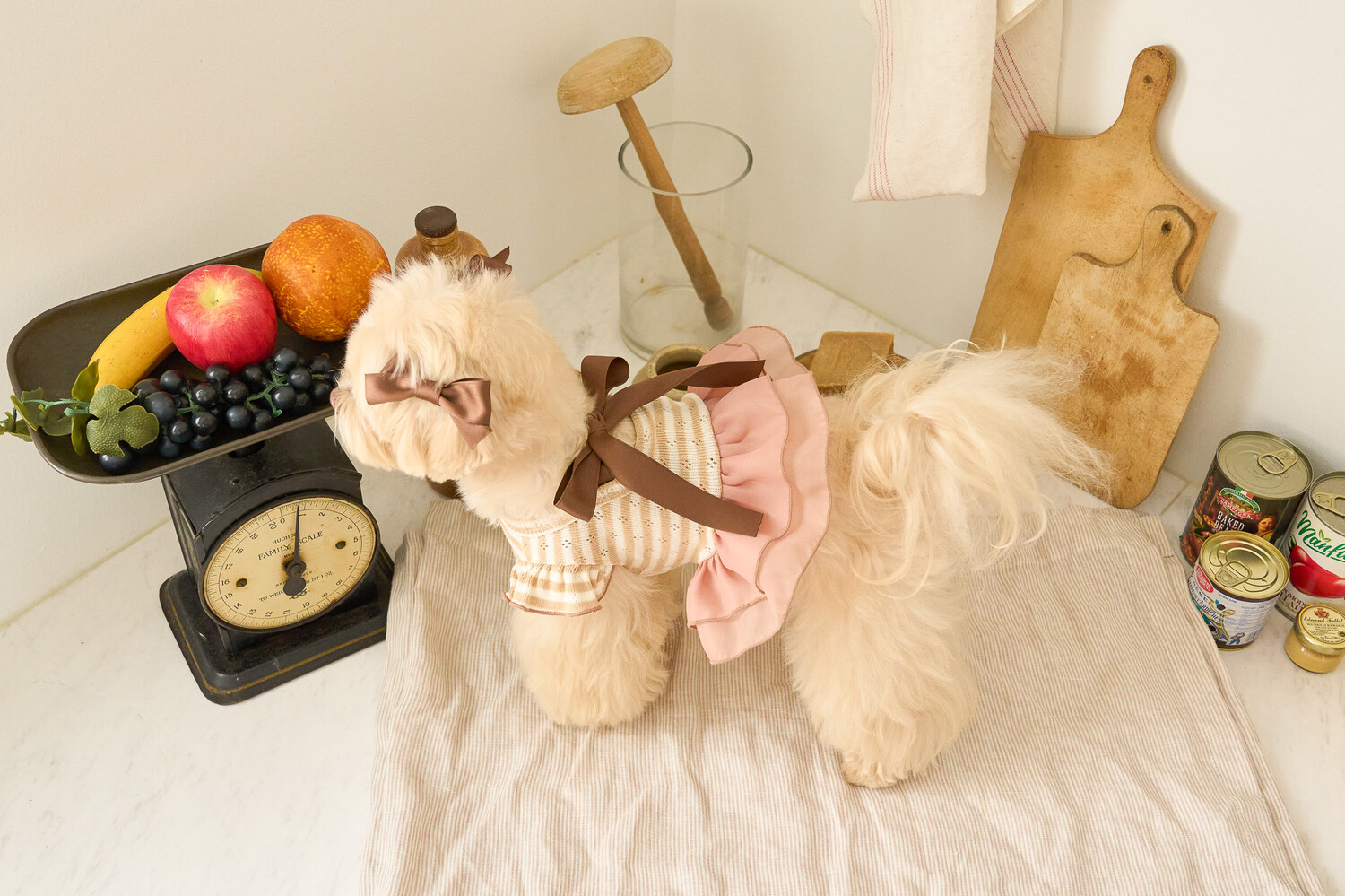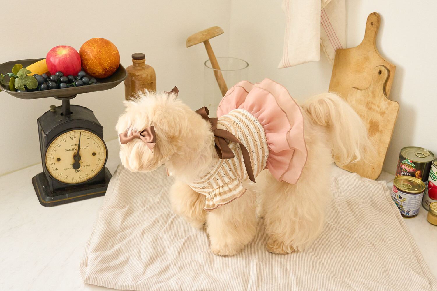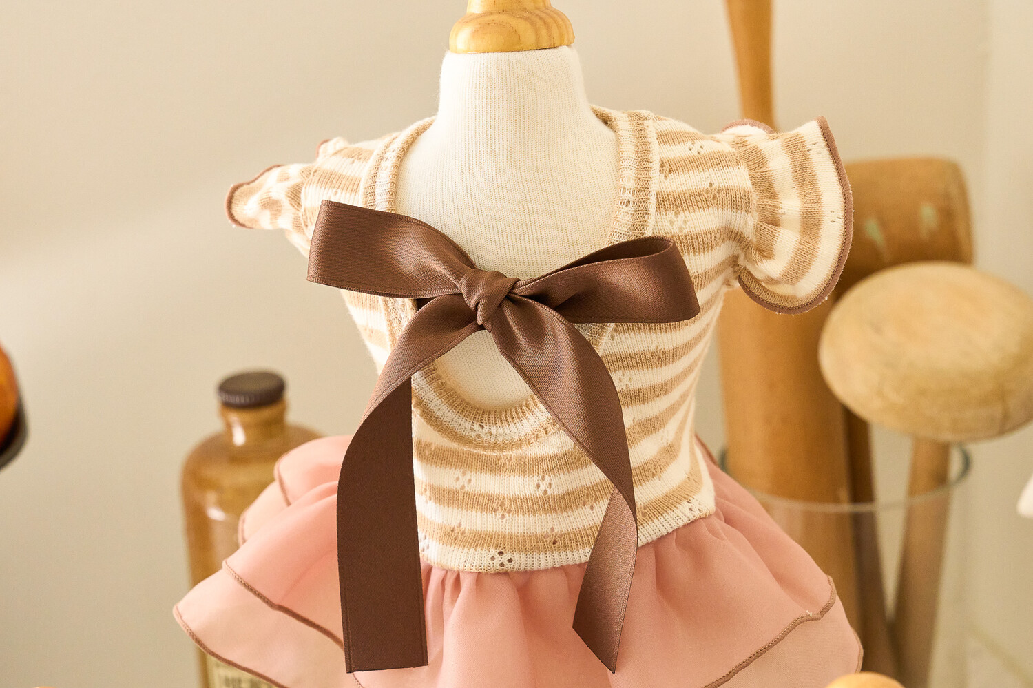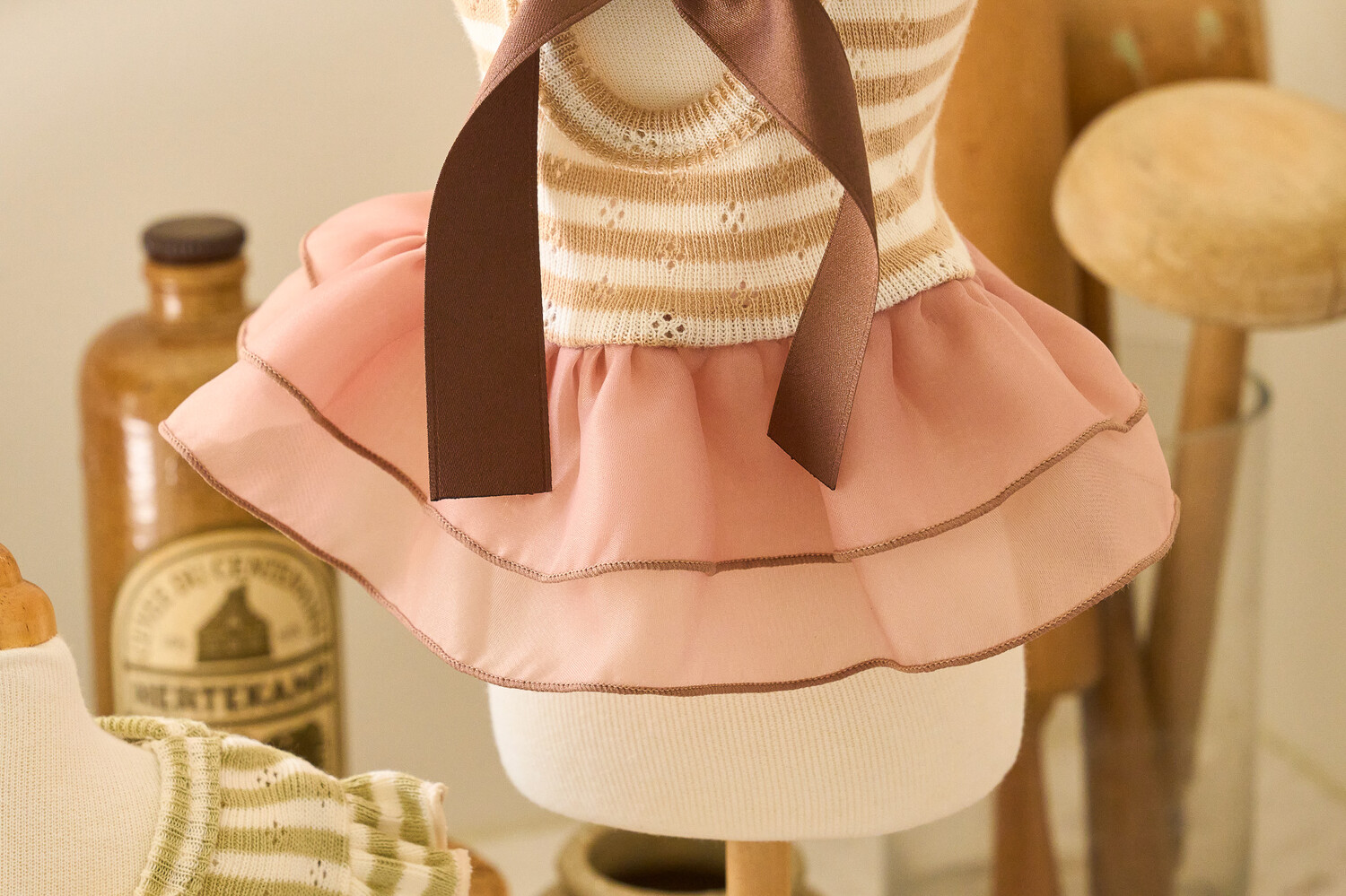 아일렛 원단의 빈티지하고 여리여리한 무드와, 오간자 튜튜 스커트,리본 포인트로 사랑스러운 무드를 가득 담았습니다.