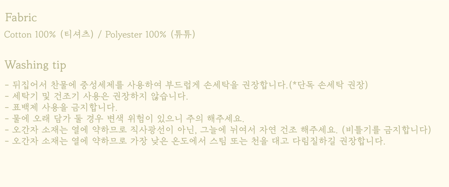 [세탁 방법] 오간자 원단의 특성상, 세탁기&건조기 사용을 절대 권장하지 않습니다. 찬물에 중성세제를 사용하여 부드럽게 조물조물 손세탁 하신 다음, 그늘에서 자연건조 해주세요♥(비틀기NO) 또한, 가장 낮은 온도에서 스팀 또는 천을 대고 다림질하길 권장합니다. (아래의 세탁 방법을 꼭 참고해 주세요)