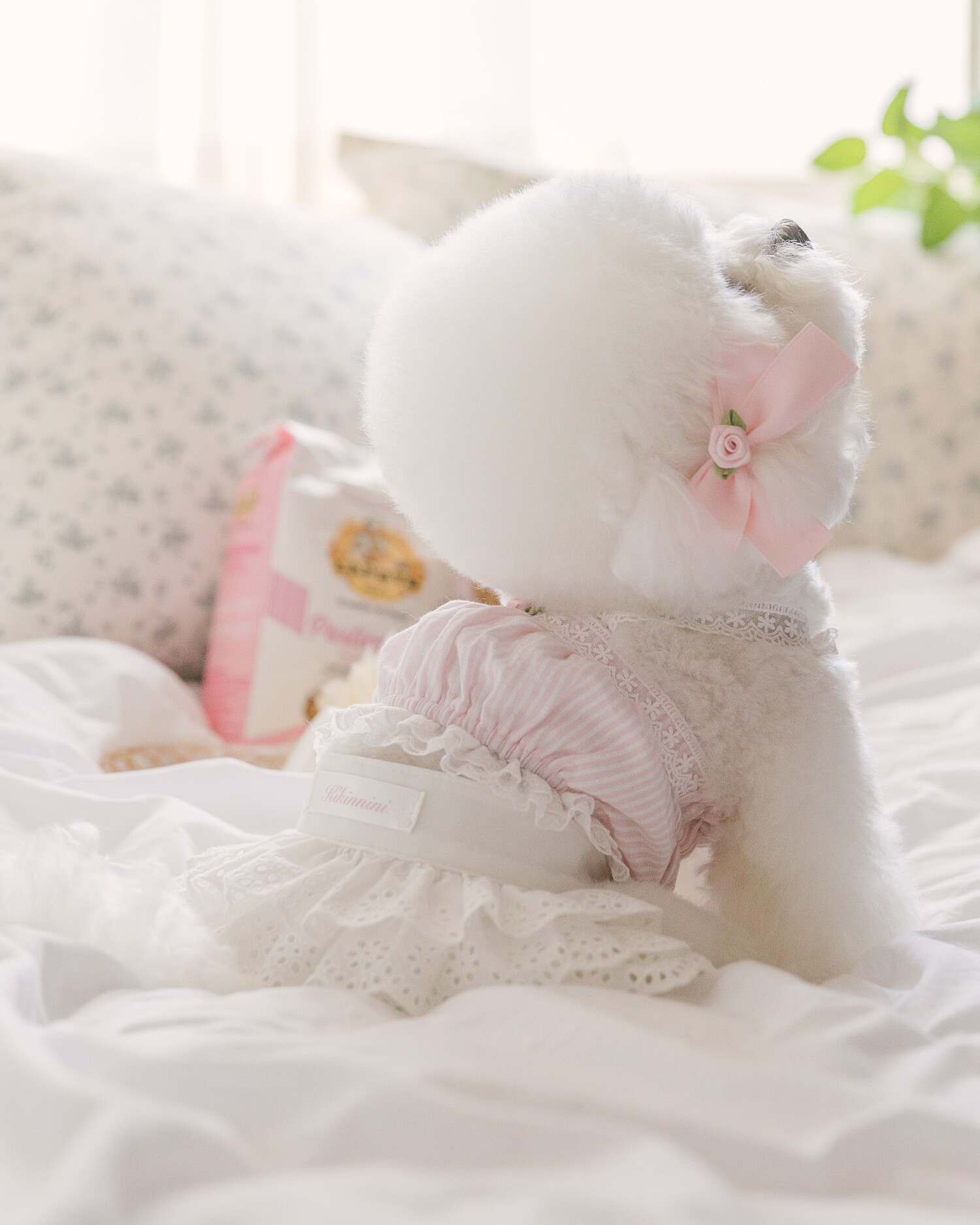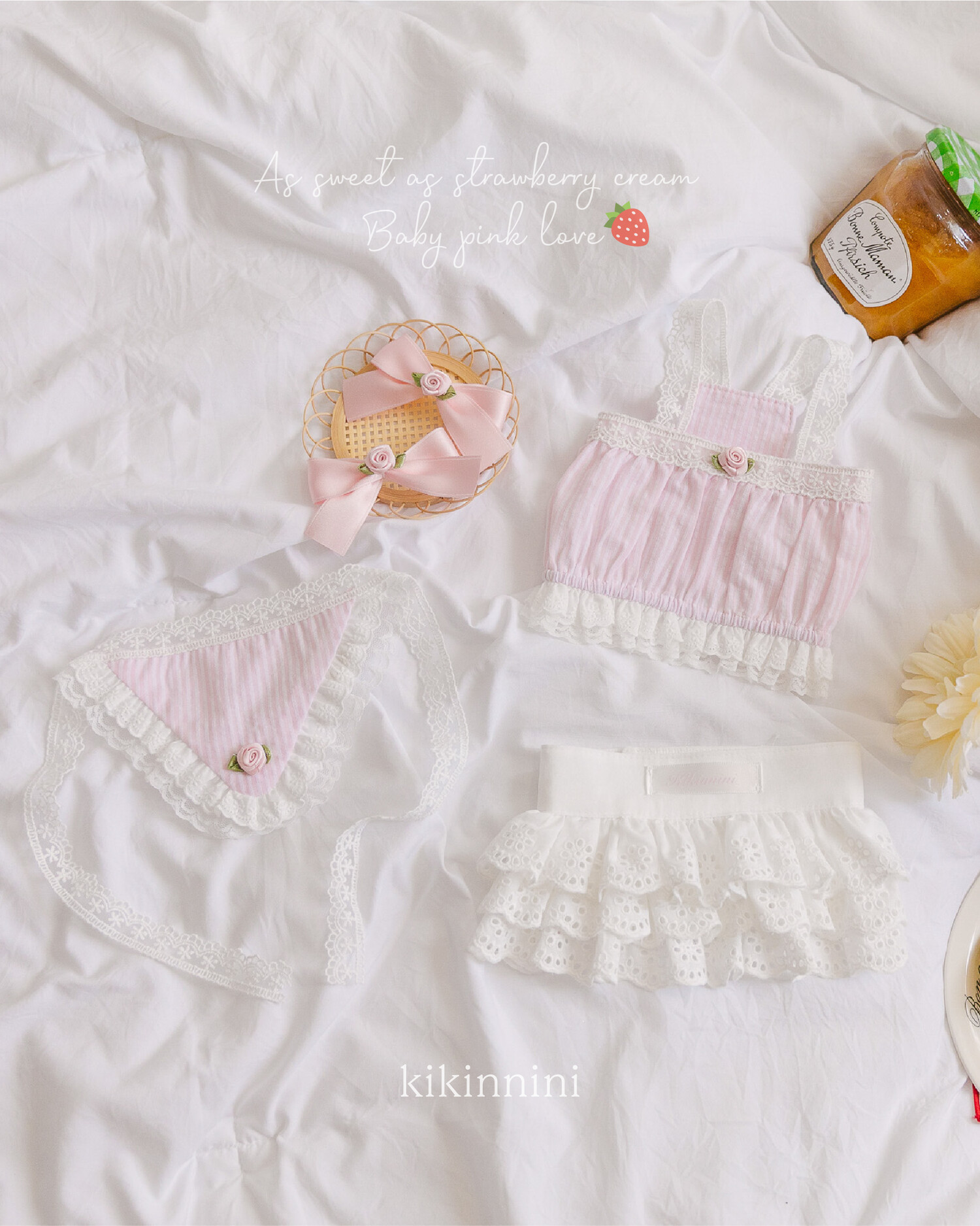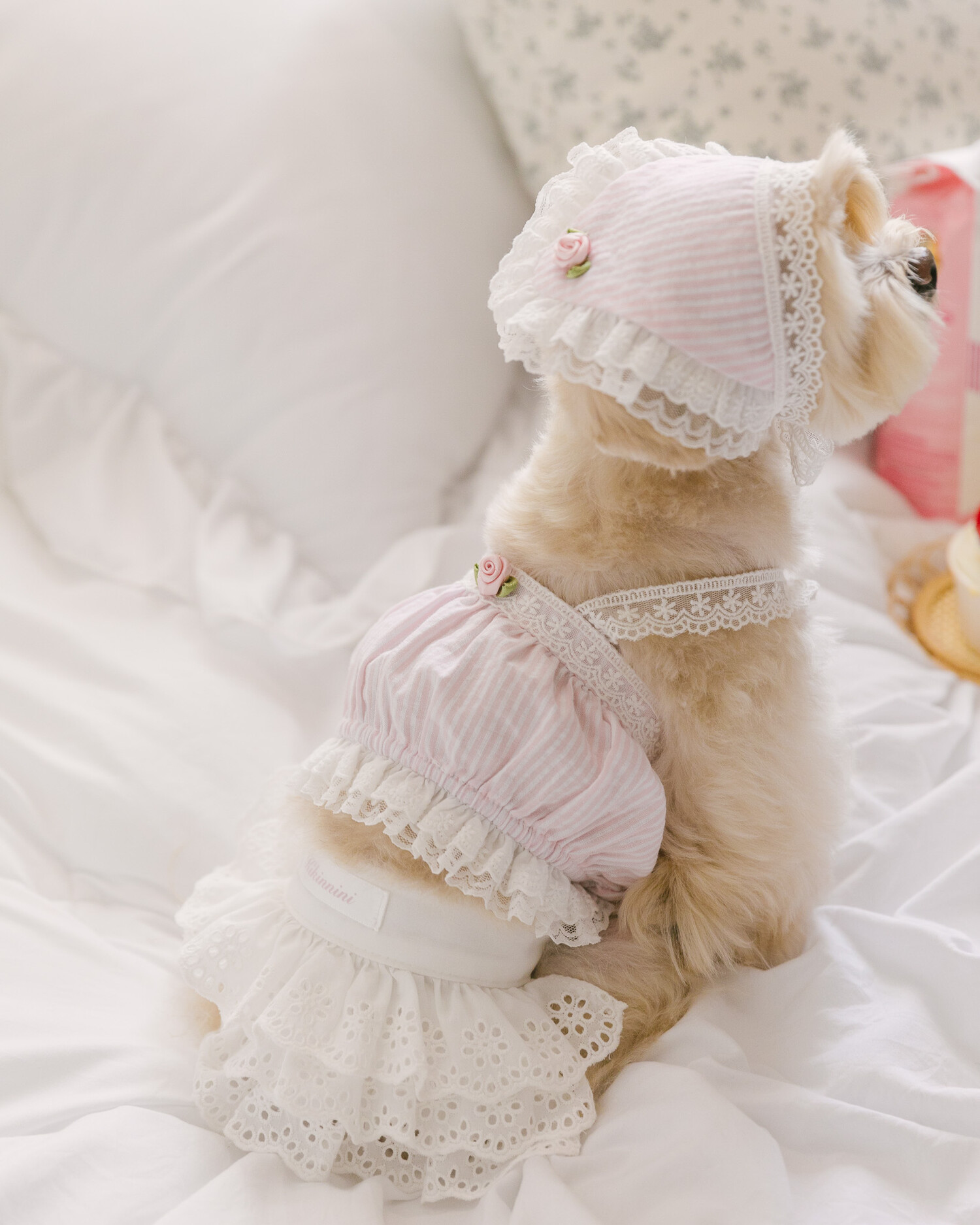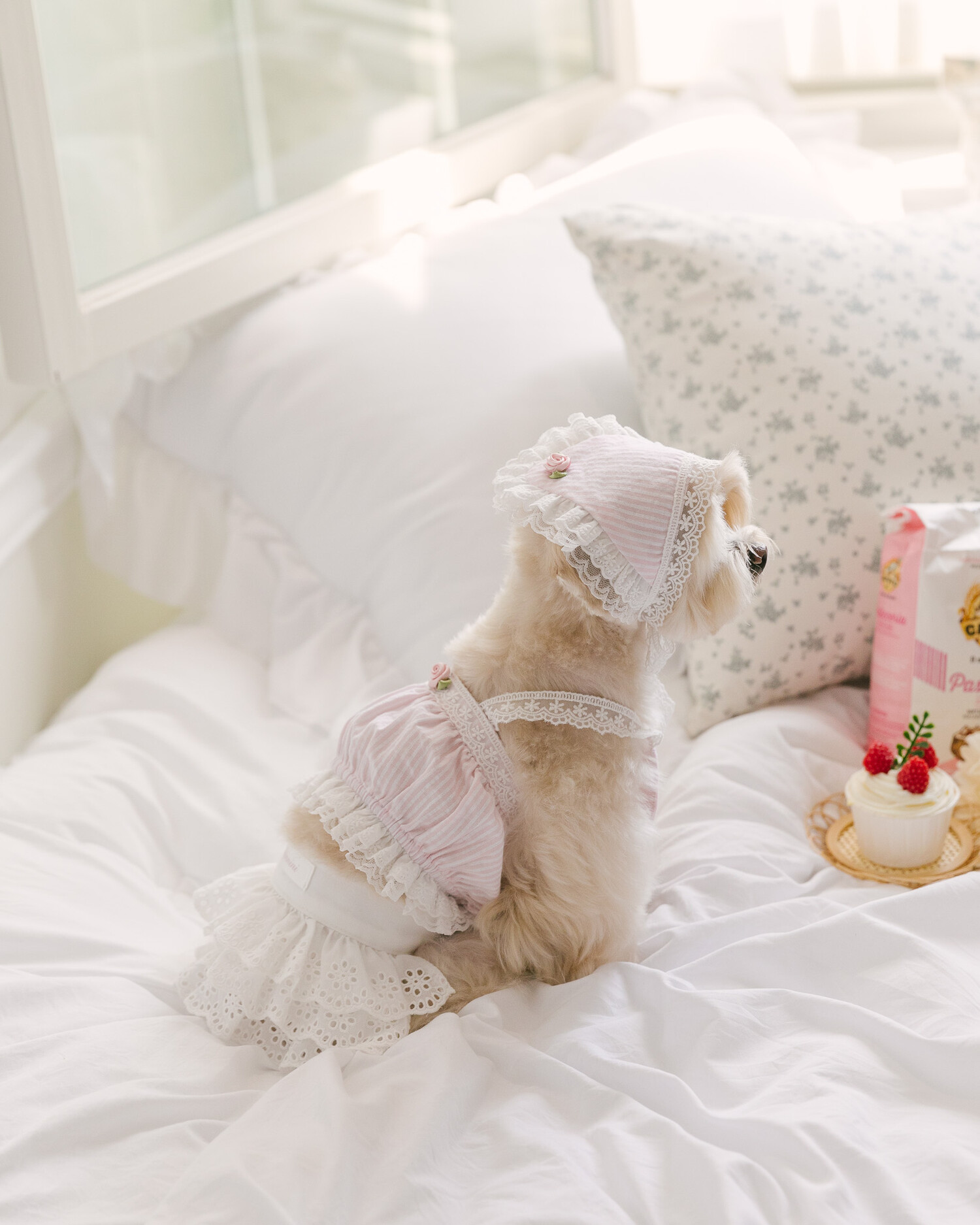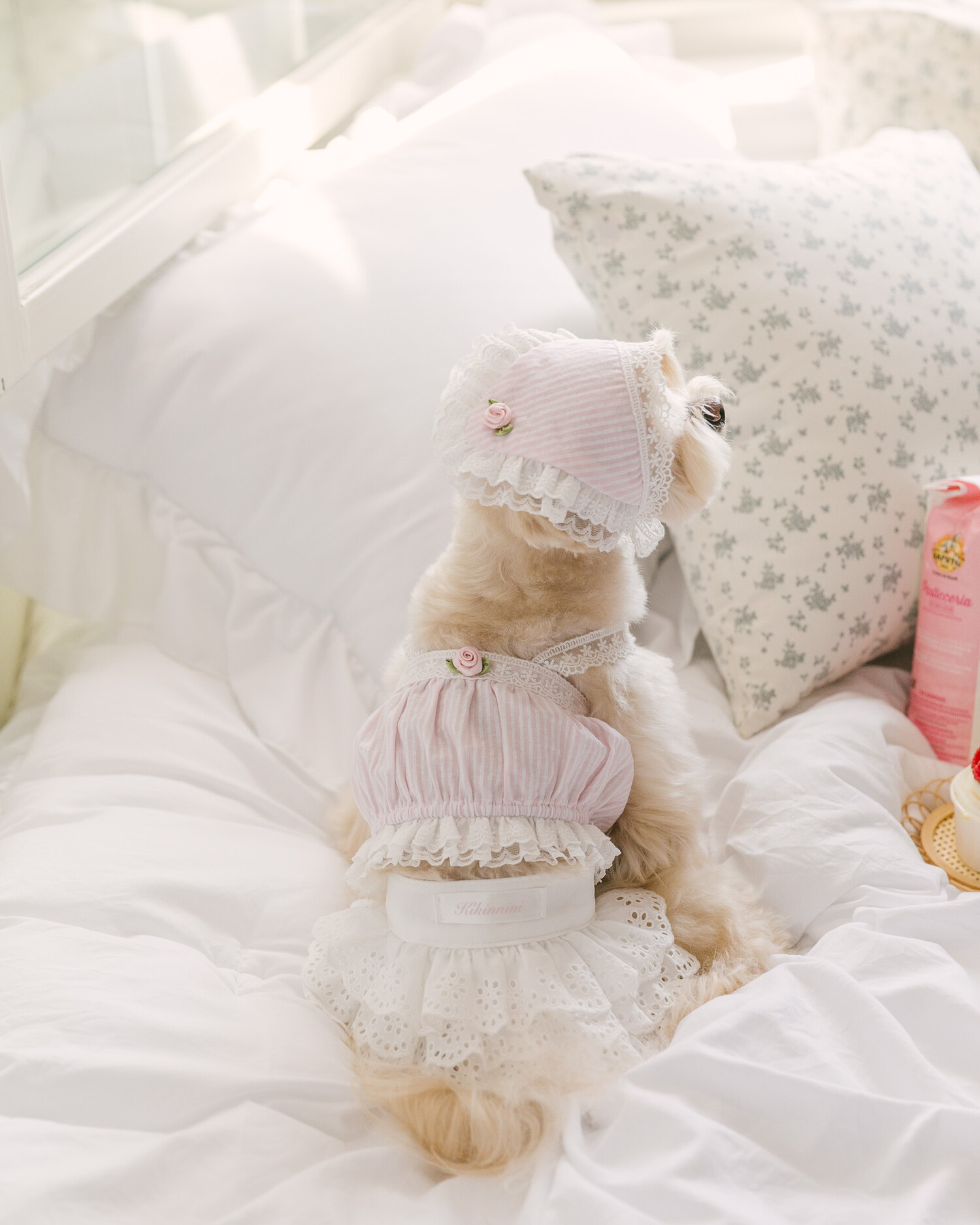 소녀스러운 무드를 가득 담은 스트라이프 패턴 위에 레이스와 작은 로즈 장식을 더해 사랑스러움이 톡톡 터지는 샤베트 무드를 담았어요.