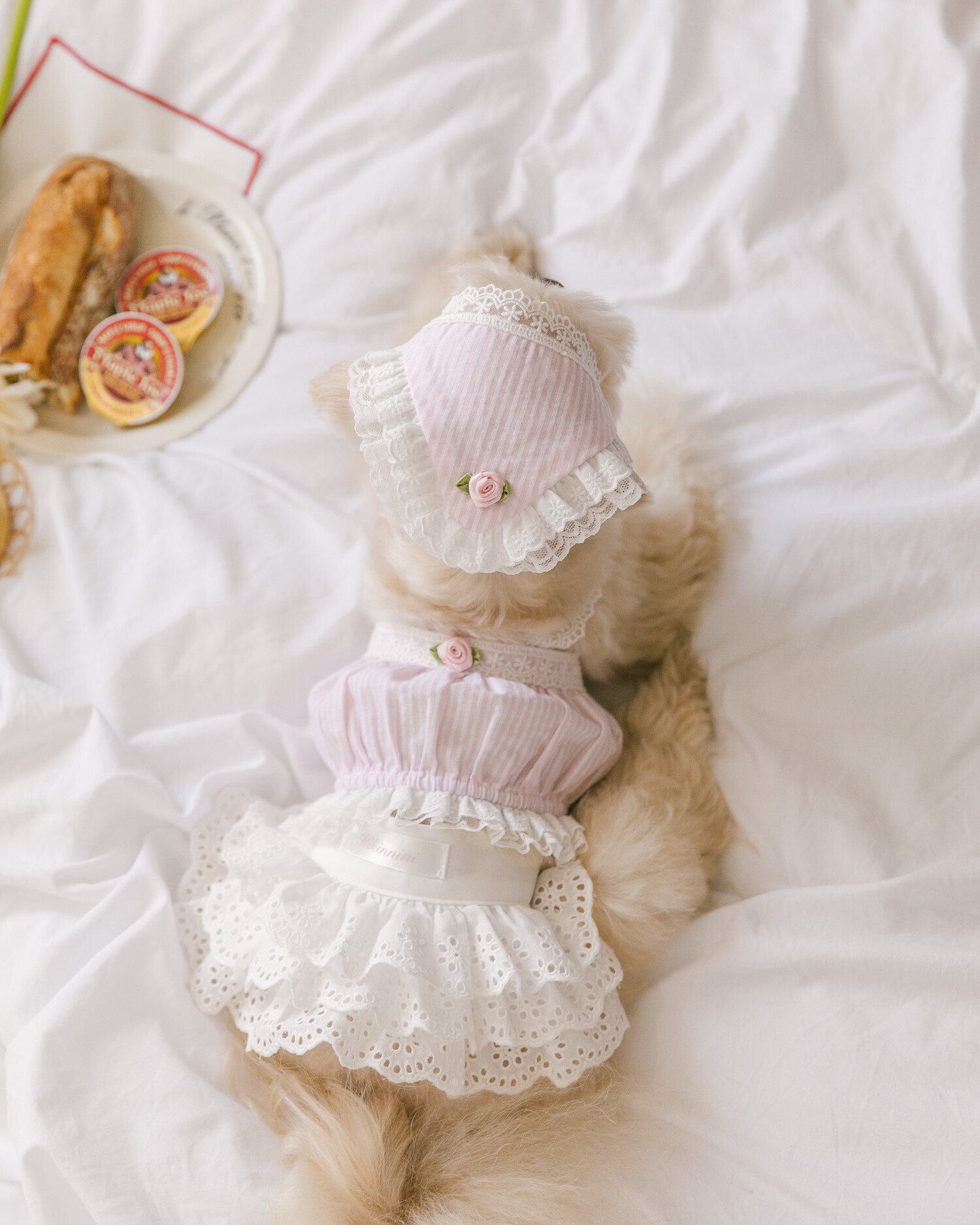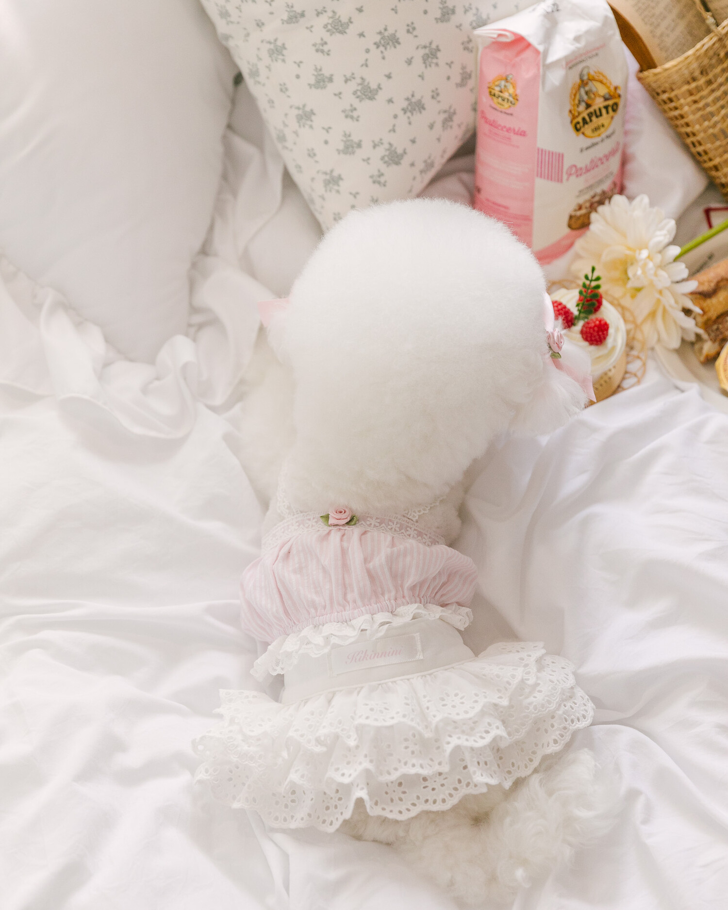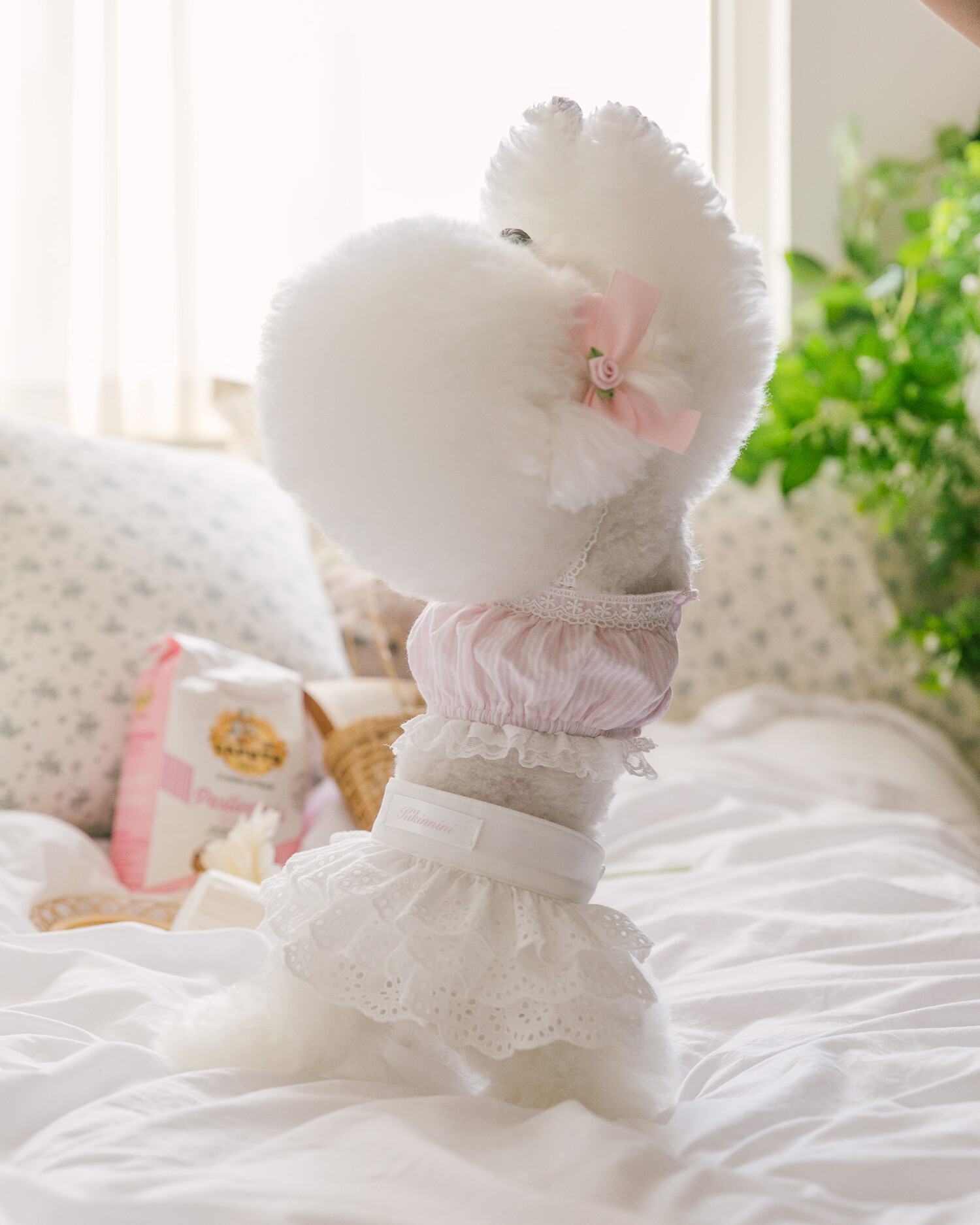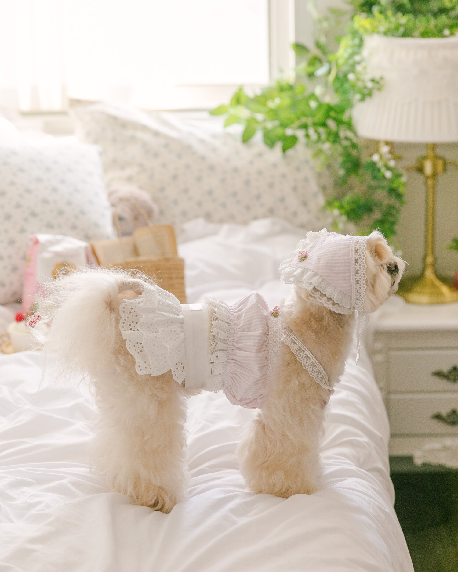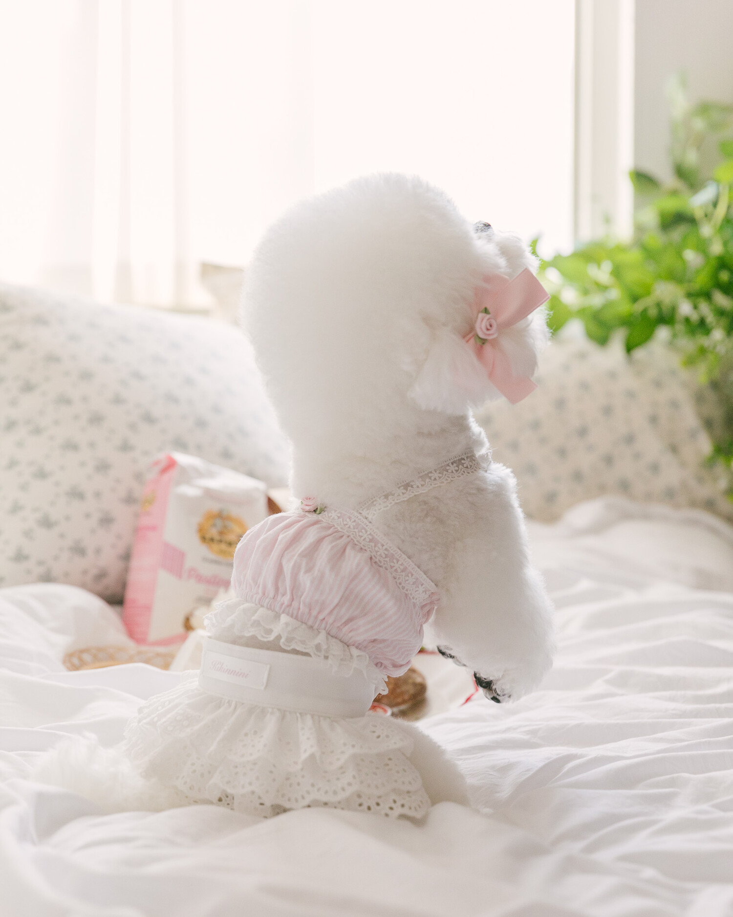 소녀스러운 무드를 가득 담은 스트라이프 패턴 위에 레이스와 작은 로즈 장식을 더해 사랑스러움이 톡톡 터지는 샤베트 무드를 담았어요.