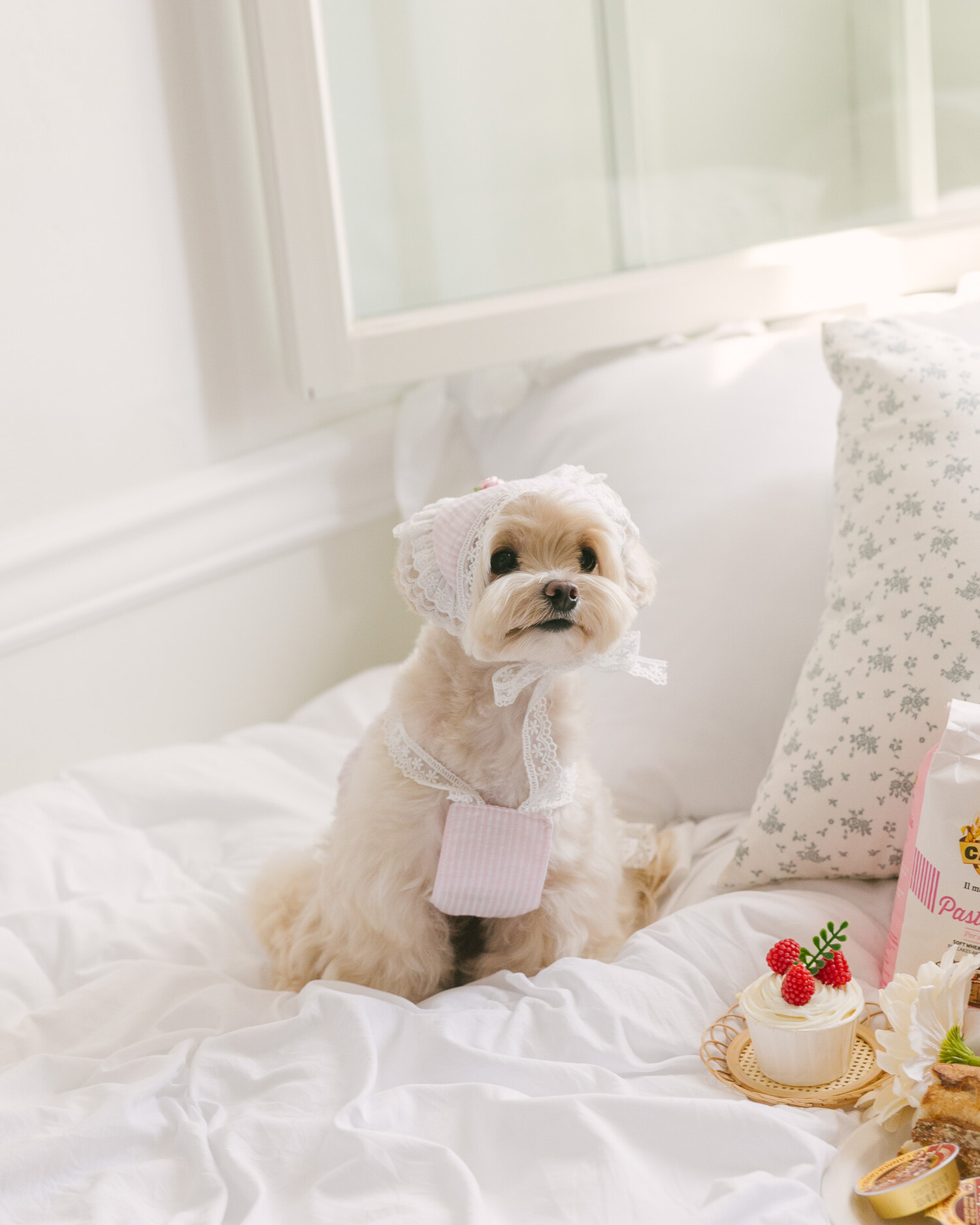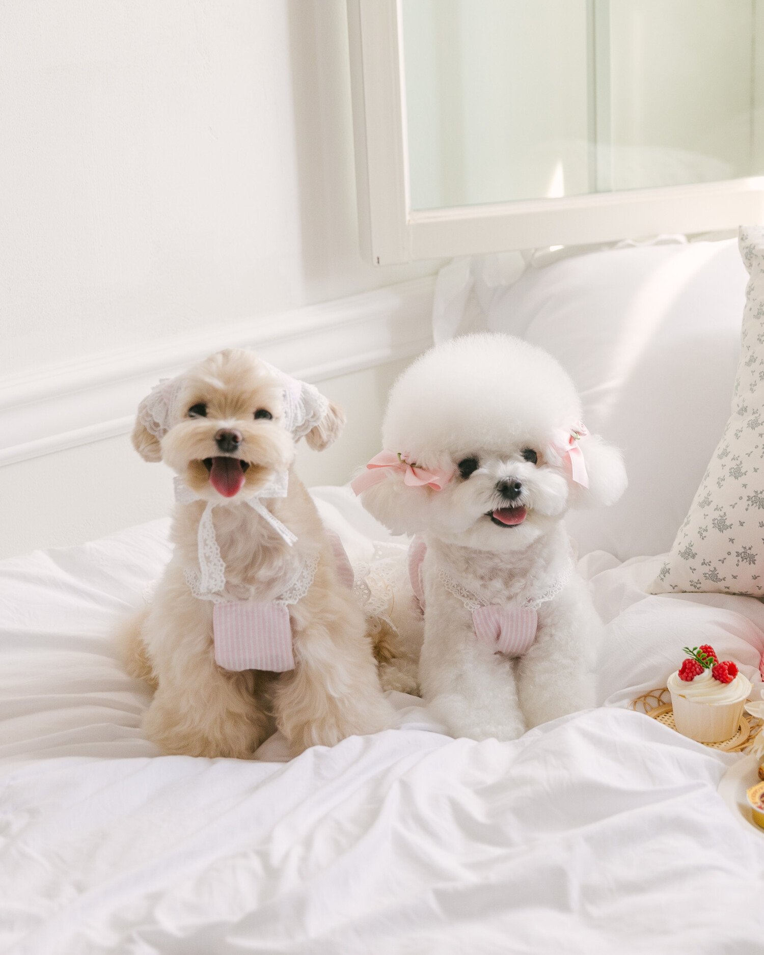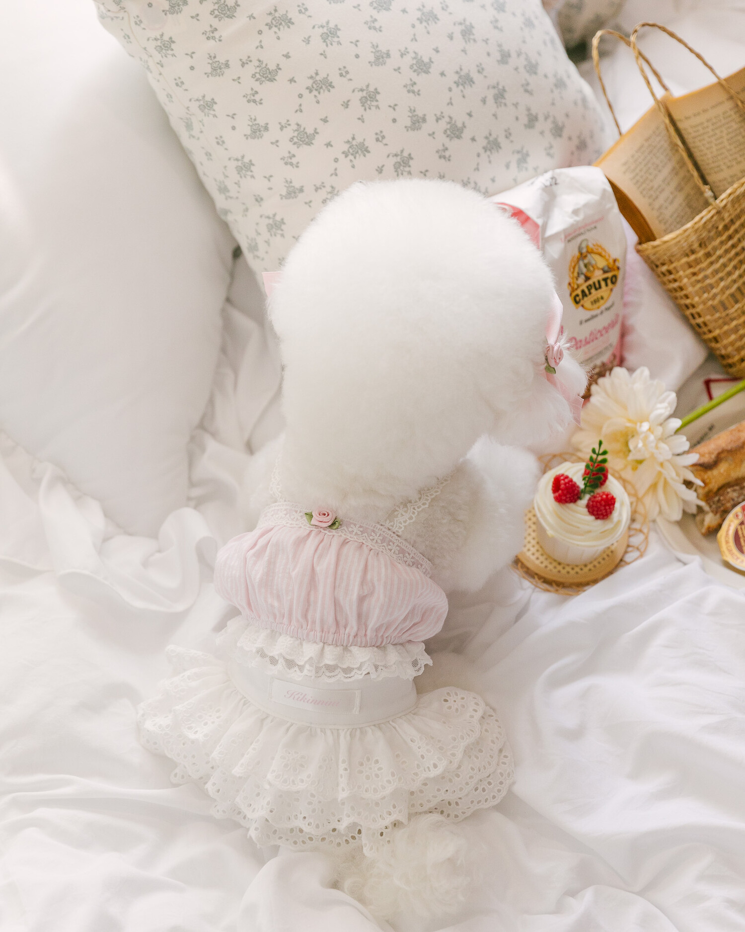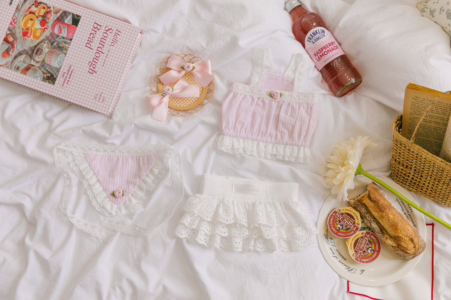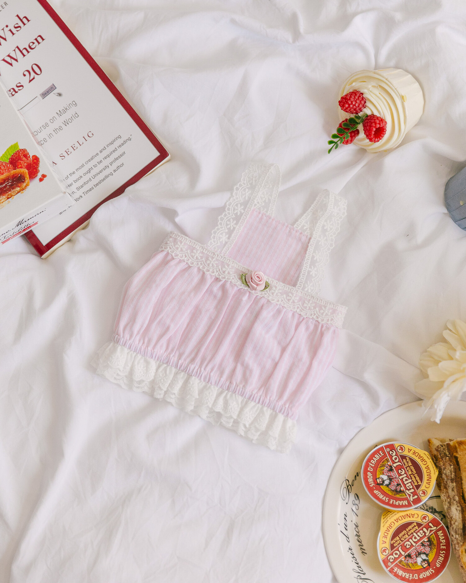 소녀스러운 무드를 가득 담은 스트라이프 패턴 위에 레이스와 작은 로즈 장식을 더해 사랑스러움이 톡톡 터지는 샤베트 무드를 담았어요.