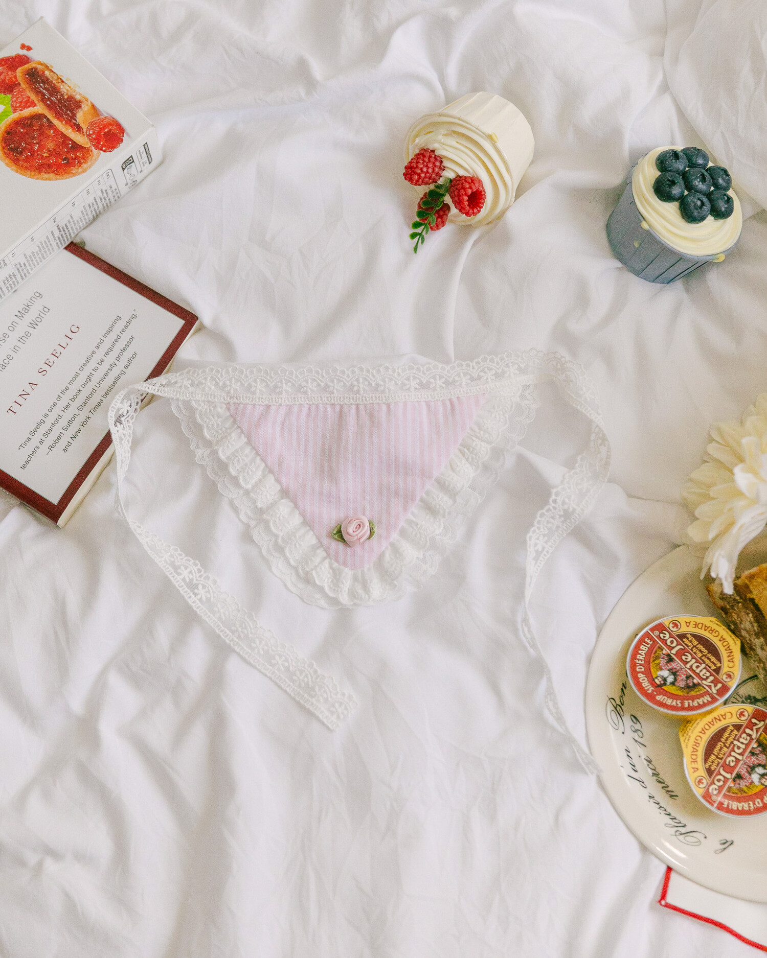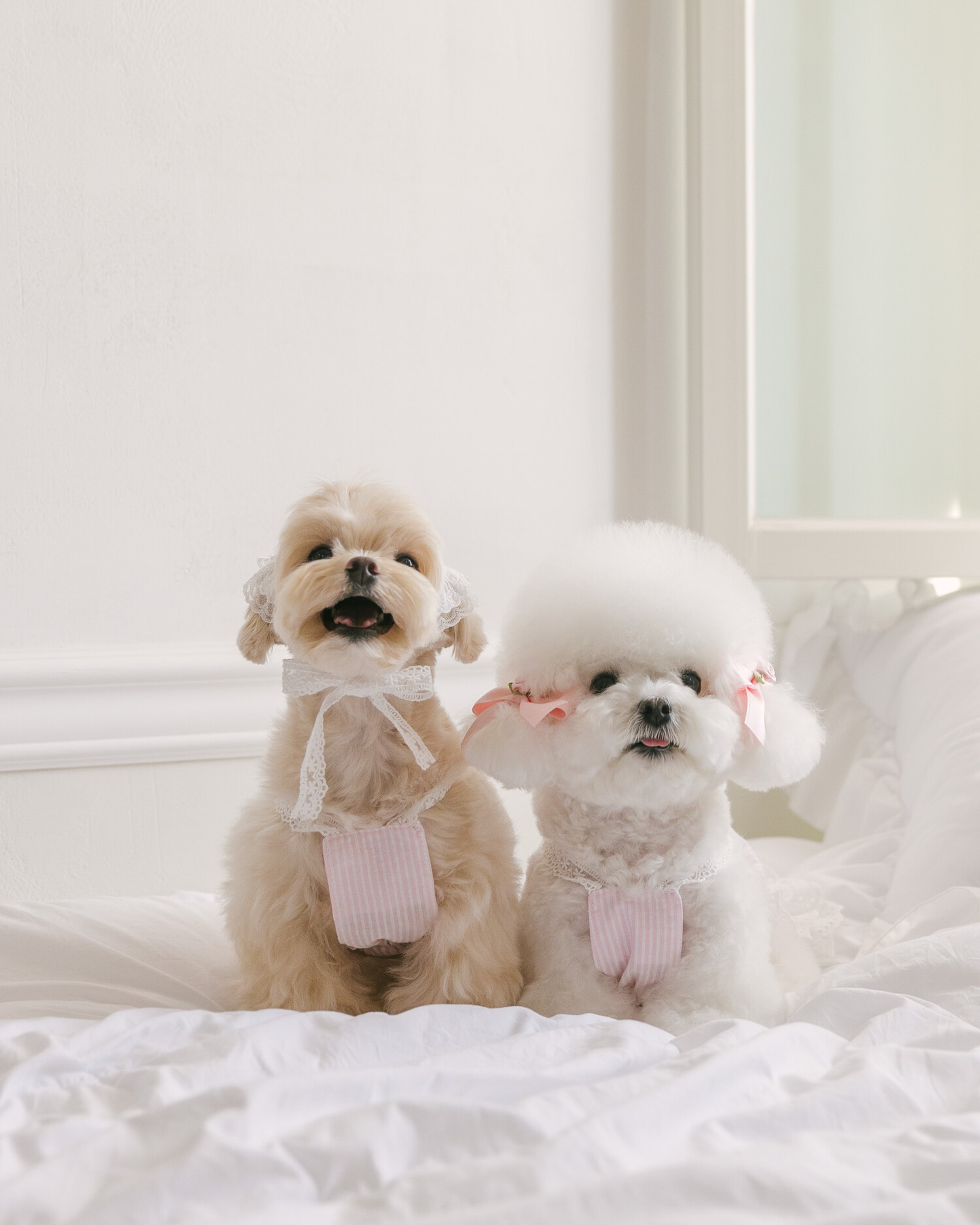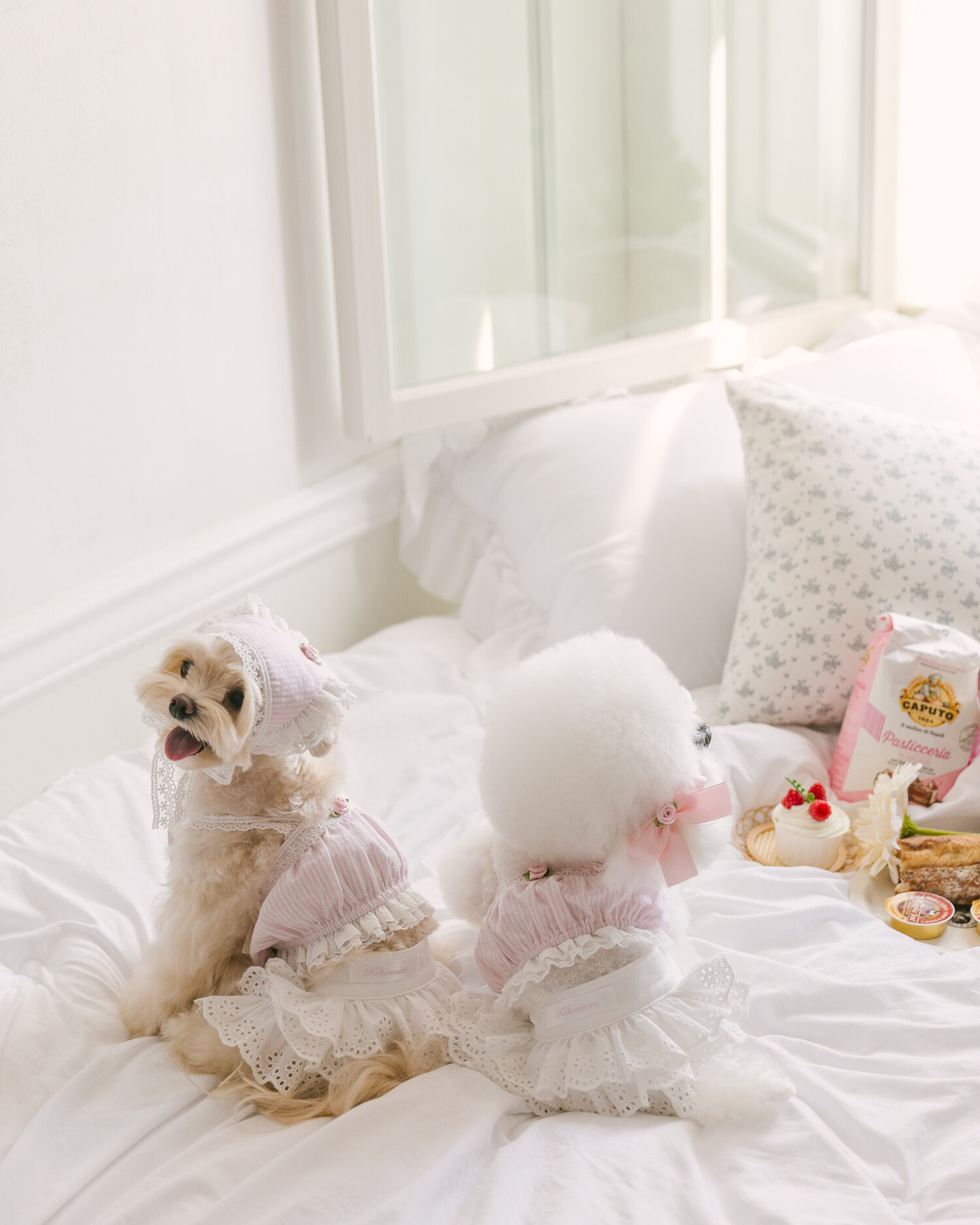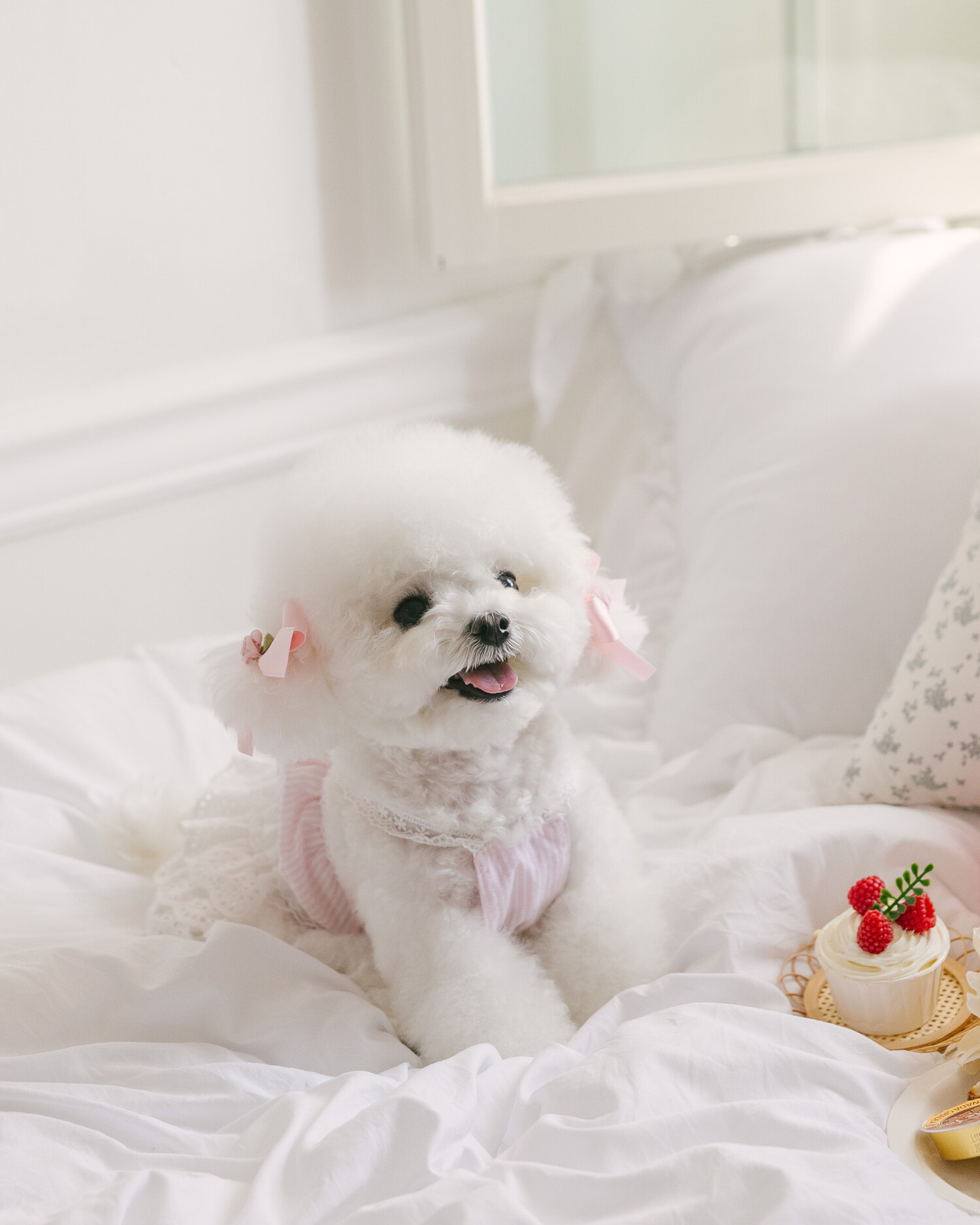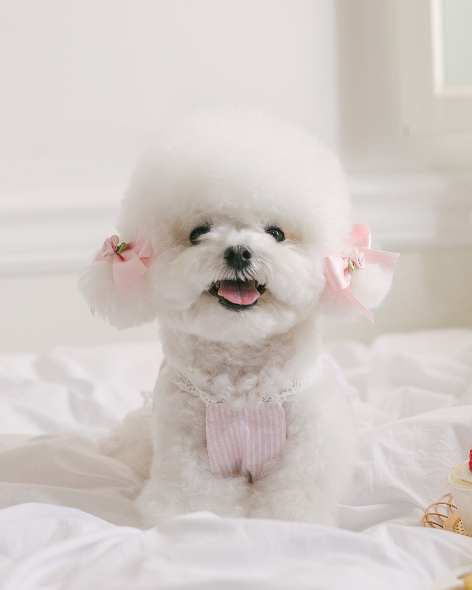 소녀스러운 무드를 가득 담은 스트라이프 패턴 위에 레이스와 작은 로즈 장식을 더해 사랑스러움이 톡톡 터지는 샤베트 무드를 담았어요.