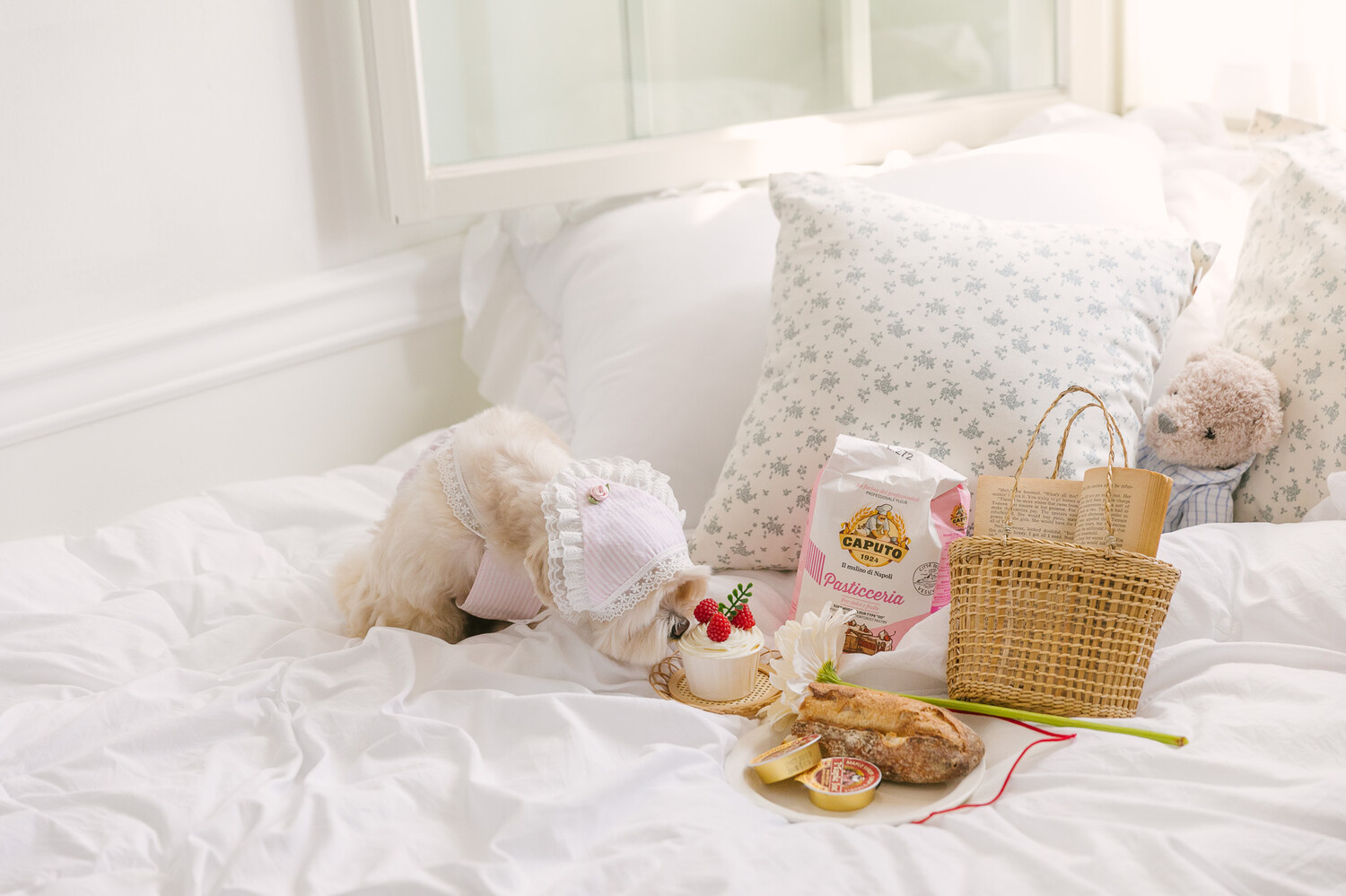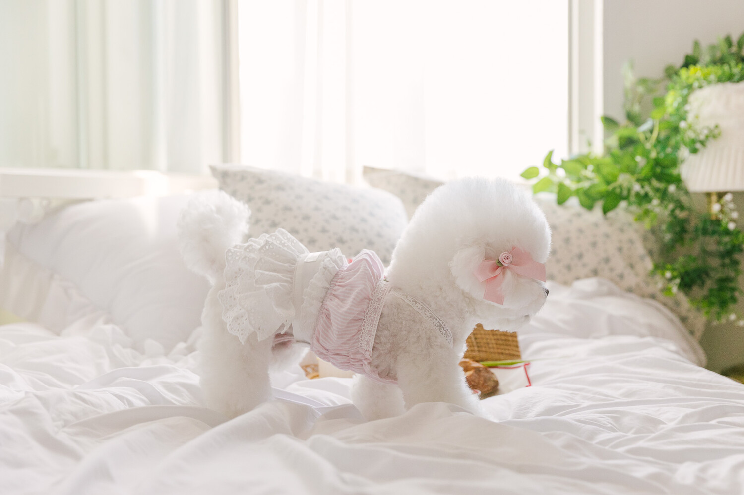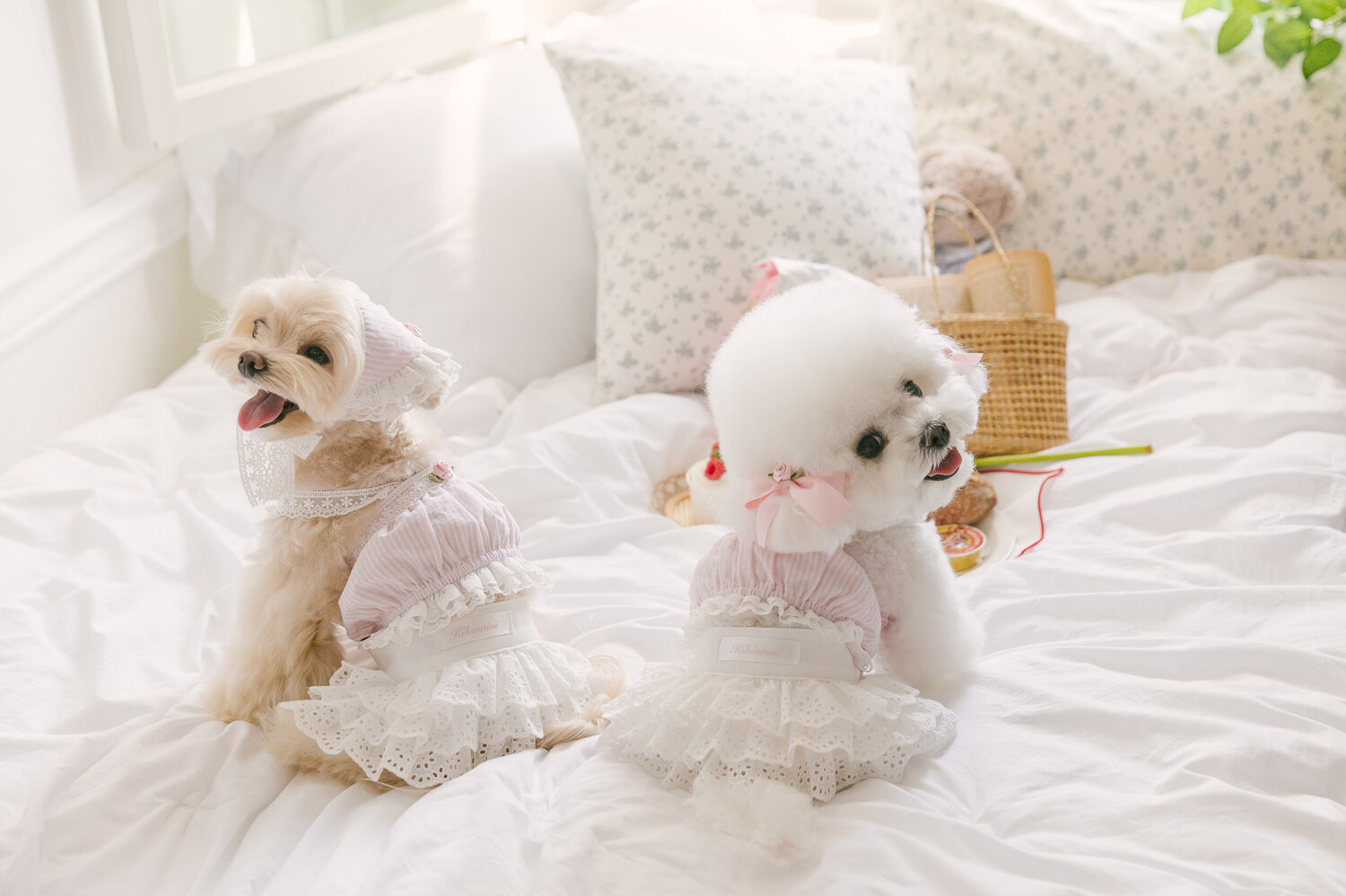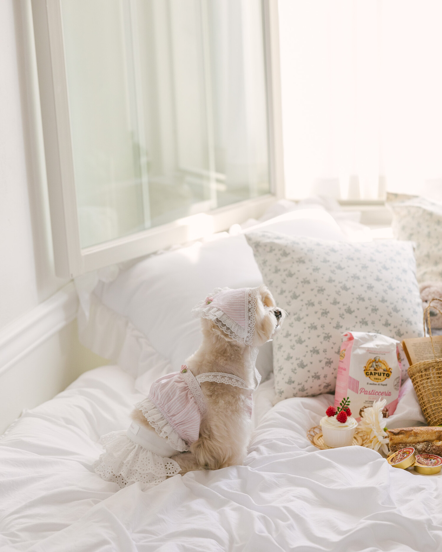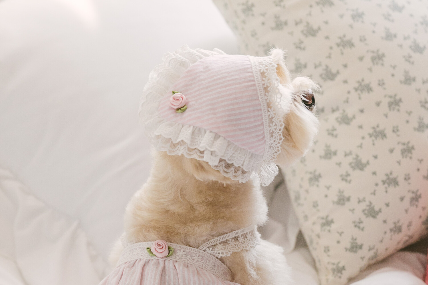 소녀스러운 무드를 가득 담은 스트라이프 패턴 위에 레이스와 작은 로즈 장식을 더해 사랑스러움이 톡톡 터지는 샤베트 무드를 담았어요.