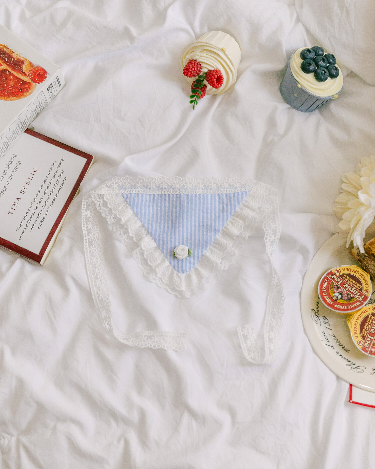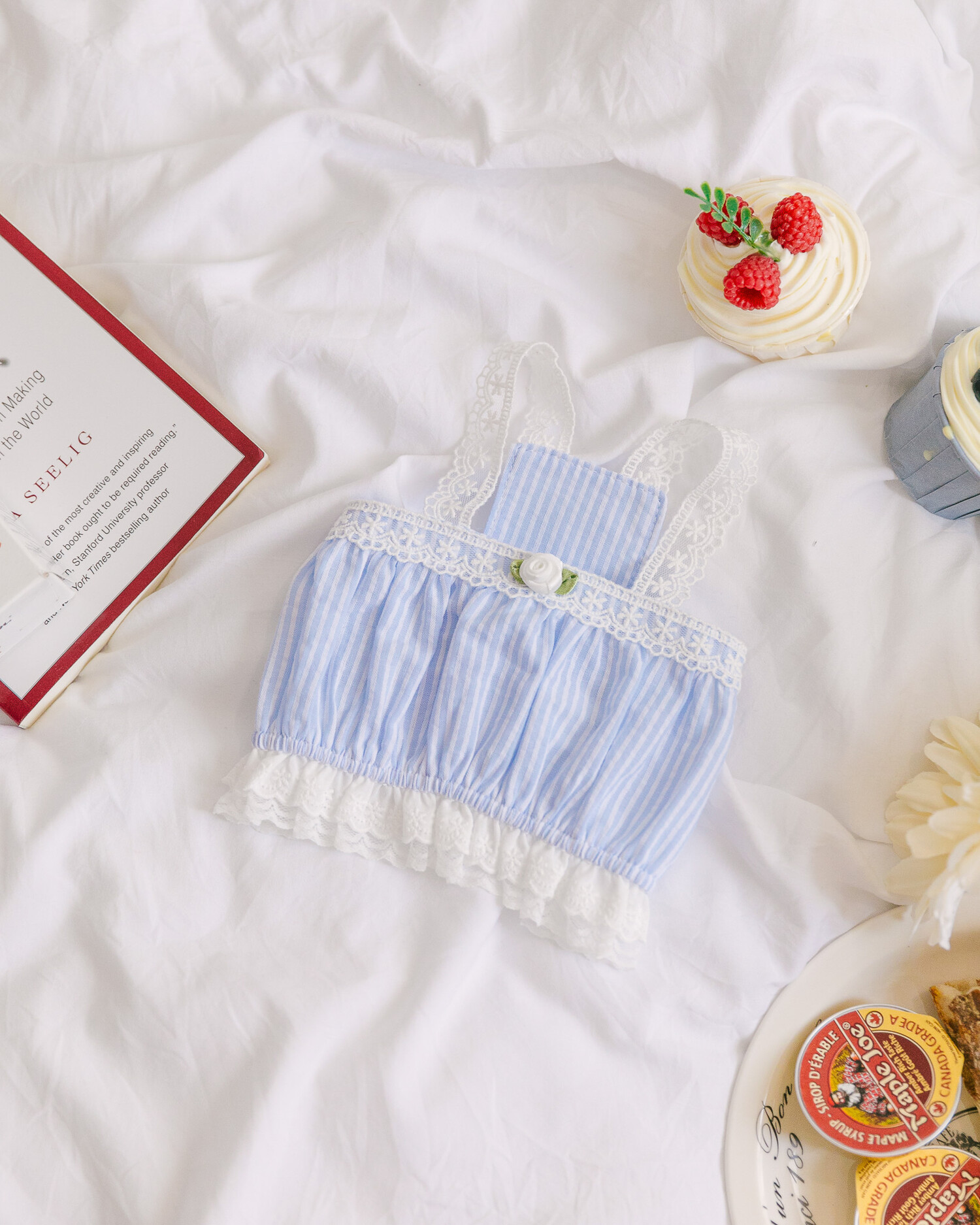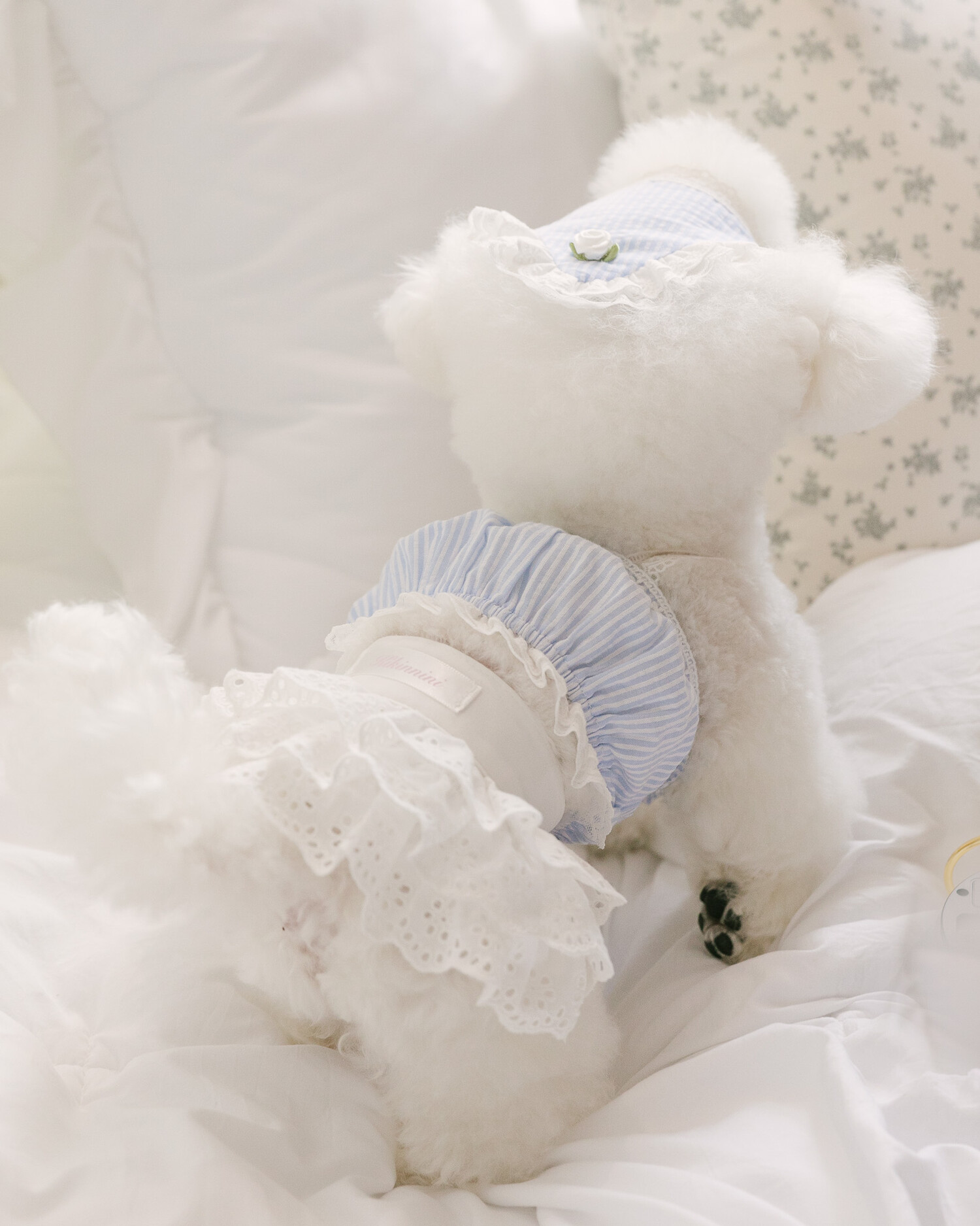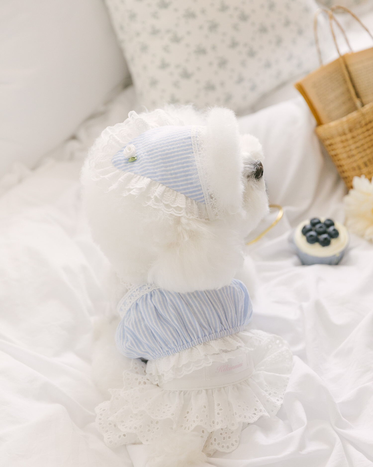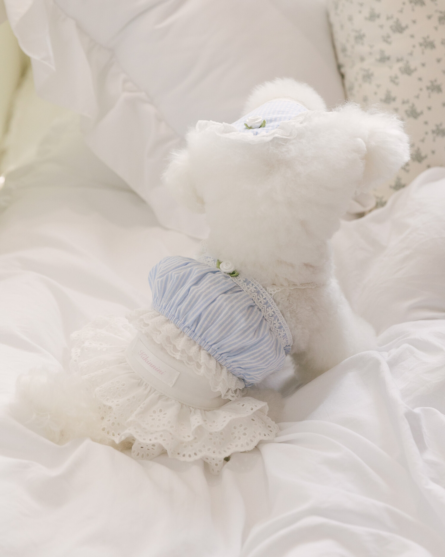 소녀스러운 무드를 가득 담은 스트라이프 패턴 위에 레이스와 작은 로즈 장식을 더해 사랑스러움이 톡톡 터지는 샤베트 무드를 담았어요.