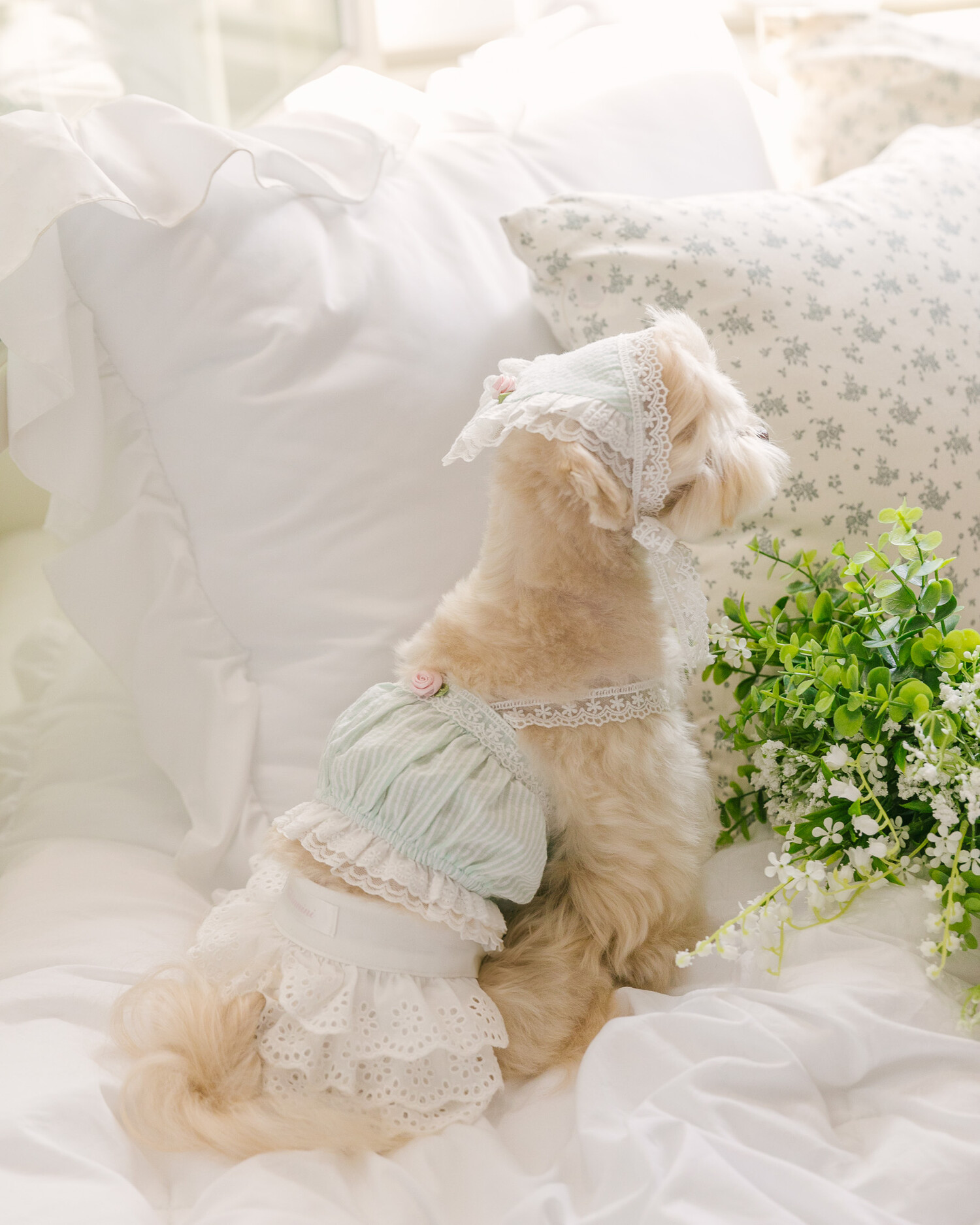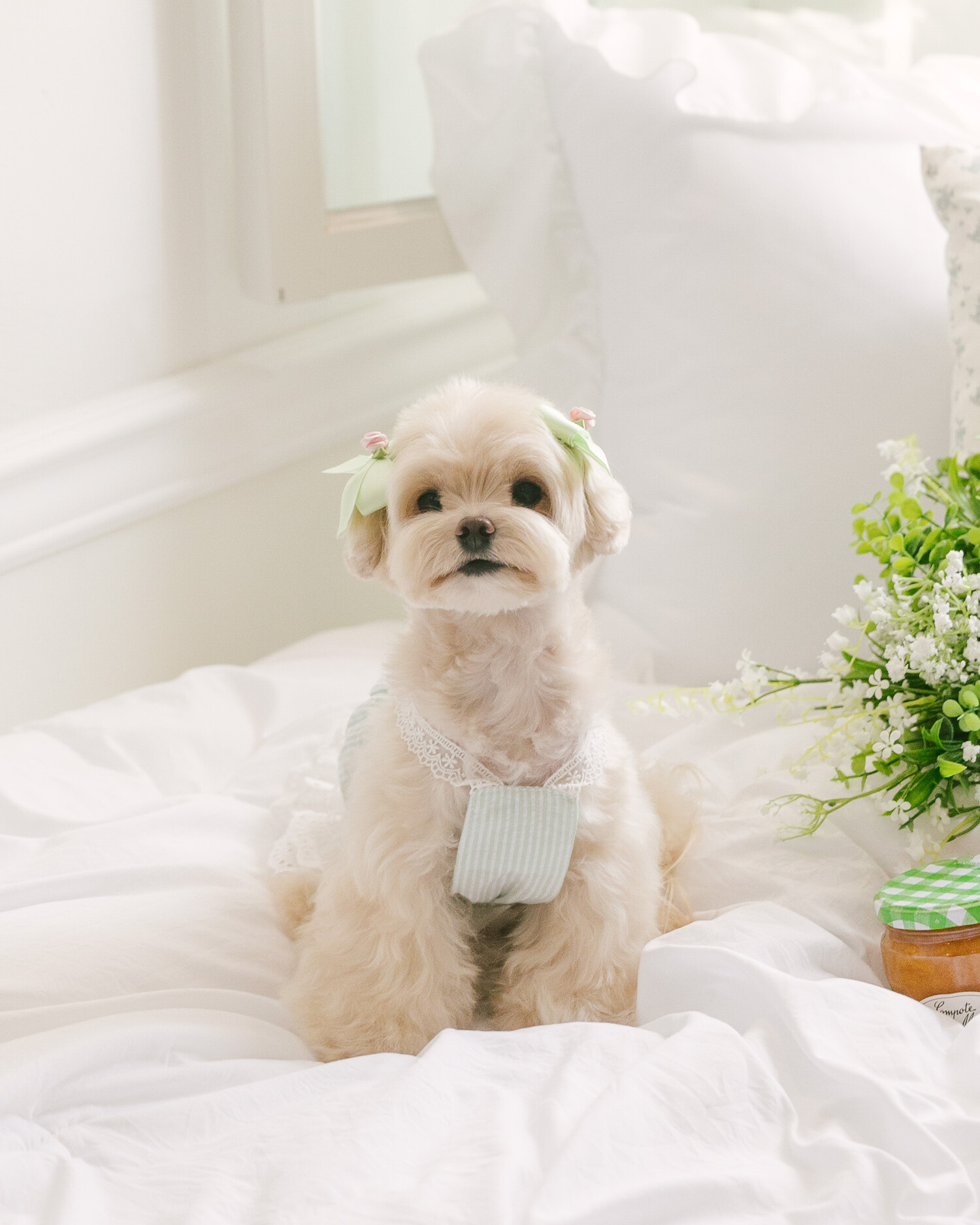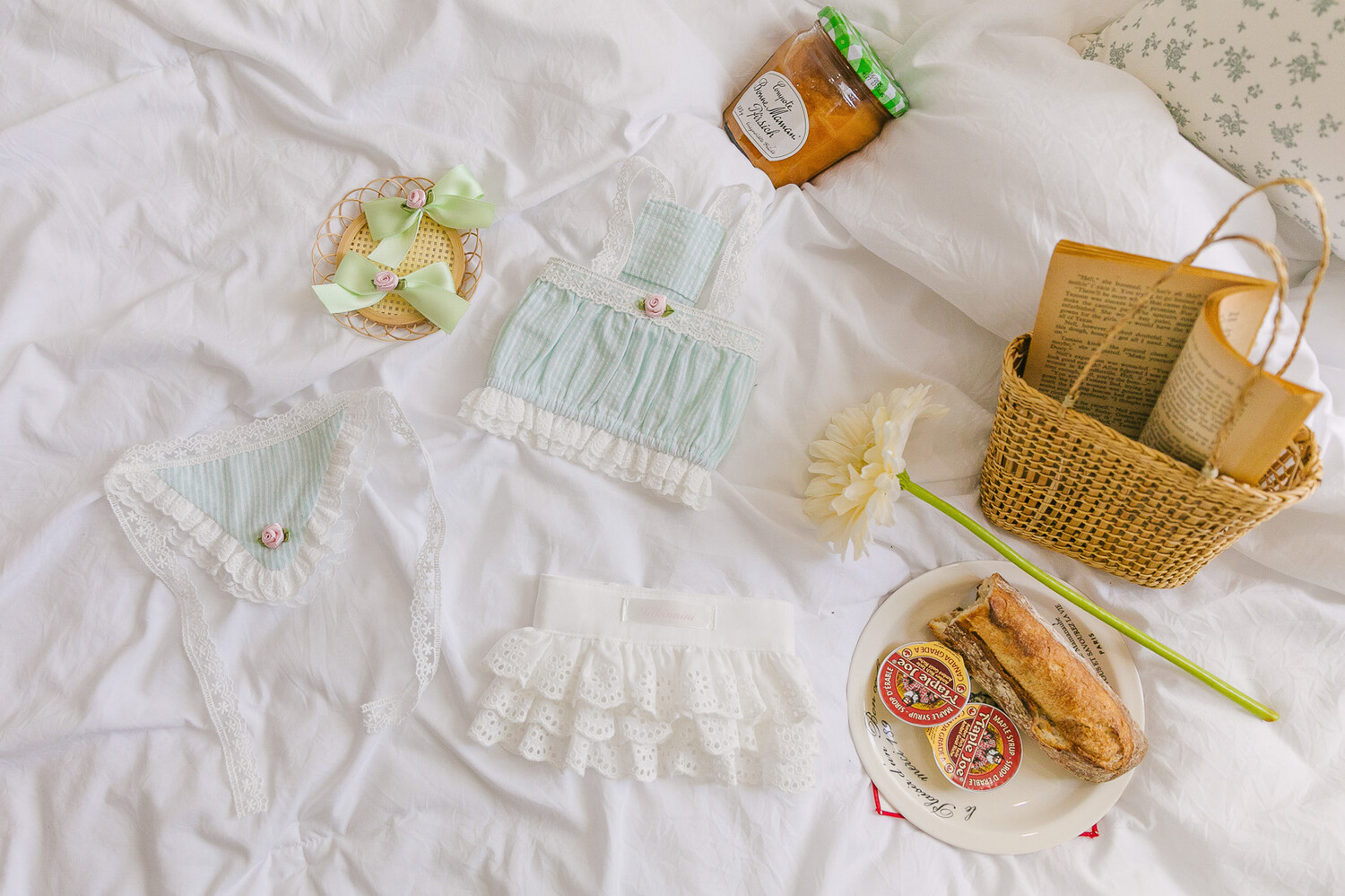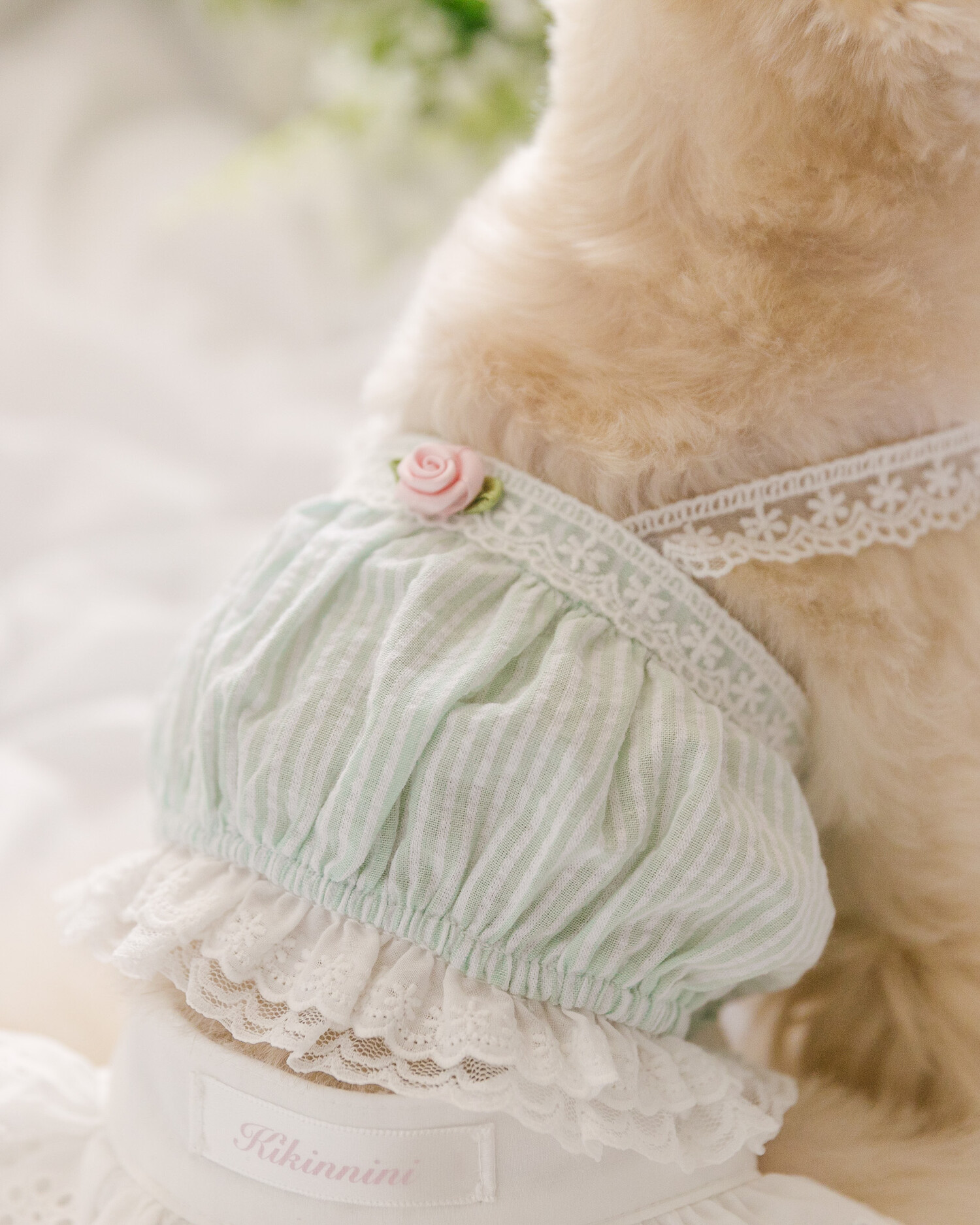 소녀스러운 무드를 가득 담은 스트라이프 패턴 위에 레이스와 작은 로즈 장식을 더해 사랑스러움이 톡톡 터지는 샤베트 무드를 담았어요.