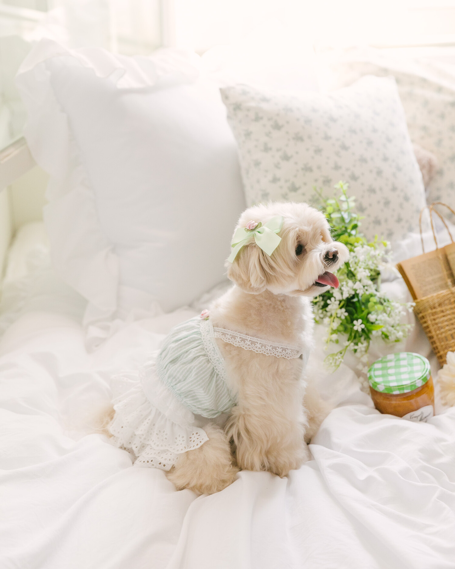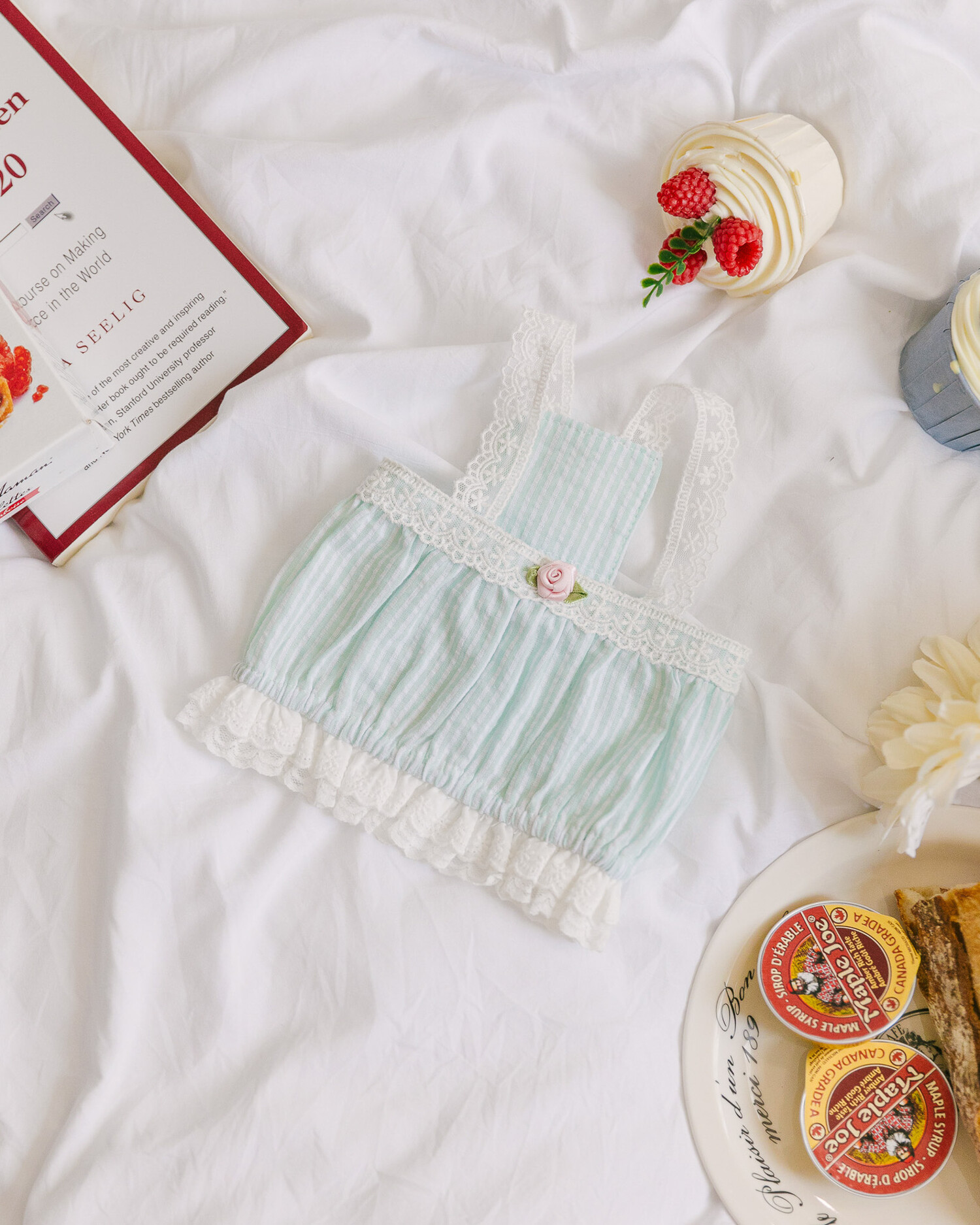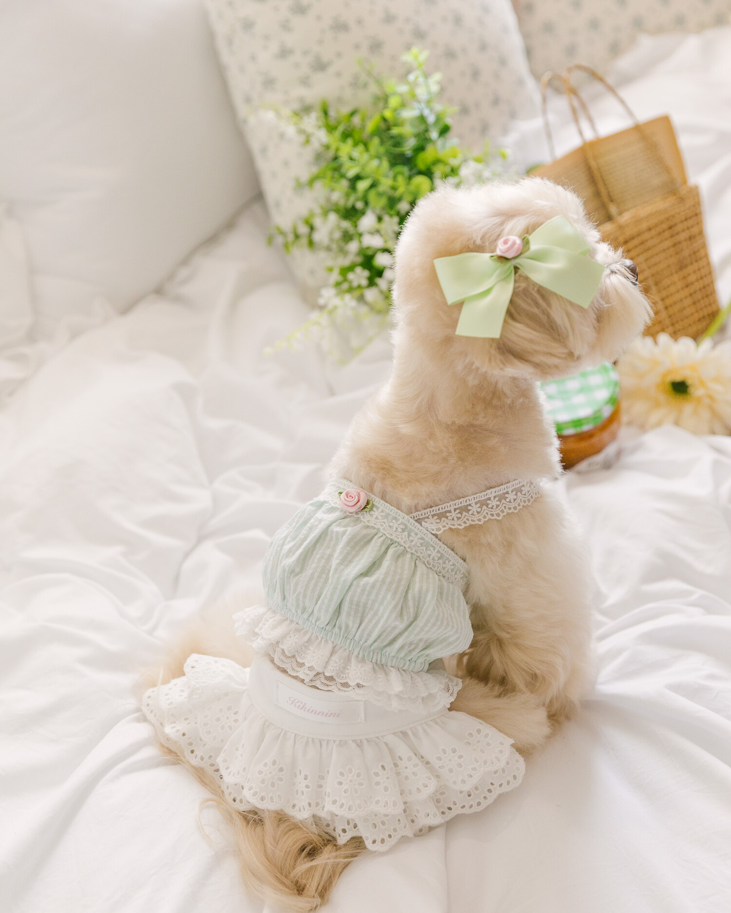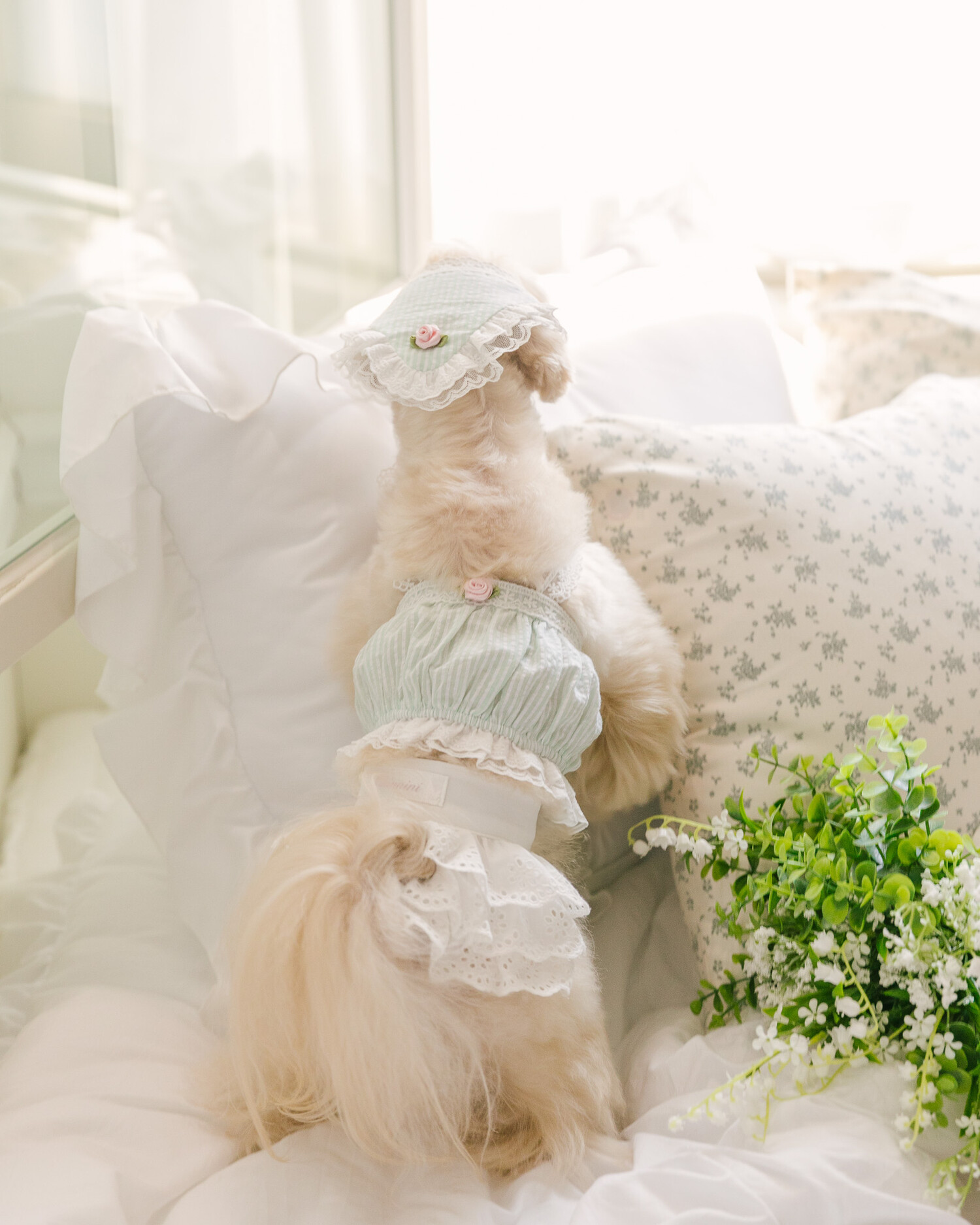 소녀스러운 무드를 가득 담은 스트라이프 패턴 위에 레이스와 작은 로즈 장식을 더해 사랑스러움이 톡톡 터지는 샤베트 무드를 담았어요.
