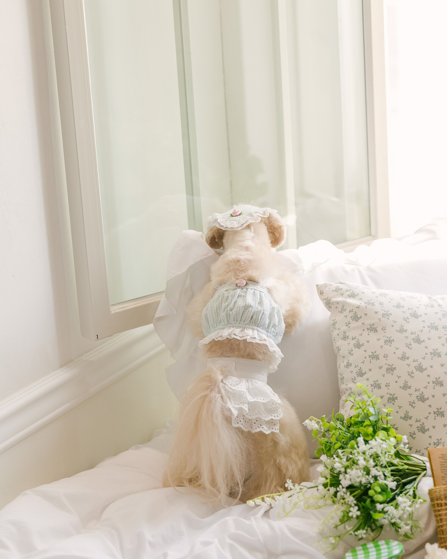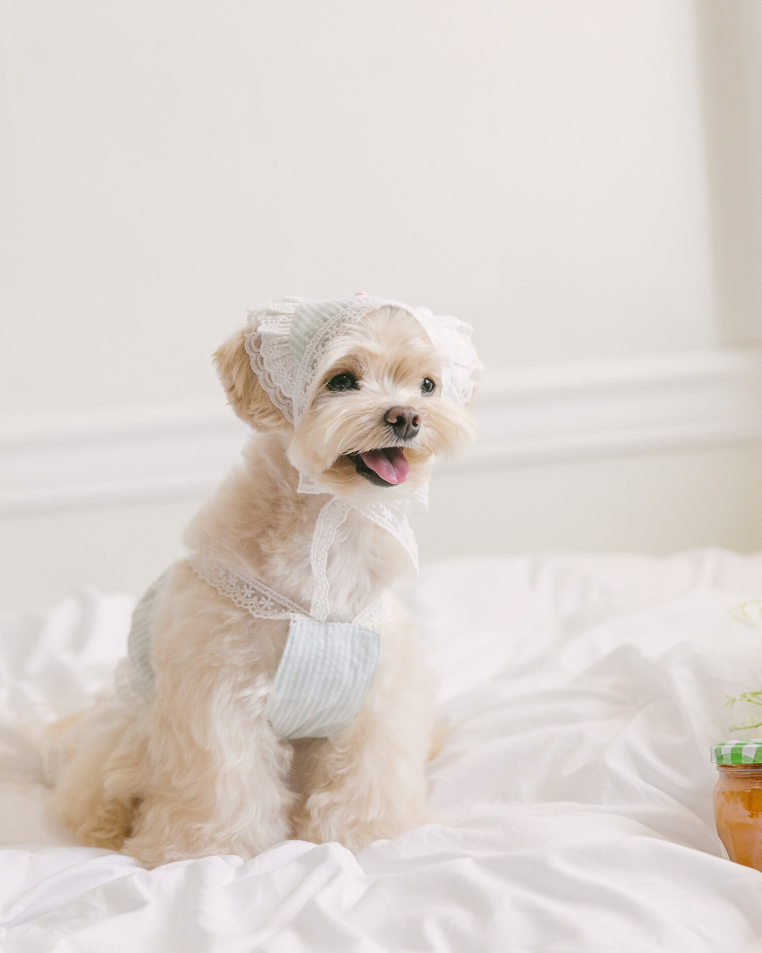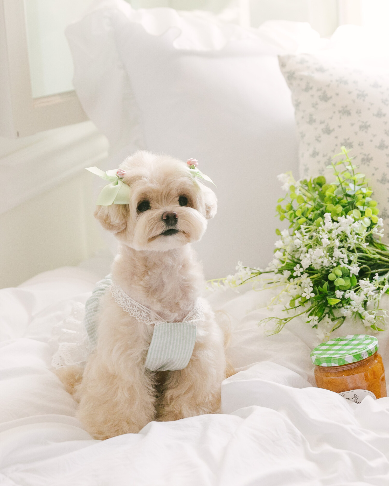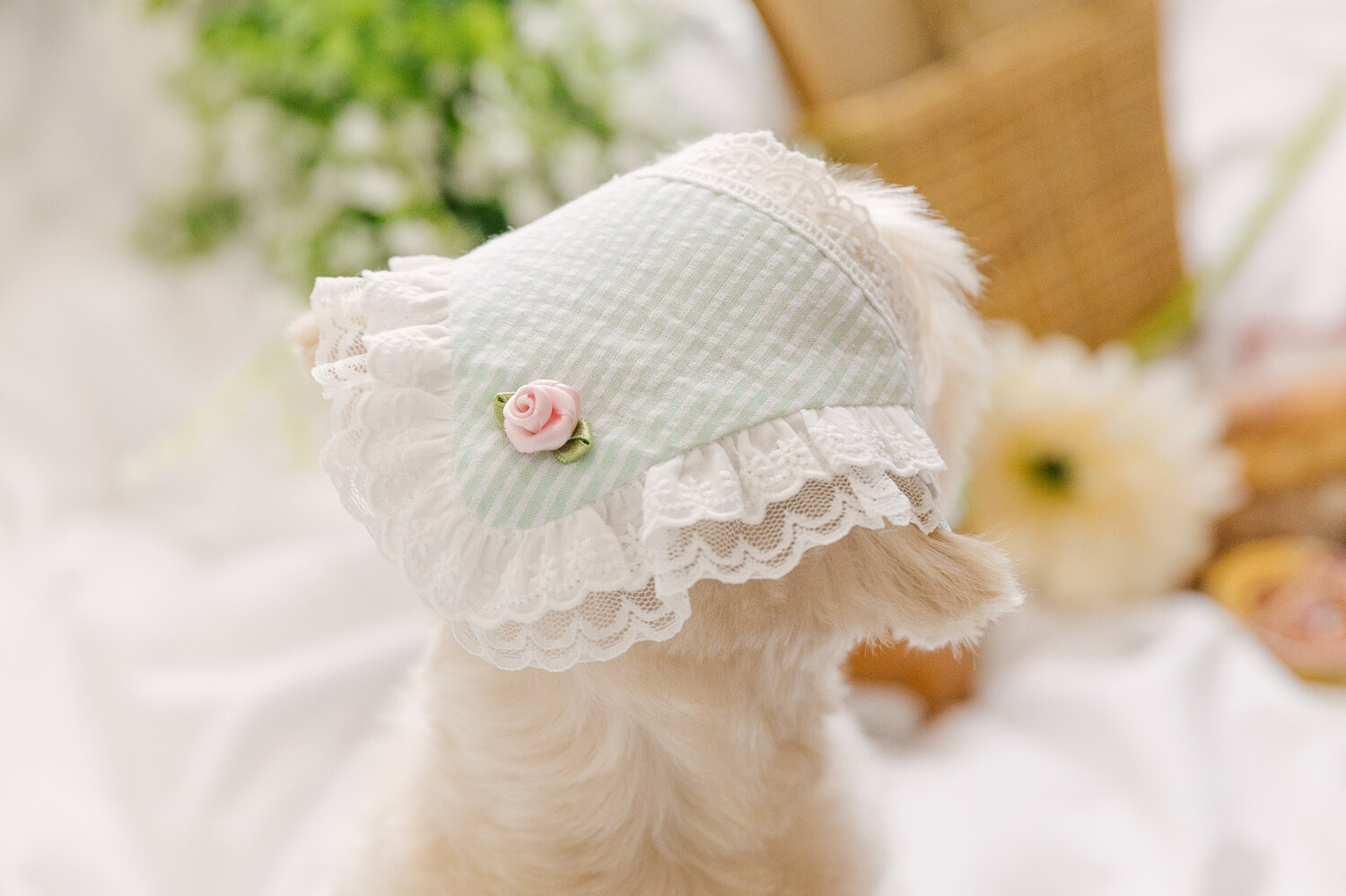 소녀스러운 무드를 가득 담은 스트라이프 패턴 위에 레이스와 작은 로즈 장식을 더해 사랑스러움이 톡톡 터지는 샤베트 무드를 담았어요.