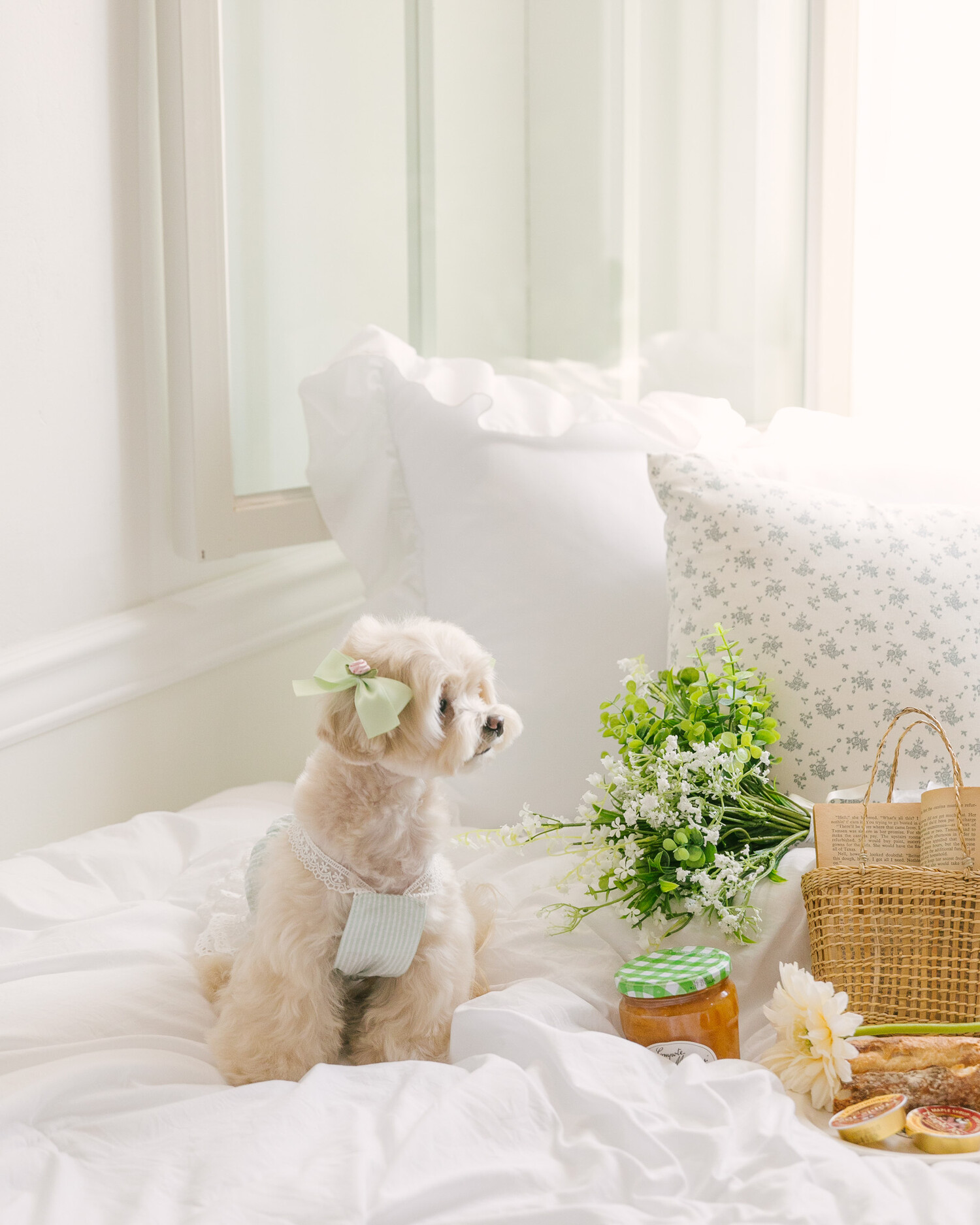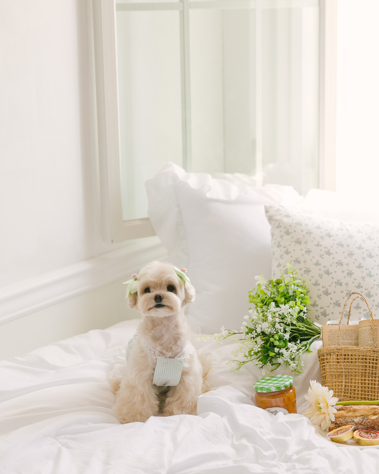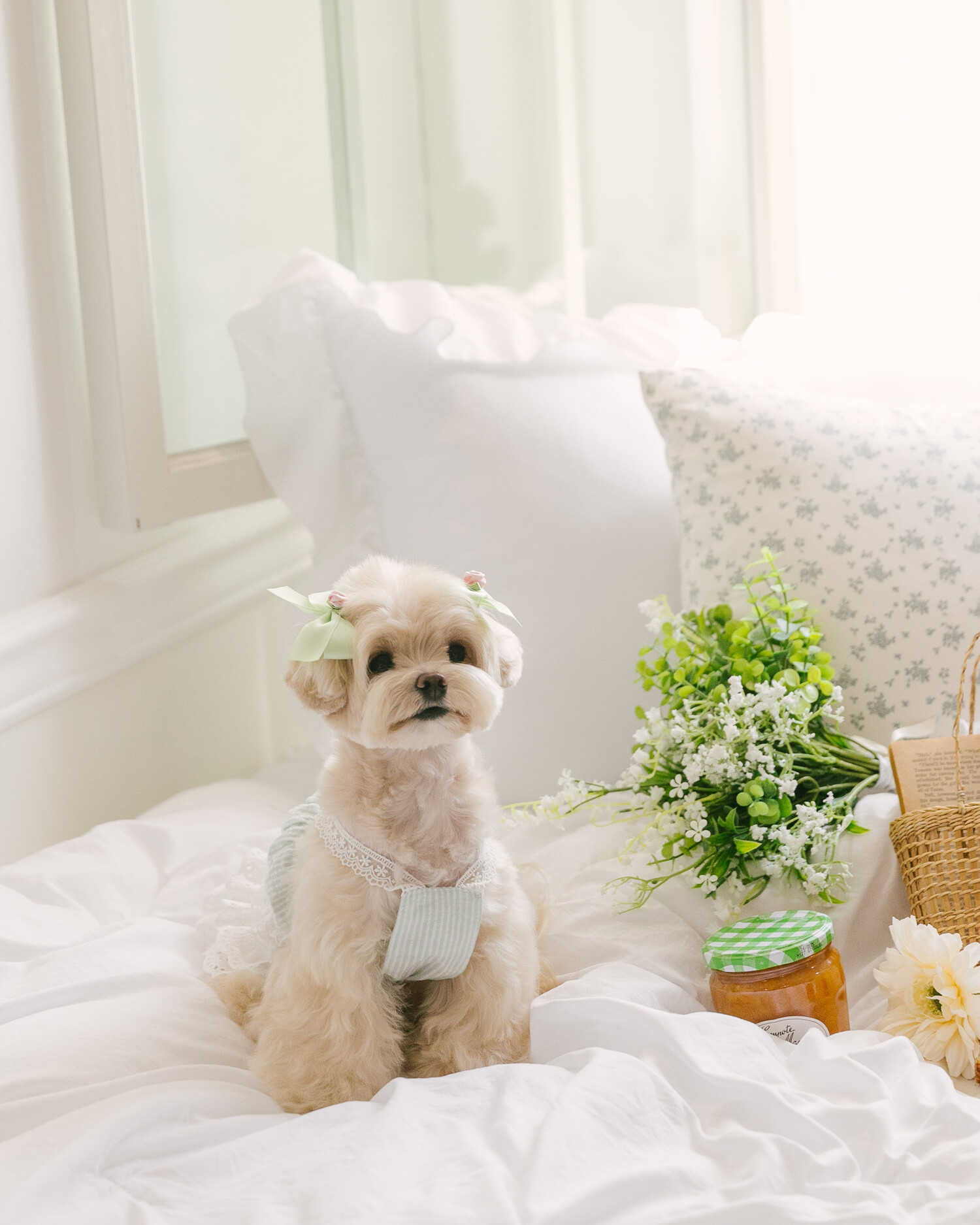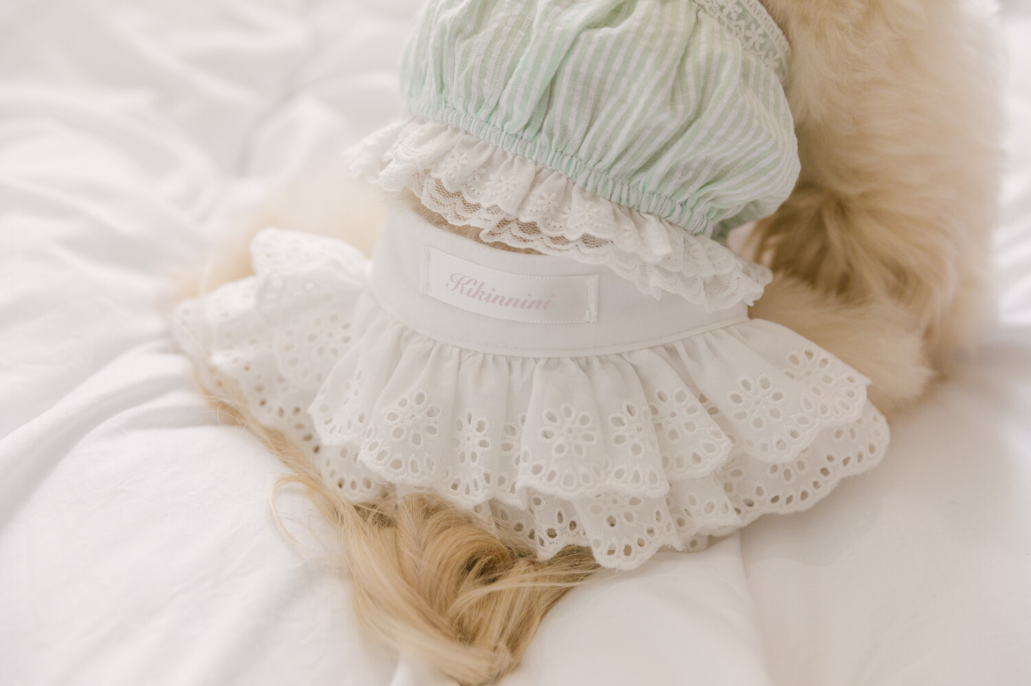 소녀스러운 무드를 가득 담은 스트라이프 패턴 위에 레이스와 작은 로즈 장식을 더해 사랑스러움이 톡톡 터지는 샤베트 무드를 담았어요.