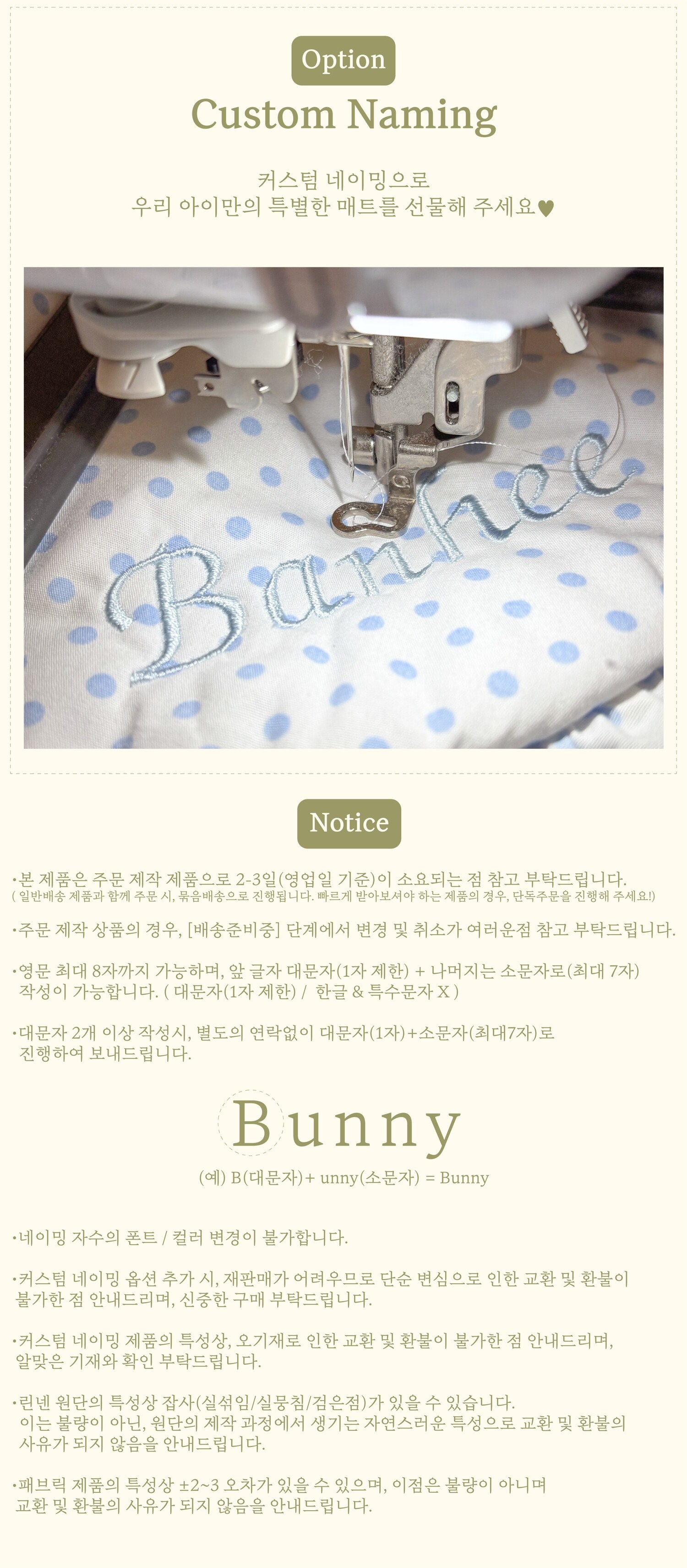 [Notice] •본 제품은 주문 제작 제품으로 2-3일(영업일 기준)이 소요되는 점 참고 부탁드립니다. (일반배송 제품과 함께 주문 시 묶음배송으로 진행되며, 빠르게 받아보셔야 하는 제품의 경우, 단독주문을 진행해주세요!) •주문 제작 상품의 경우, [배송준비중] 단계에서의 취소가 어려우신 점 참고 부탁드립니다. •영문 최대 8자 가능하며, [앞 글자] 대문자 1자(글씨크기로 인해 1자 제한)+ [나머지] 소문자(최대 7자) 작성이 가능합니다. ( 대문자(1자 제한) / 한글&특수문자 X ) •네이밍 자수의 폰트 / 컬러 변경이 불가능 합니다. •커스텀 네이밍 옵션 추가 시, 재판매가 어려우므로 단순 변심으로 인한 교환 및 환불이 불가한 점 안내드리며, 신중한 구매 부탁드립니다. •커스텀 네이밍 제품의 특성상, 오기재로 인한 교환 및 환불이 불가한 점 안내드리며, 알맞은 기재와 확인 부탁드립니다. •패브릭 제품의 특성상 ±1~2cm 오차가 있을 수 있으며, 이점은 불량이 아니며 교환 및 환불의 사유가 되지 않음을 안내드립니다.