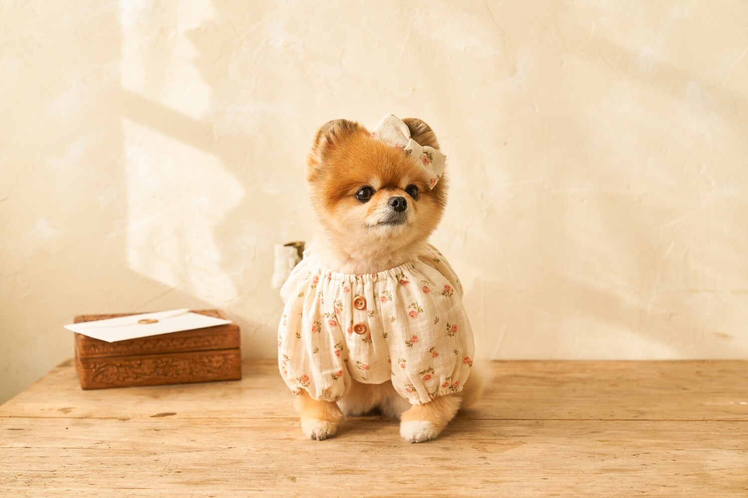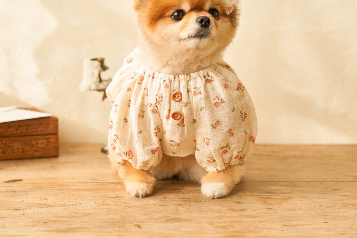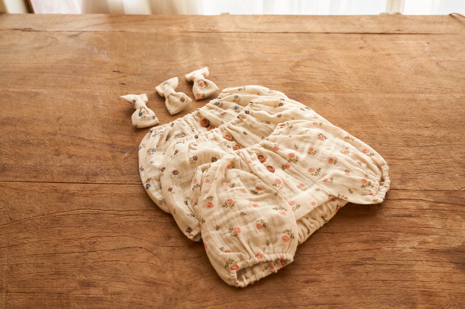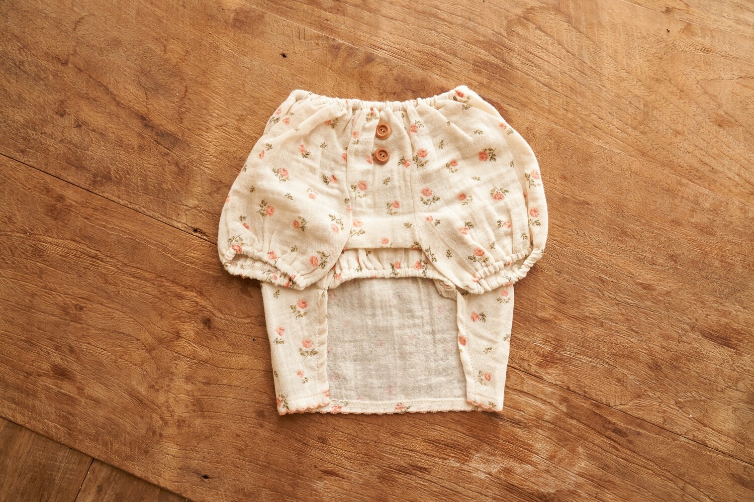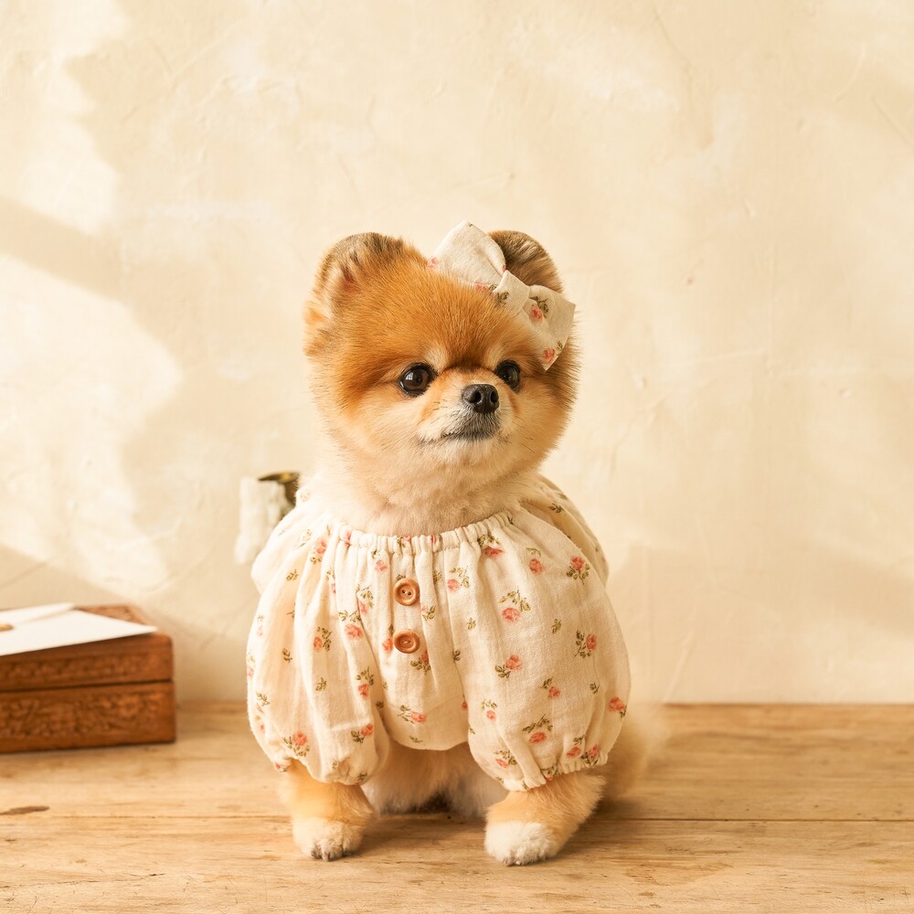 잔잔하고 빈티지한 색감의 플라워 패턴, 나무 단추, 등 쪽에 핀코트 자수로 귀여움 포인트를 주었으며, 넥 부분과 소매 부분의 밴딩 디자인으로, 아이들이 답답한 느낌 없이 입고 벗기 편하도록 제작하였습니다.