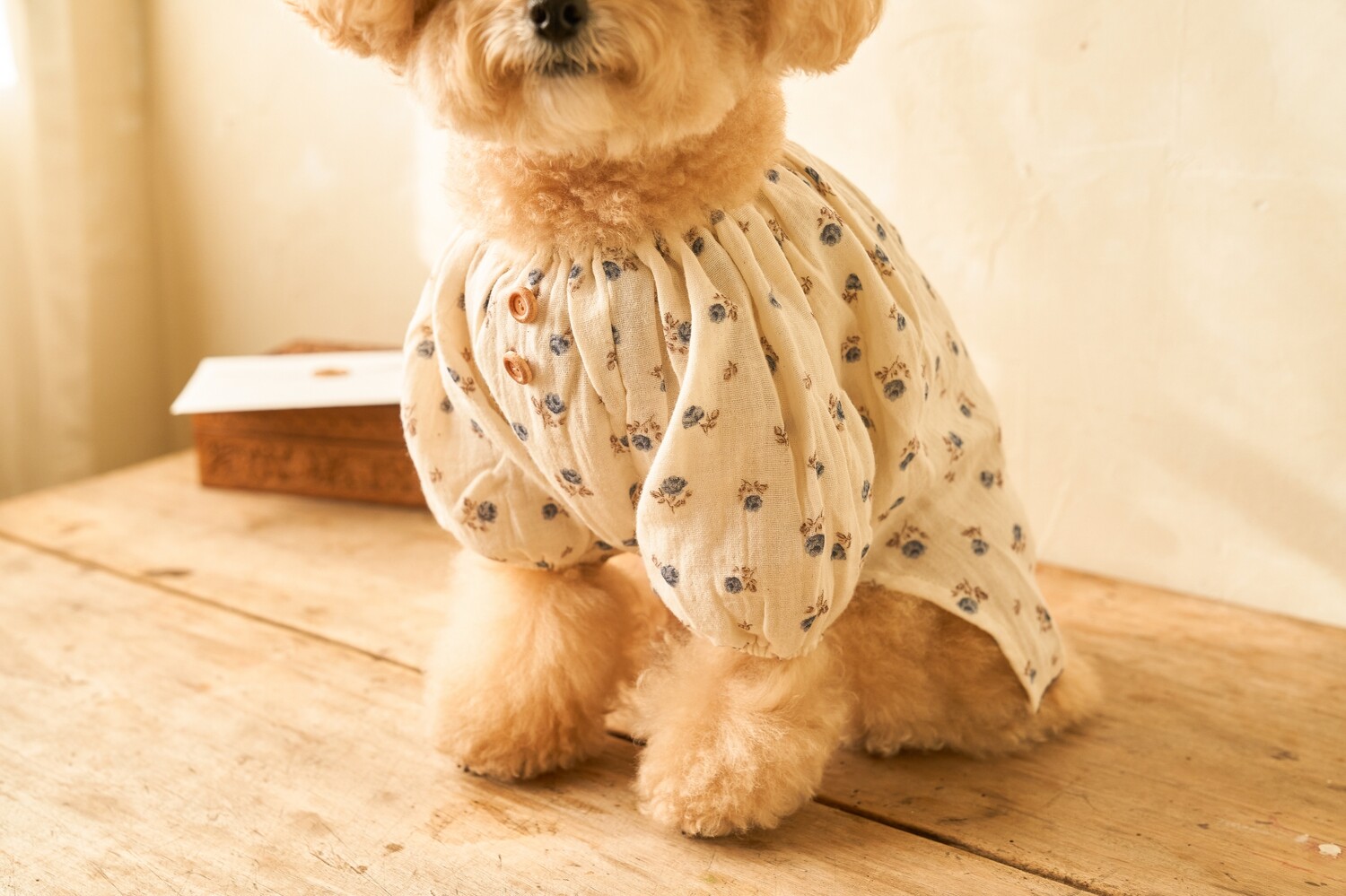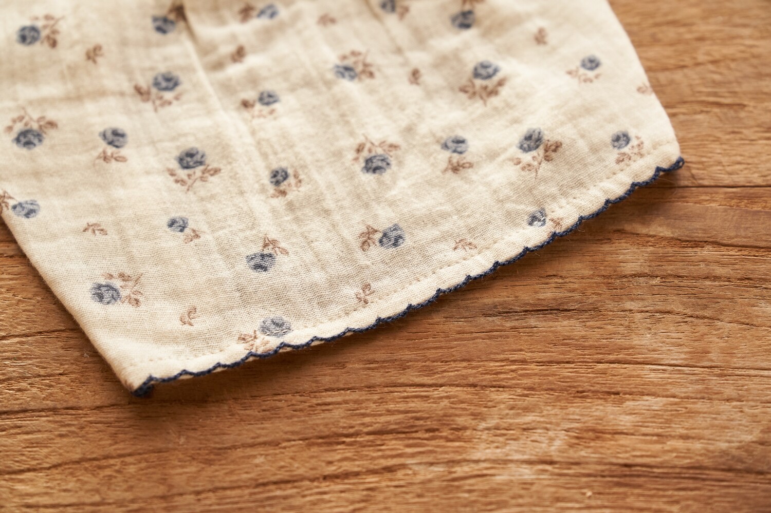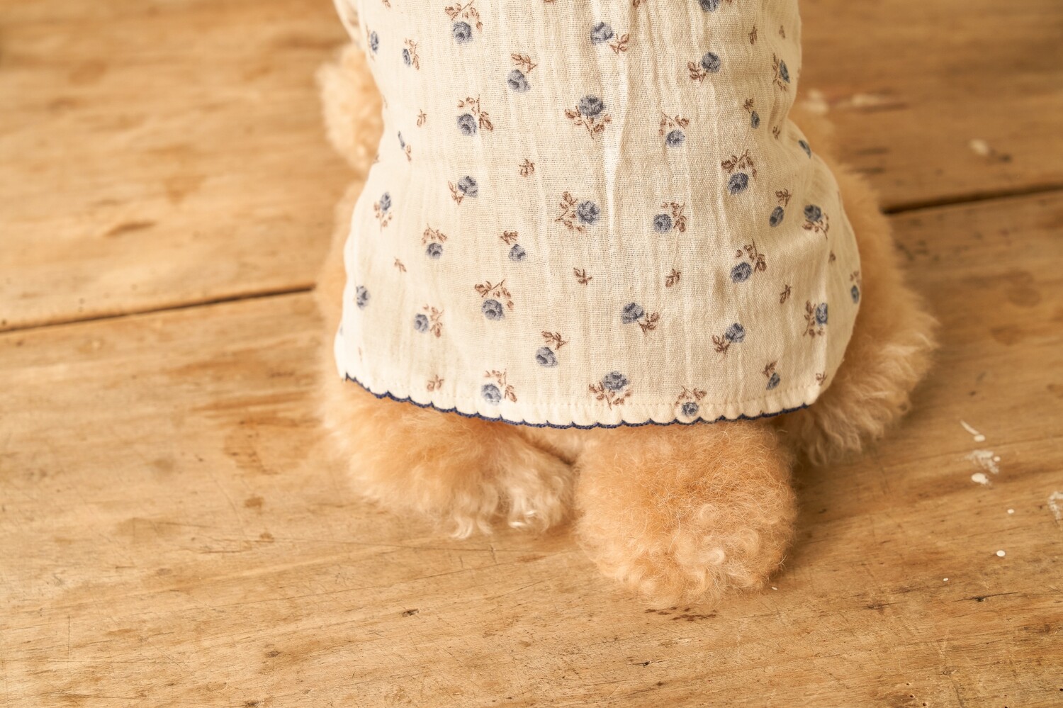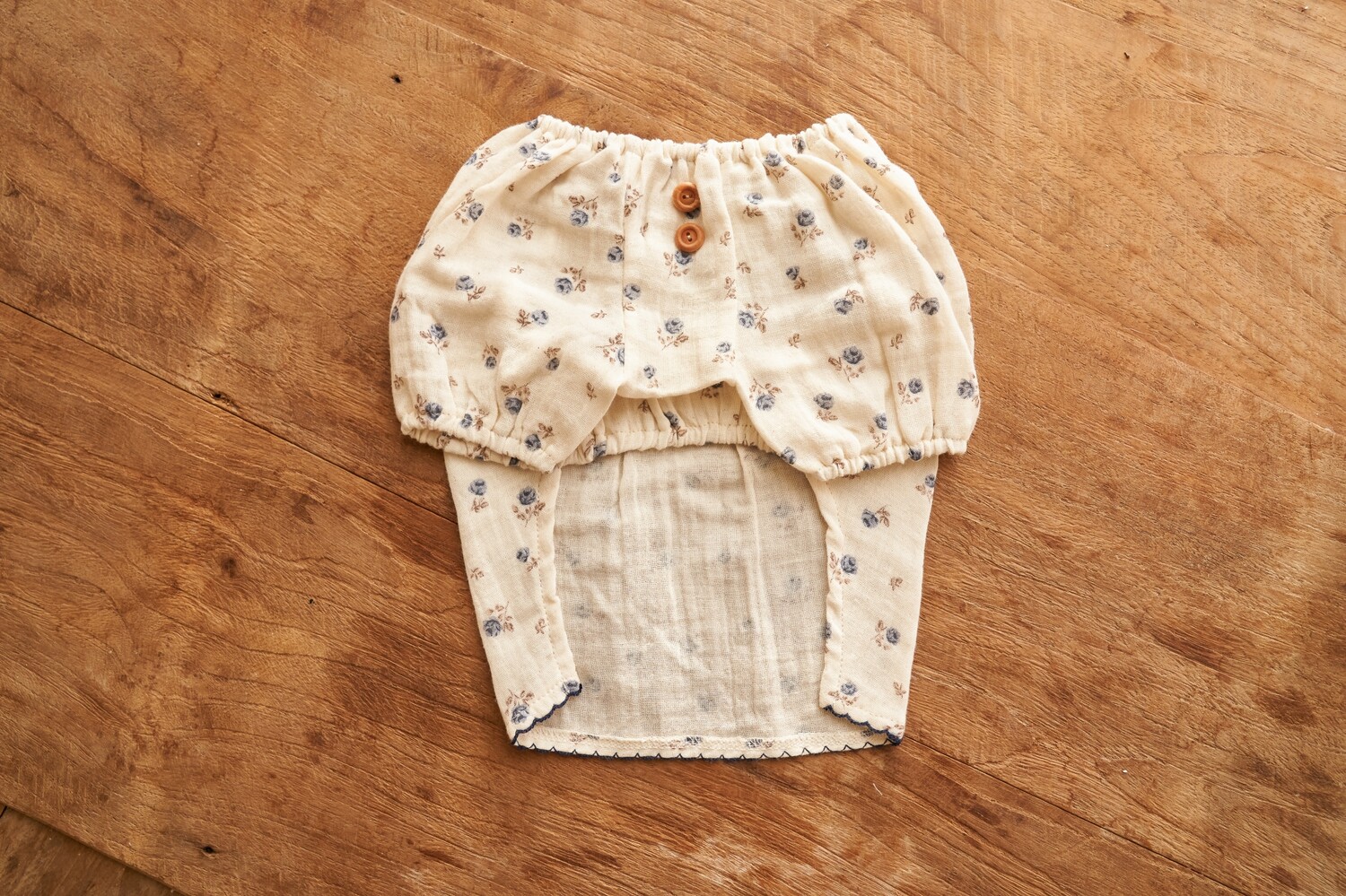 잔잔하고 빈티지한 색감의 플라워 패턴, 나무 단추, 등 쪽에 핀코트 자수로 귀여움 포인트를 주었으며, 넥 부분과 소매 부분의 밴딩 디자인으로, 아이들이 답답한 느낌 없이 입고 벗기 편하도록 제작하였습니다.