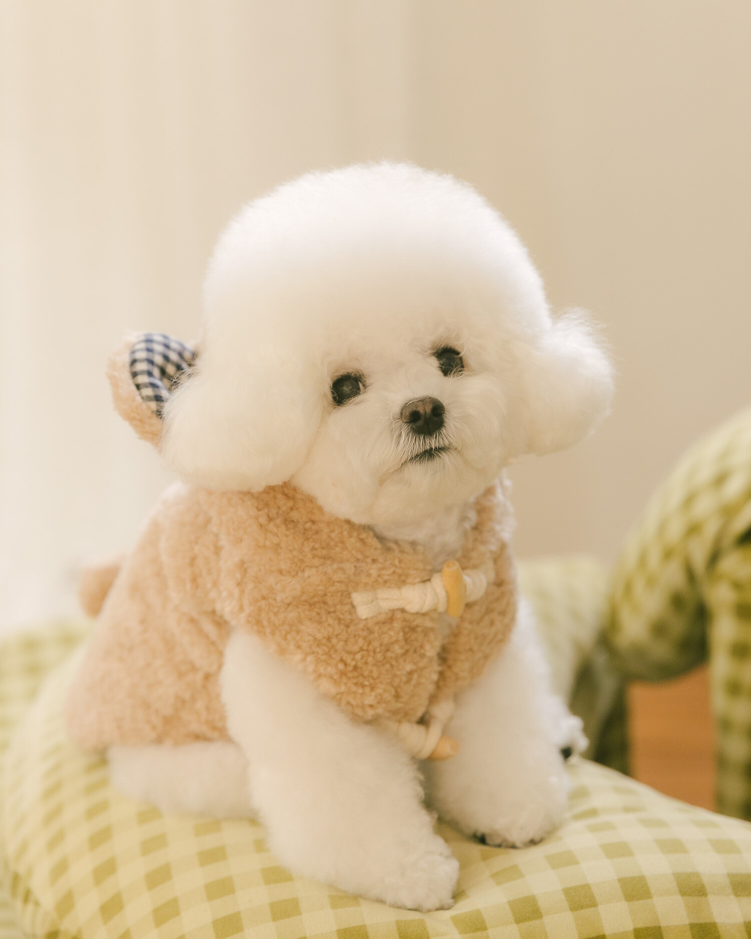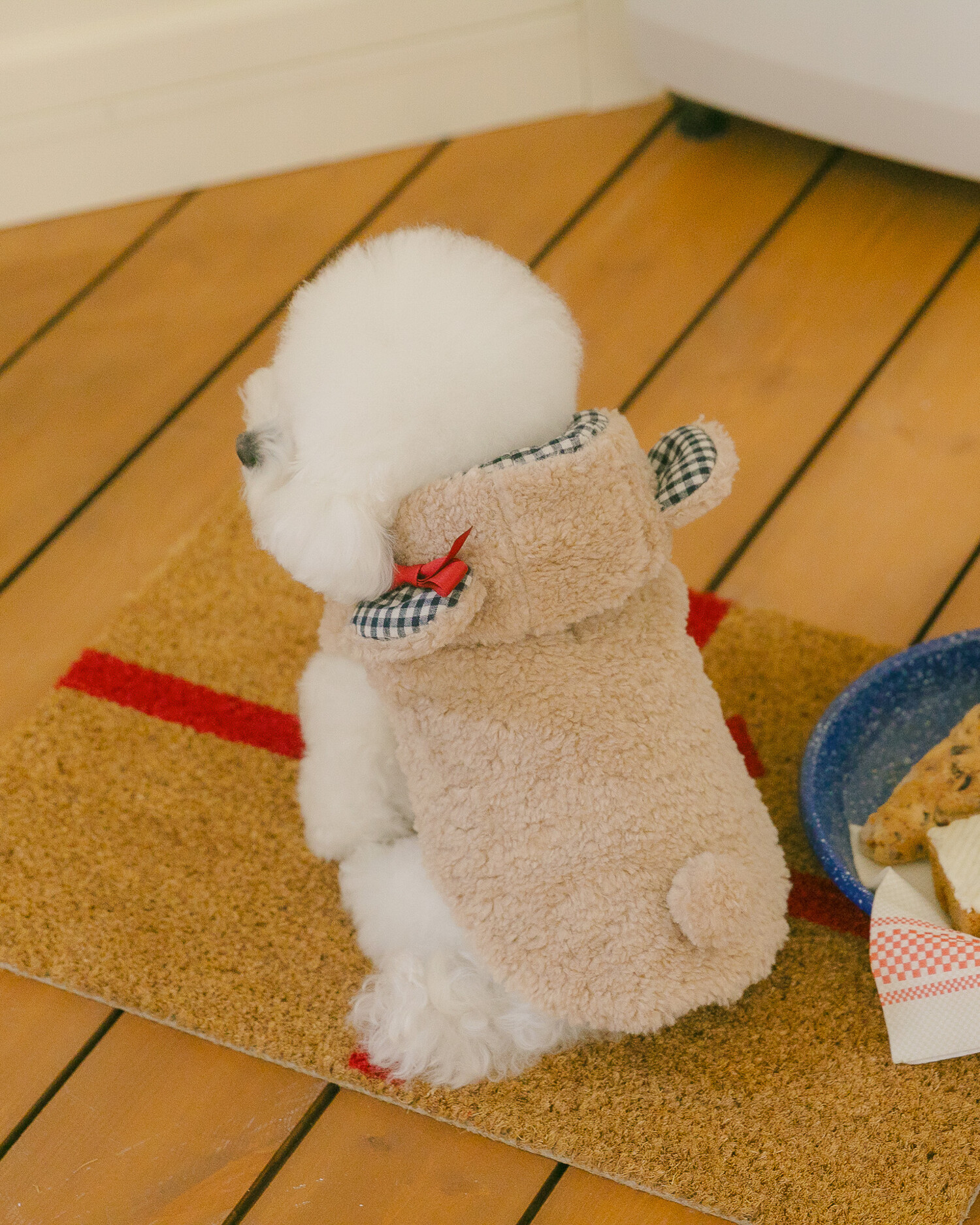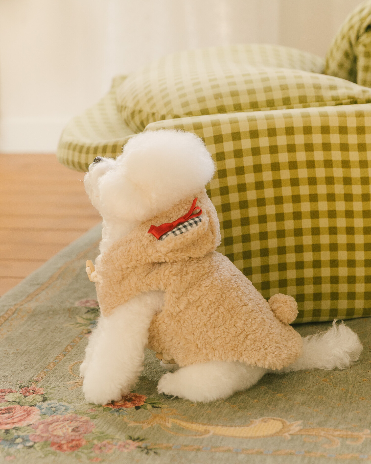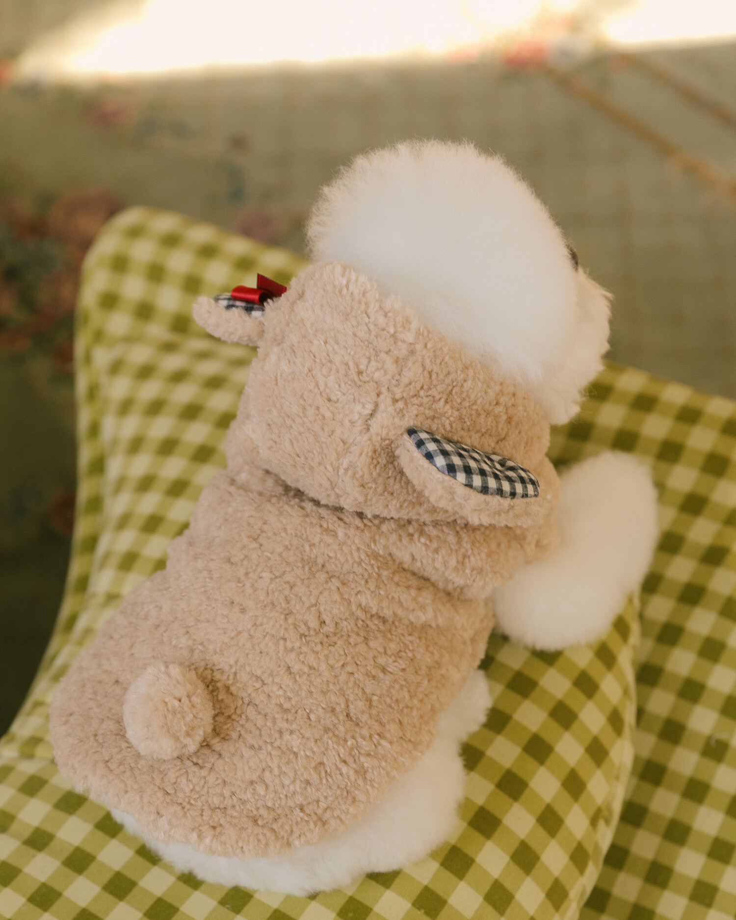 털 빠짐과 보풀 걱정 없는 부드러운 고급 부클 원단에 고방 체크 안감과 4온스 솜 본딩을 더해 겨울에도 따뜻하고 포근한 착용감을 전합니다. 토글 단추로 포인트를 주어 겨울 아우터 특유의 코지한 분위기를 살렸으며, 후드의 곰돌이 귀 디테일이 입는 순간 사랑스러운 실루엣을 완성합니다. 탈부착 가능한 리본 브로치로 깔끔한 연출부터 깜찍한 포인트 스타일까지 자유롭게 연출할 수 있고, 겨울 산책 시 하네스 위에 간편하게 착용할 수 있도록 등판에는 리드홀 디테일을 적용해 실용성까지 고려했습니다.