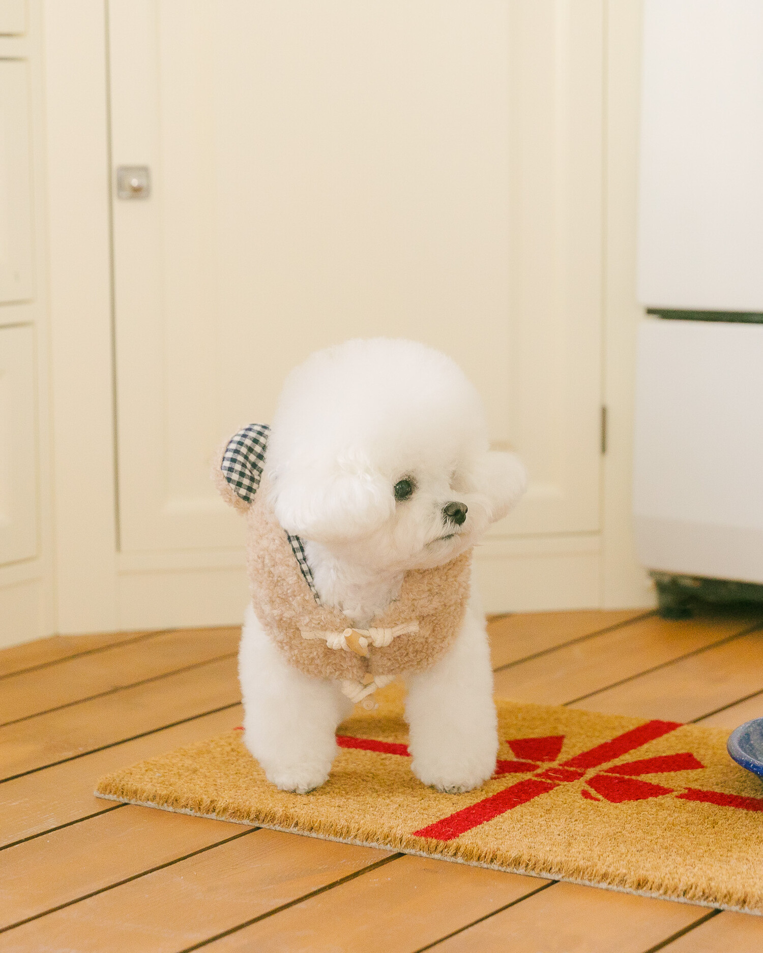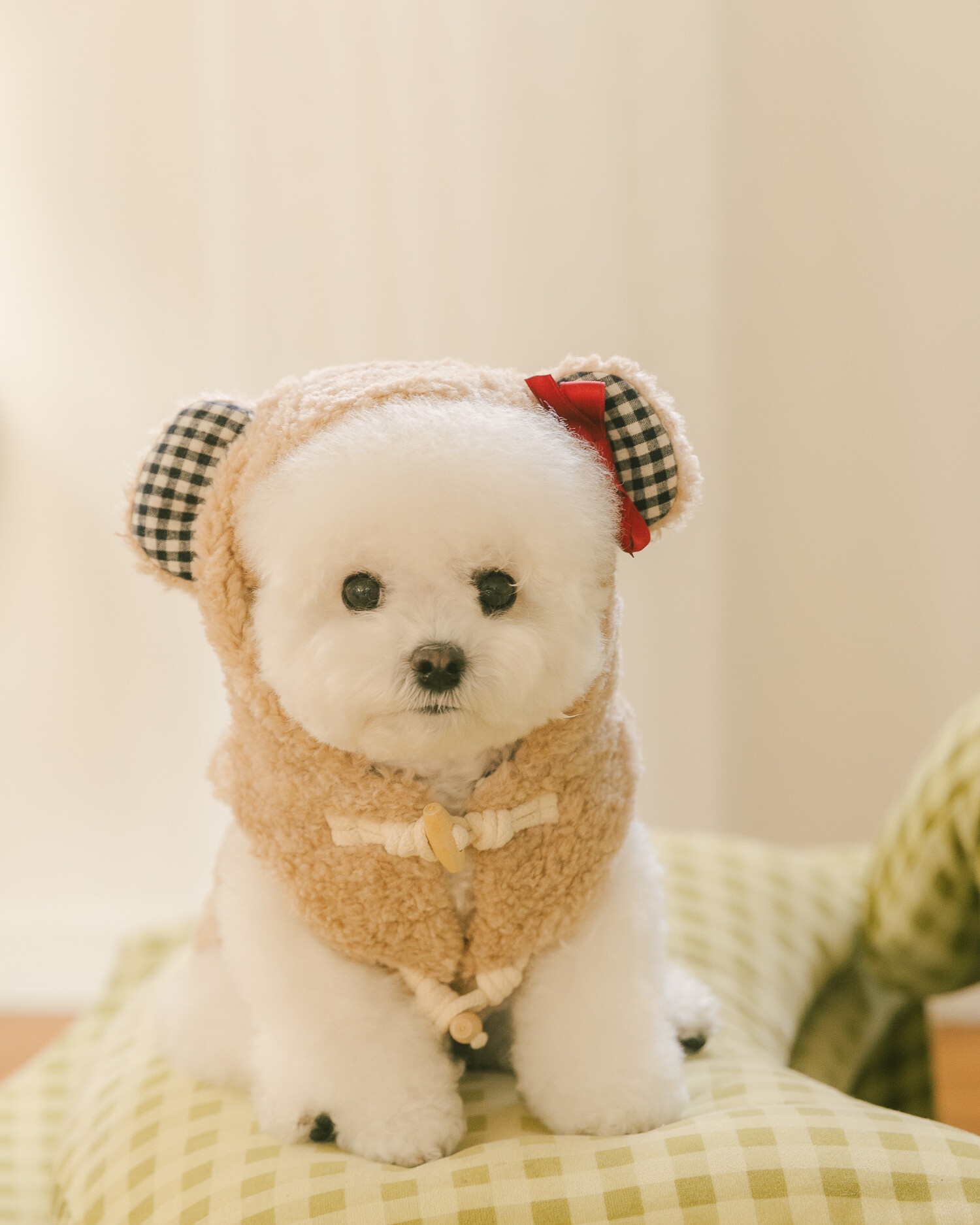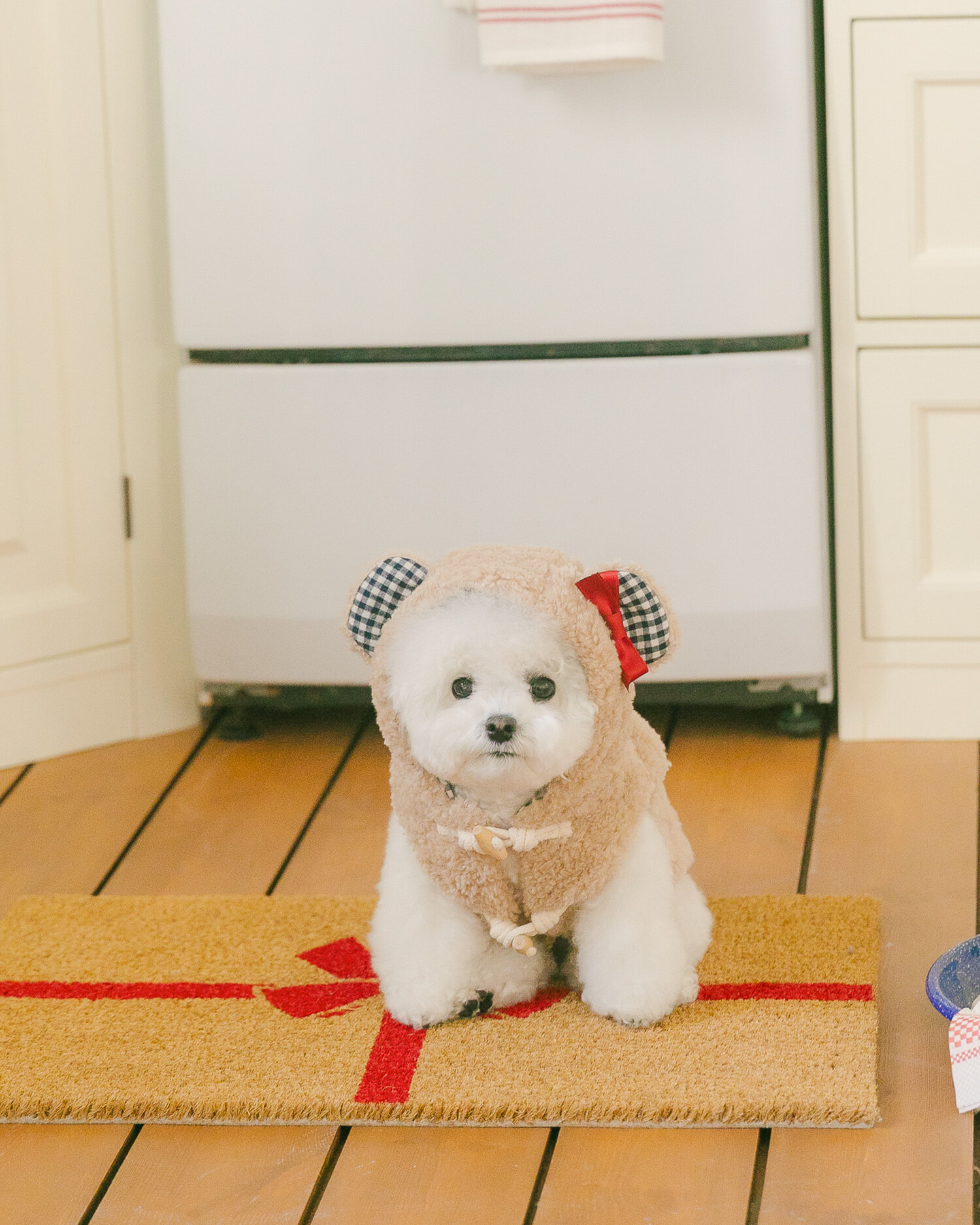 털 빠짐과 보풀 걱정 없는 부드러운 고급 부클 원단에 고방 체크 안감과 4온스 솜 본딩을 더해 겨울에도 따뜻하고 포근한 착용감을 전합니다. 토글 단추로 포인트를 주어 겨울 아우터 특유의 코지한 분위기를 살렸으며, 후드의 곰돌이 귀 디테일이 입는 순간 사랑스러운 실루엣을 완성합니다. 탈부착 가능한 리본 브로치로 깔끔한 연출부터 깜찍한 포인트 스타일까지 자유롭게 연출할 수 있고, 겨울 산책 시 하네스 위에 간편하게 착용할 수 있도록 등판에는 리드홀 디테일을 적용해 실용성까지 고려했습니다.