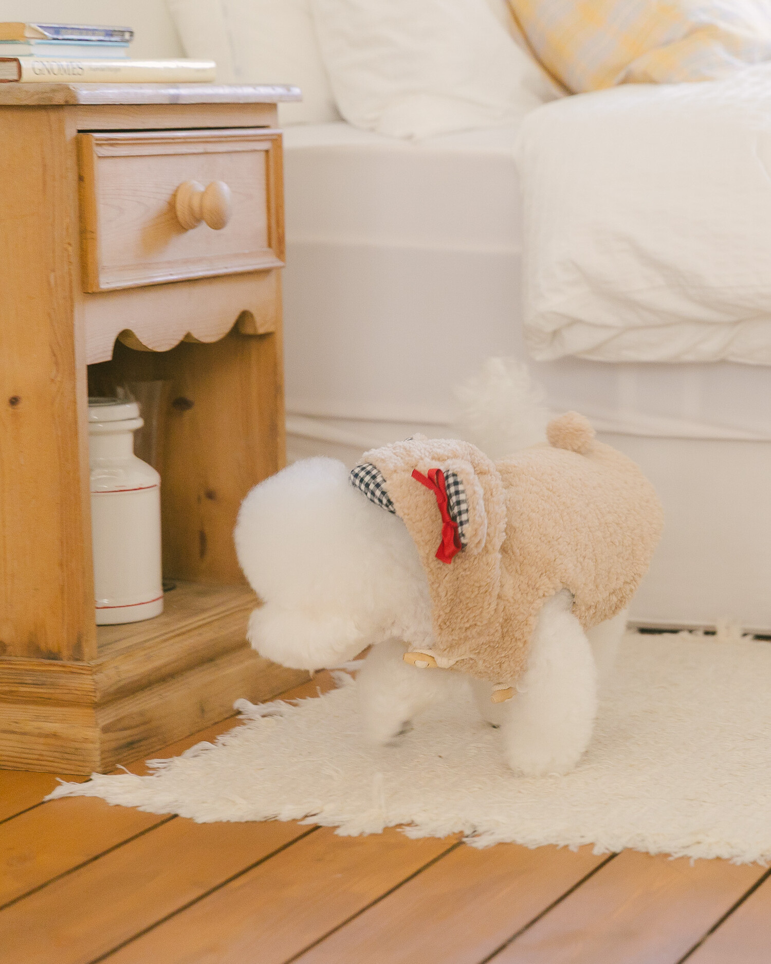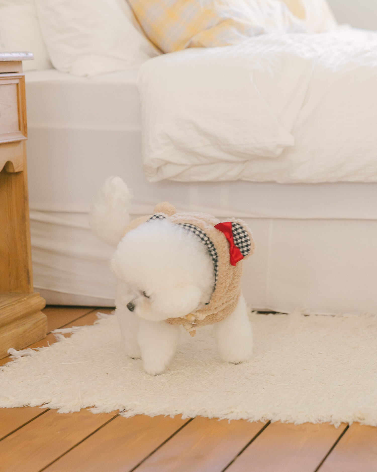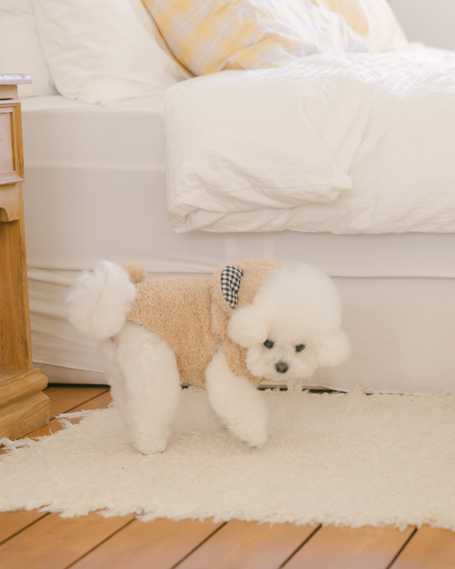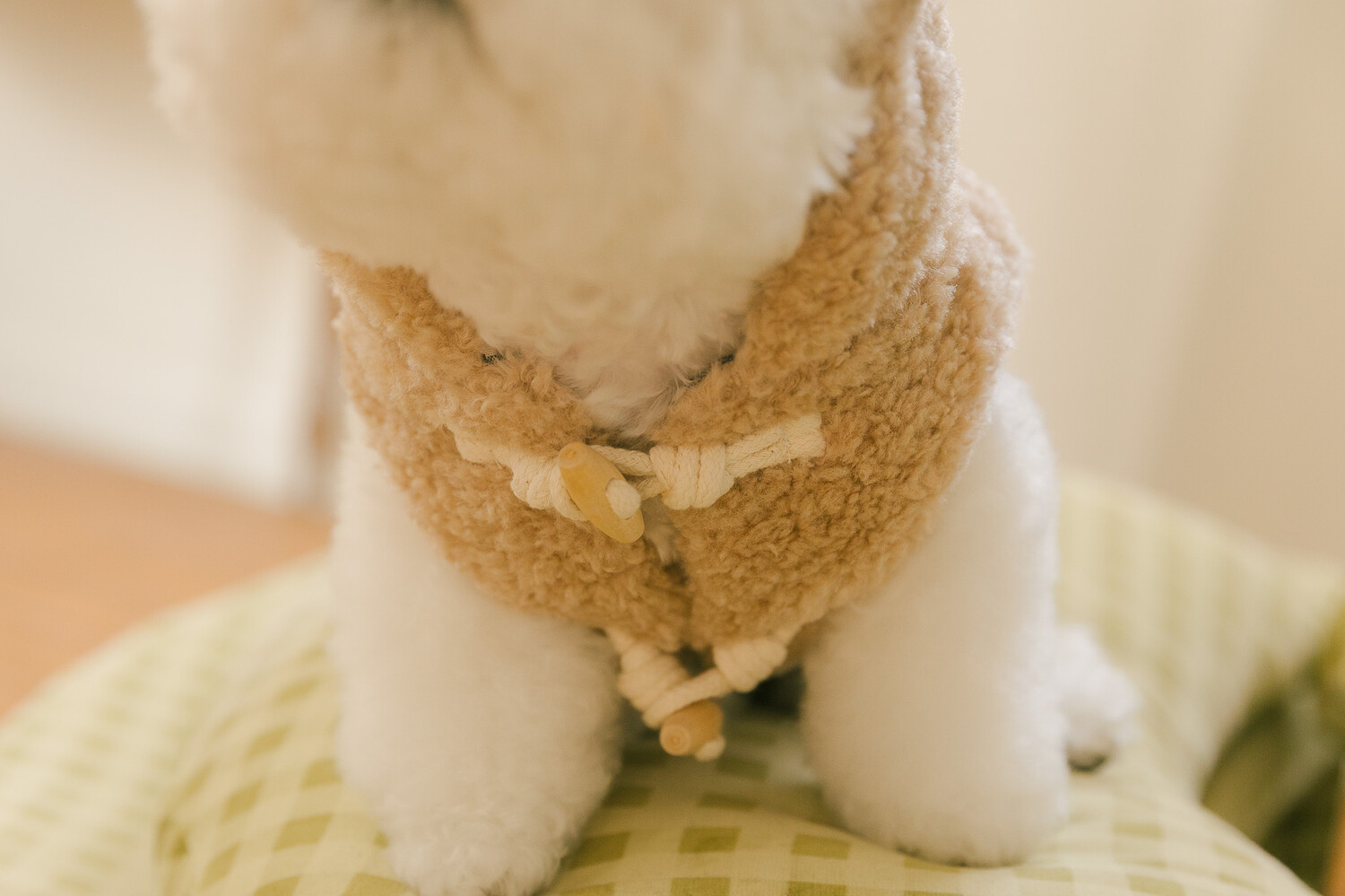 털 빠짐과 보풀 걱정 없는 부드러운 고급 부클 원단에 고방 체크 안감과 4온스 솜 본딩을 더해 겨울에도 따뜻하고 포근한 착용감을 전합니다. 토글 단추로 포인트를 주어 겨울 아우터 특유의 코지한 분위기를 살렸으며, 후드의 곰돌이 귀 디테일이 입는 순간 사랑스러운 실루엣을 완성합니다. 탈부착 가능한 리본 브로치로 깔끔한 연출부터 깜찍한 포인트 스타일까지 자유롭게 연출할 수 있고, 겨울 산책 시 하네스 위에 간편하게 착용할 수 있도록 등판에는 리드홀 디테일을 적용해 실용성까지 고려했습니다.