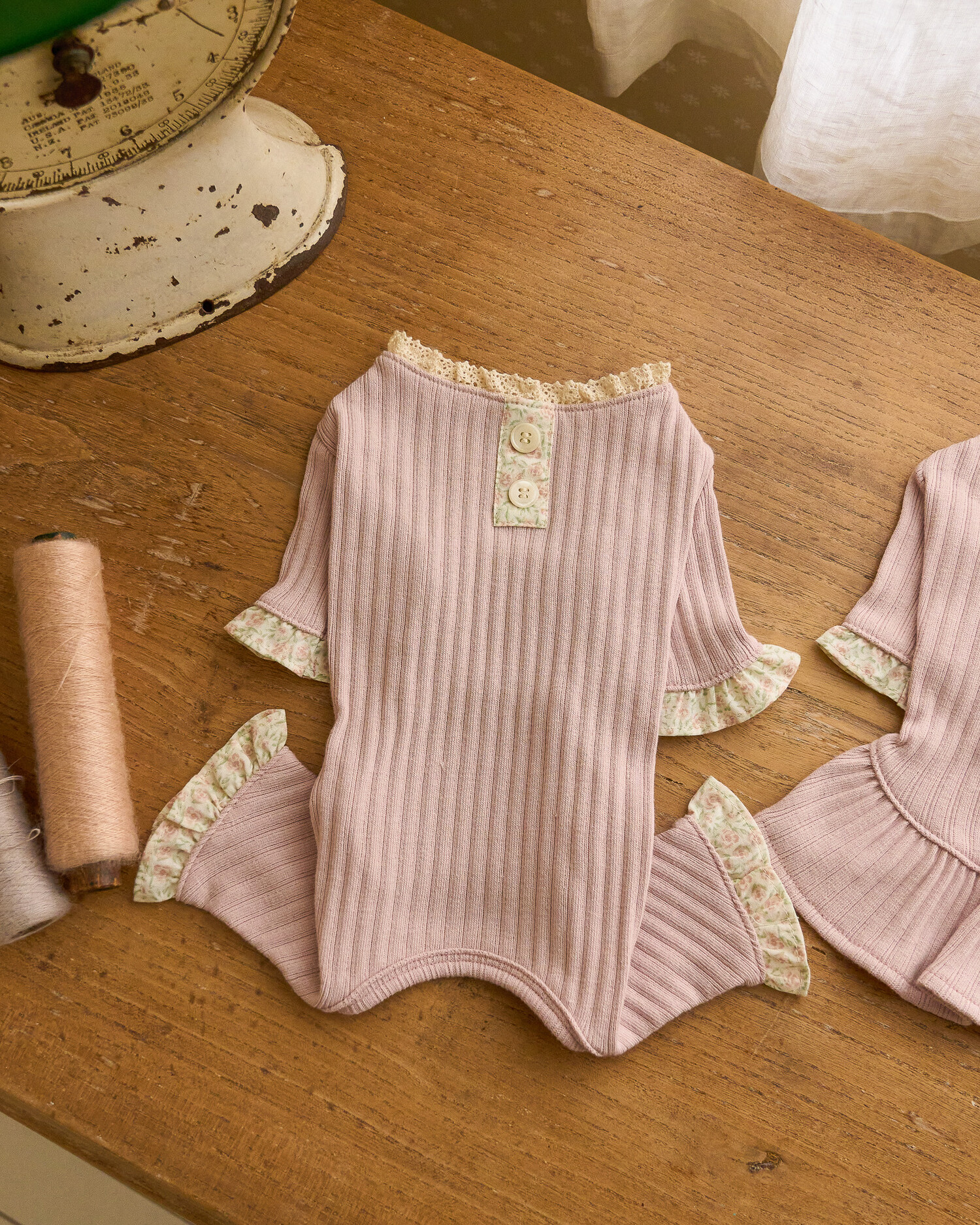 소매와 다리,등에는 플라워 프릴단과 단추 단으로 포인트를 주어