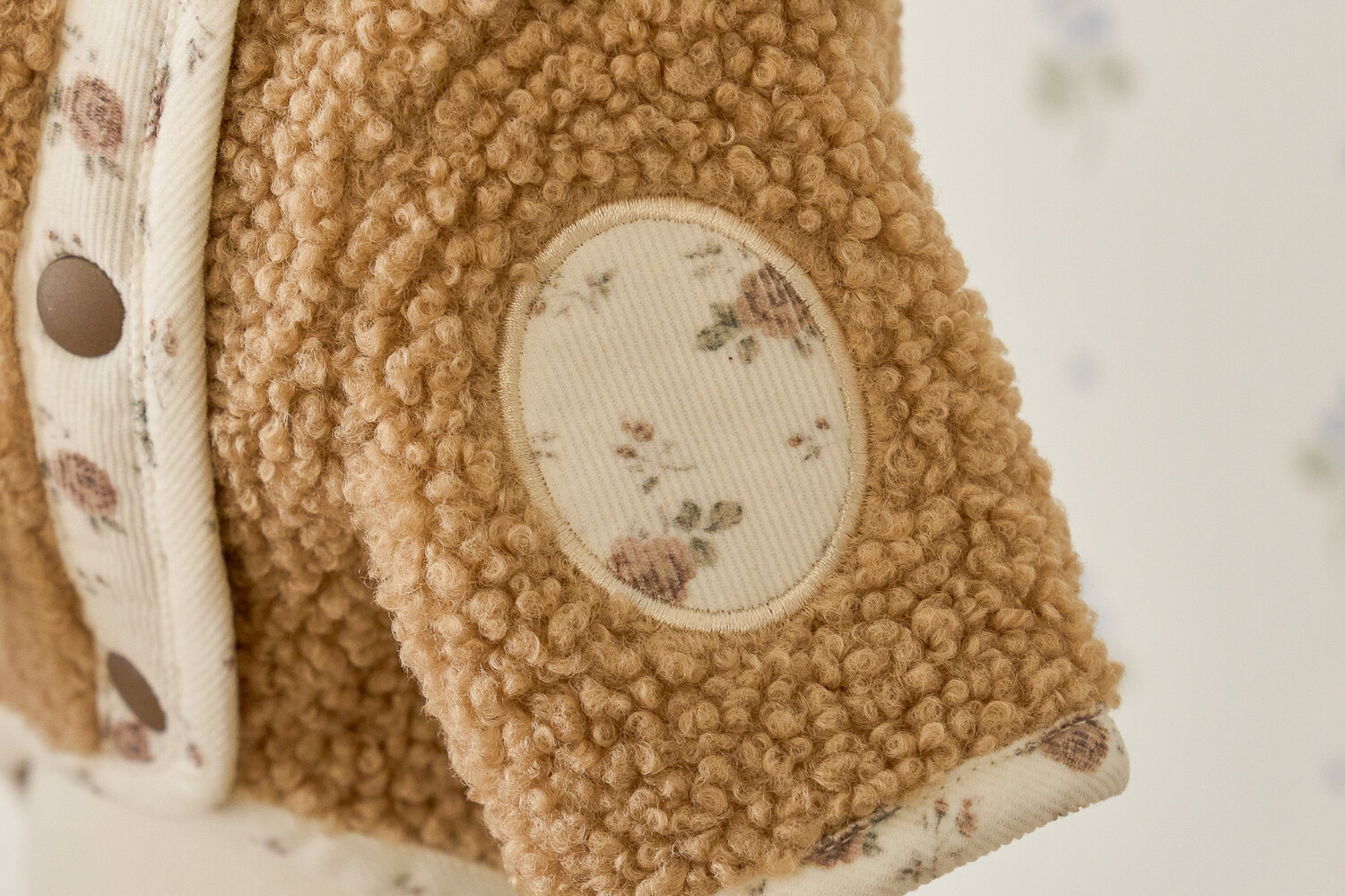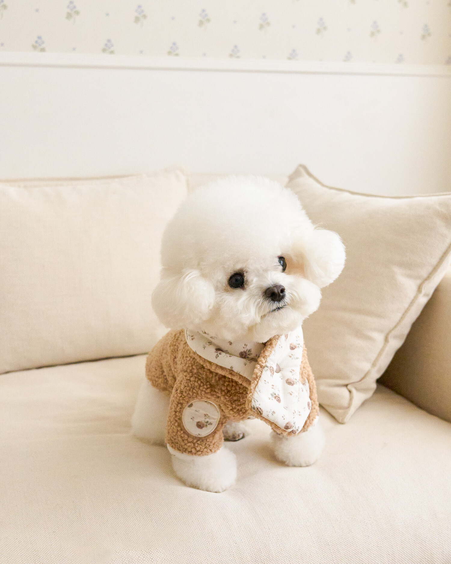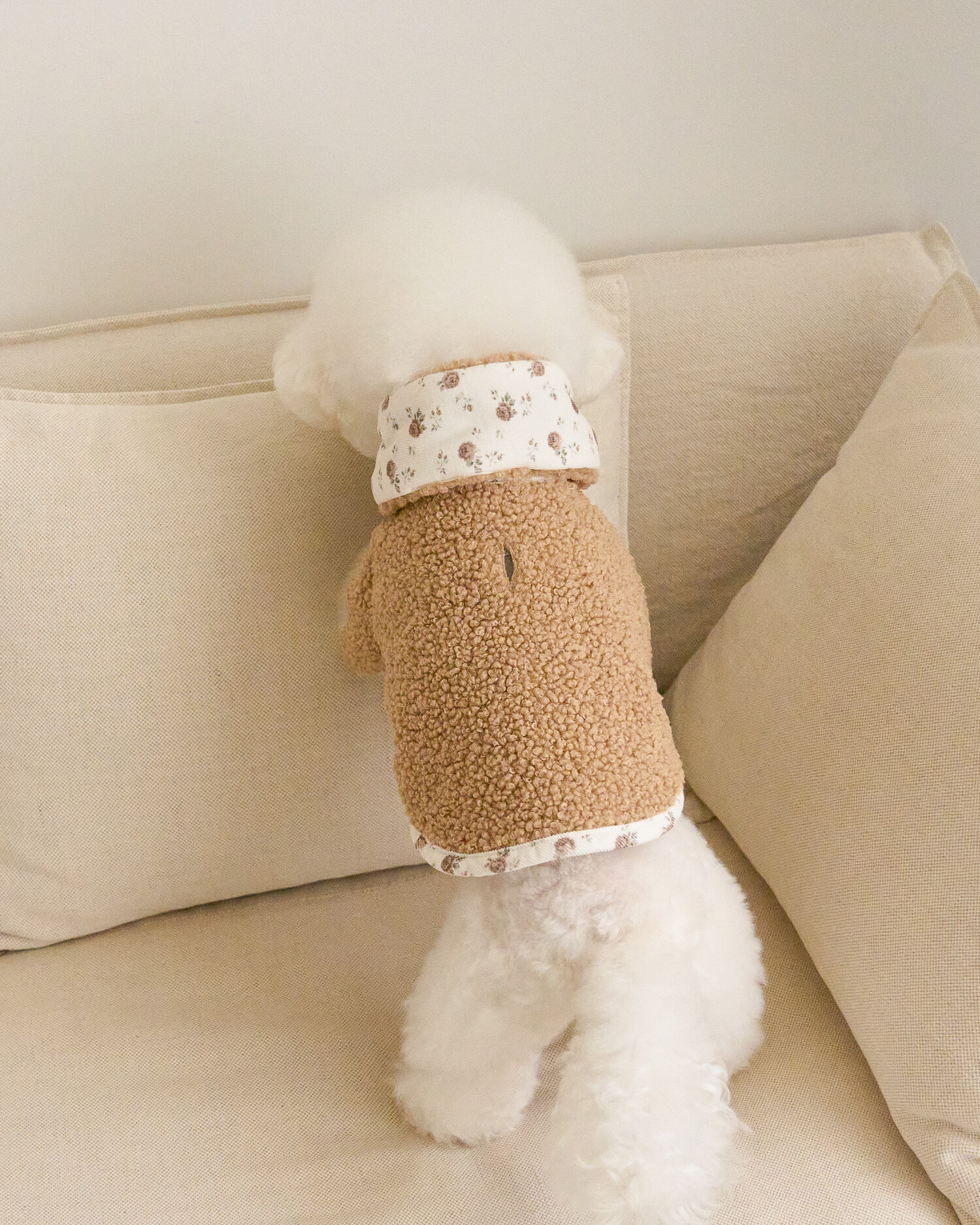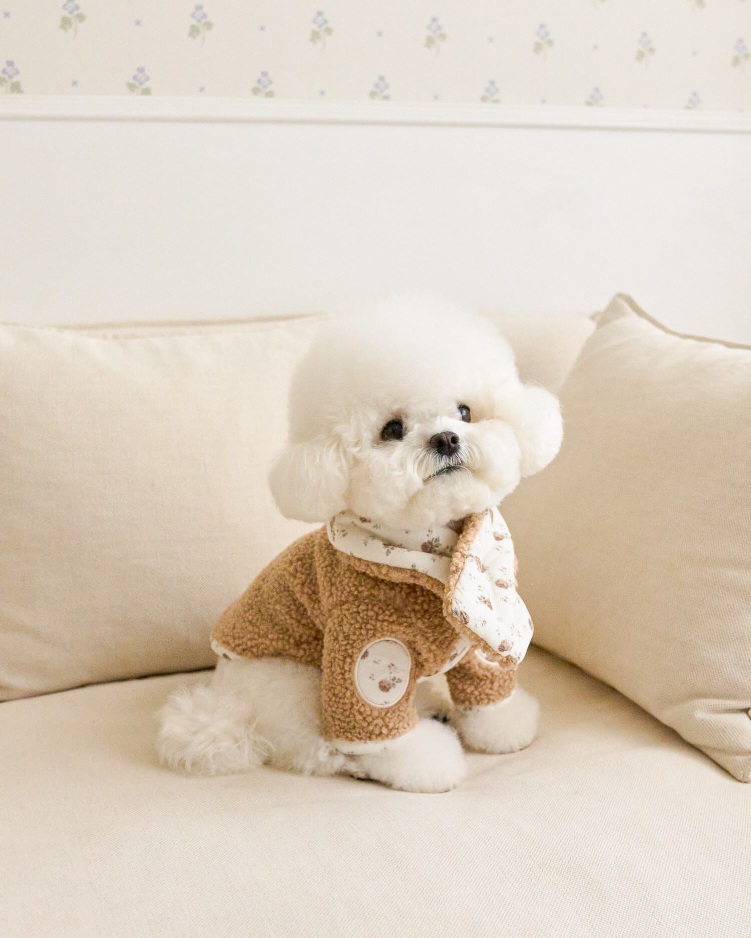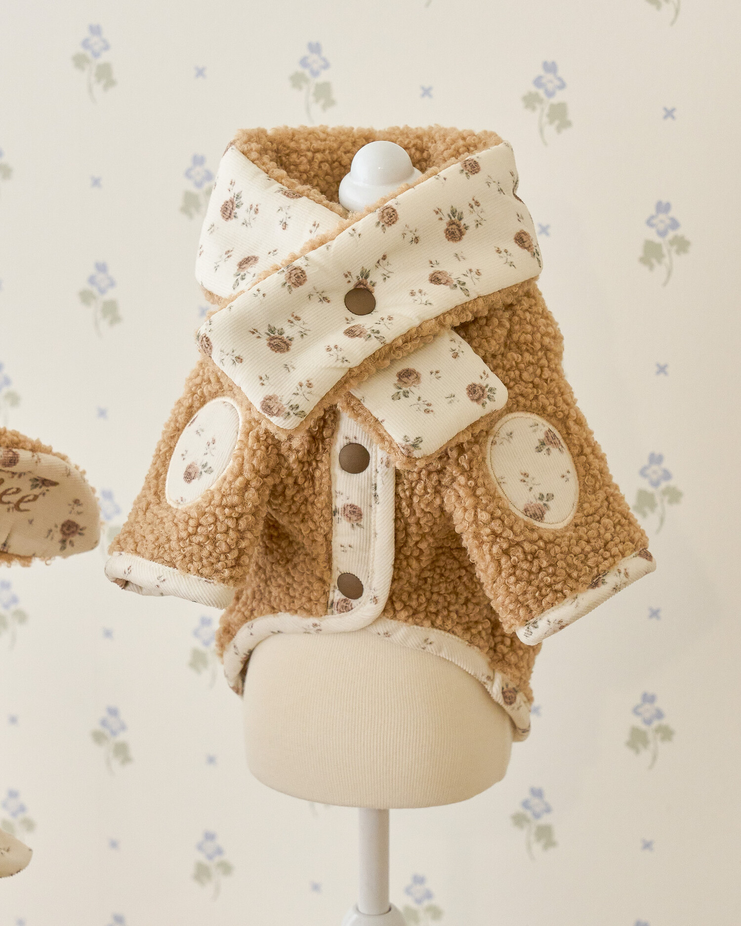 포근한 코듀로이 플라워 패턴으로 소매 패치 자수와 전체적인 배색 포인트를 주어,