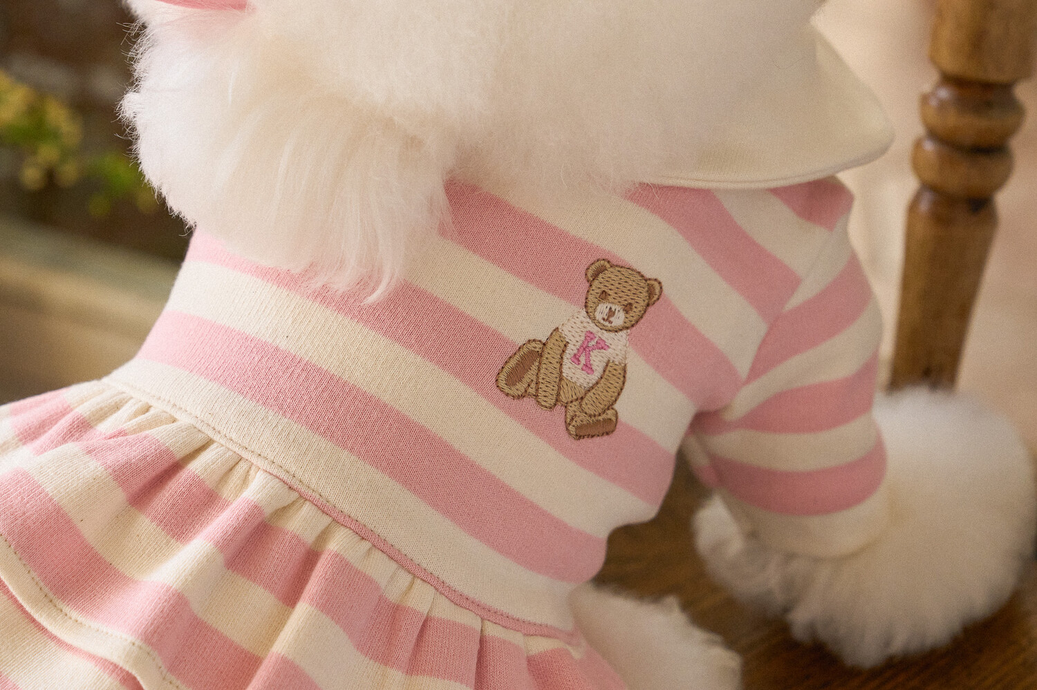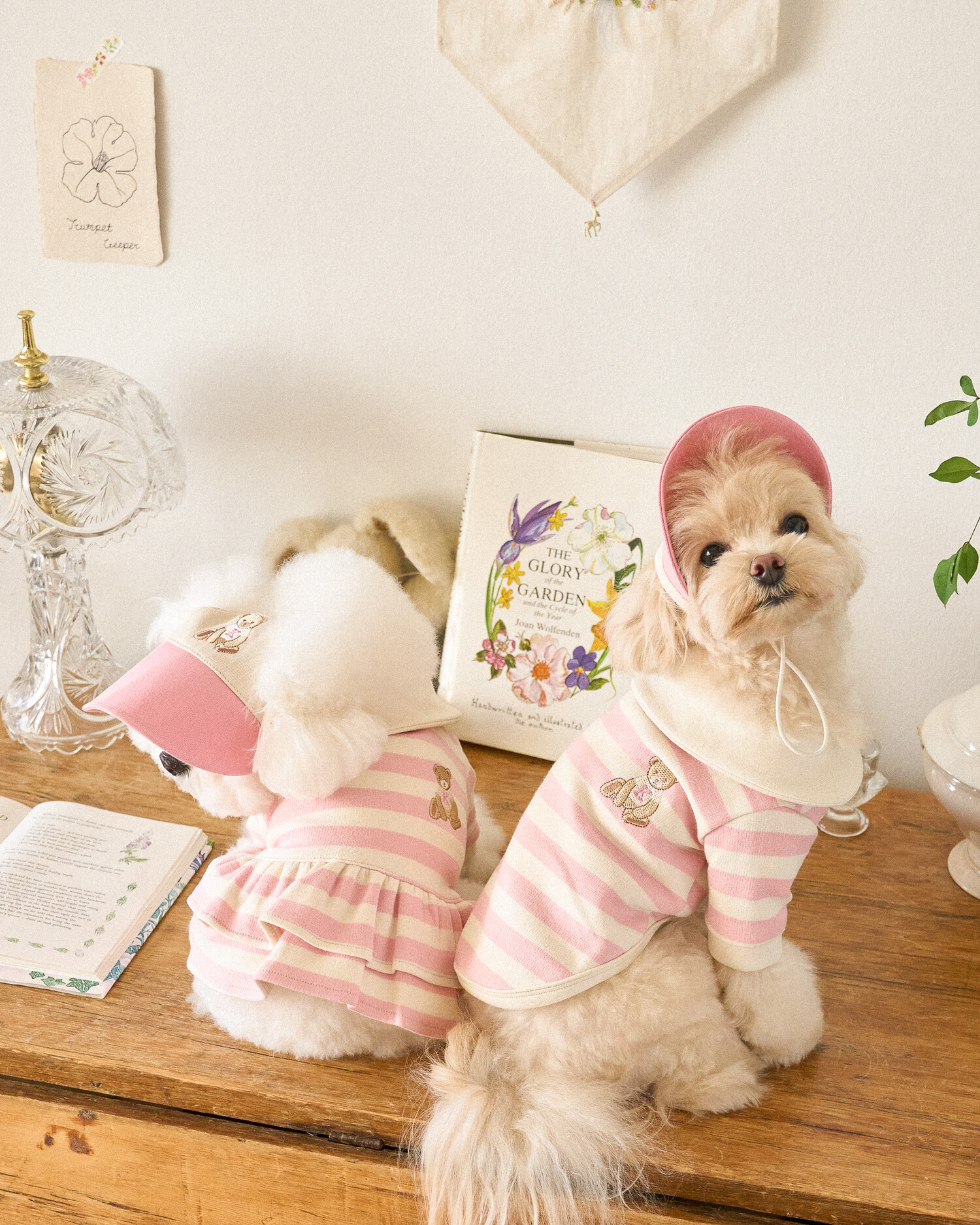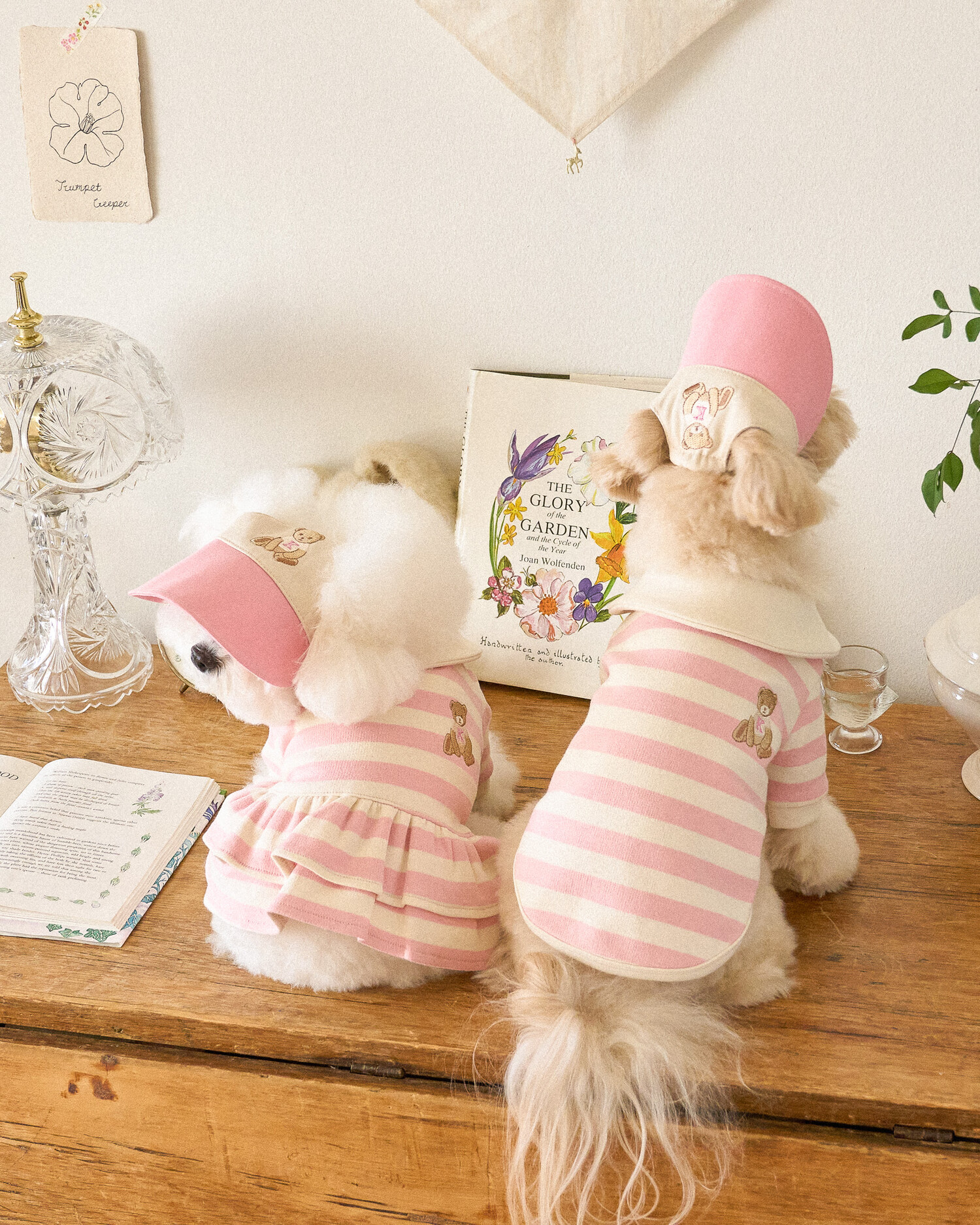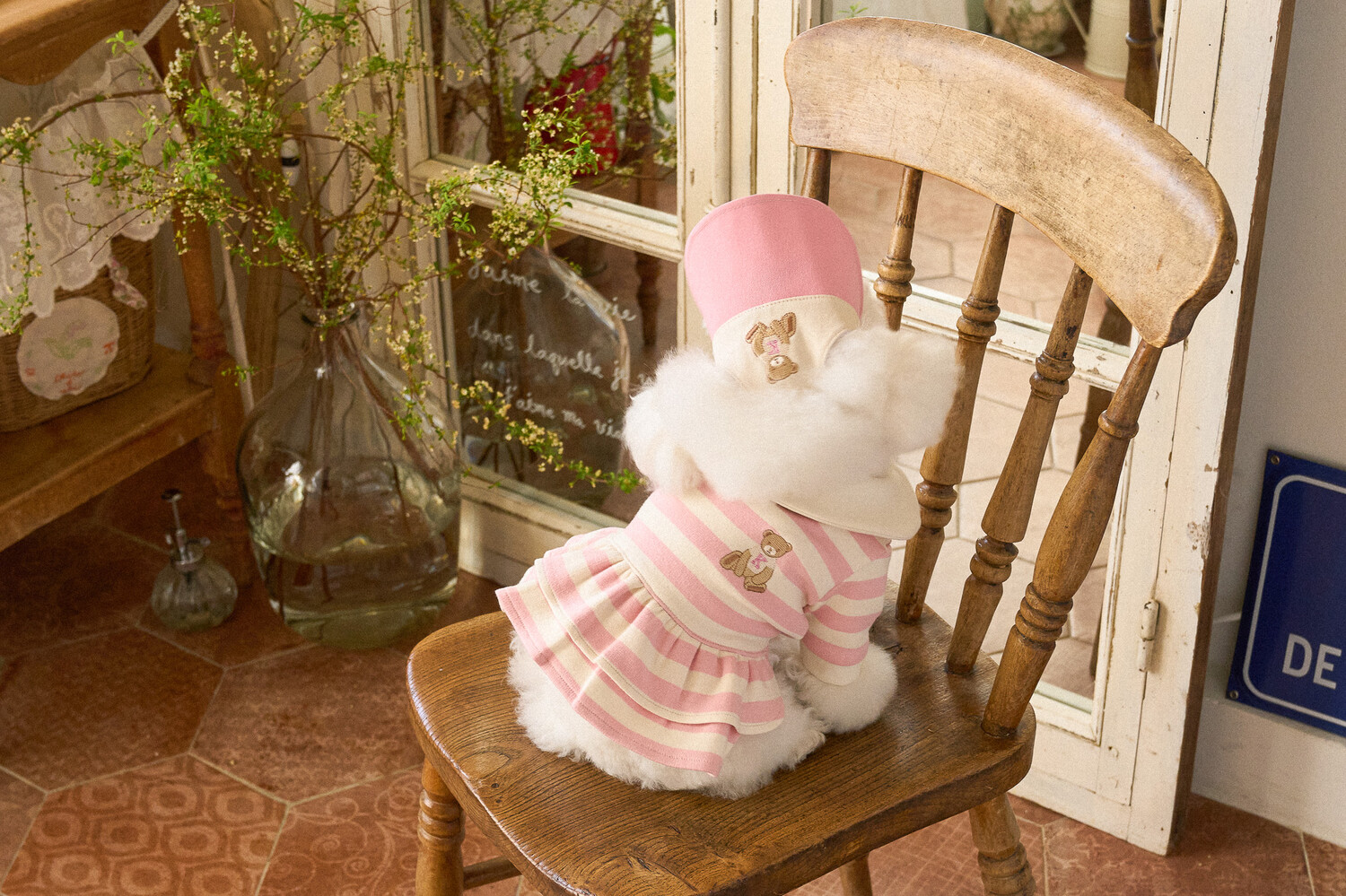완벽한 ‘꾸안꾸’룩의 정석! 키키앤니니의 코지한 무드가 담긴, ’고미 단가라 원피스‘를 소개합니다 유행을 타지 않고 즐길 수 있는 스트라이프 패턴 위에, 귀여움이 마구마구 상승하는 키키앤니니 시그니처 곰돌이 자수로 포인트를 주었으며, 생크림 한 방울 떨어트린 듯 부드러운 파스텔 색감의 핑크/베이지 두 컬러로 만나보실 수 있습니다 매 시즌 휘뚜루마뚜루 꺼내 입기 좋은 데일리템인 만큼! 원단에 특히 신경을 많이 썼는데요! 적당한 두께감의 탄탄하면서 부드러운 코튼 소재로, 늘어짐 및 변형이 적어 오랫동안 높은 퀄리티로 함께하시기 좋으실 거에요♥ 패턴 또한, 단순해 보이지만, 입었을 때 가장 예쁘게 떨어지는 핏 감을 찾기 위해 여러 번의 샘플링 작업을 걸쳐 나온 패턴이라 입혀보시면 더욱 만족하실 것 같습니다! 타입은, 티셔츠&원피스 2타입으로 제작되어, 남매룩 또는 친구들과 댕플룩으로도 너무 추천드리는 제픔이며, 함께 출시된 ‘캡 모자’와 함께 하시면, 당장이라도 소풍 가야 할 것만 같은 봄 소풍룩이 완성된답니다♥