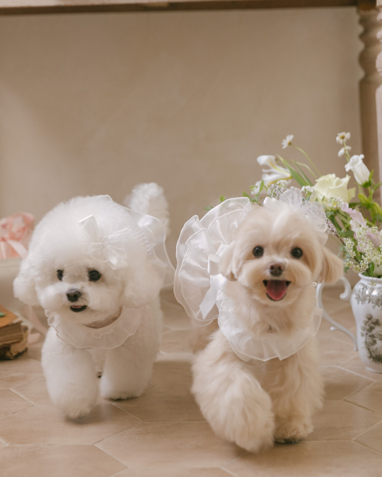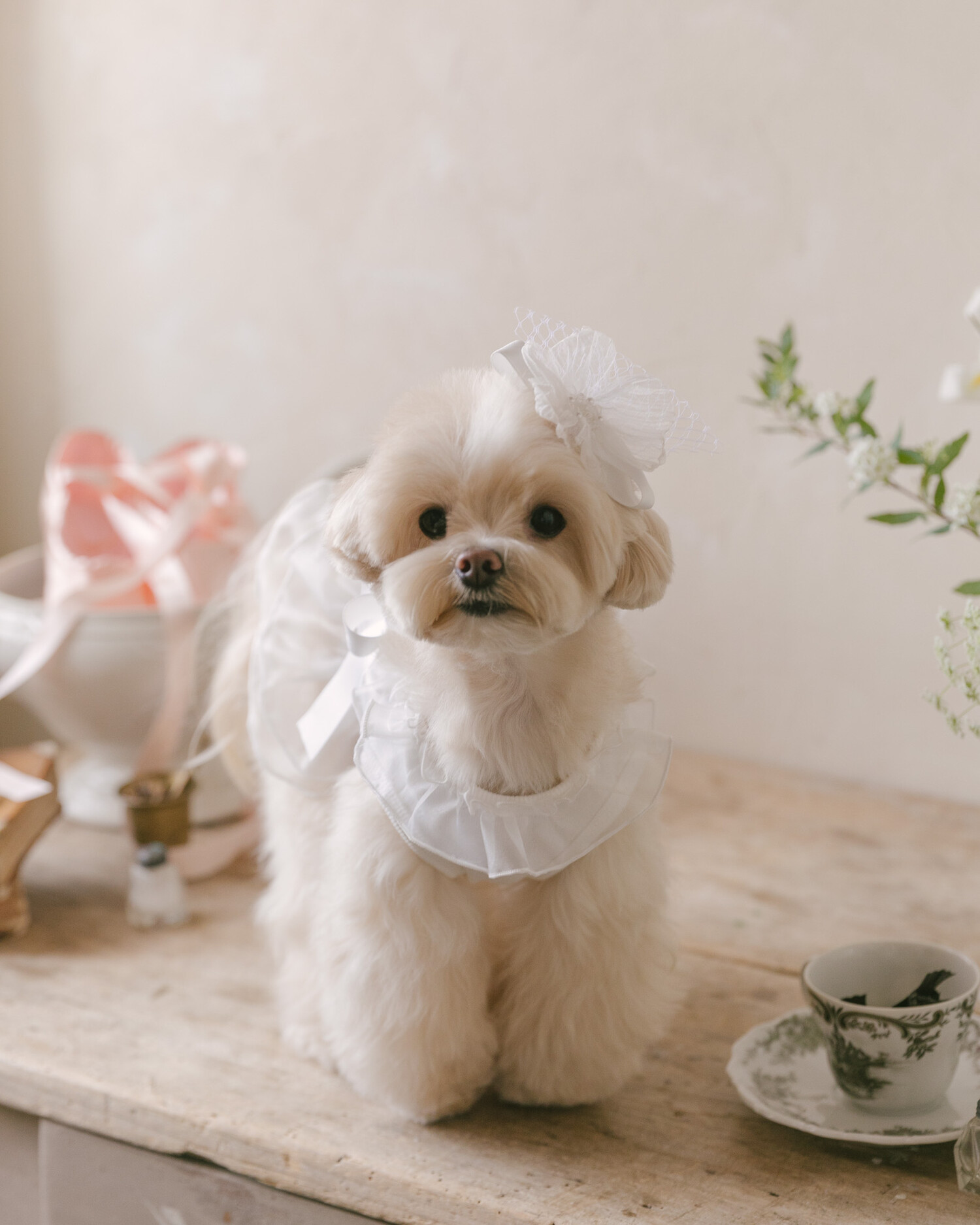 웨딩시즌에 맞춰 화동룩으로도 예쁘게 입히실 수 있게 베일 느낌의 플라워 핀도 함께 준비했습니다