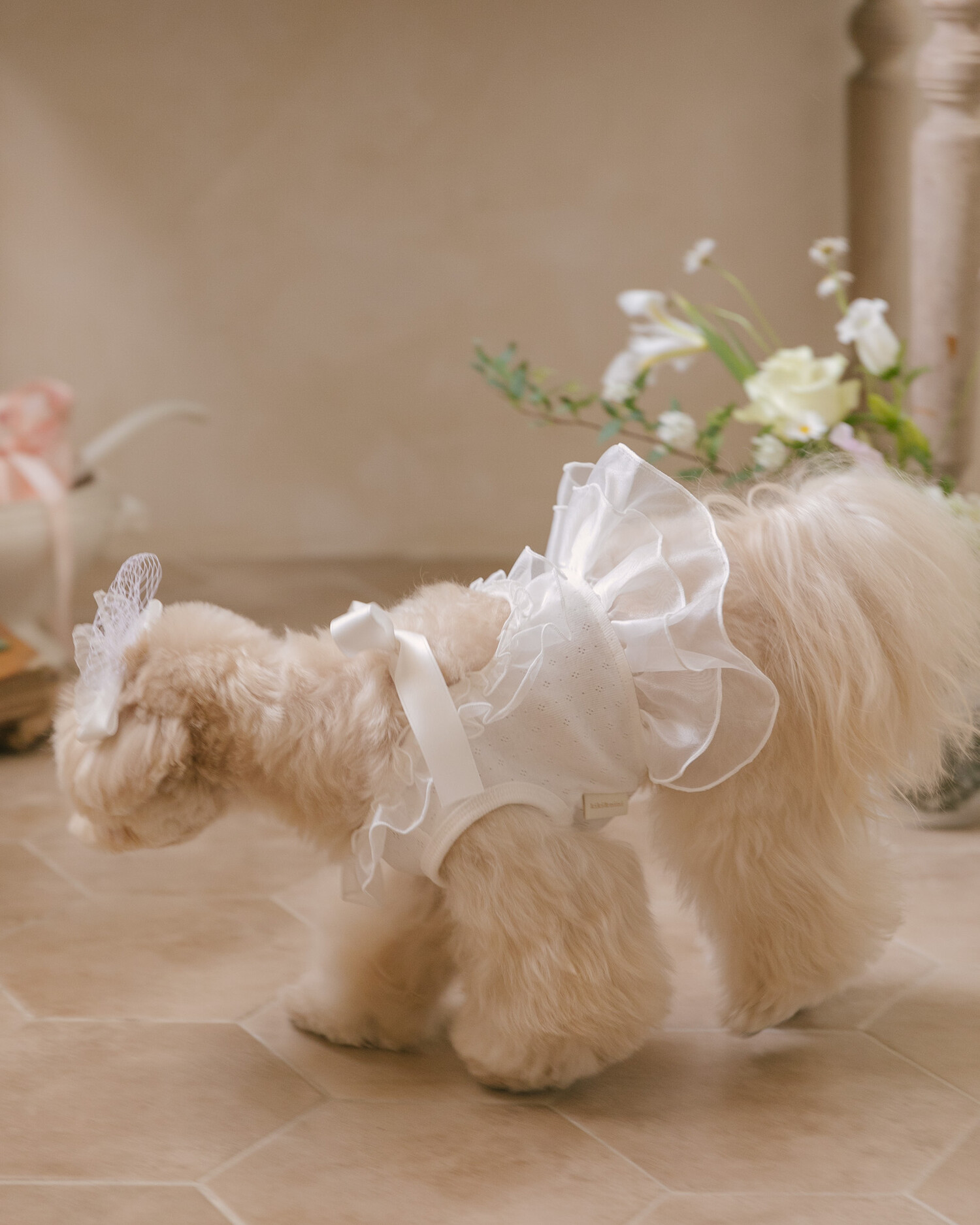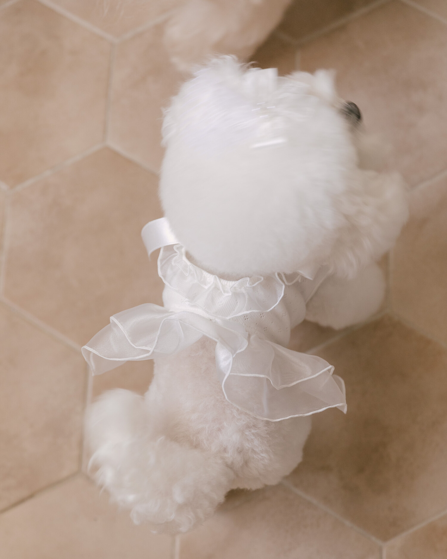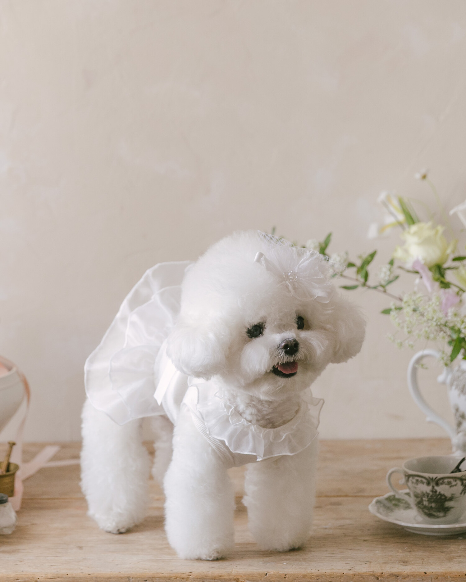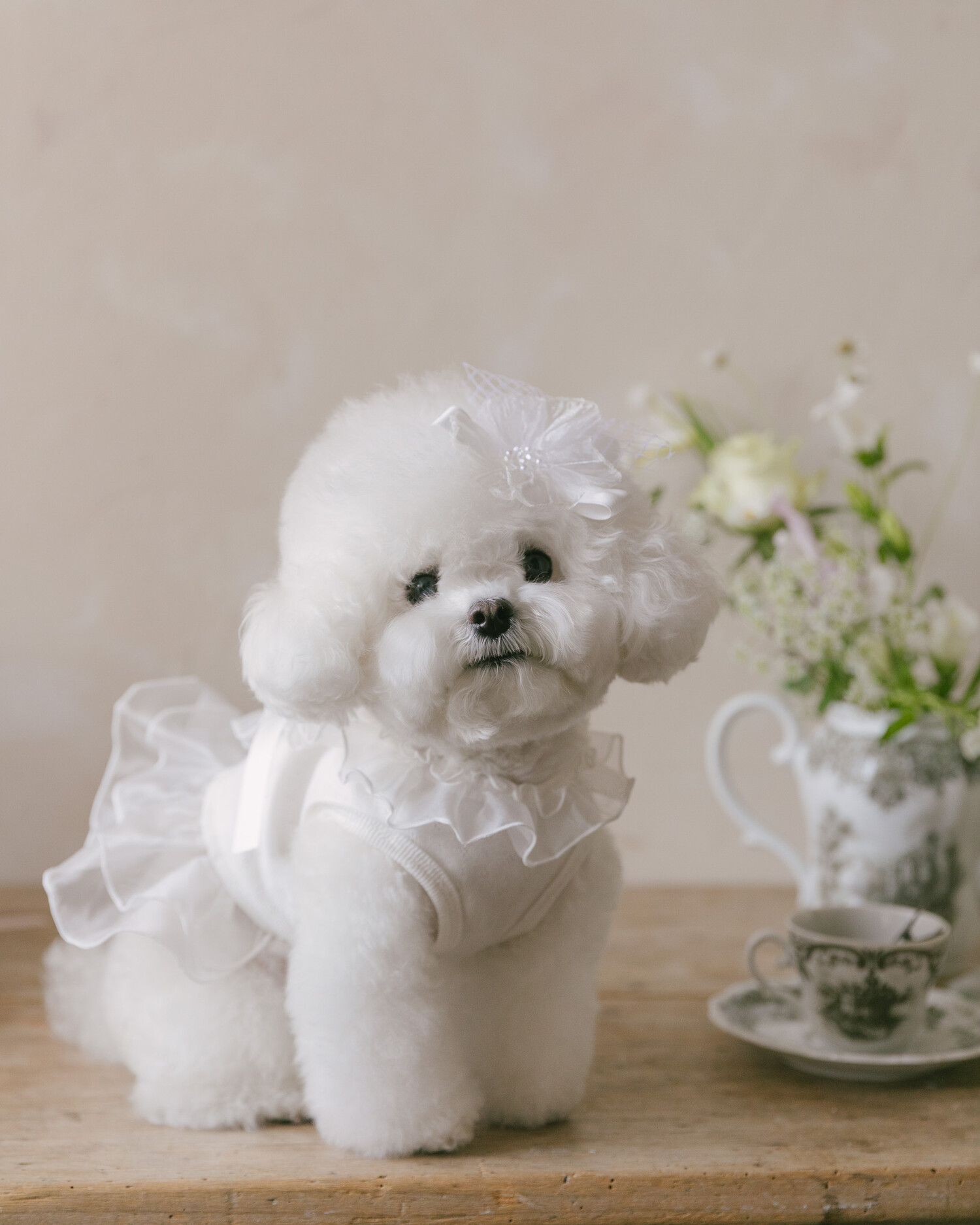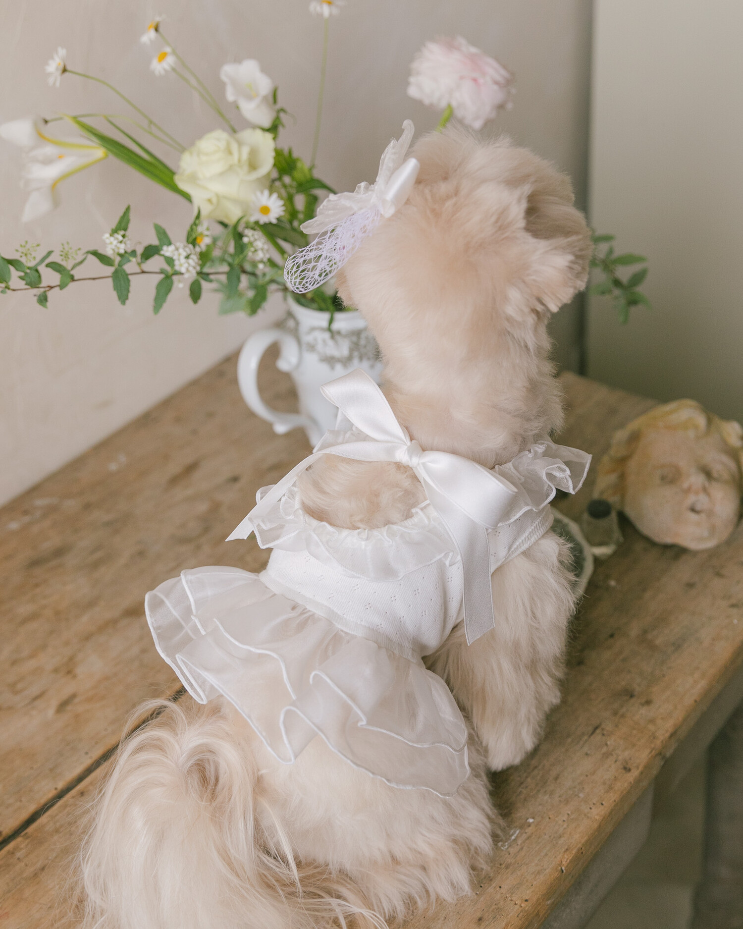 빛에 따라 은은하게 반짝이는 오간자 튜튜, 넥 라인에 프릴 디테일로 러블리함을 한층 더해주었어요