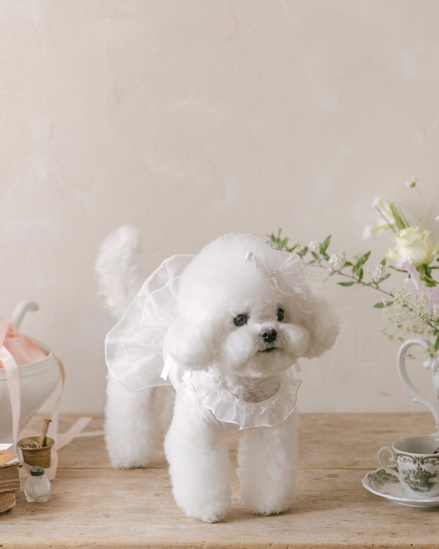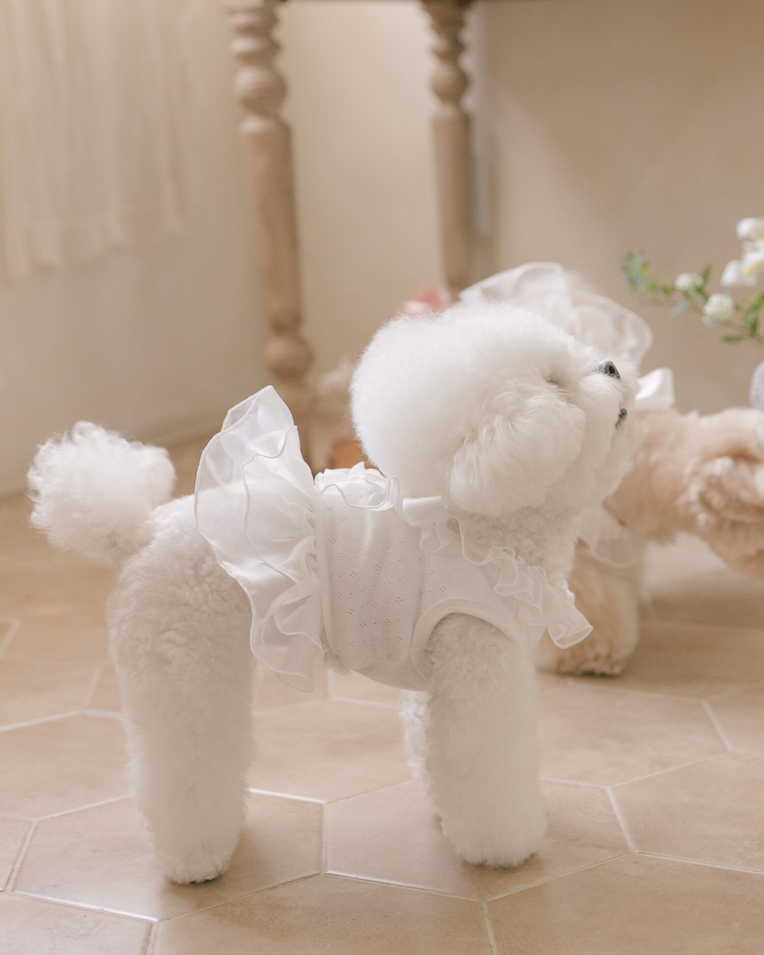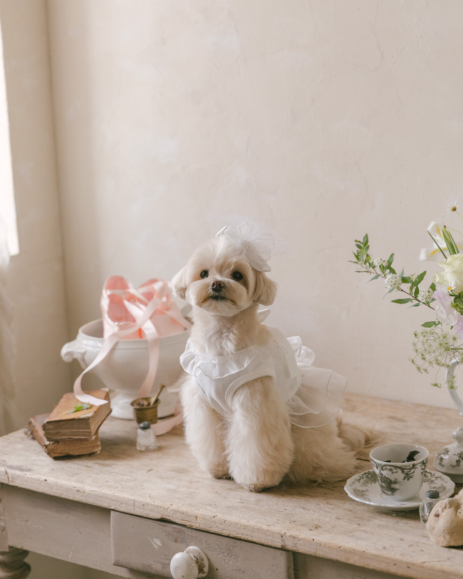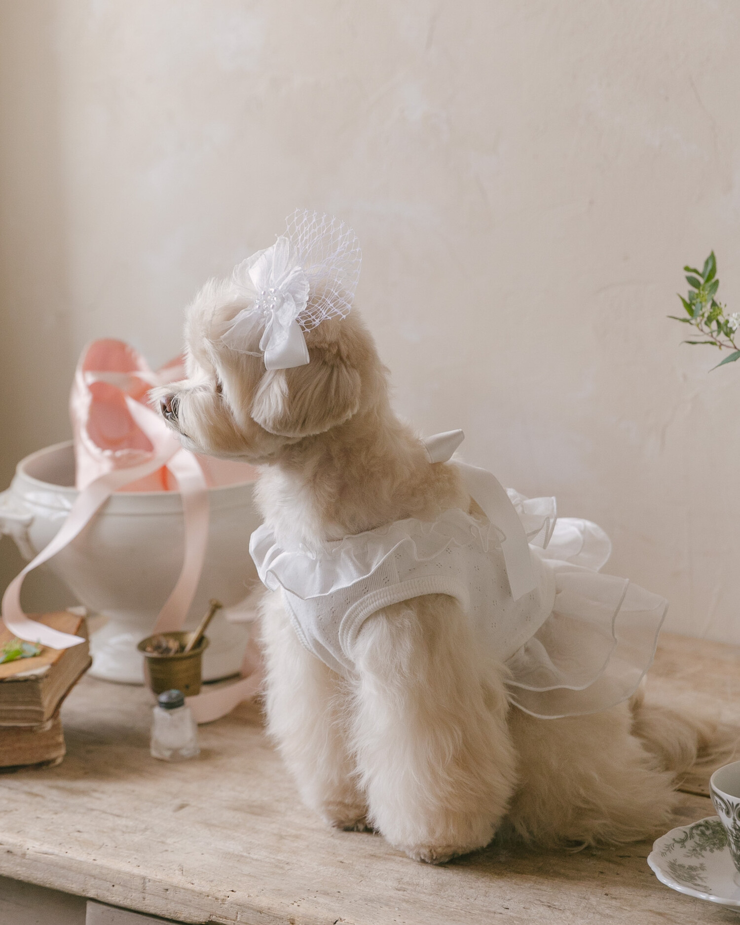 빛에 따라 은은하게 반짝이는 오간자 튜튜, 넥 라인에 프릴 디테일로 러블리함을 한층 더해주었어요