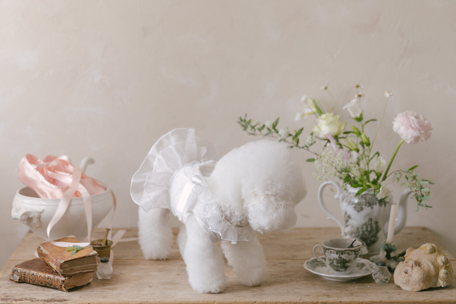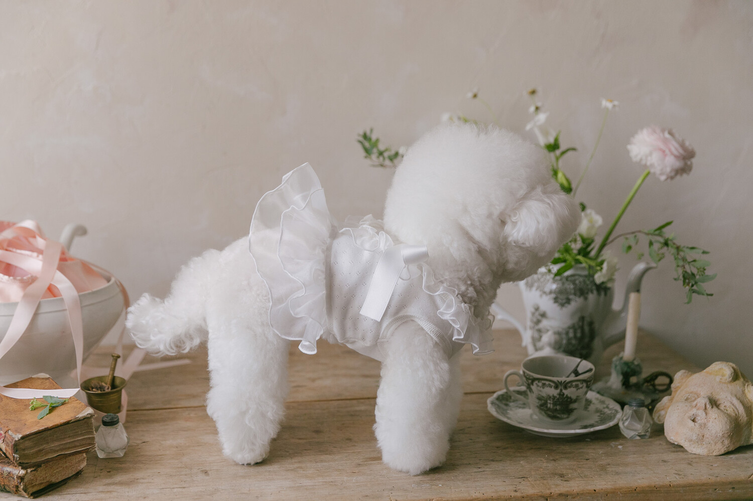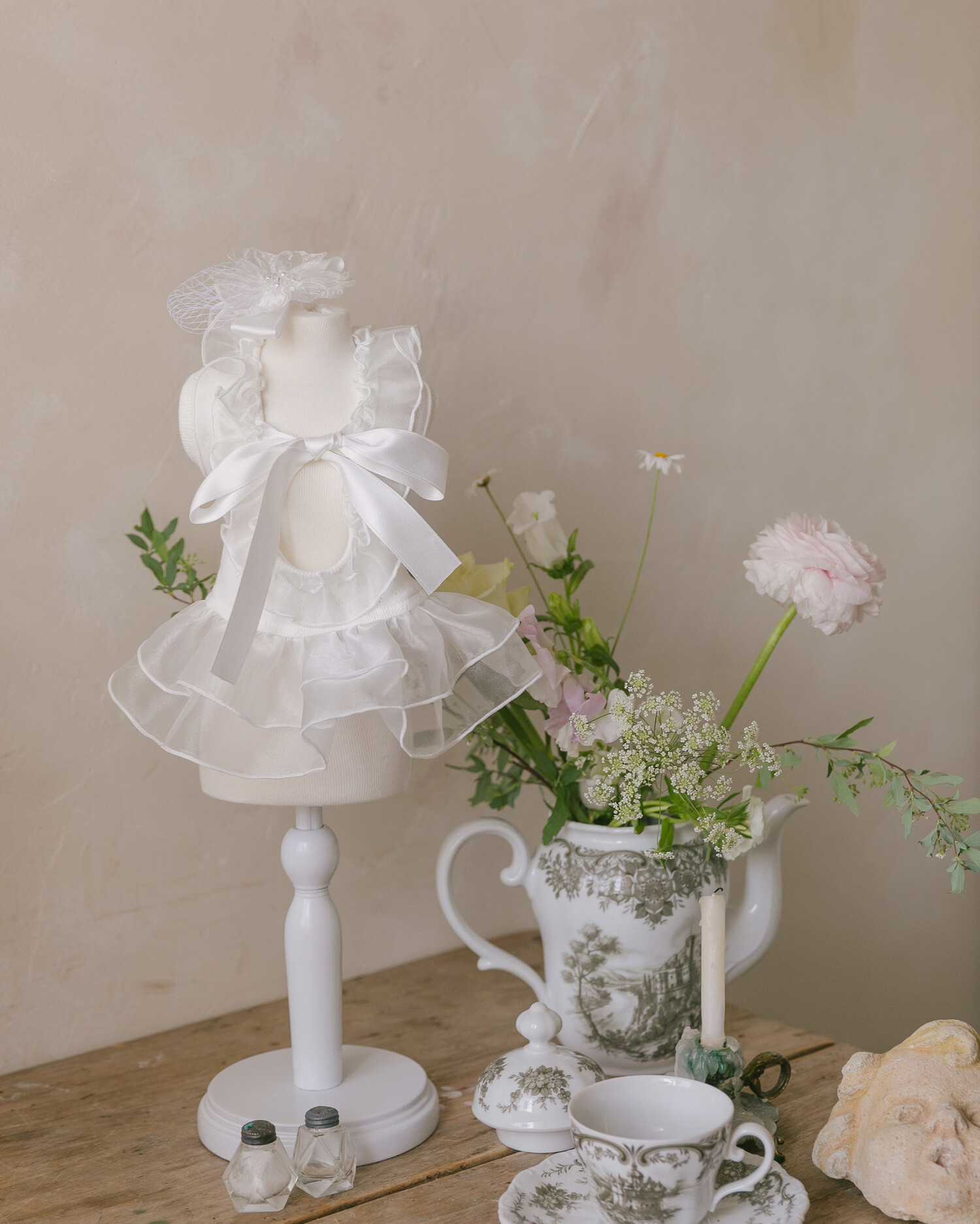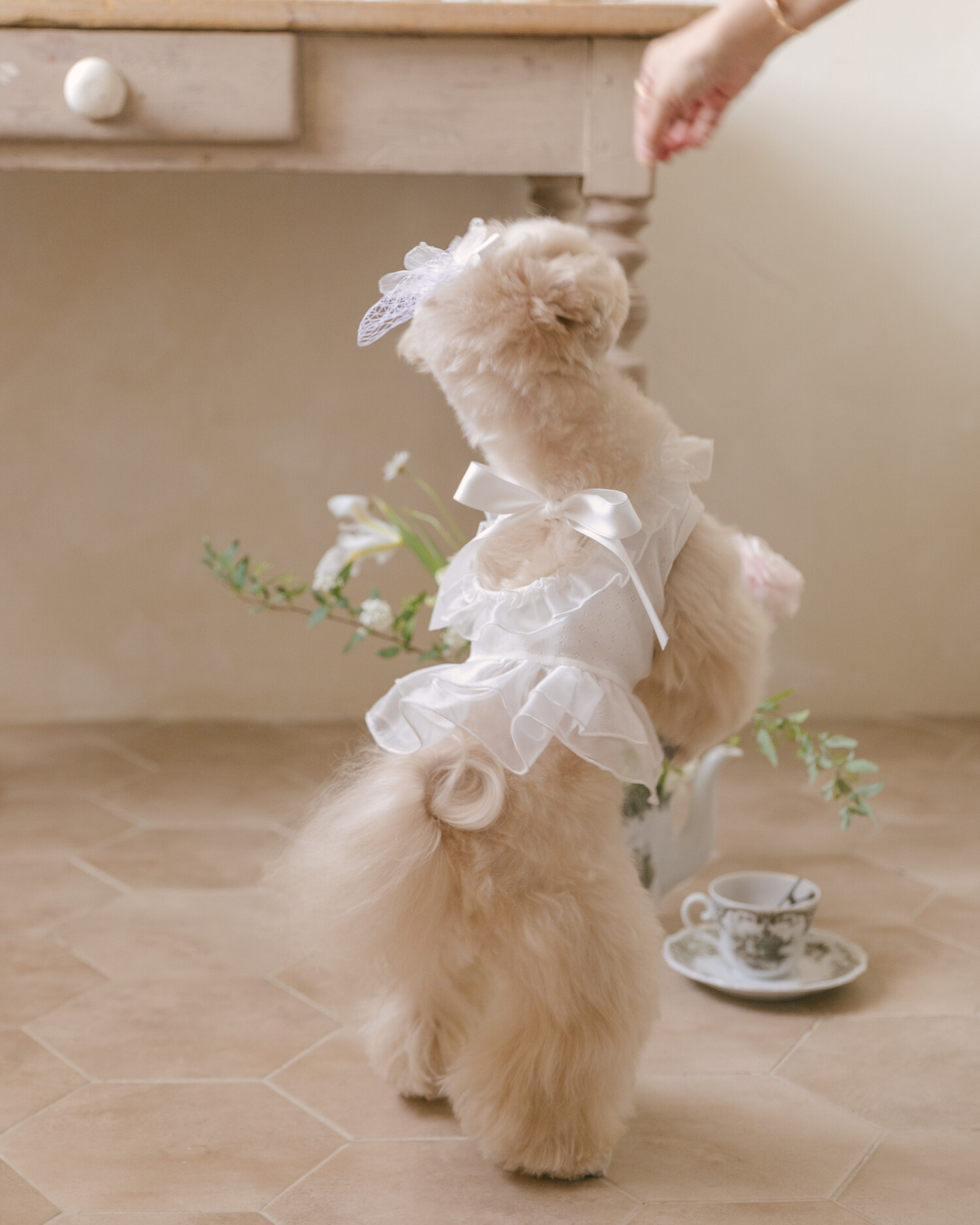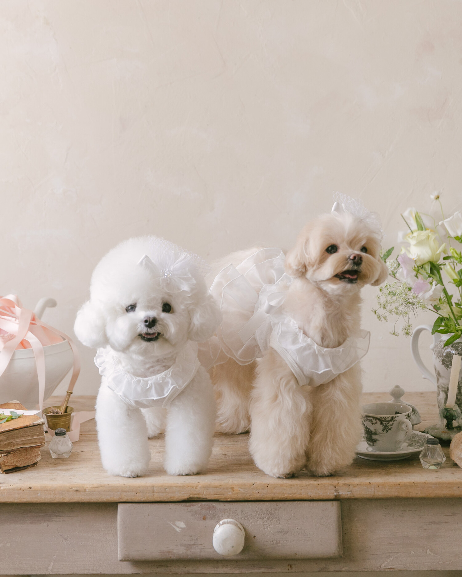 빛에 따라 은은하게 반짝이는 오간자 튜튜, 넥 라인에 프릴 디테일로 러블리함을 한층 더해주었어요