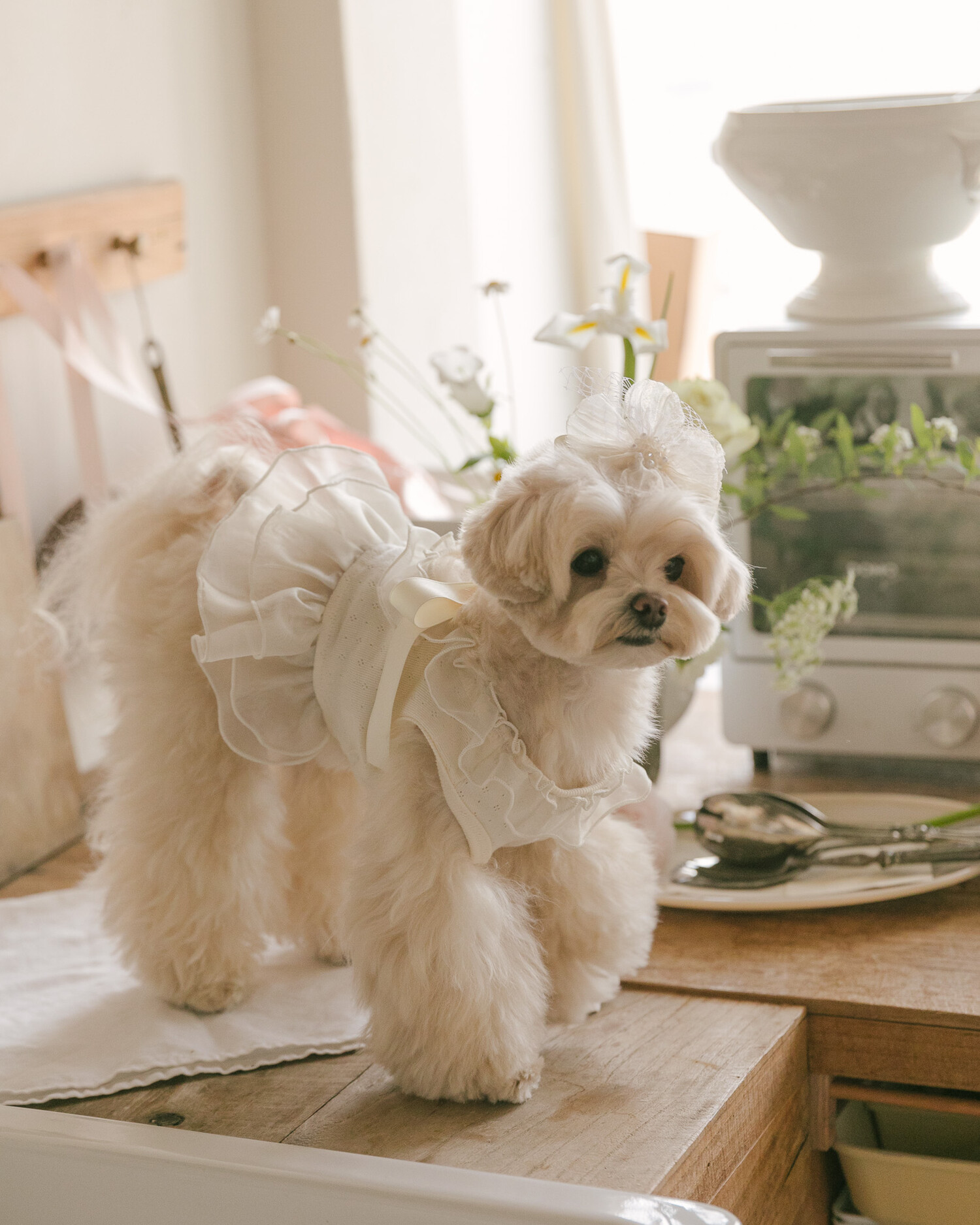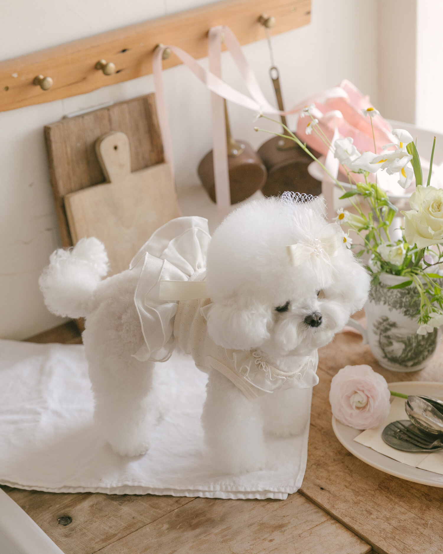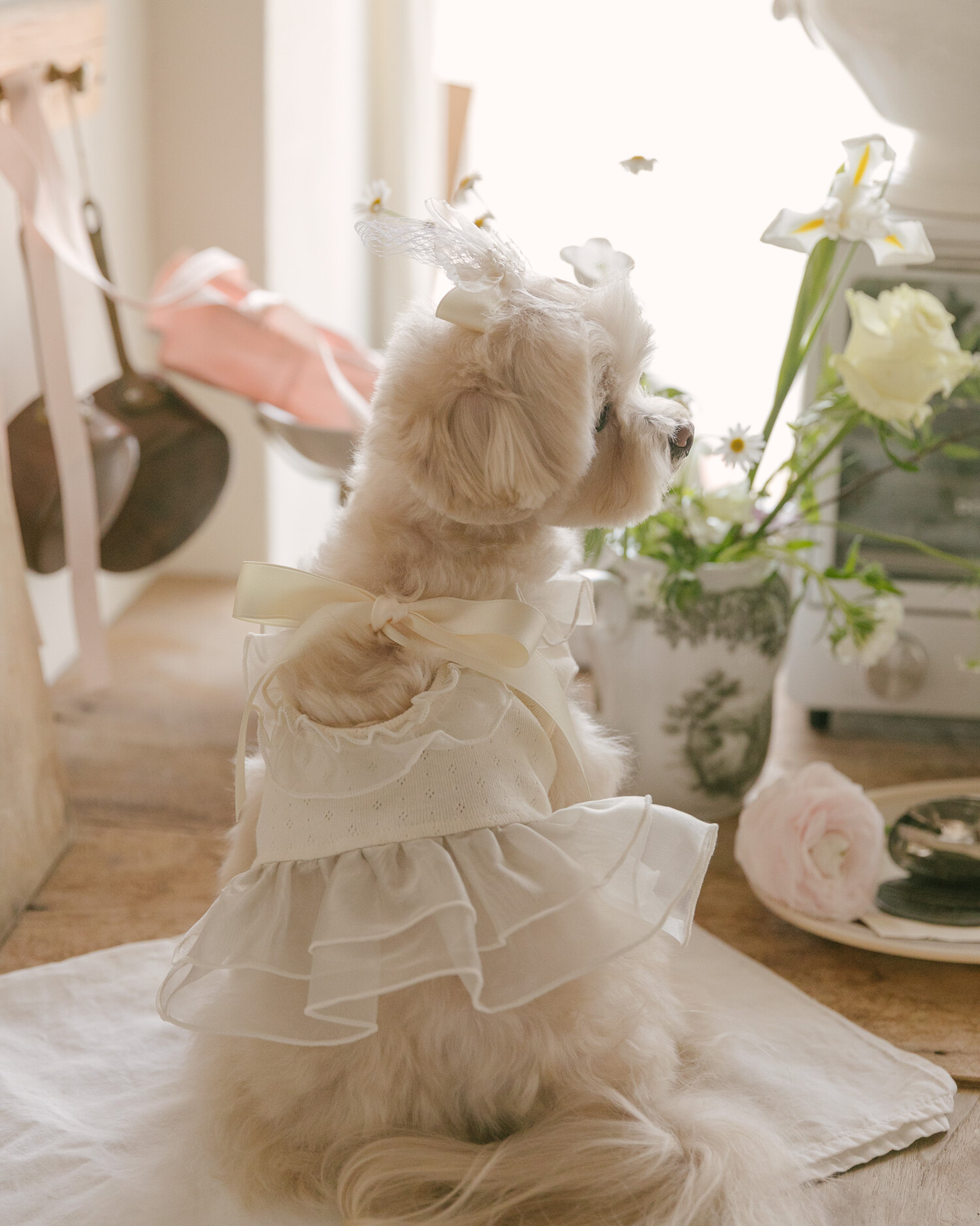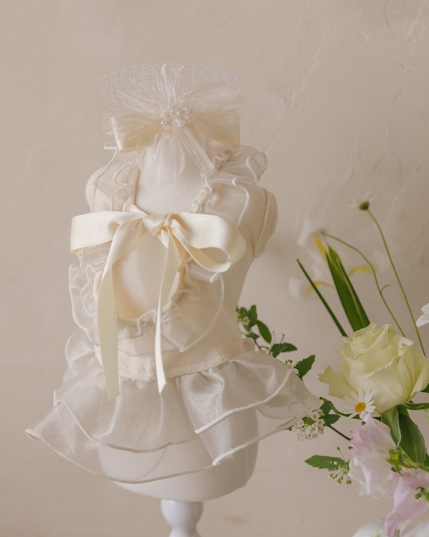 빛에 따라 은은하게 반짝이는 오간자 튜튜, 넥 라인에 프릴 디테일로 러블리함을 한층 더해주었어요