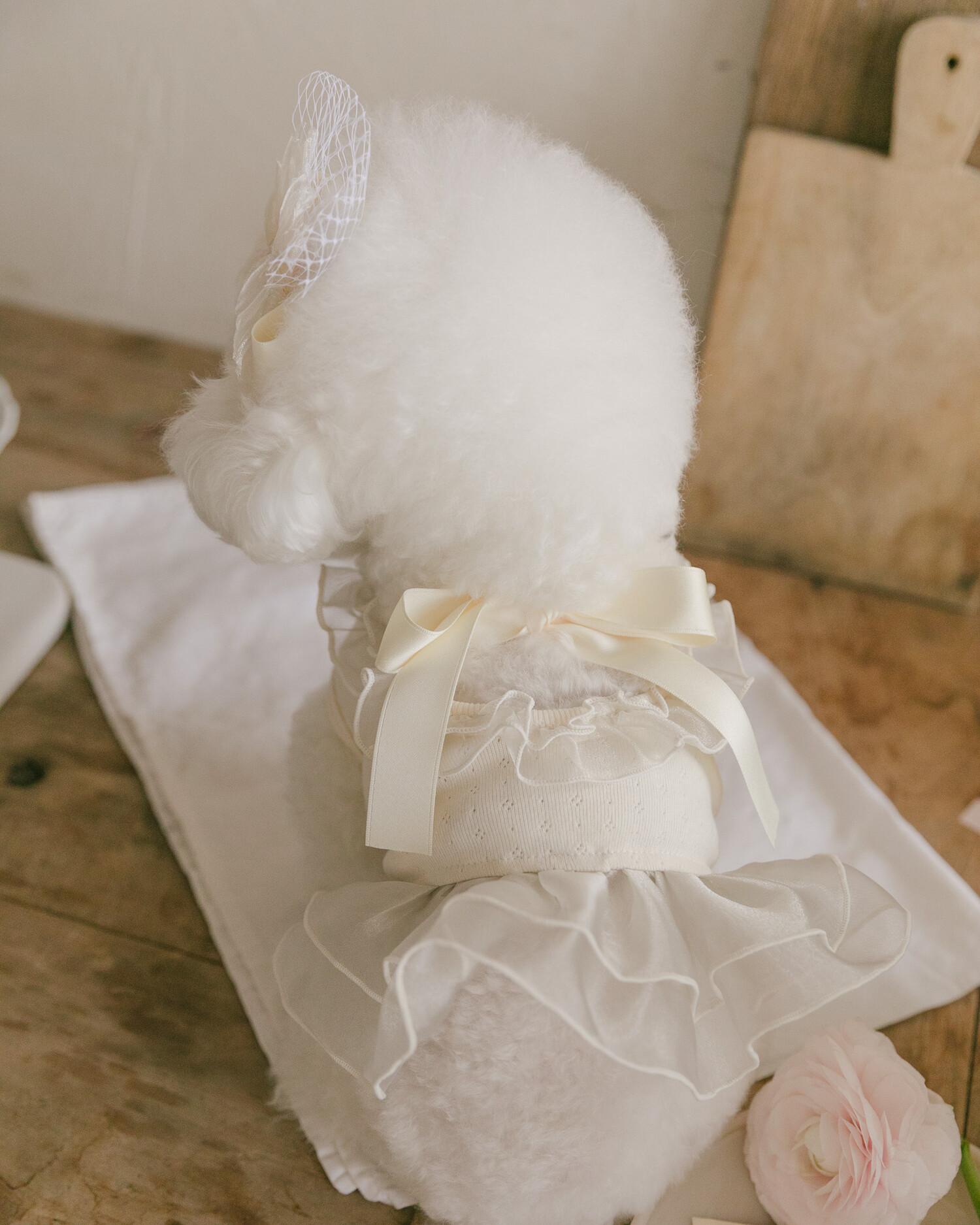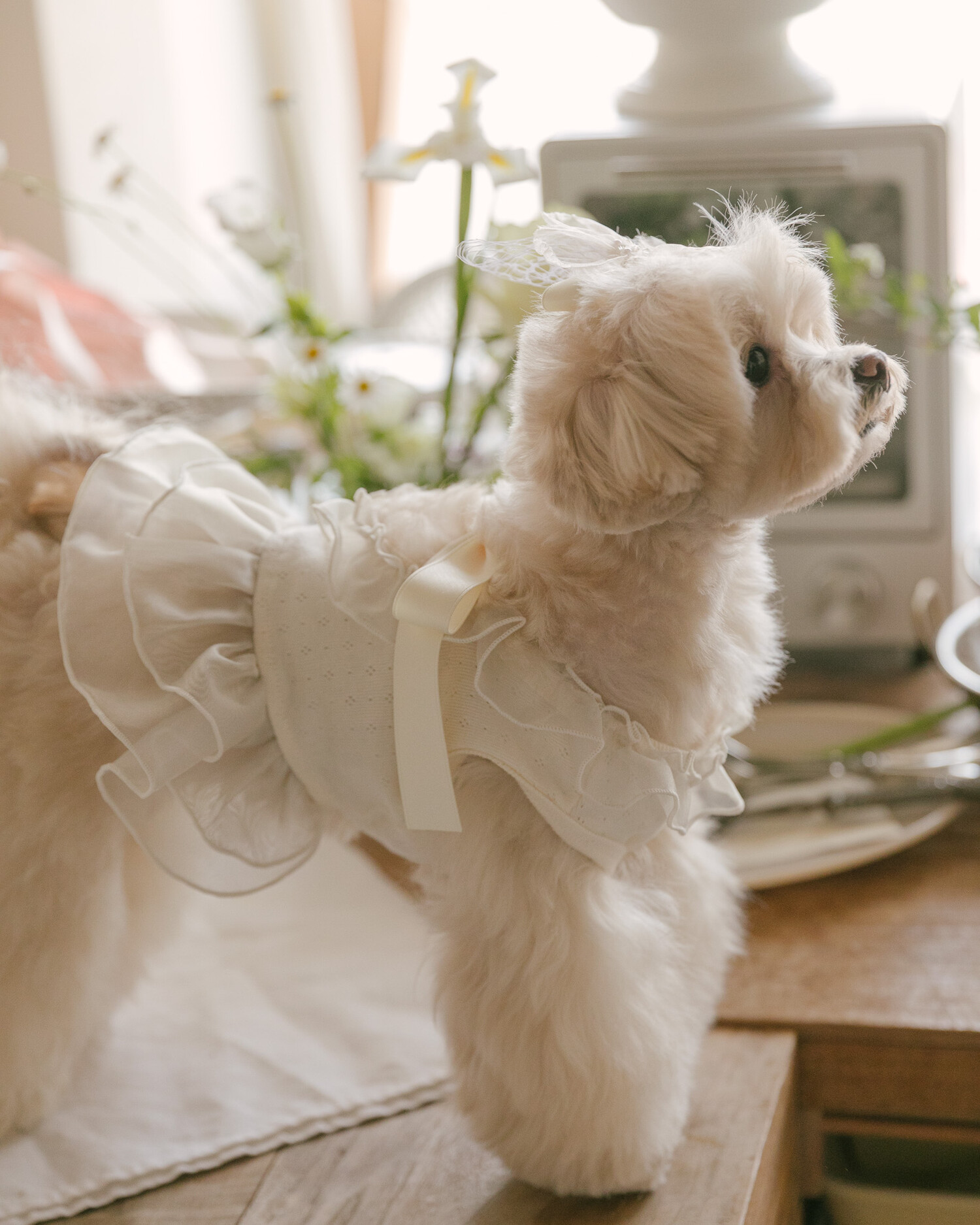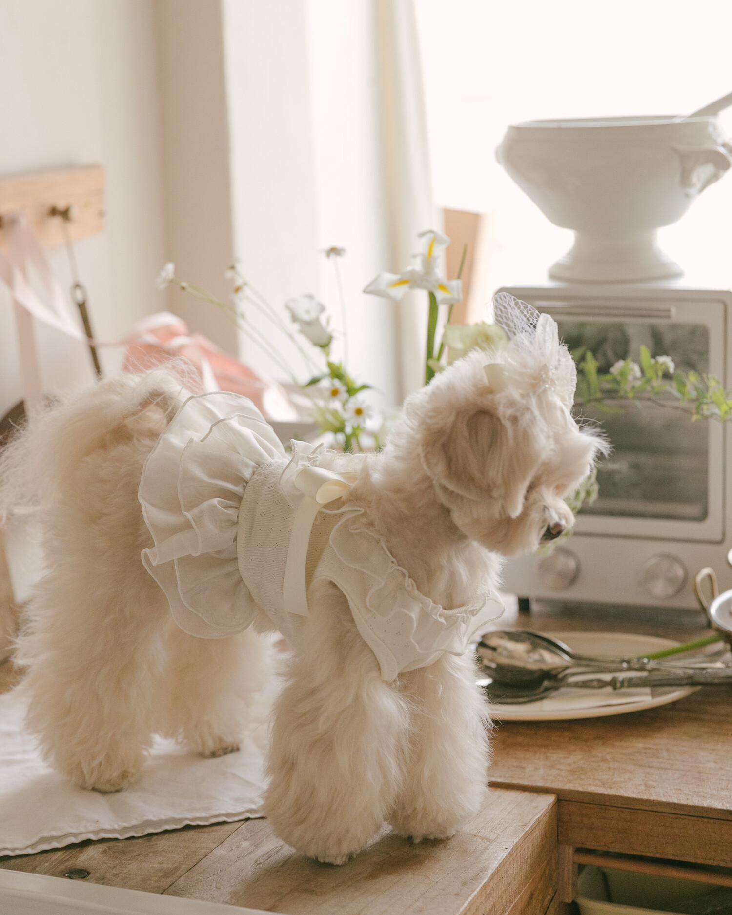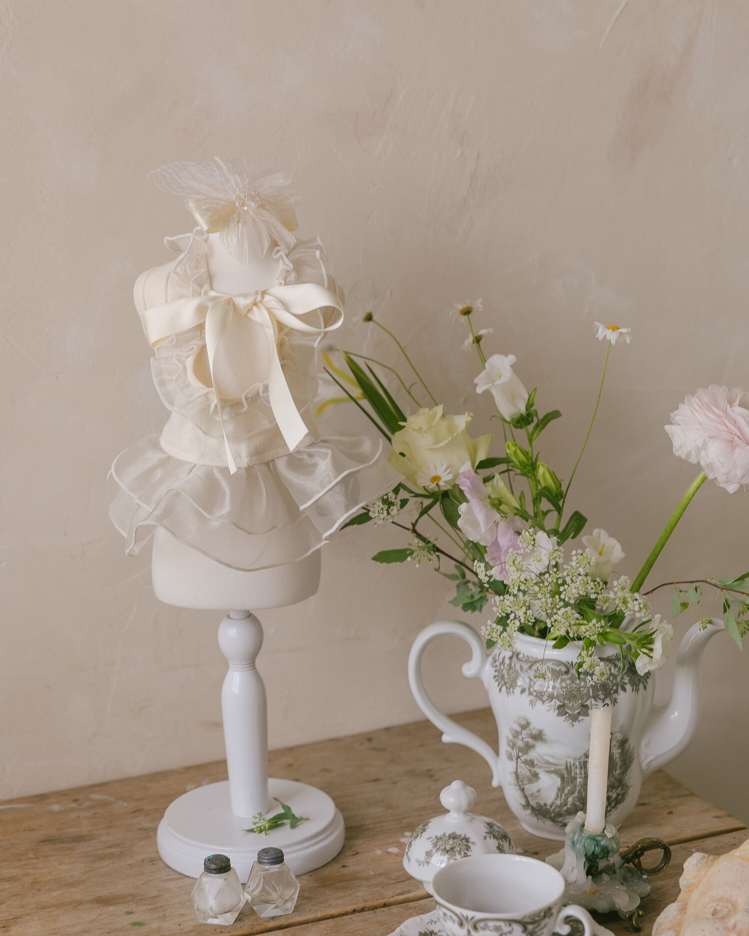 빛에 따라 은은하게 반짝이는 오간자 튜튜, 넥 라인에 프릴 디테일로 러블리함을 한층 더해주었어요