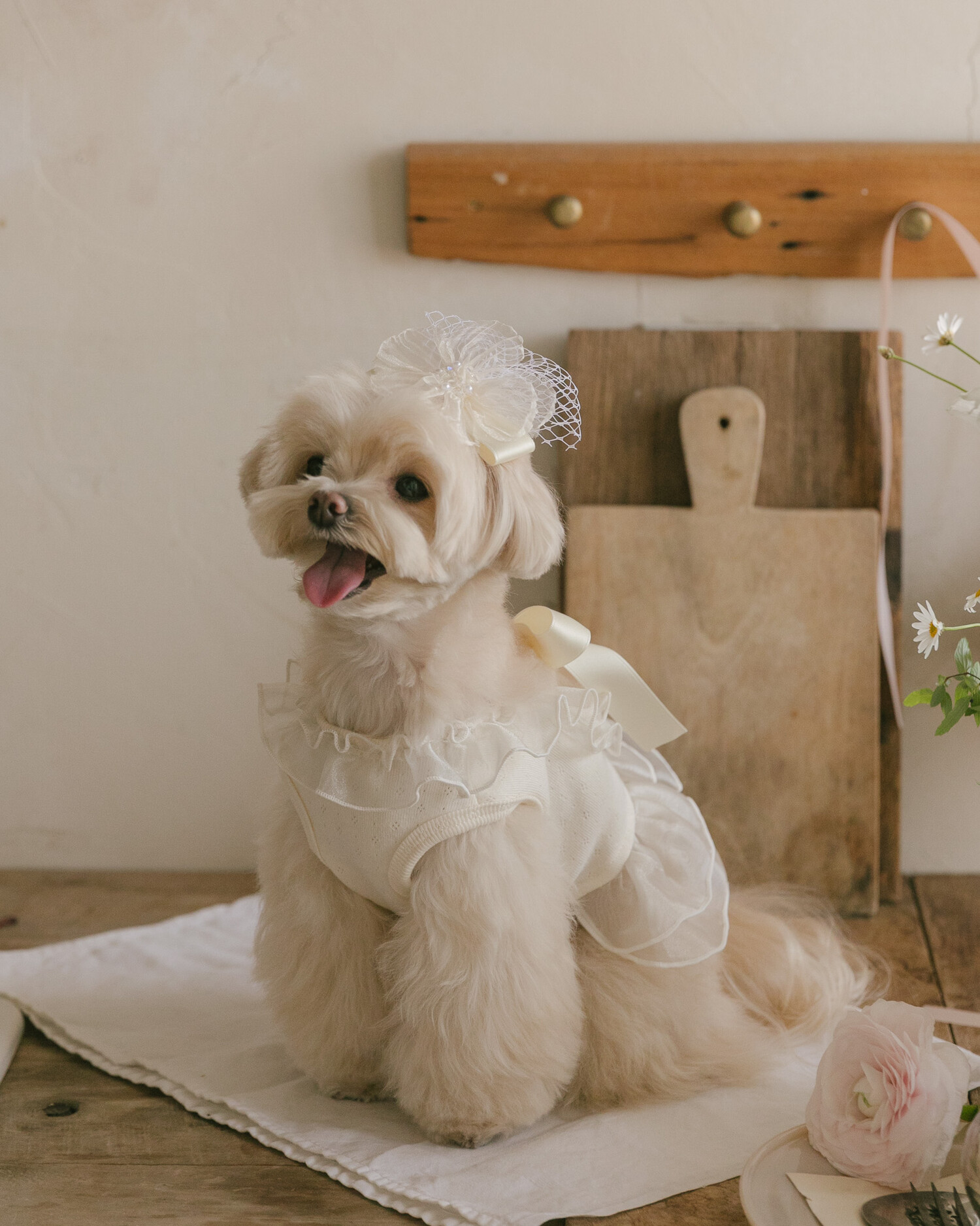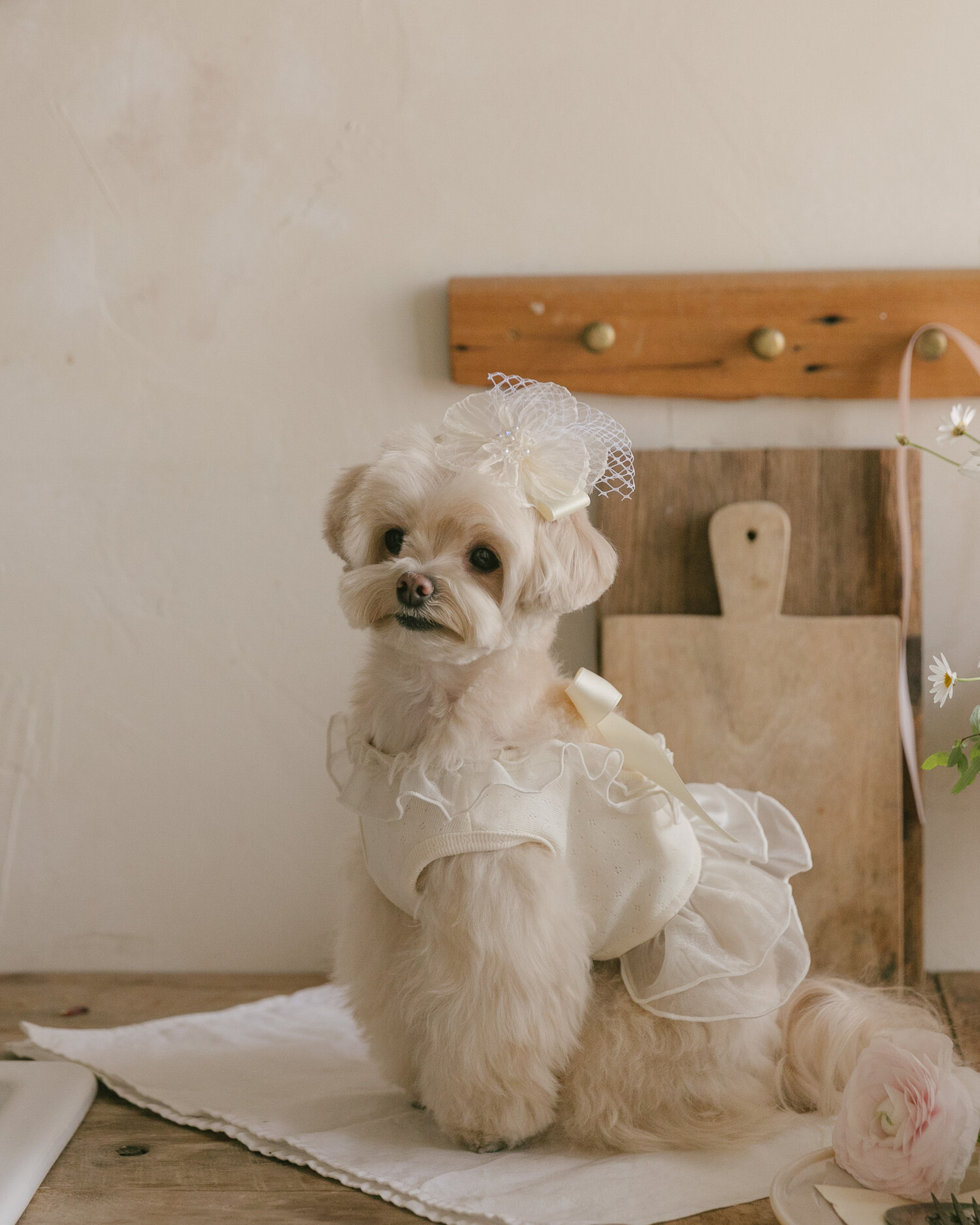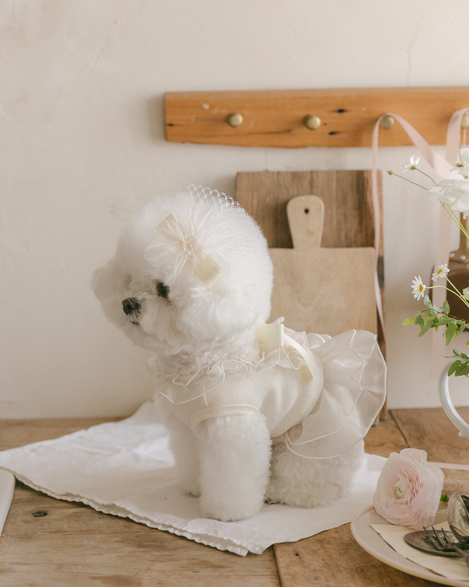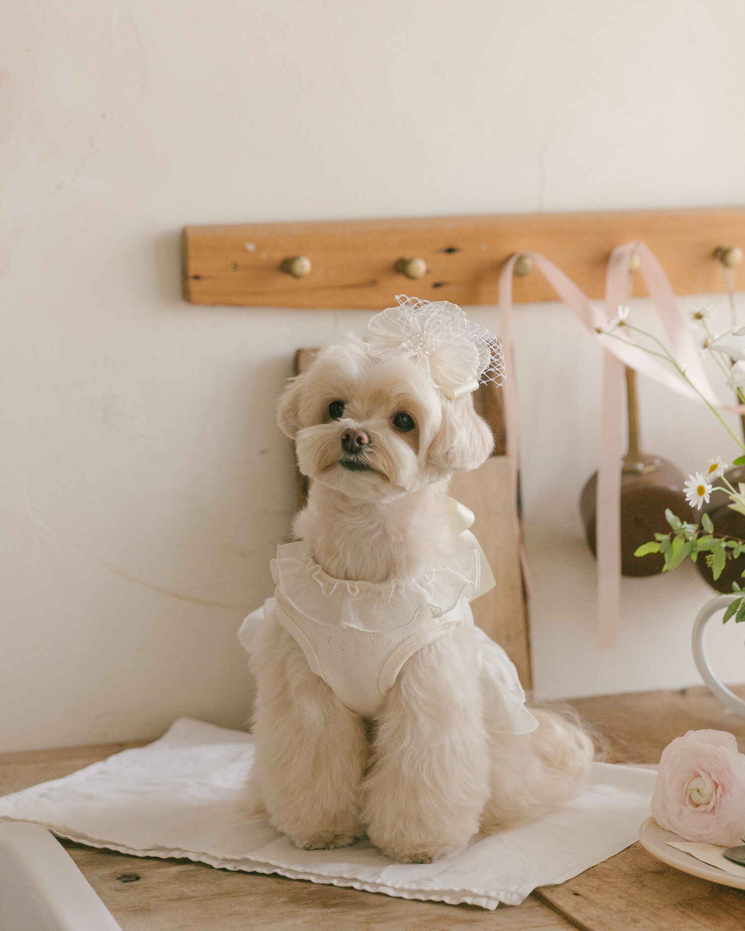 웨딩시즌에 맞춰 화동룩으로도 예쁘게 입히실 수 있게 베일 느낌의 플라워 핀도 함께 준비했습니다