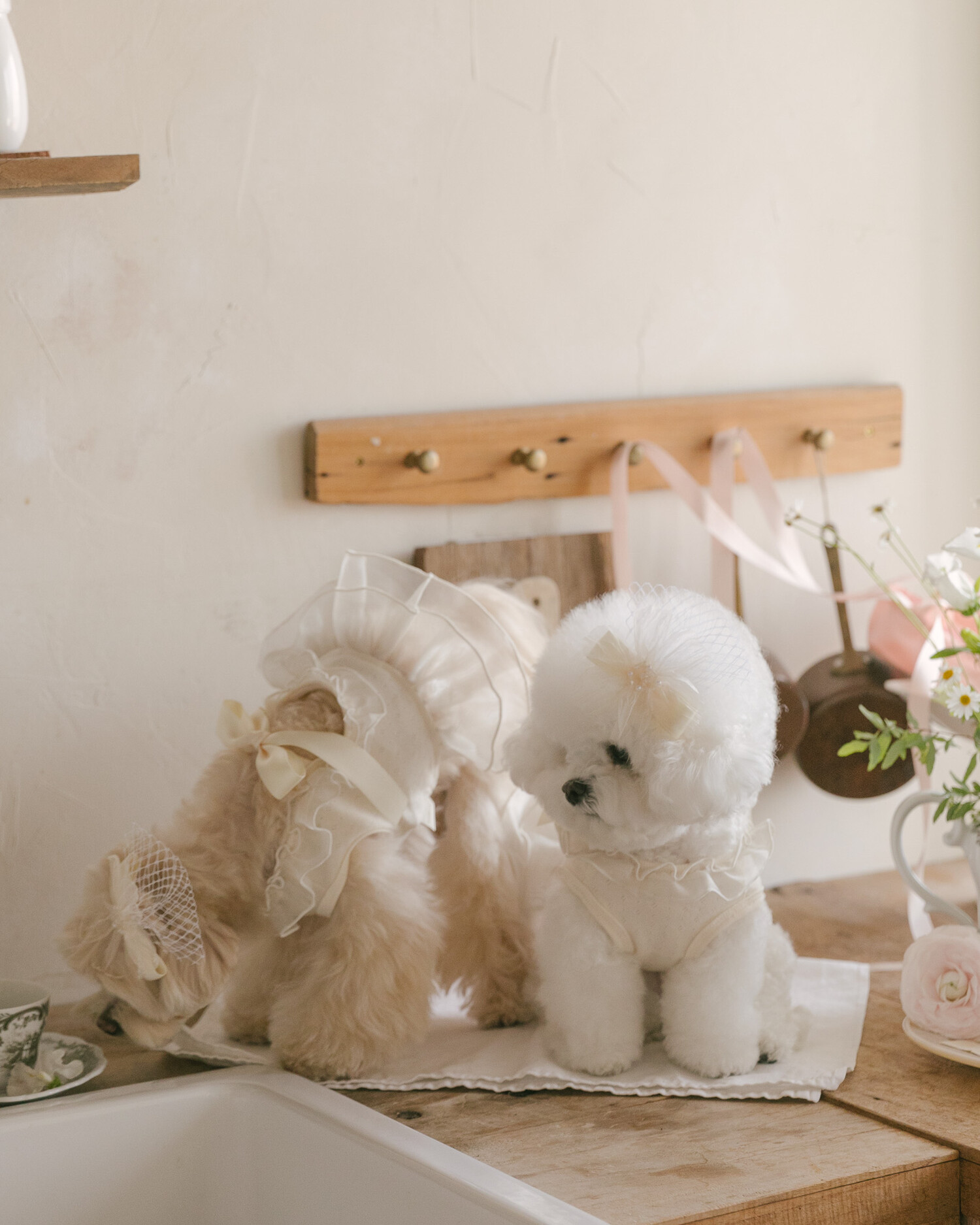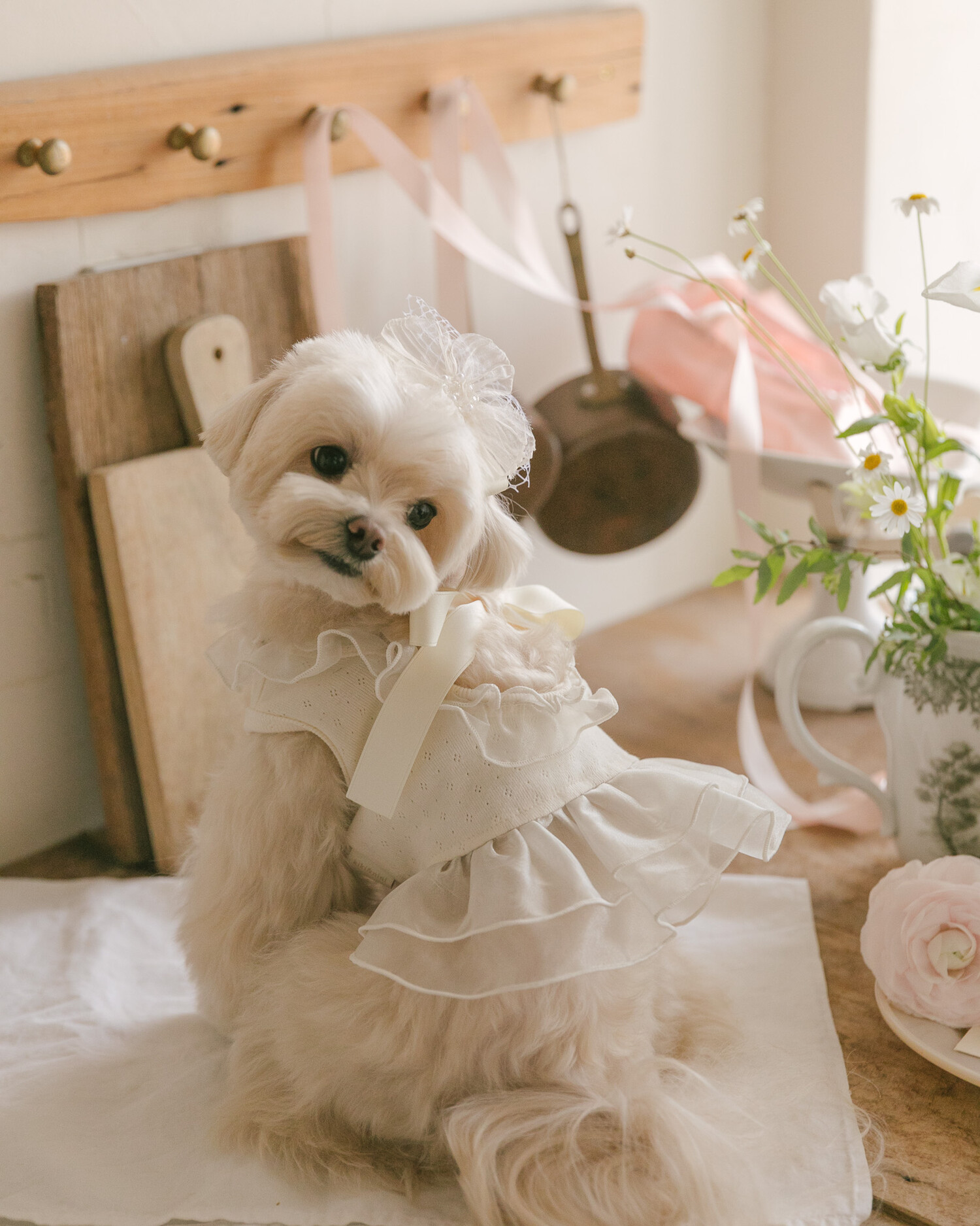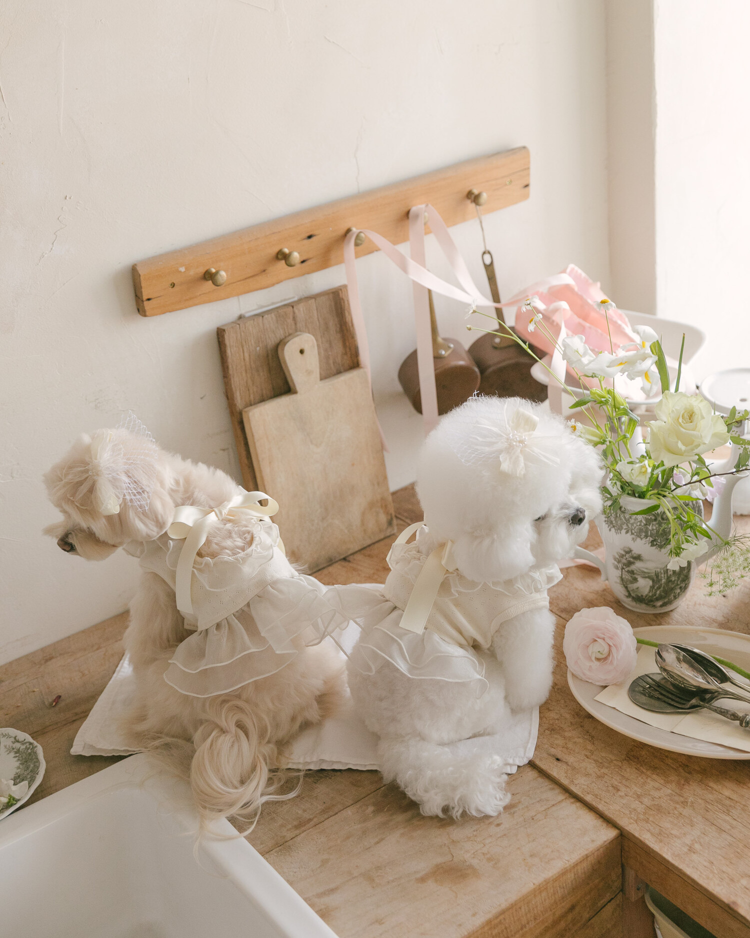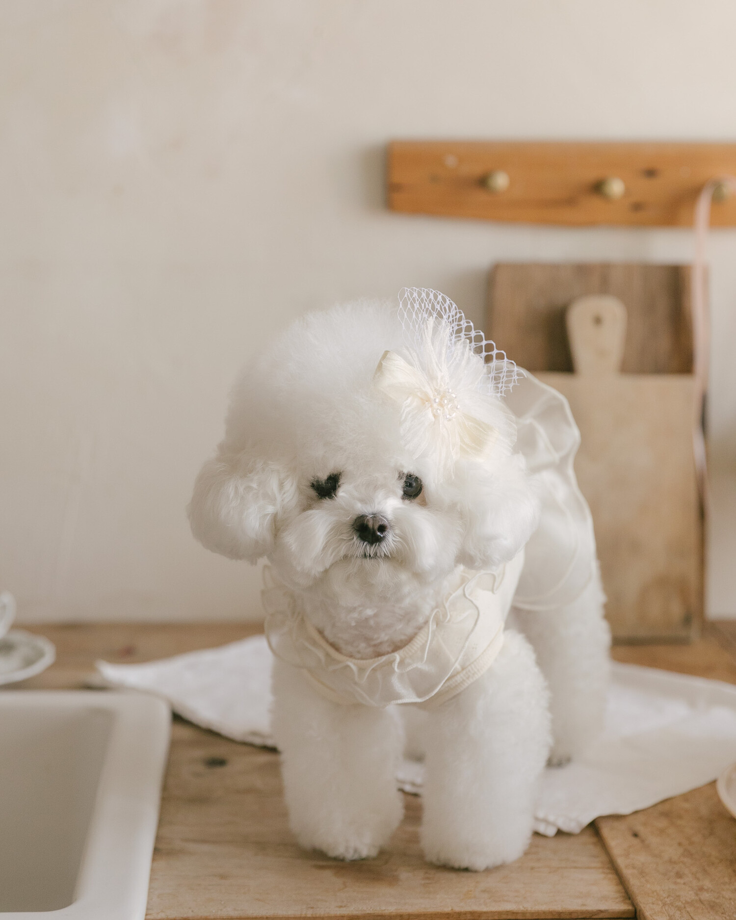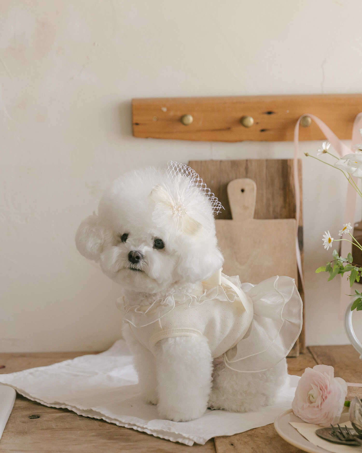 웨딩시즌에 맞춰 화동룩으로도 예쁘게 입히실 수 있게 베일 느낌의 플라워 핀도 함께 준비했습니다