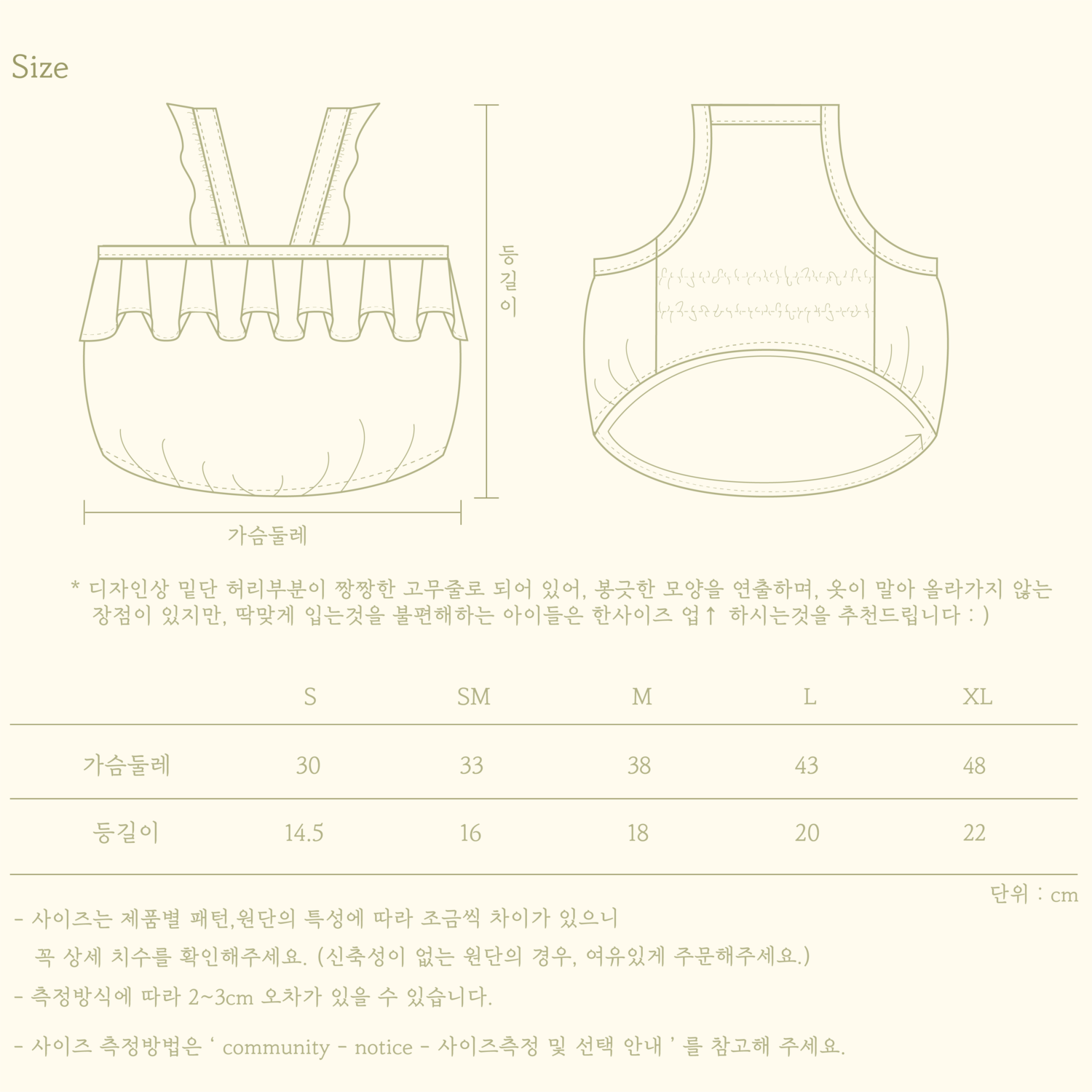 *디자인상 밑단 허리부분이 짱짱한 고무줄로 되어 있어, 봉긋한 모양을 연출하며, 옷이 말아 올라가지 않는 장점이 있지만, 딱맞게 입는것을 불편해하는 아이들은 한사이즈 업↑ 하시는것을 추천드립니다 : )