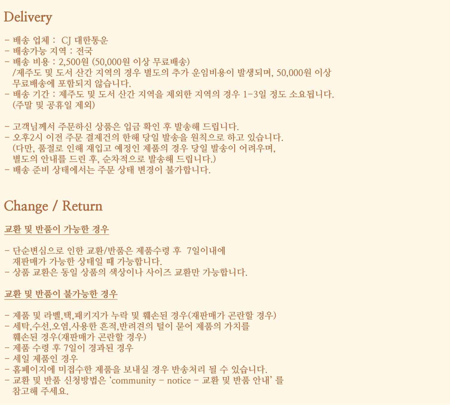 Business Registration Number: 685-08-01257 | Business License: 2021-화성동탄-2263 | Hosting by sixshop